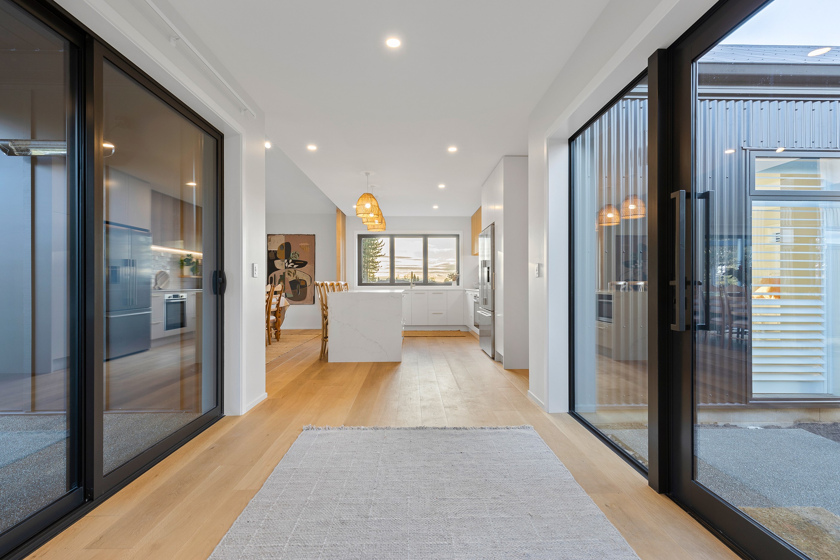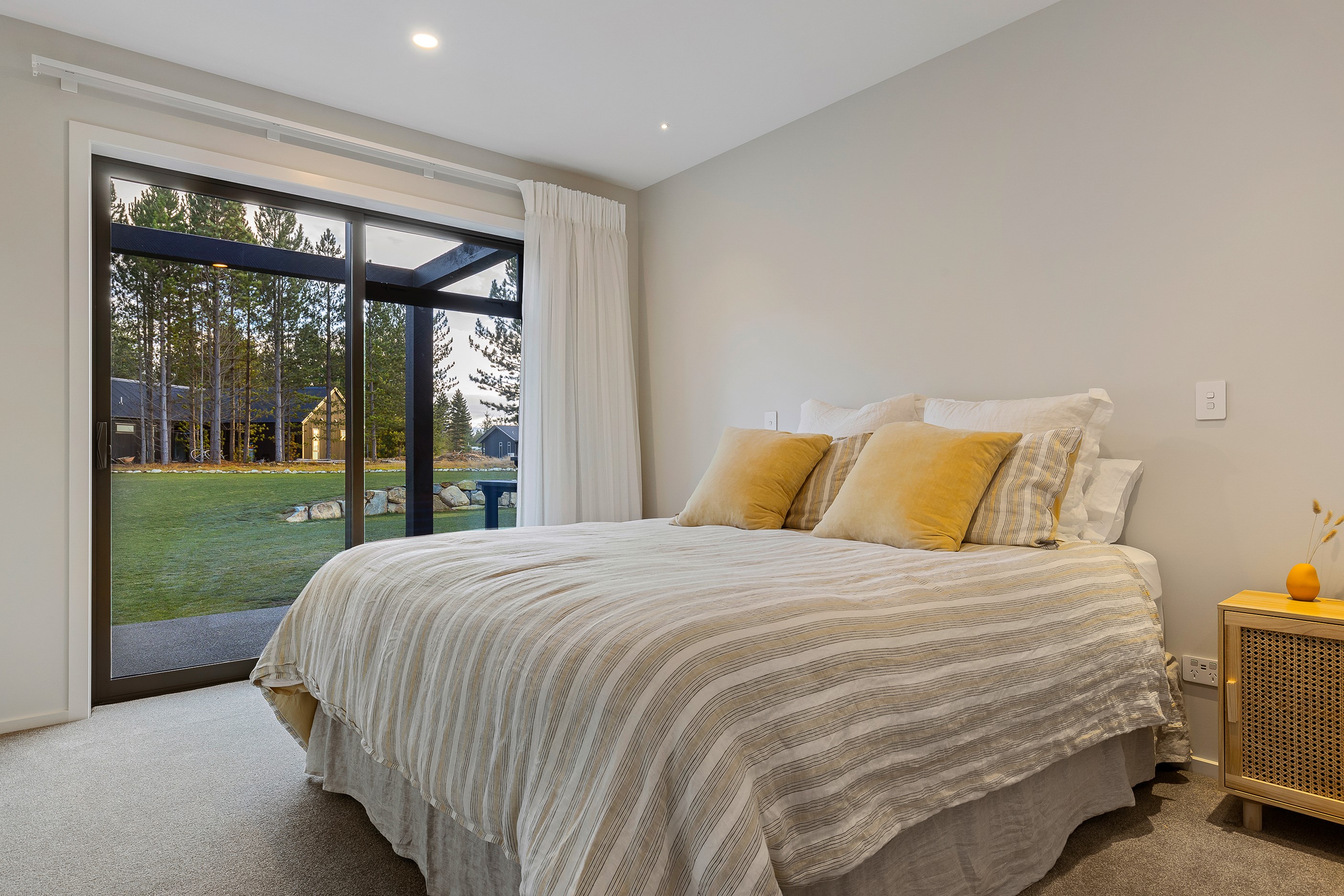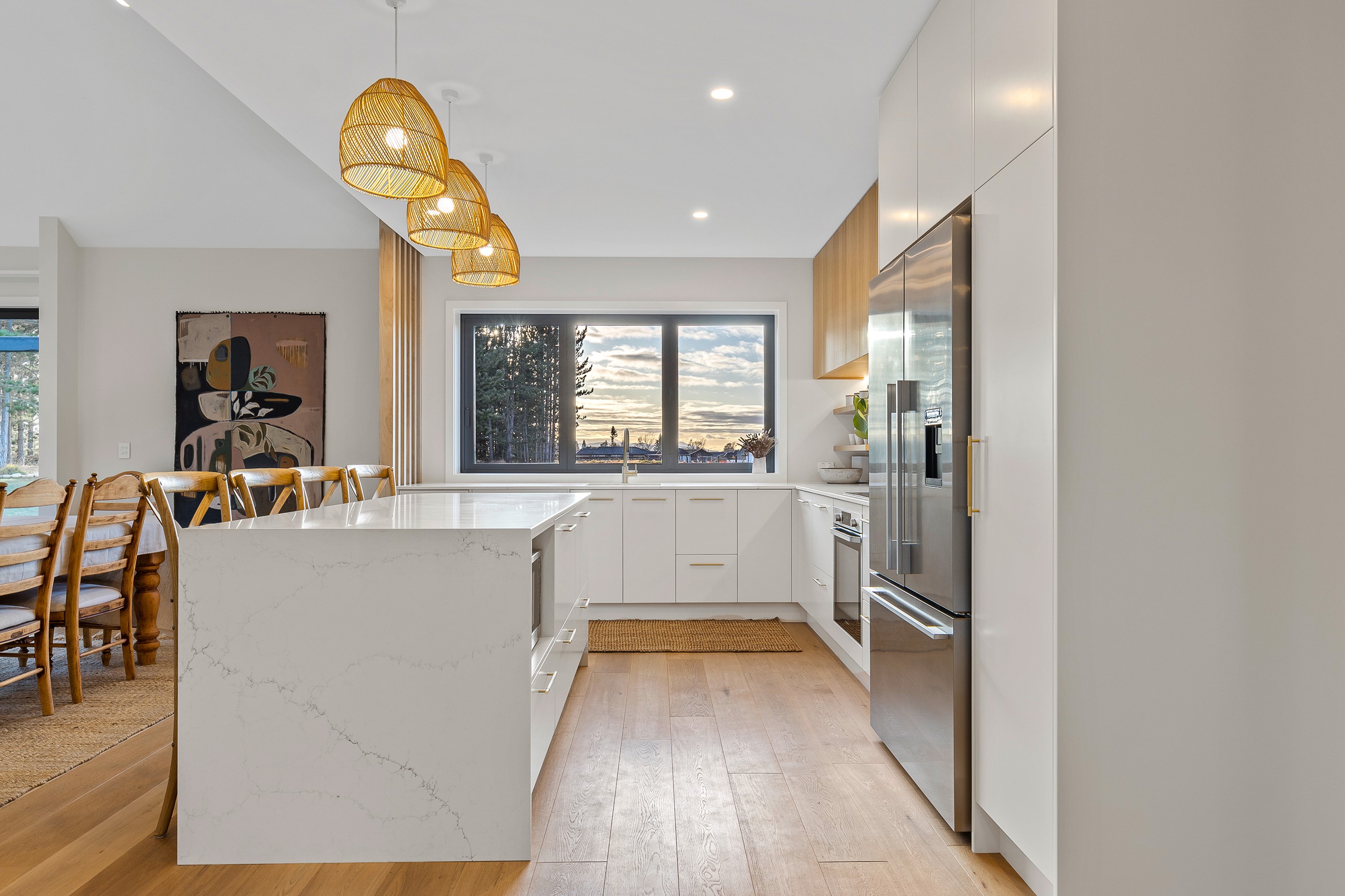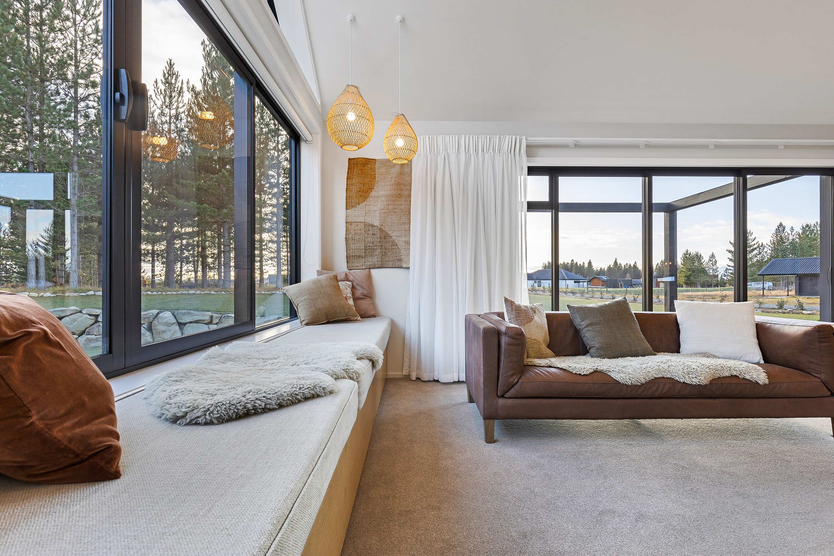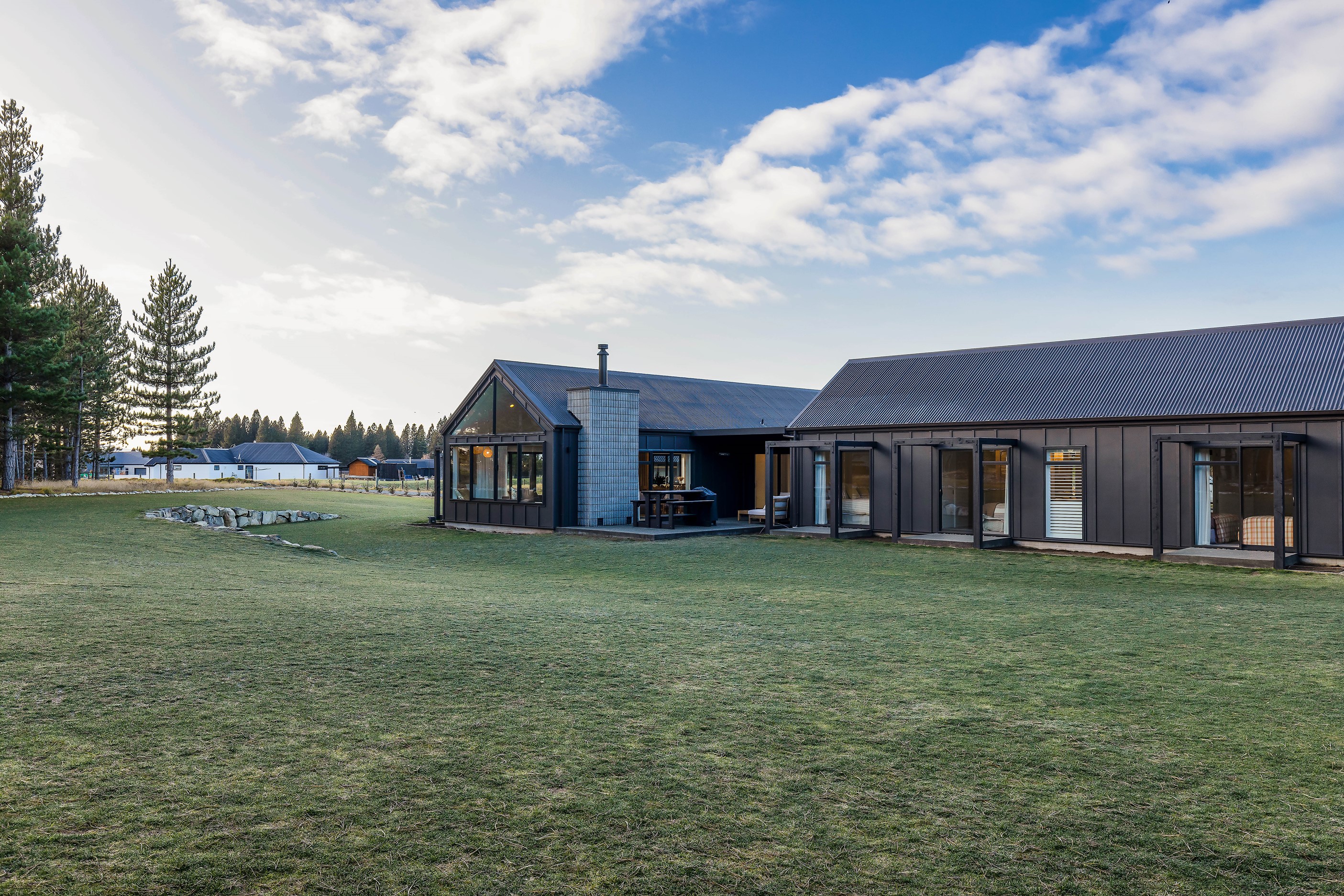 Bold yet understated, this pavilion-style home manages to achieve the tricky double with aplomb. It helps that the owners have an eye for detail and skill in complementing and contrasting materials and shades. Board-and-batten and steel cladding anchor the 233sqm holiday home to its Mackenzie Country site. Swathes of glass bring the light and stunning landscape inside. The moody exterior is contrasted by light, earthy tones inside and the natural palette ensures cohesion. Given this is a holiday home, the kitchen has been designed to be practical – no one wants to be labouring over meals when relaxation and adventures are on offer in this rugged and special part of the country. That’s not to say the food prep area is nondescript – it’s a chic space that flows into the living area and outside to a partially covered area. Three north-facing bedrooms and a bathroom accommodate the trio of teenagers in the family and the main-bedroom suite at the rear of the house is a private retreat away from the buzz of young adults. It’s clear that this bespoke home has been designed and built with thought, care and precision. Nothing has been left to chance, least of all craftsmanship.