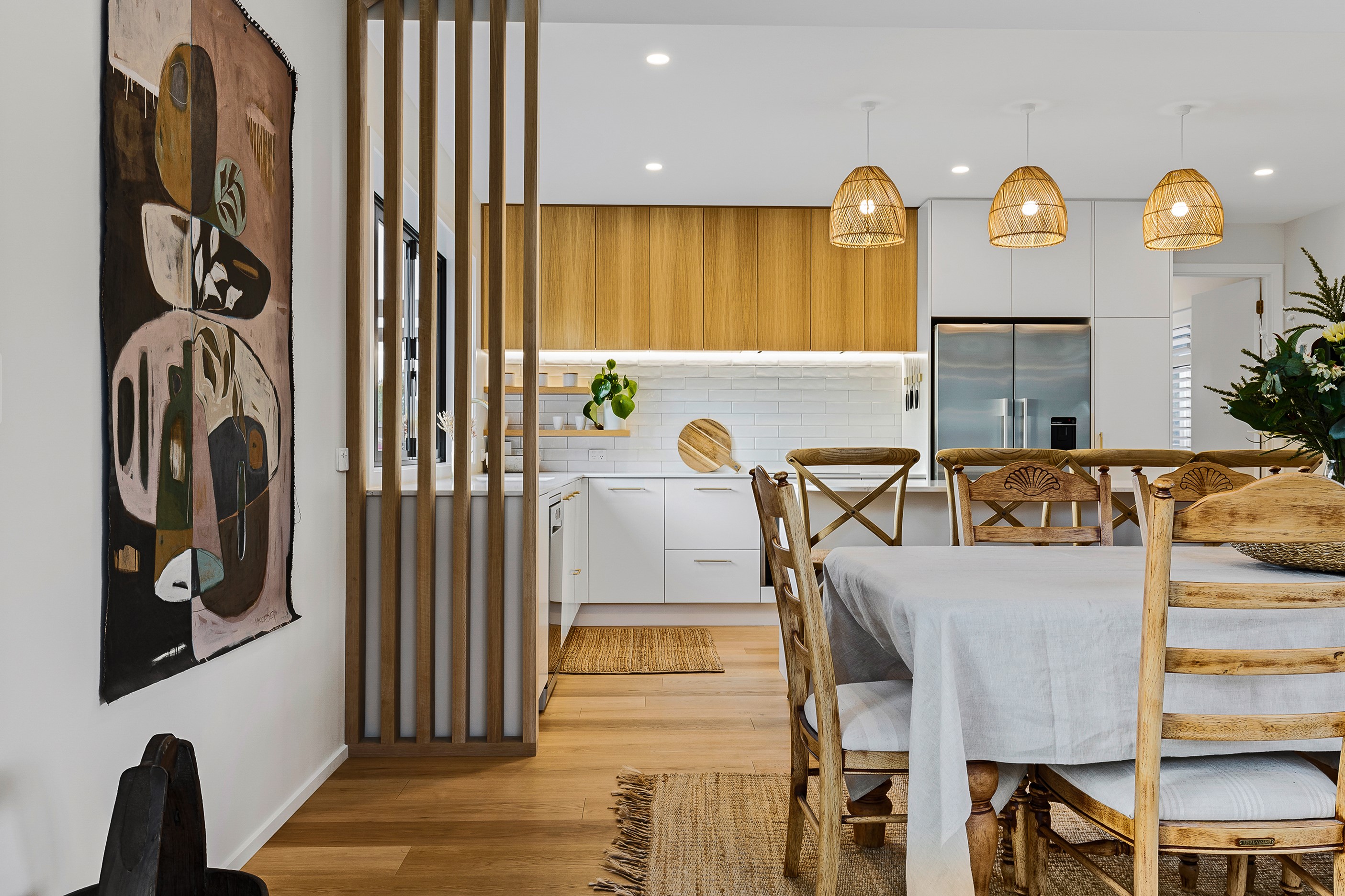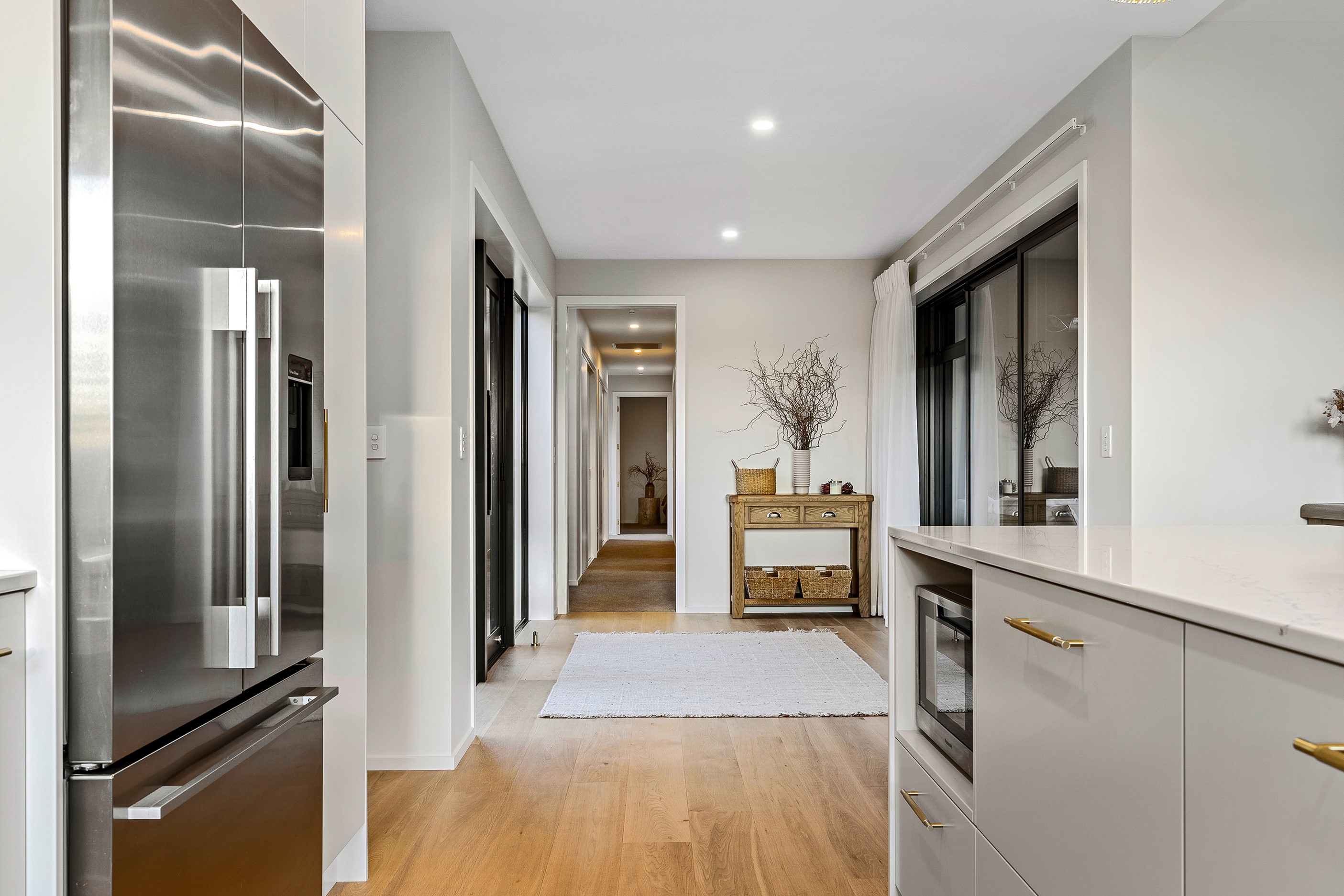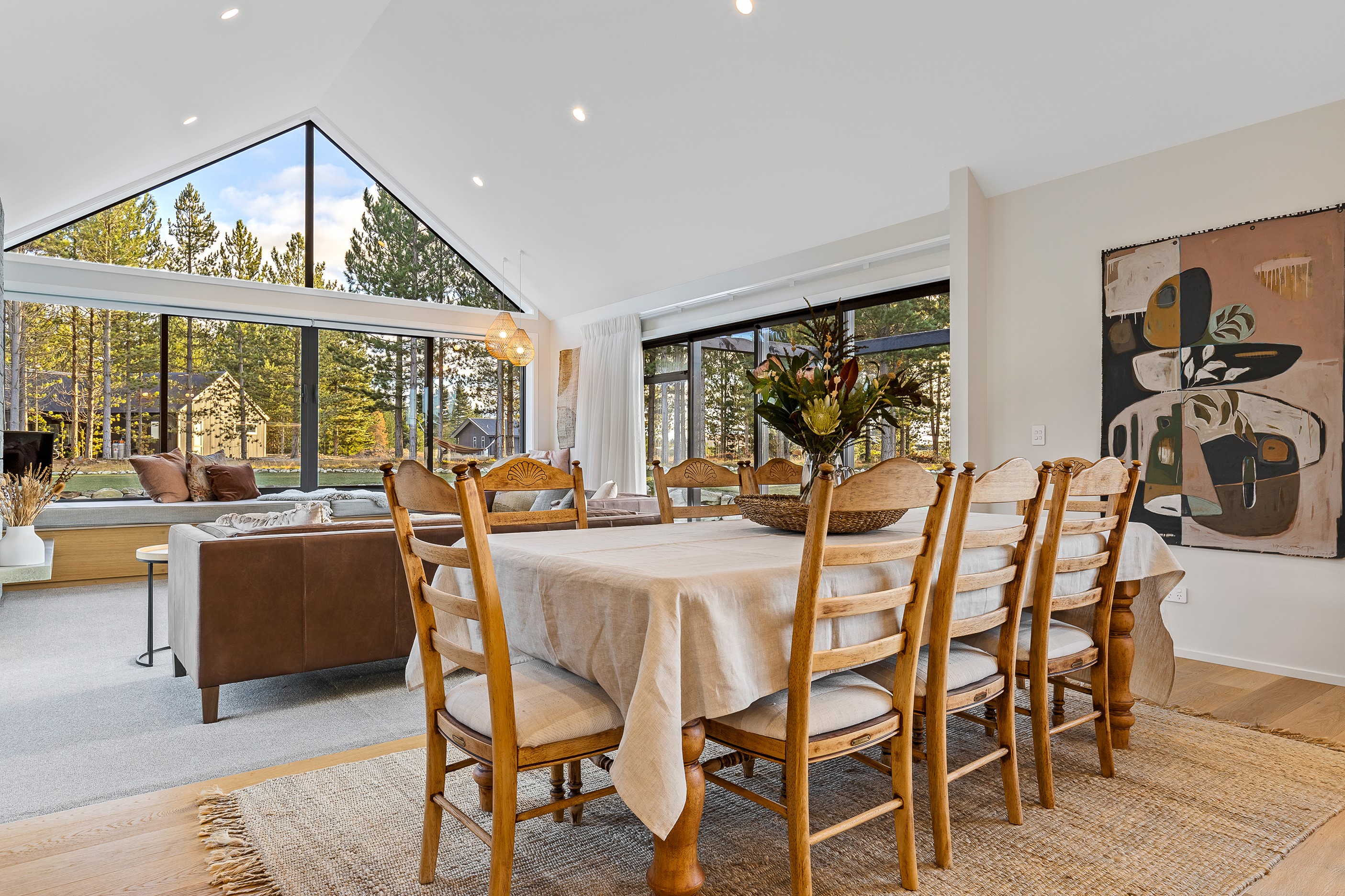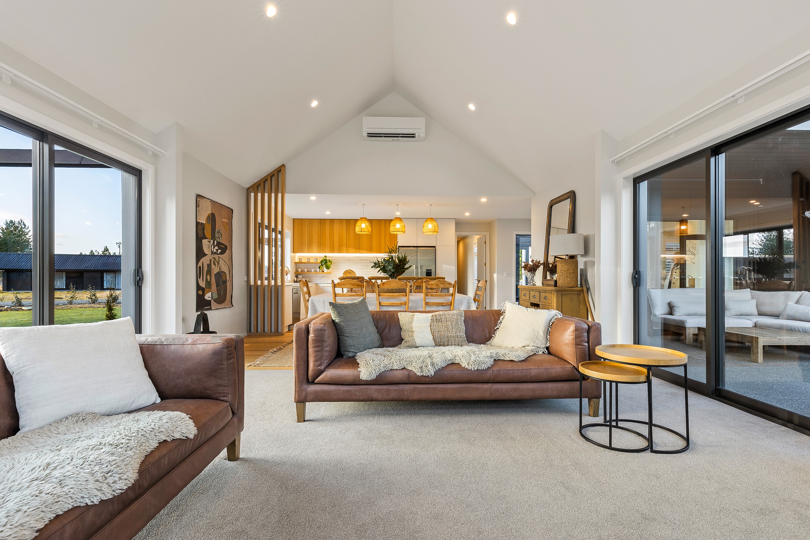 Bold yet understated, this pavilion-style home manages to achieve the tricky double with aplomb. It helps that the owners have an eye for detail and skill in complementing and contrasting materials and shades. Board-and-batten and steel cladding anchor the 233sqm holiday home to its Mackenzie Country site. Swathes of glass bring the light and stunning landscape inside. The moody exterior is contrasted by light, earthy tones inside and the natural palette ensures cohesion. Given this is a holiday home, the kitchen has been designed to be practical – no one wants to be labouring over meals when relaxation and adventures are on offer in this rugged and special part of the country. That’s not to say the food prep area is nondescript – it’s a chic space that flows into the living area and outside to a partially covered area. Three north-facing bedrooms and a bathroom accommodate the trio of teenagers in the family and the main-bedroom suite at the rear of the house is a private retreat away from the buzz of young adults. It’s clear that this bespoke home has been designed and built with thought, care and precision. Nothing has been left to chance, least of all craftsmanship.