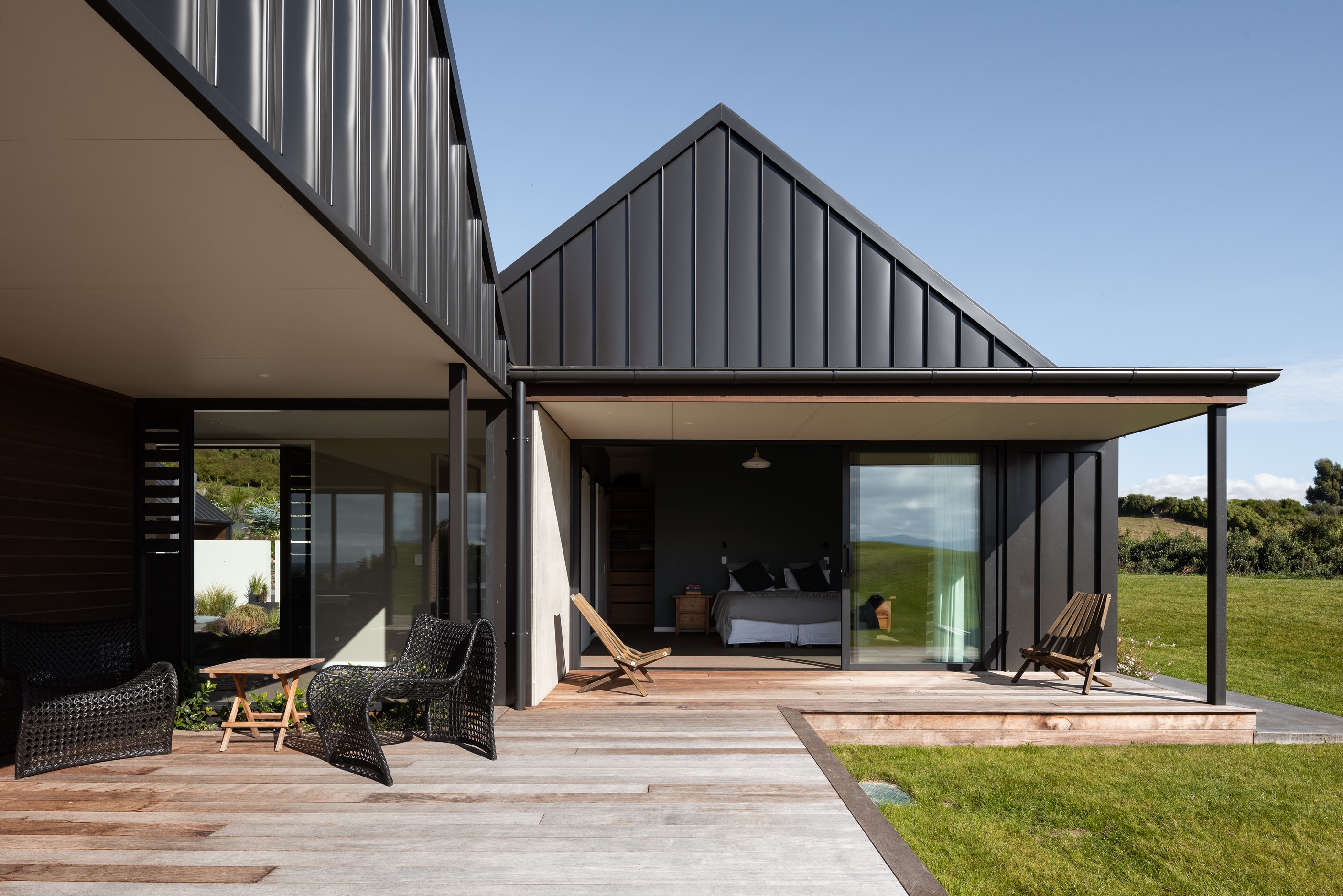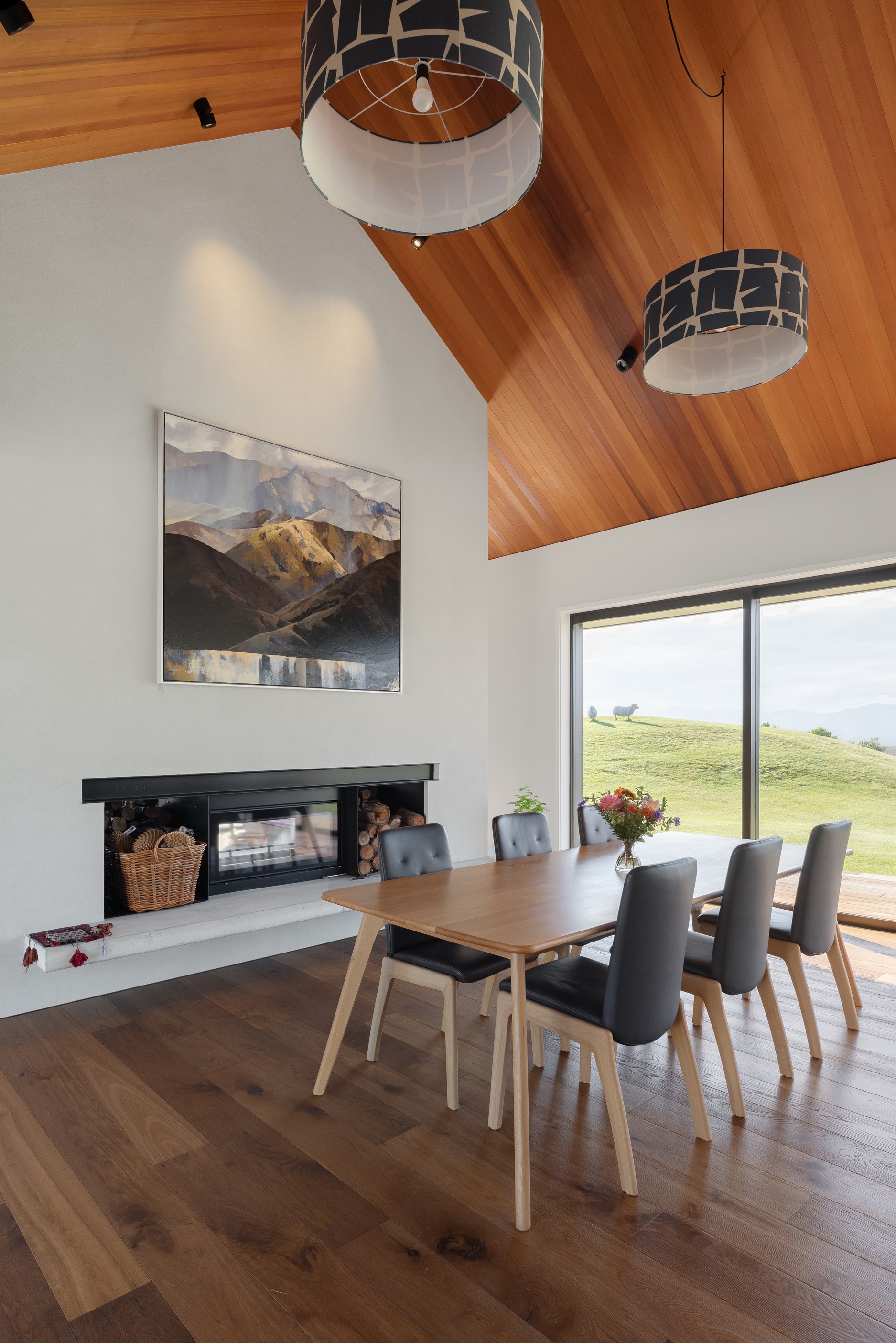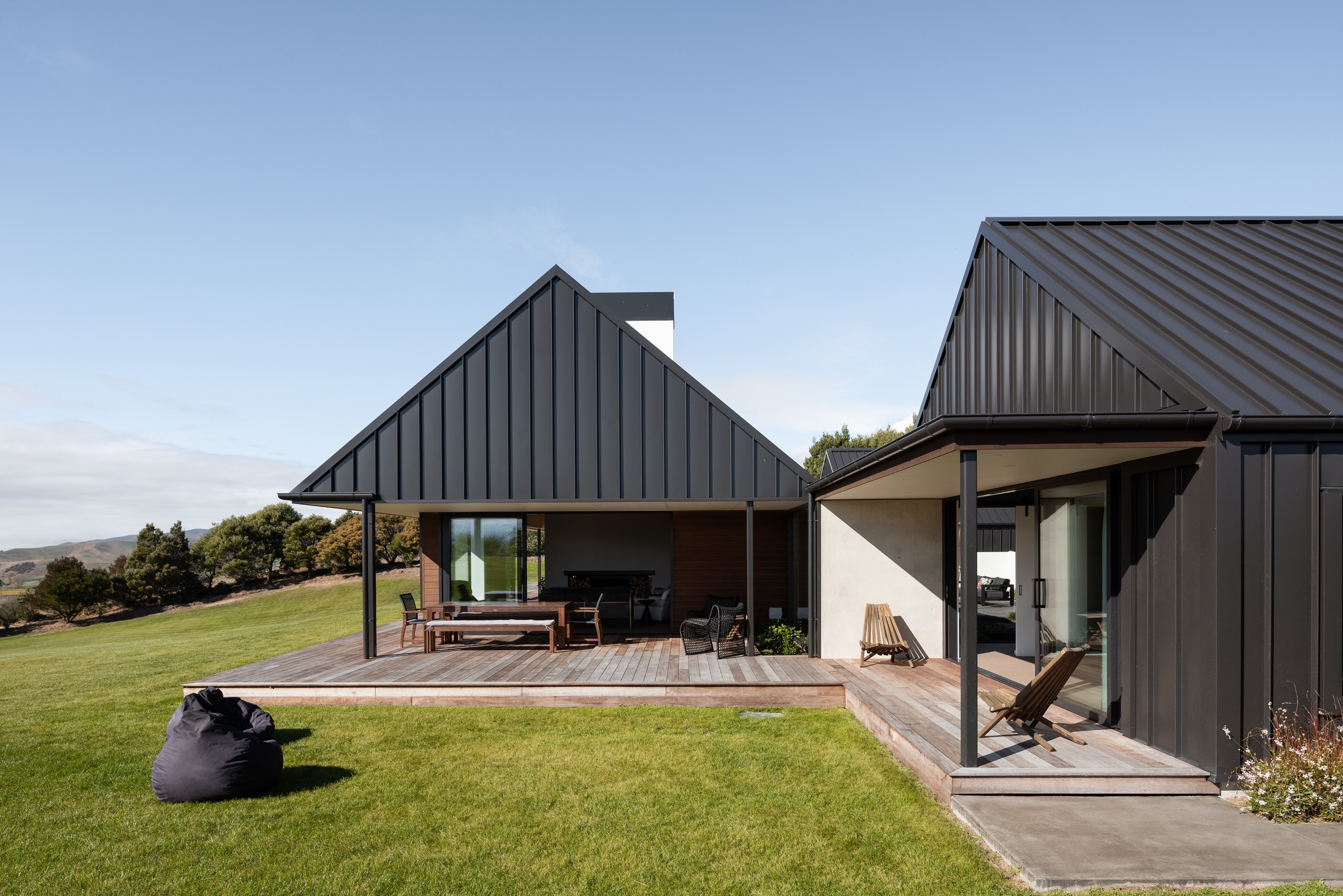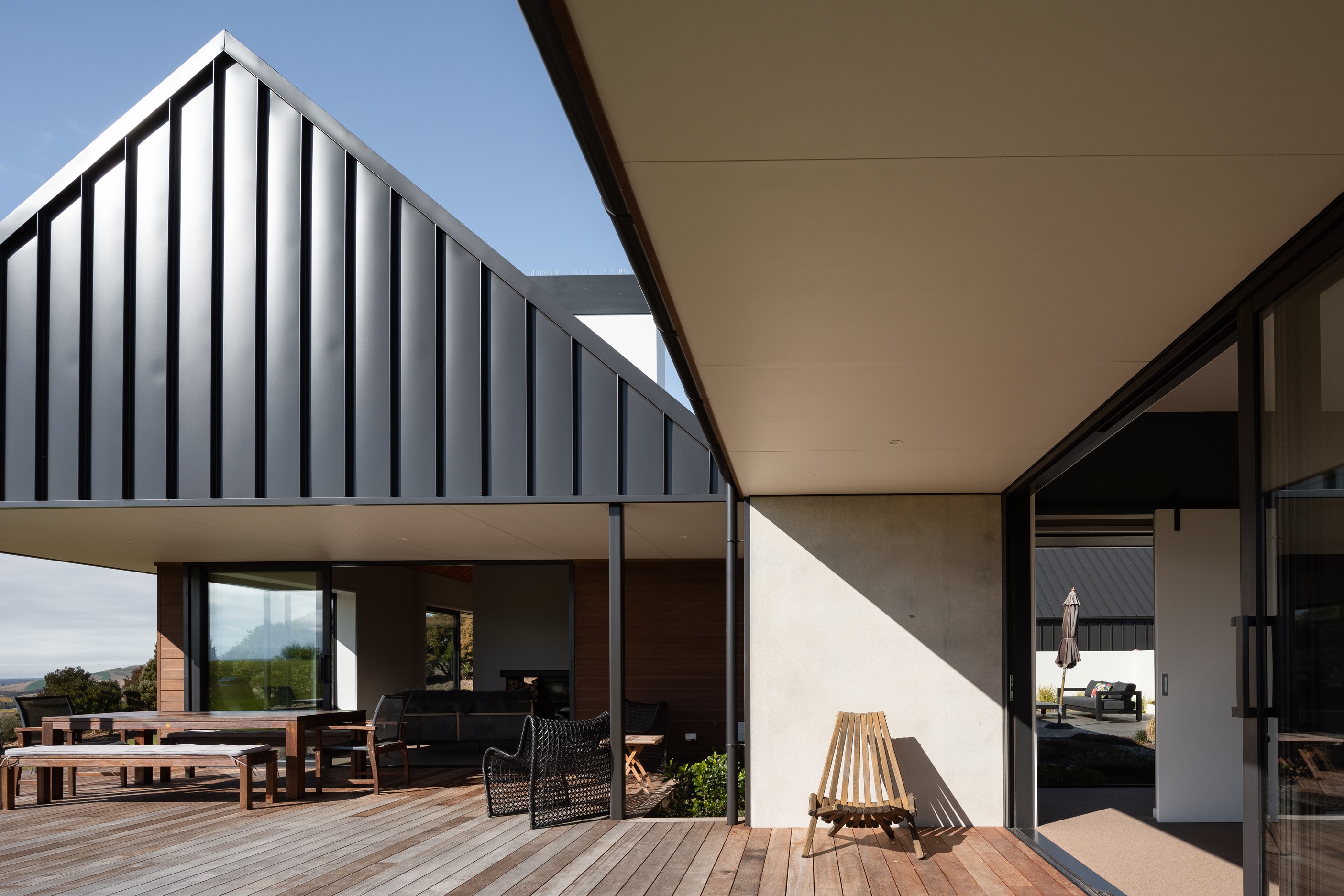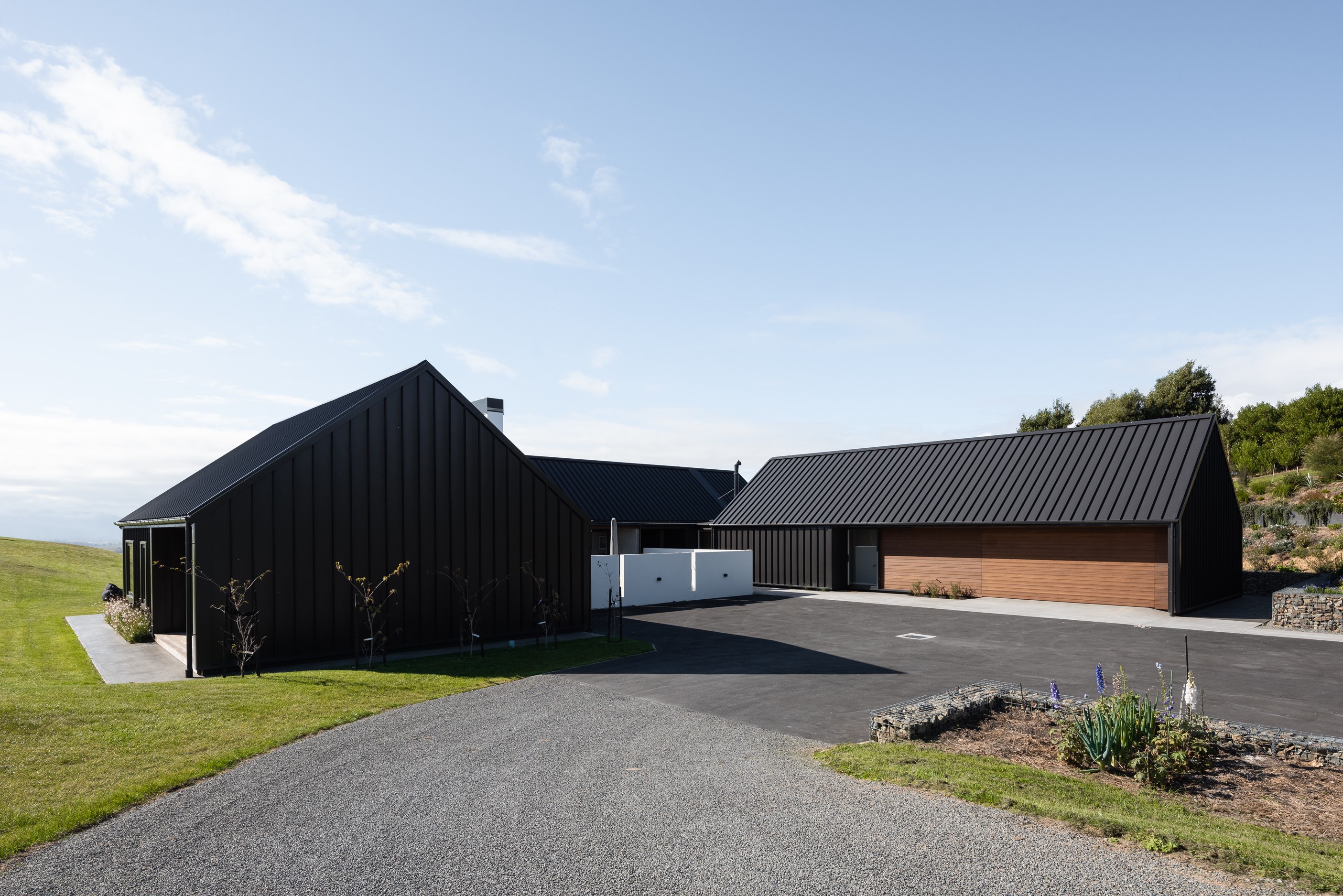 With Brancott Valley to the west and Cook Strait and Cloudy Bay to the east, this site enjoys myriad views – the objective was to make the most of them, while creating protection on the exposed site. Architecture ensures everything has been accomplished. The impressive four-bedroom home hunkers into its elevated site, while celebrating the vistas and making them an integral part of this rich offering.The three gabled forms are arranged in a U shape to create multiple outdoor areas. The southern concrete-block courtyard defines the entry and is the most sheltered of the outside spaces. Beautiful dark standing-seam Colorsteel and timber cladding give the exterior balance and texture. A soft palette provides a warm, inviting transition to the interior, and establishes cohesion throughout. There’s grandeur in the lofty cedar-lined ceilings, with timber floors and polished precast concrete panels adding richness and depth. A double-sided fireplace anchors the 391sqm house to its site and separates the entertaining area from a retreat. The generously sized bedroom and service wings provide privacy when family and guests are staying.