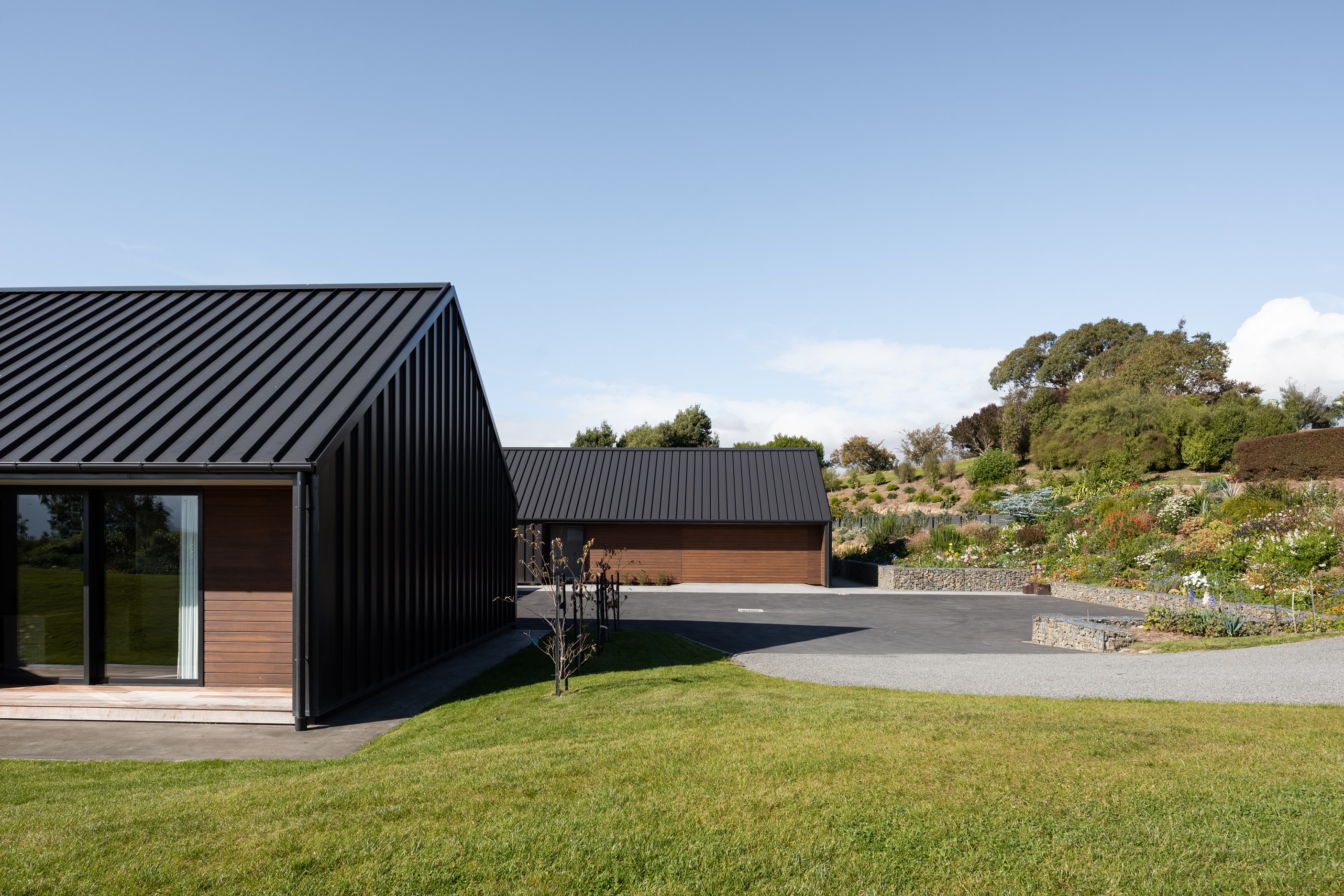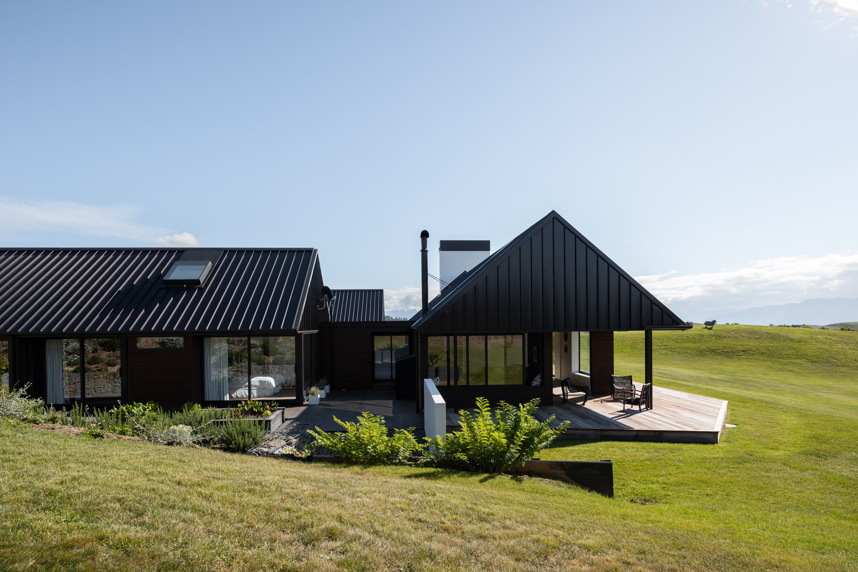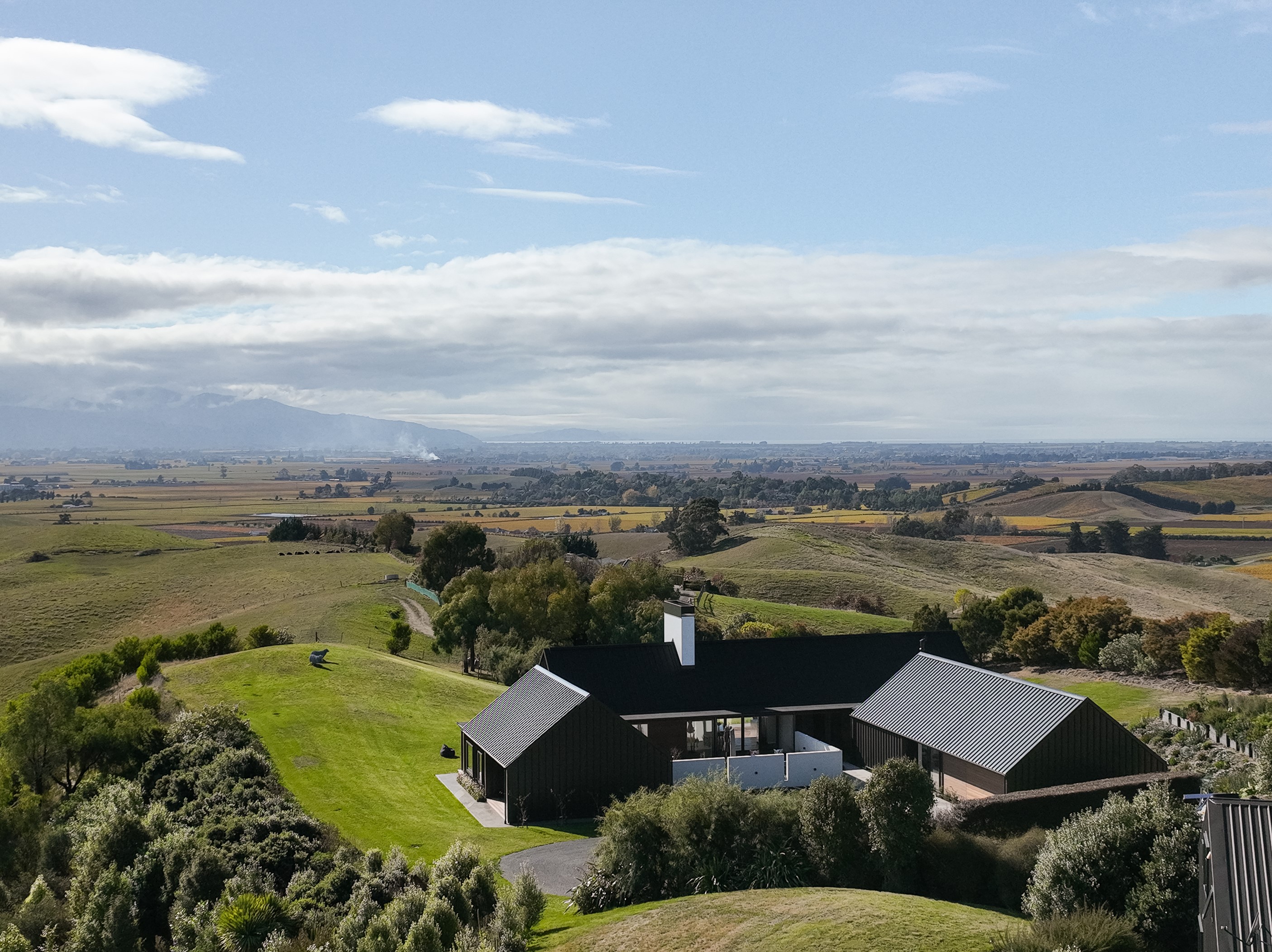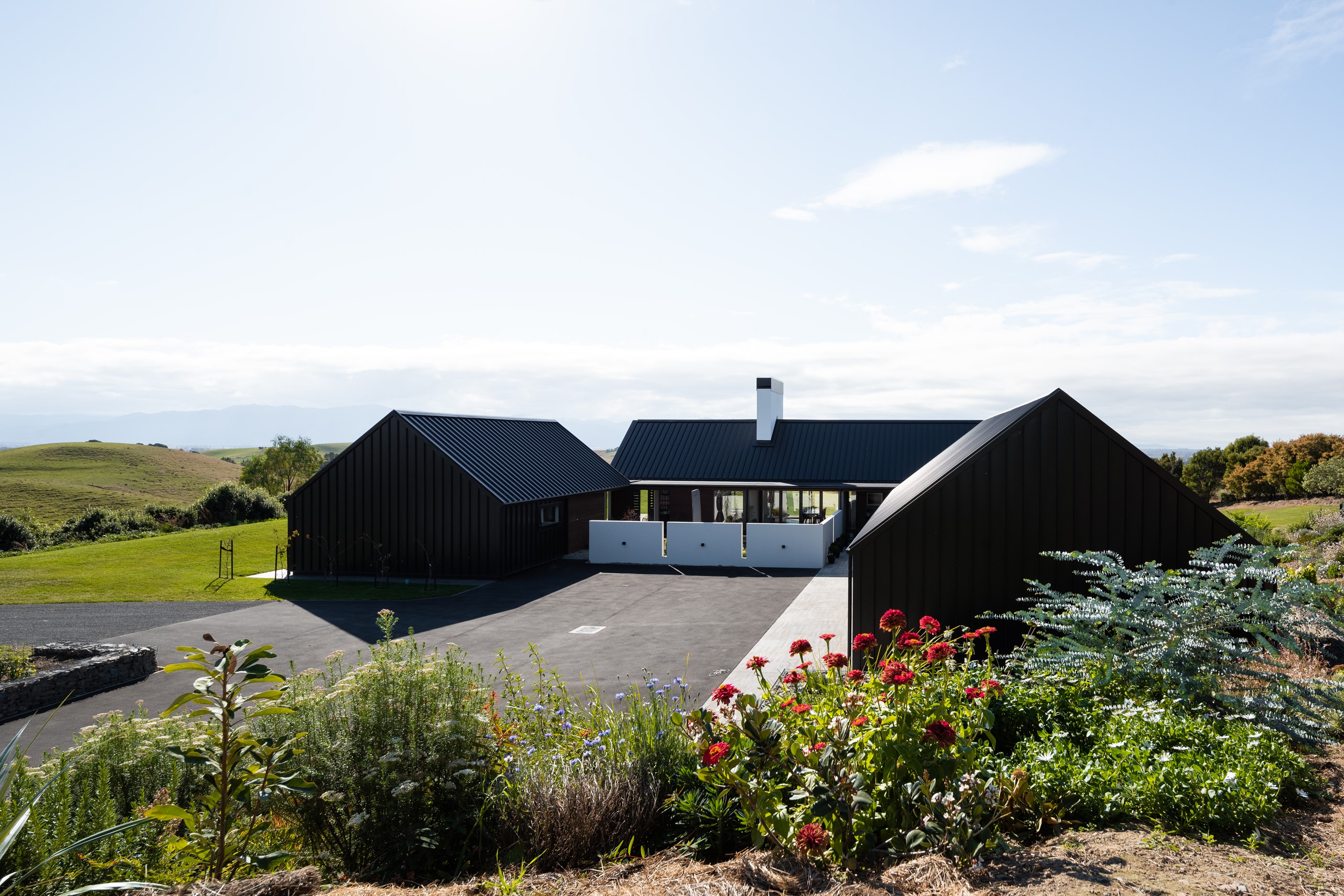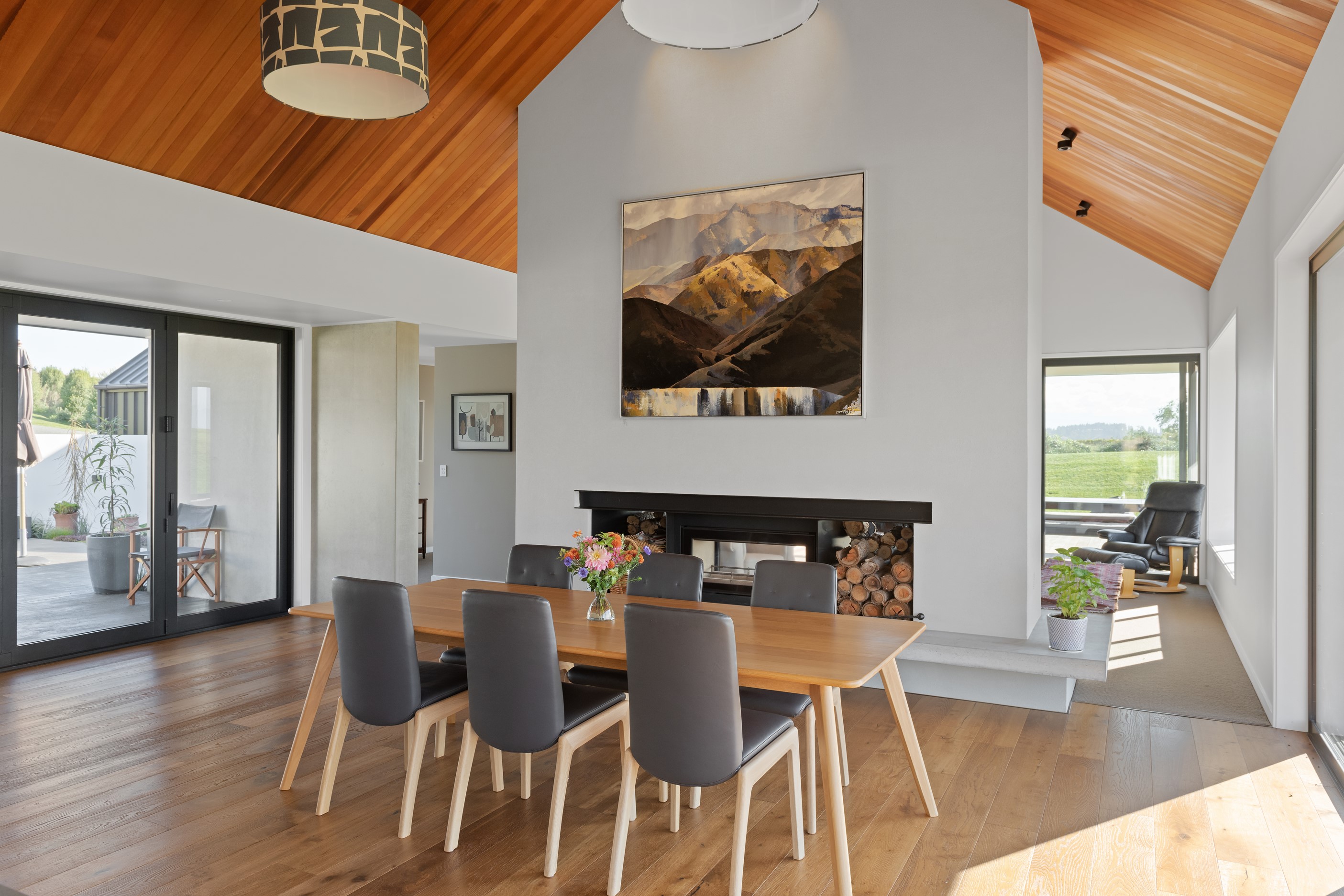 With Brancott Valley to the west and Cook Strait and Cloudy Bay to the east, this site enjoys myriad views – the objective was to make the most of them, while creating protection on the exposed site. Architecture ensures everything has been accomplished. The impressive four-bedroom home hunkers into its elevated site, while celebrating the vistas and making them an integral part of this rich offering.The three gabled forms are arranged in a U shape to create multiple outdoor areas. The southern concrete-block courtyard defines the entry and is the most sheltered of the outside spaces. Beautiful dark standing-seam Colorsteel and timber cladding give the exterior balance and texture. A soft palette provides a warm, inviting transition to the interior, and establishes cohesion throughout. There’s grandeur in the lofty cedar-lined ceilings, with timber floors and polished precast concrete panels adding richness and depth. A double-sided fireplace anchors the 391sqm house to its site and separates the entertaining area from a retreat. The generously sized bedroom and service wings provide privacy when family and guests are staying.