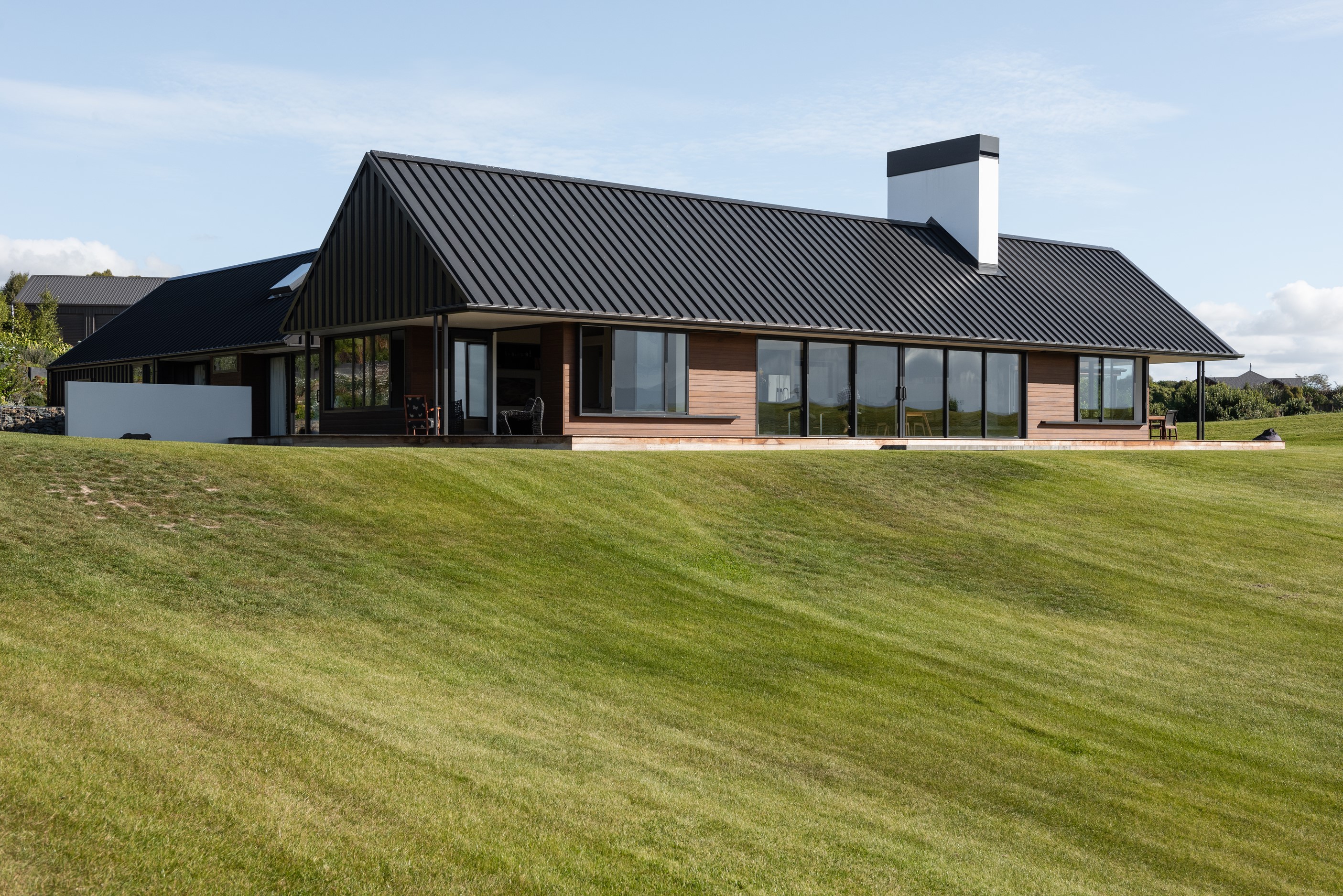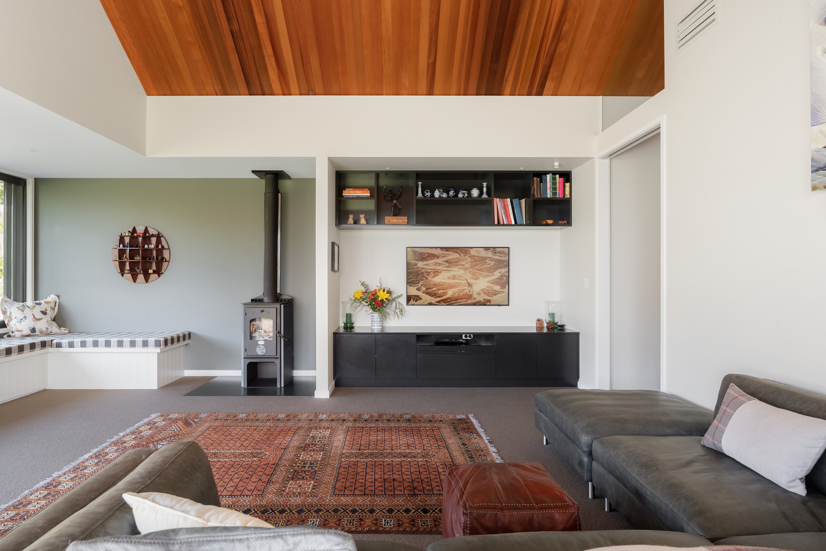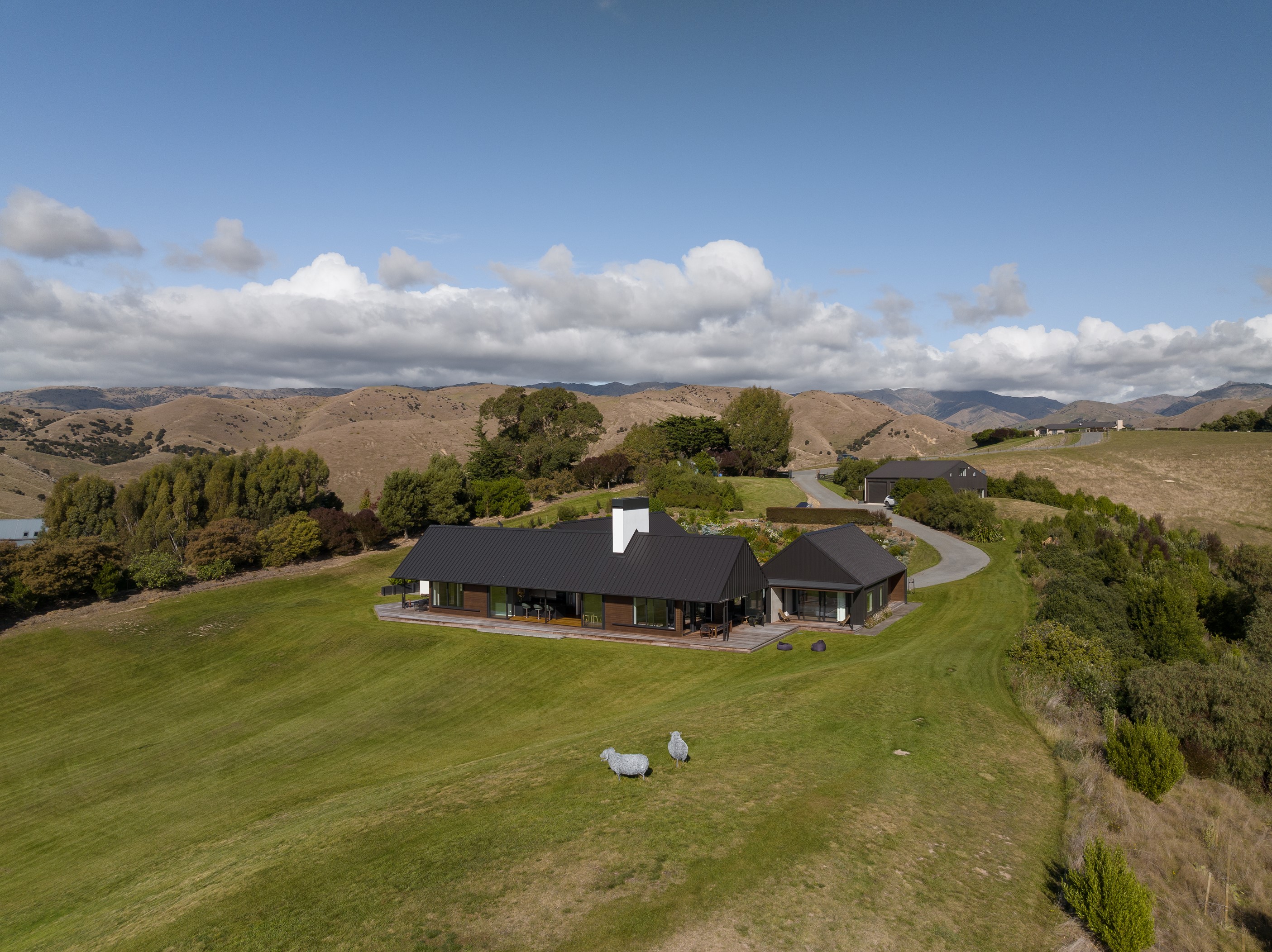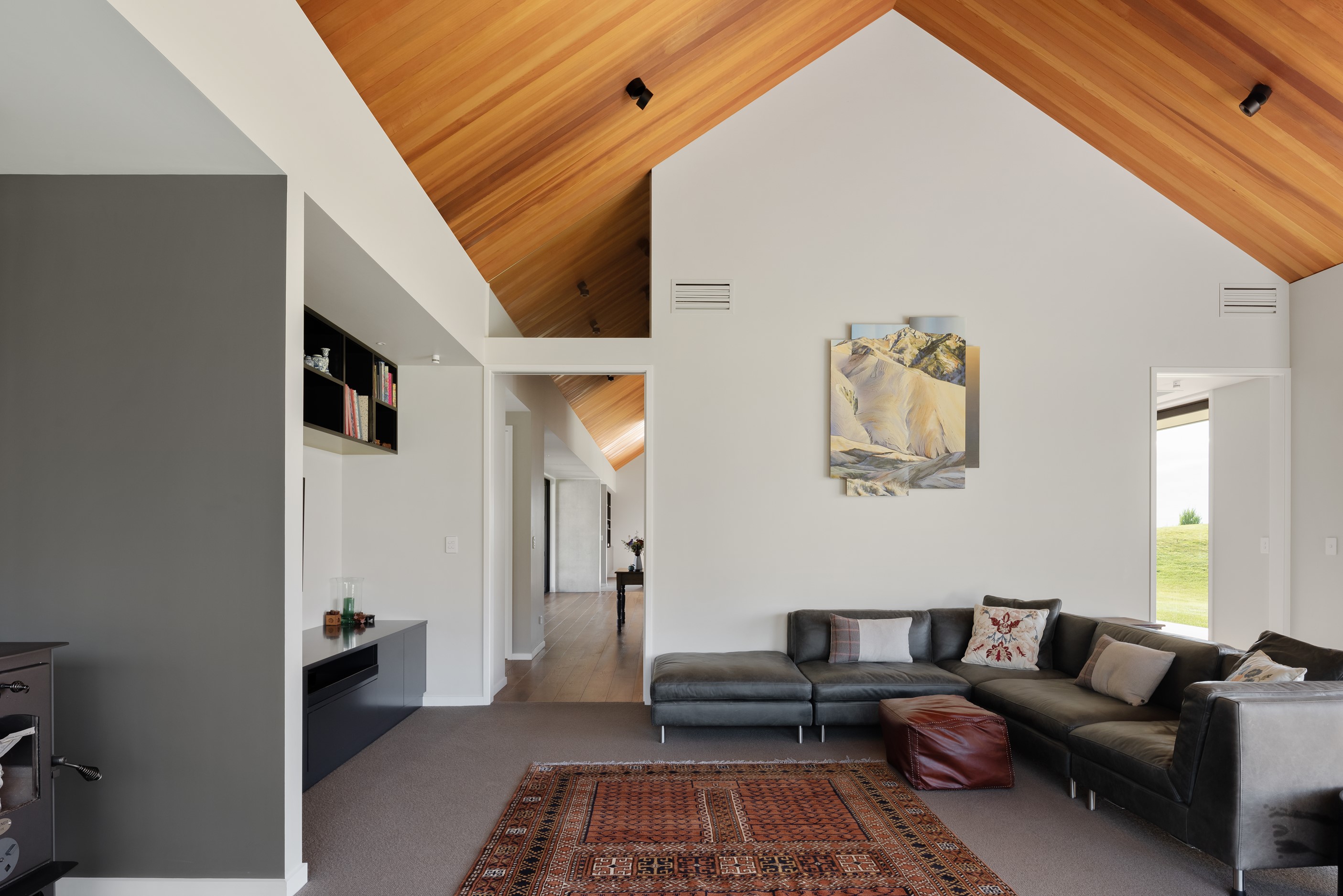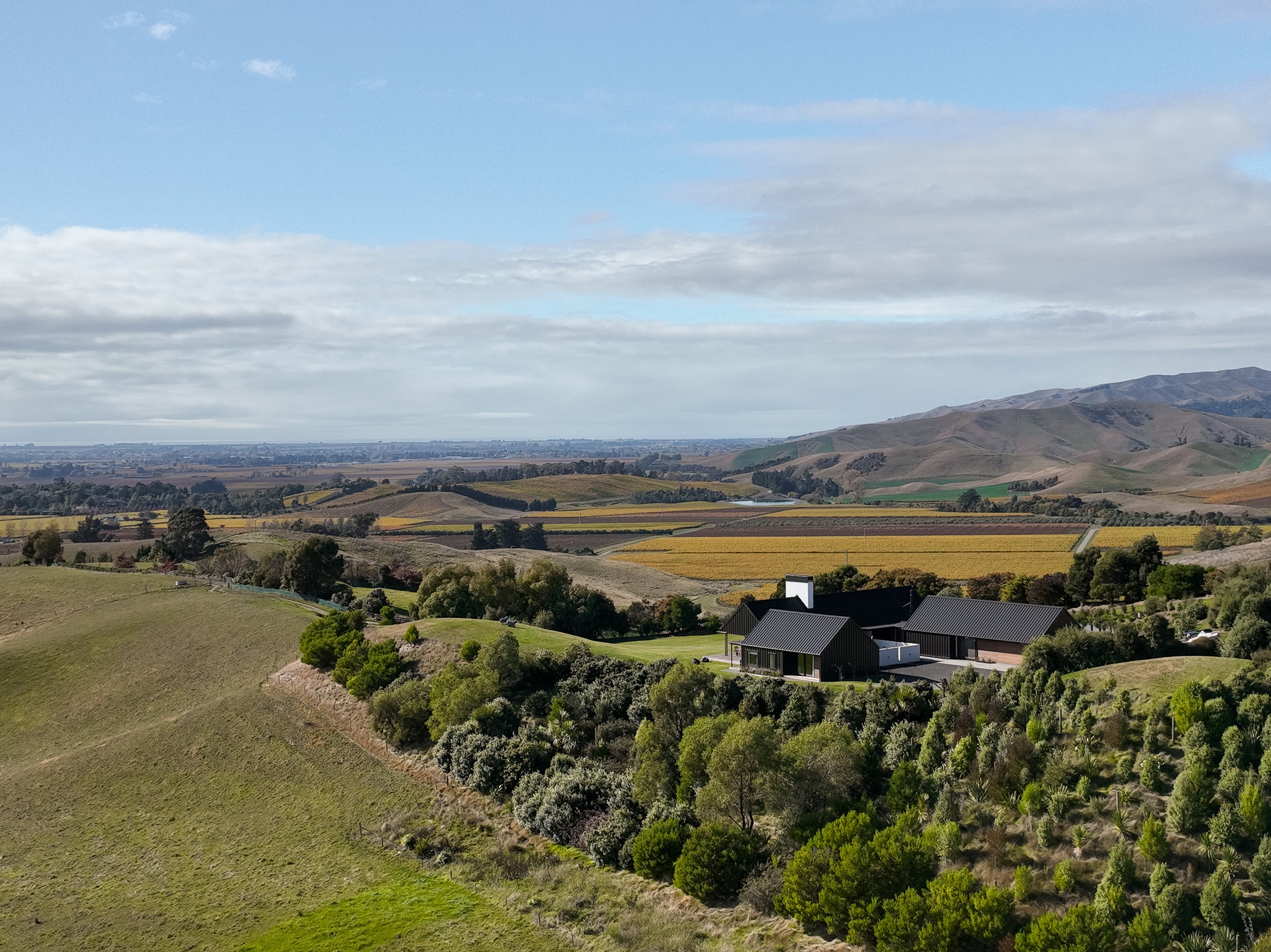 With Brancott Valley to the west and Cook Strait and Cloudy Bay to the east, this site enjoys myriad views – the objective was to make the most of them, while creating protection on the exposed site. Architecture ensures everything has been accomplished. The impressive four-bedroom home hunkers into its elevated site, while celebrating the vistas and making them an integral part of this rich offering.The three gabled forms are arranged in a U shape to create multiple outdoor areas. The southern concrete-block courtyard defines the entry and is the most sheltered of the outside spaces. Beautiful dark standing-seam Colorsteel and timber cladding give the exterior balance and texture. A soft palette provides a warm, inviting transition to the interior, and establishes cohesion throughout. There’s grandeur in the lofty cedar-lined ceilings, with timber floors and polished precast concrete panels adding richness and depth. A double-sided fireplace anchors the 391sqm house to its site and separates the entertaining area from a retreat. The generously sized bedroom and service wings provide privacy when family and guests are staying.