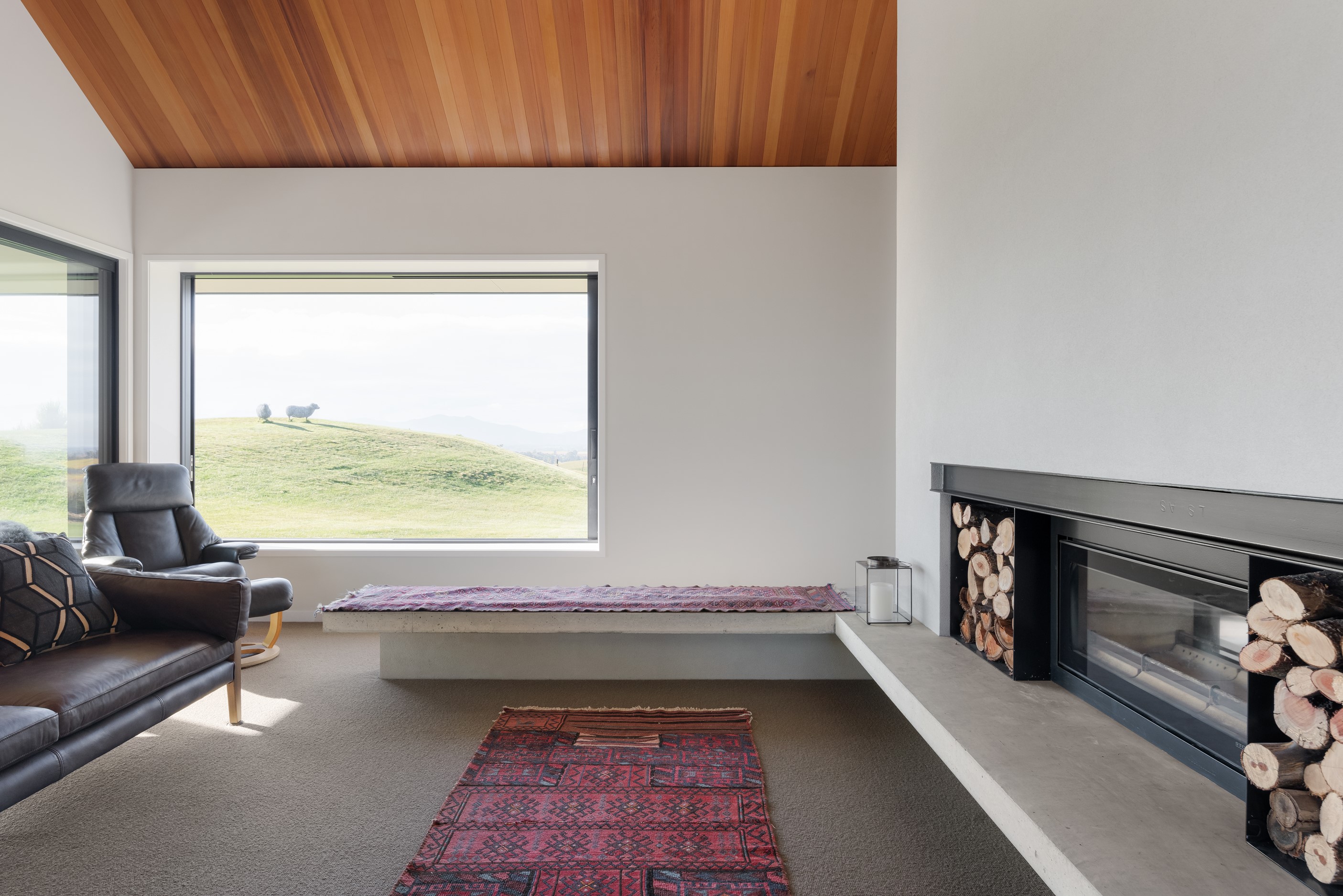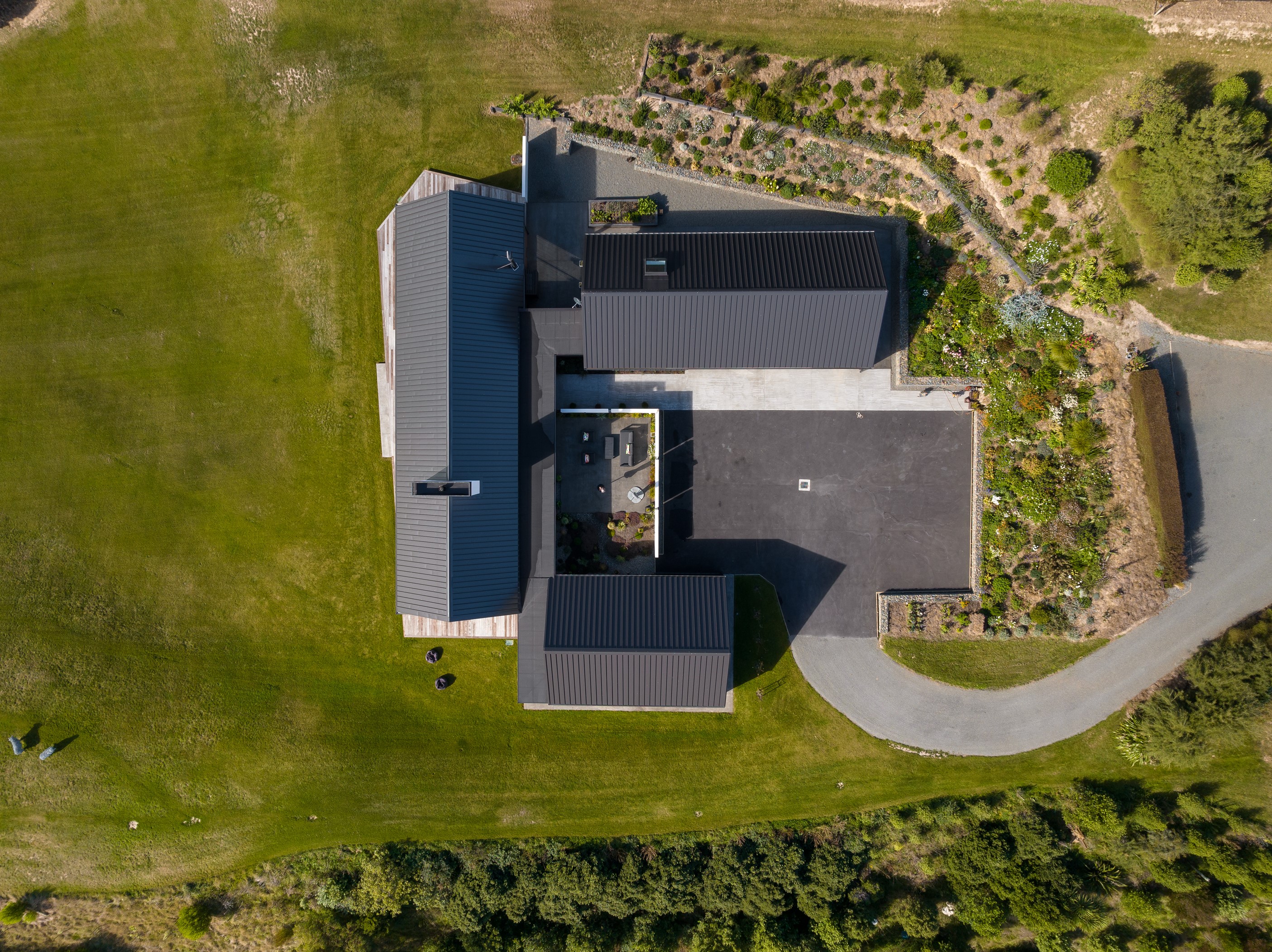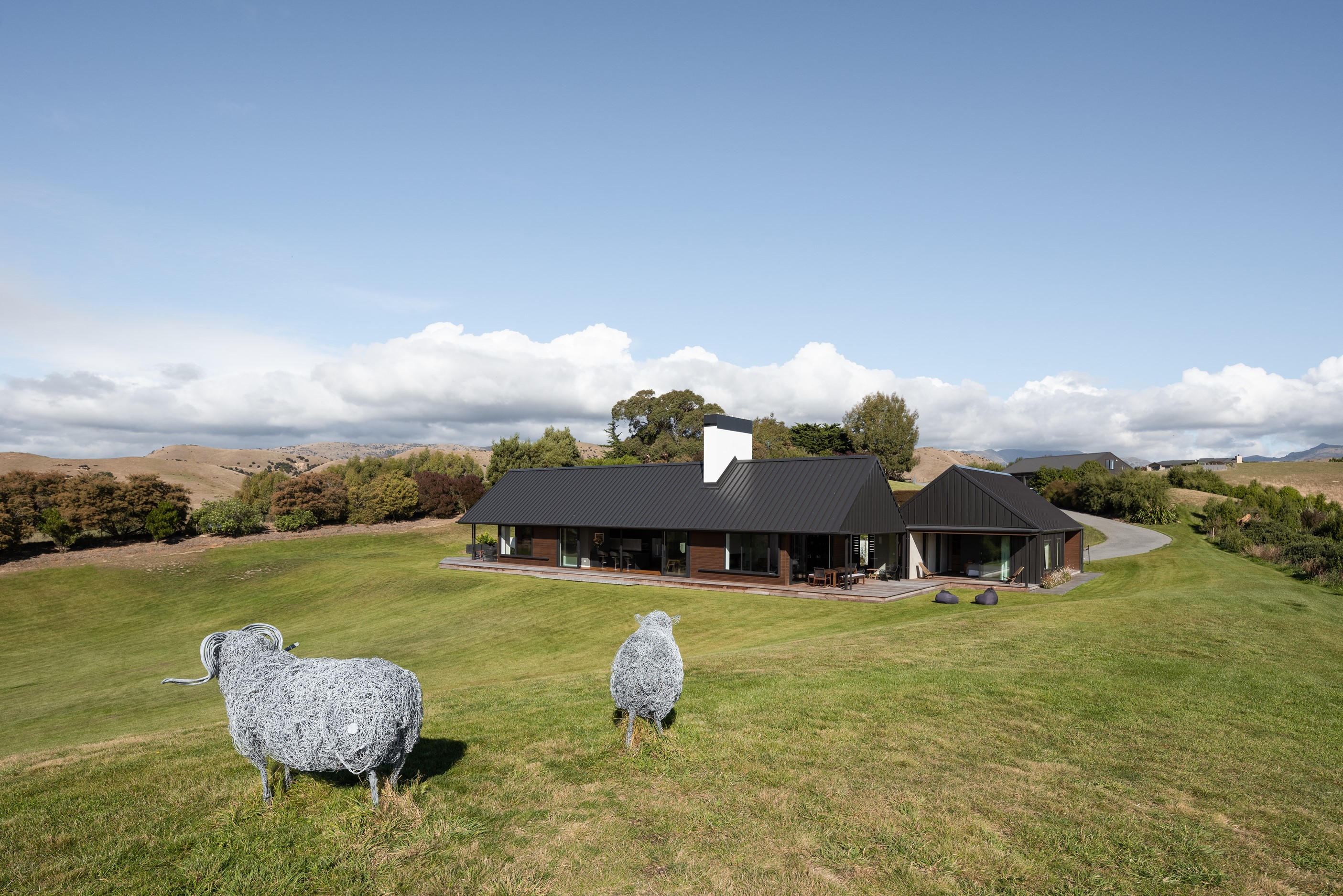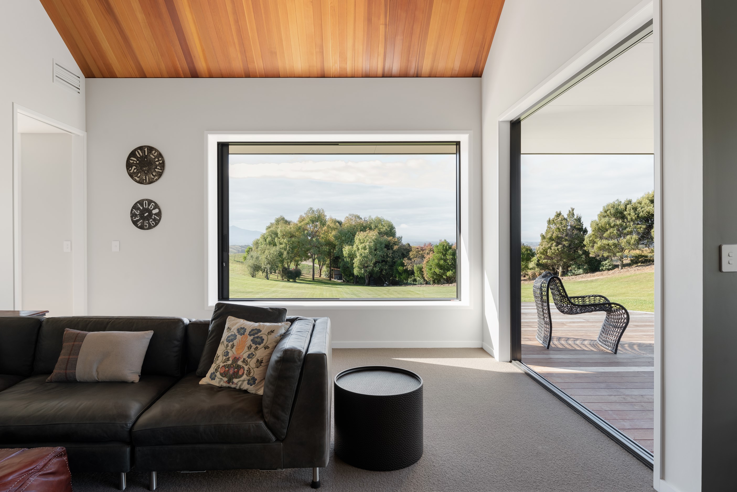 With Brancott Valley to the west and Cook Strait and Cloudy Bay to the east, this site enjoys myriad views – the objective was to make the most of them, while creating protection on the exposed site. Architecture ensures everything has been accomplished. The impressive four-bedroom home hunkers into its elevated site, while celebrating the vistas and making them an integral part of this rich offering.The three gabled forms are arranged in a U shape to create multiple outdoor areas. The southern concrete-block courtyard defines the entry and is the most sheltered of the outside spaces. Beautiful dark standing-seam Colorsteel and timber cladding give the exterior balance and texture. A soft palette provides a warm, inviting transition to the interior, and establishes cohesion throughout. There’s grandeur in the lofty cedar-lined ceilings, with timber floors and polished precast concrete panels adding richness and depth. A double-sided fireplace anchors the 391sqm house to its site and separates the entertaining area from a retreat. The generously sized bedroom and service wings provide privacy when family and guests are staying.