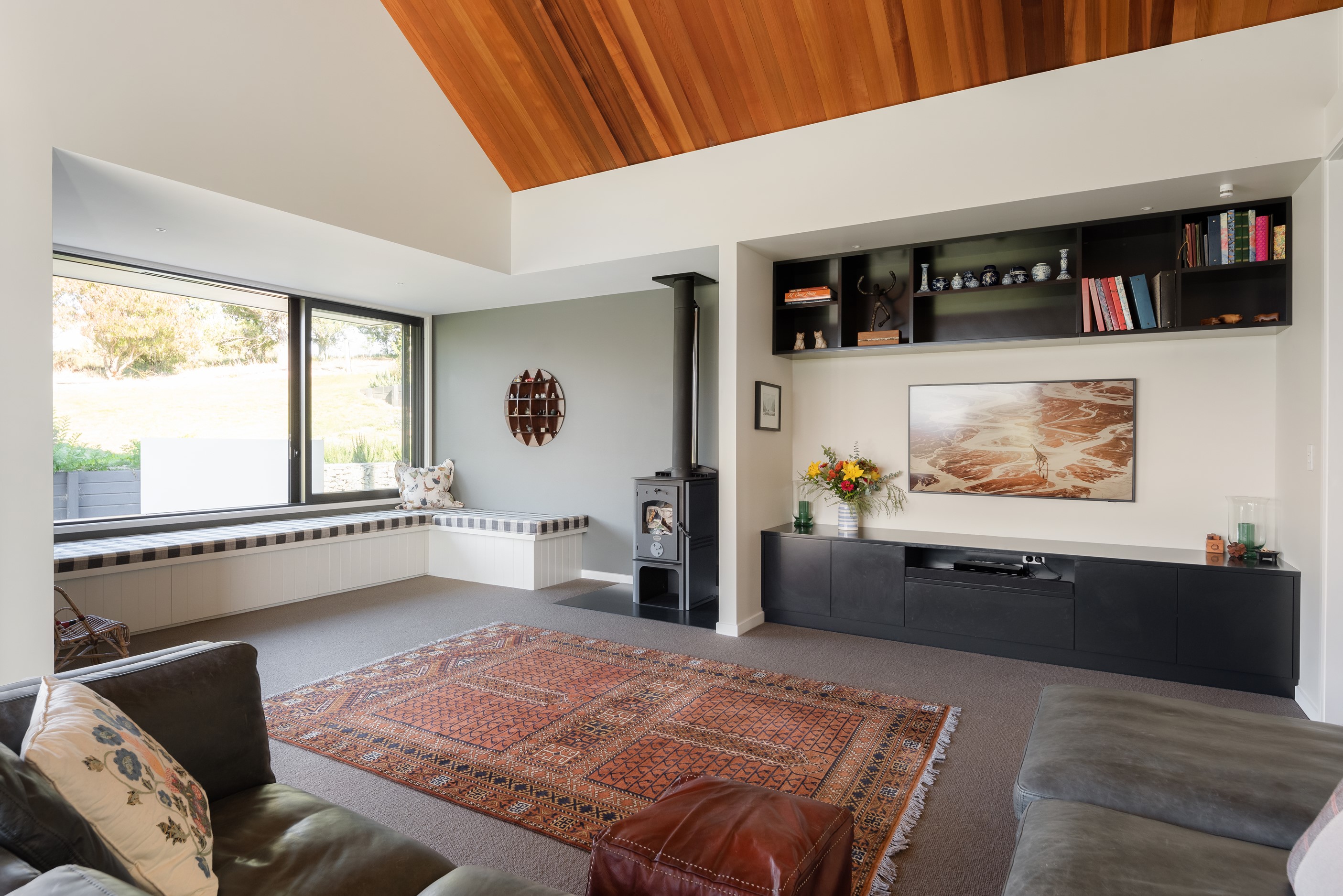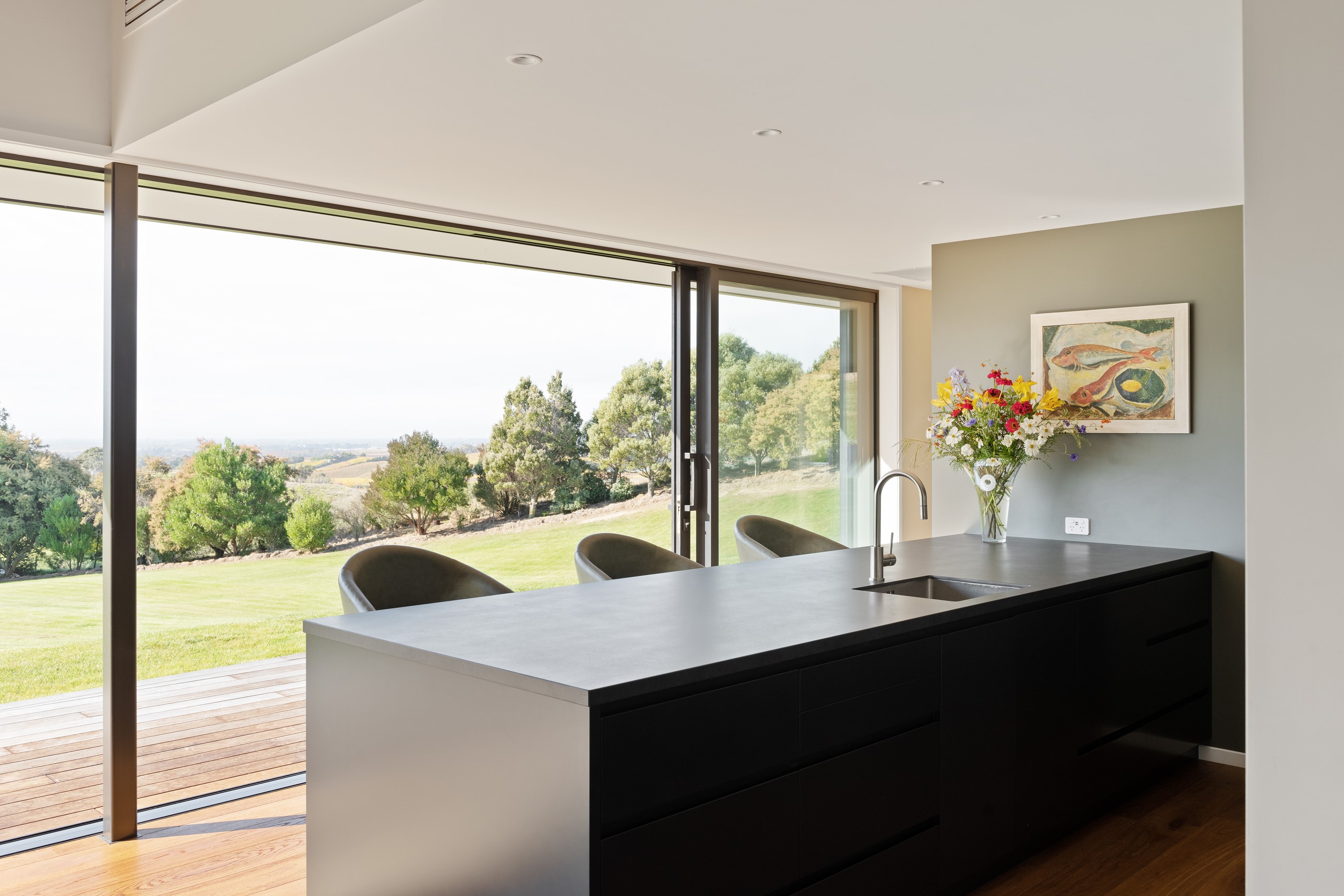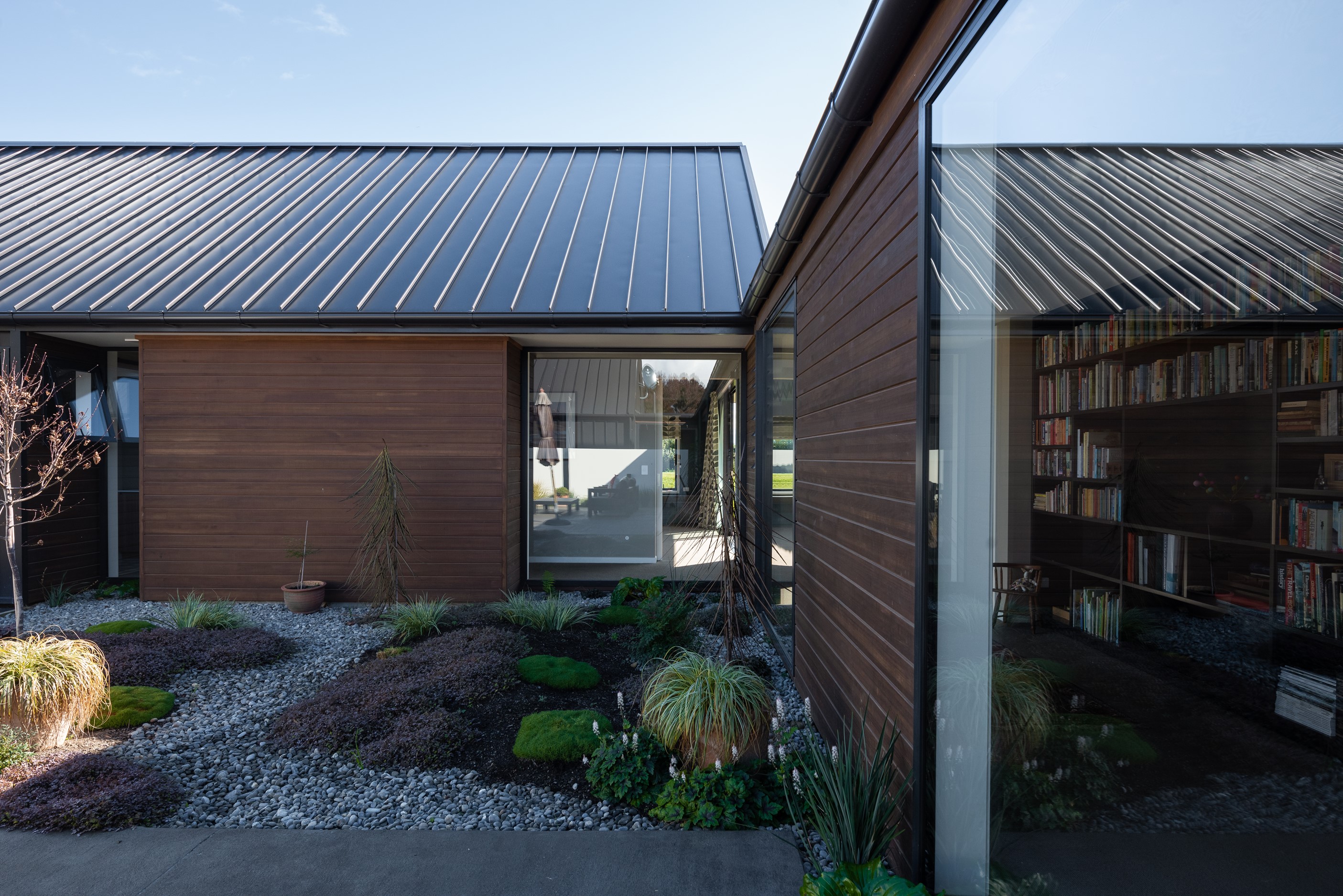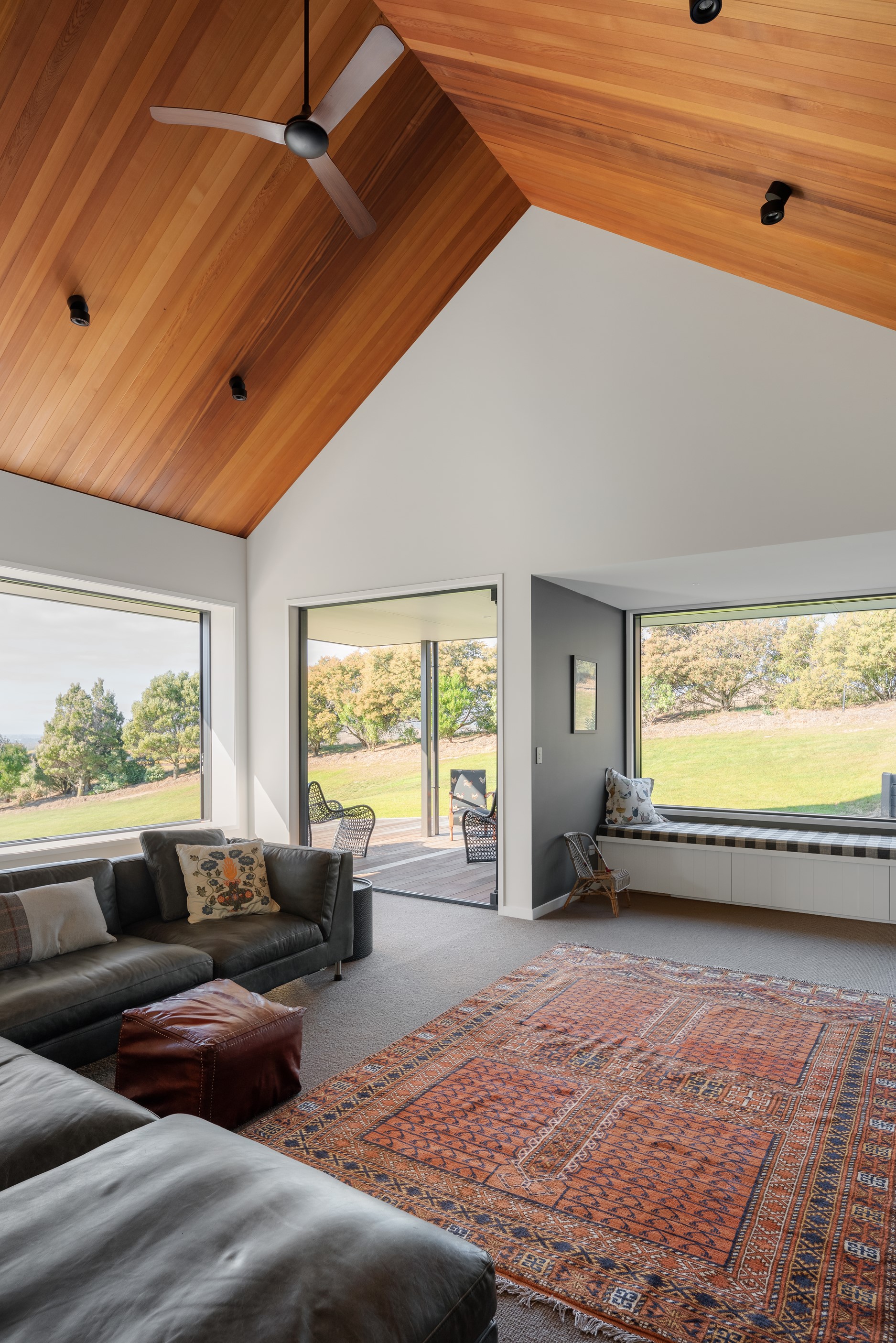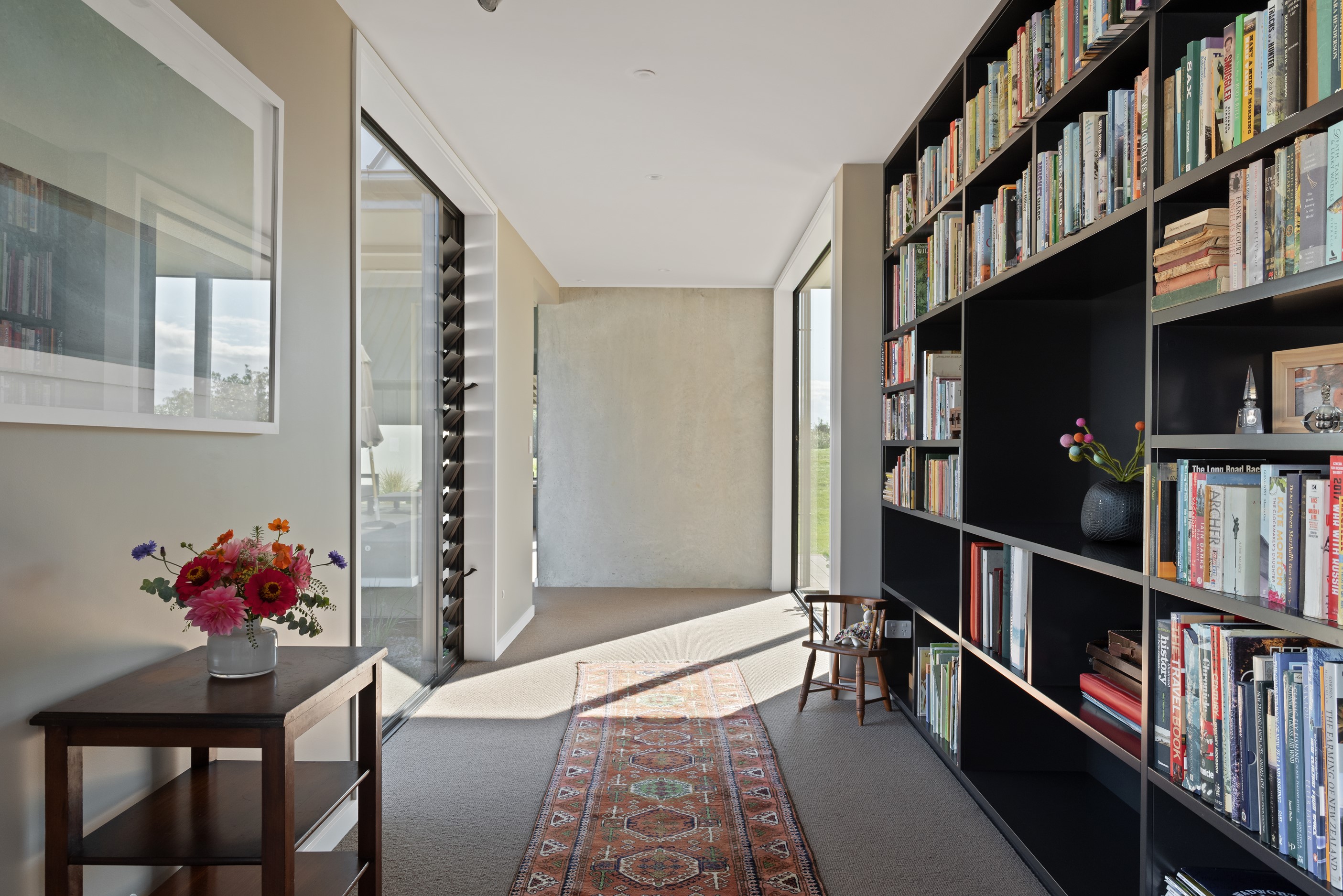 With Brancott Valley to the west and Cook Strait and Cloudy Bay to the east, this site enjoys myriad views – the objective was to make the most of them, while creating protection on the exposed site. Architecture ensures everything has been accomplished. The impressive four-bedroom home hunkers into its elevated site, while celebrating the vistas and making them an integral part of this rich offering.The three gabled forms are arranged in a U shape to create multiple outdoor areas. The southern concrete-block courtyard defines the entry and is the most sheltered of the outside spaces. Beautiful dark standing-seam Colorsteel and timber cladding give the exterior balance and texture. A soft palette provides a warm, inviting transition to the interior, and establishes cohesion throughout. There’s grandeur in the lofty cedar-lined ceilings, with timber floors and polished precast concrete panels adding richness and depth. A double-sided fireplace anchors the 391sqm house to its site and separates the entertaining area from a retreat. The generously sized bedroom and service wings provide privacy when family and guests are staying.