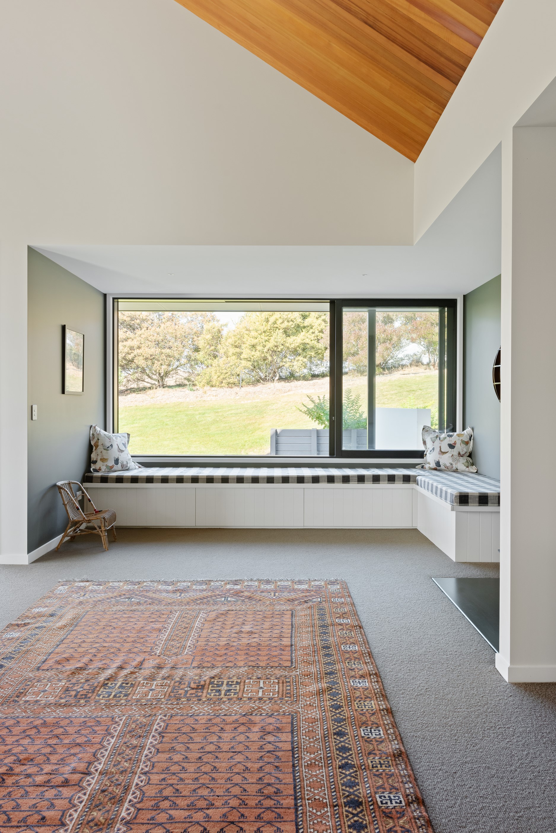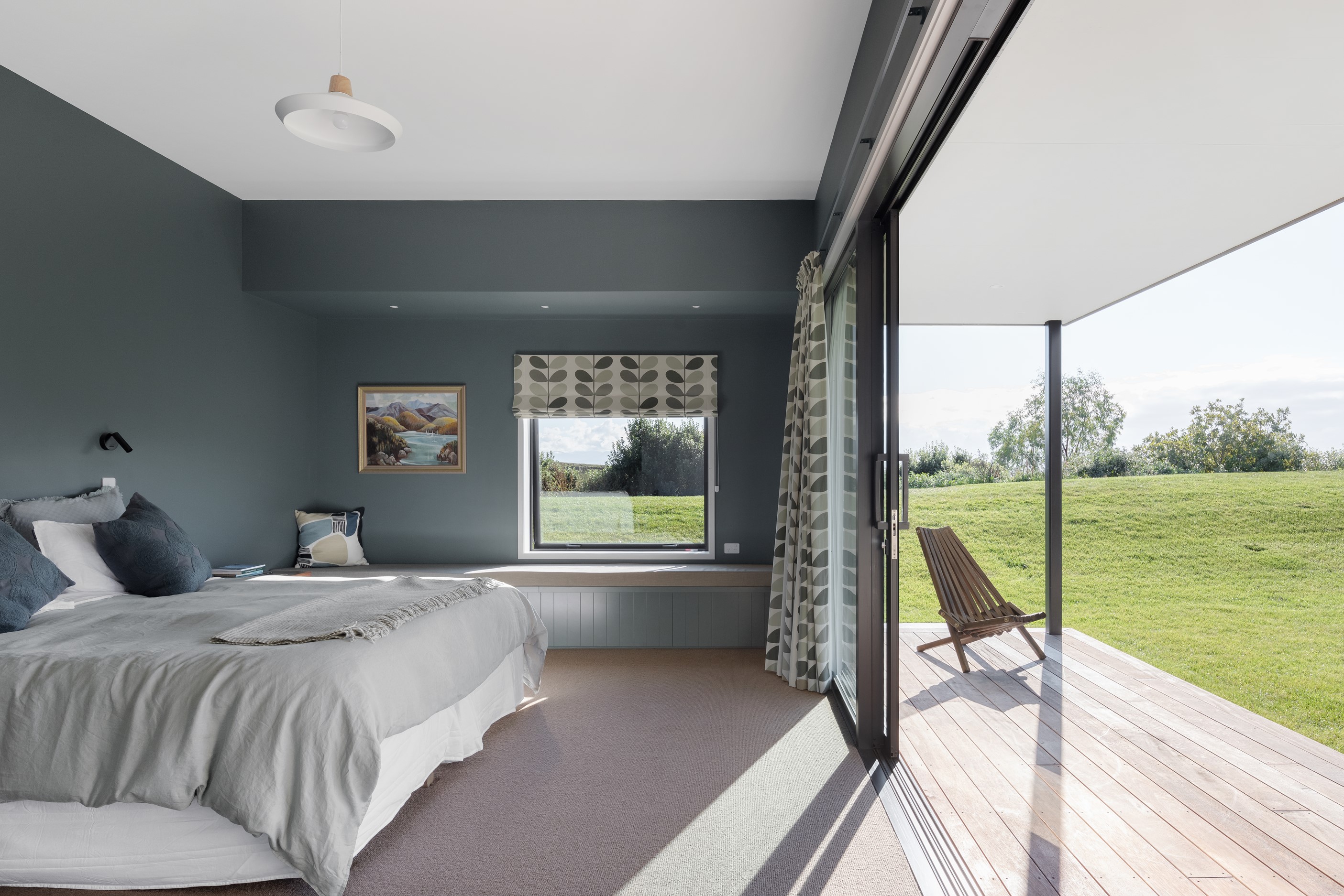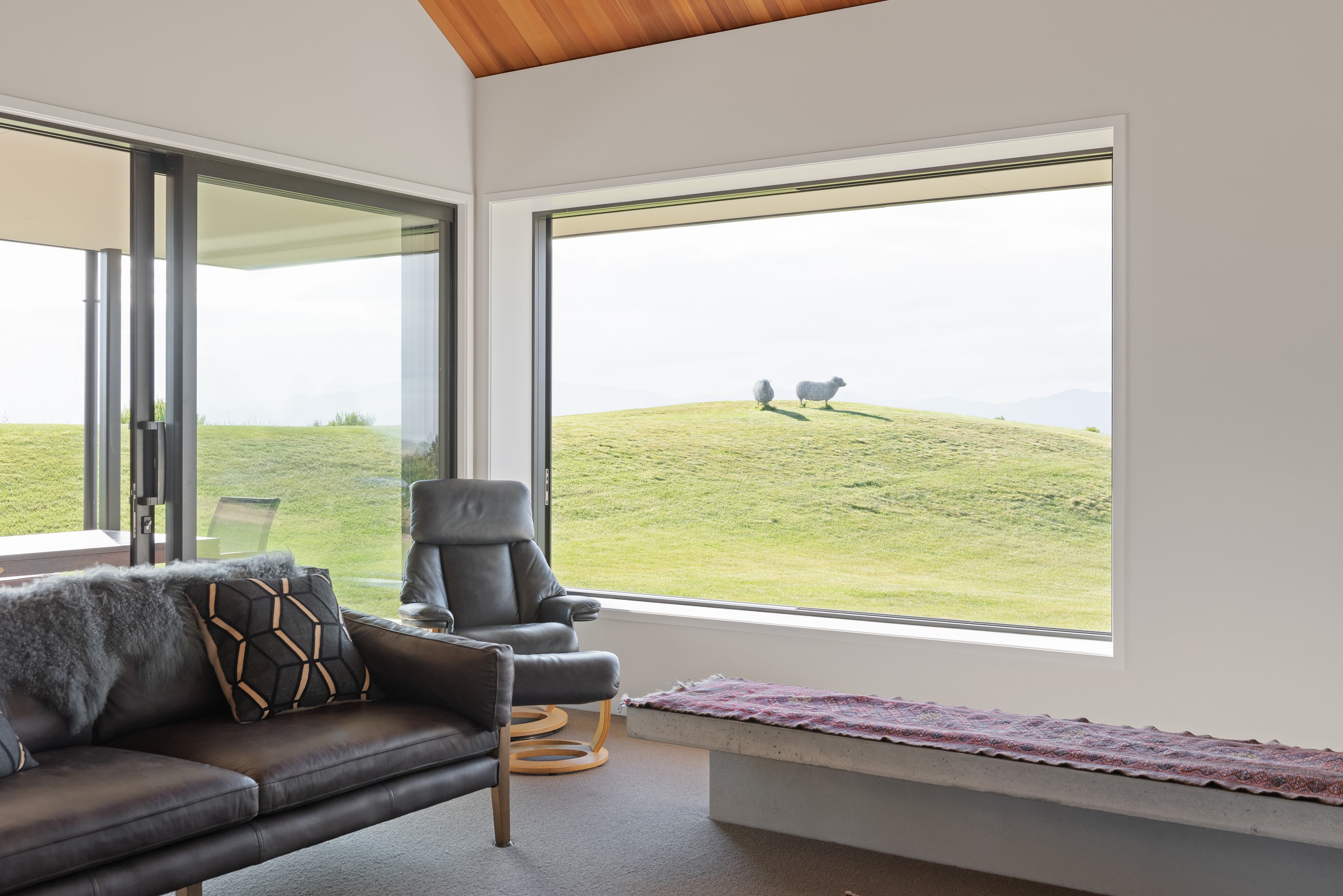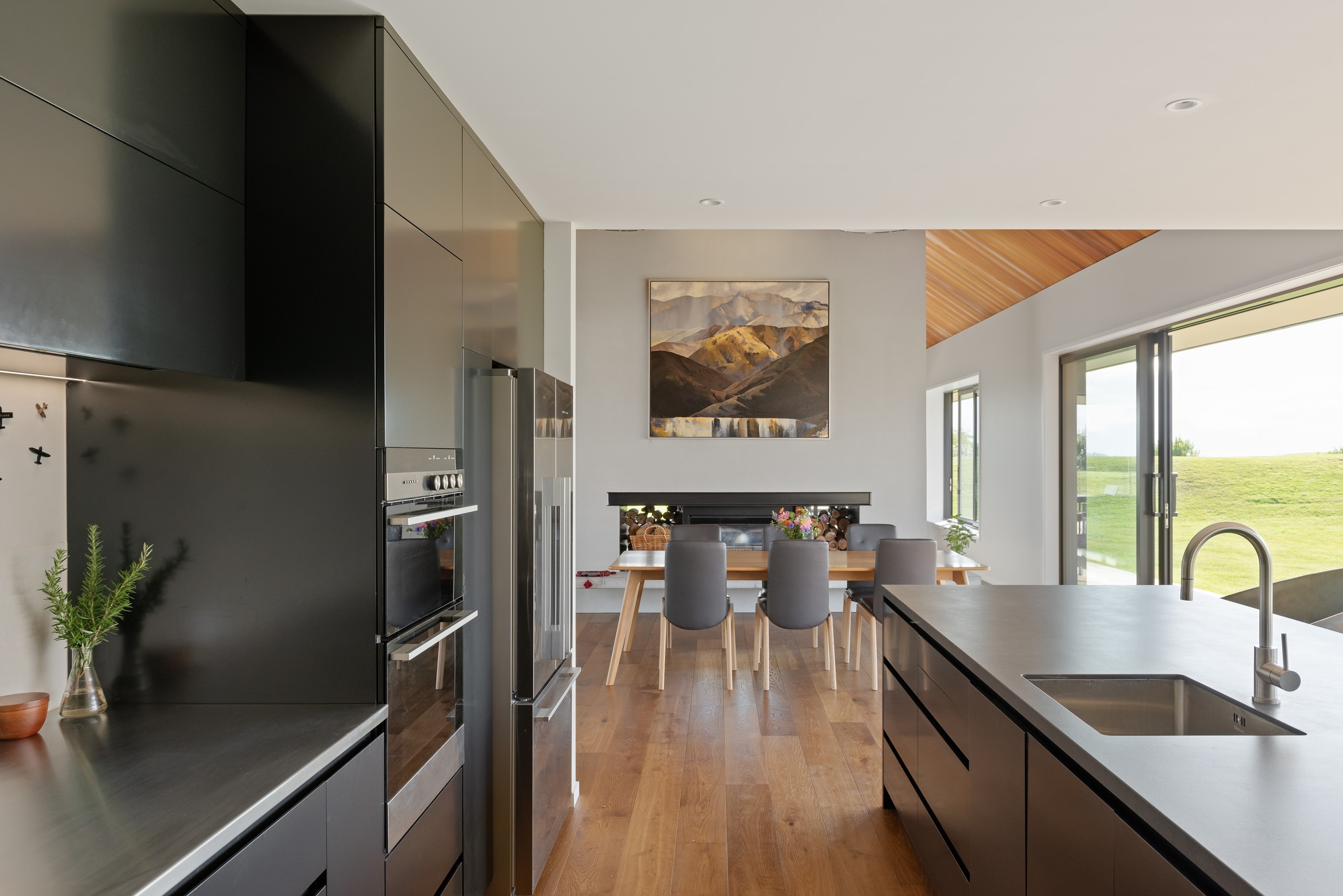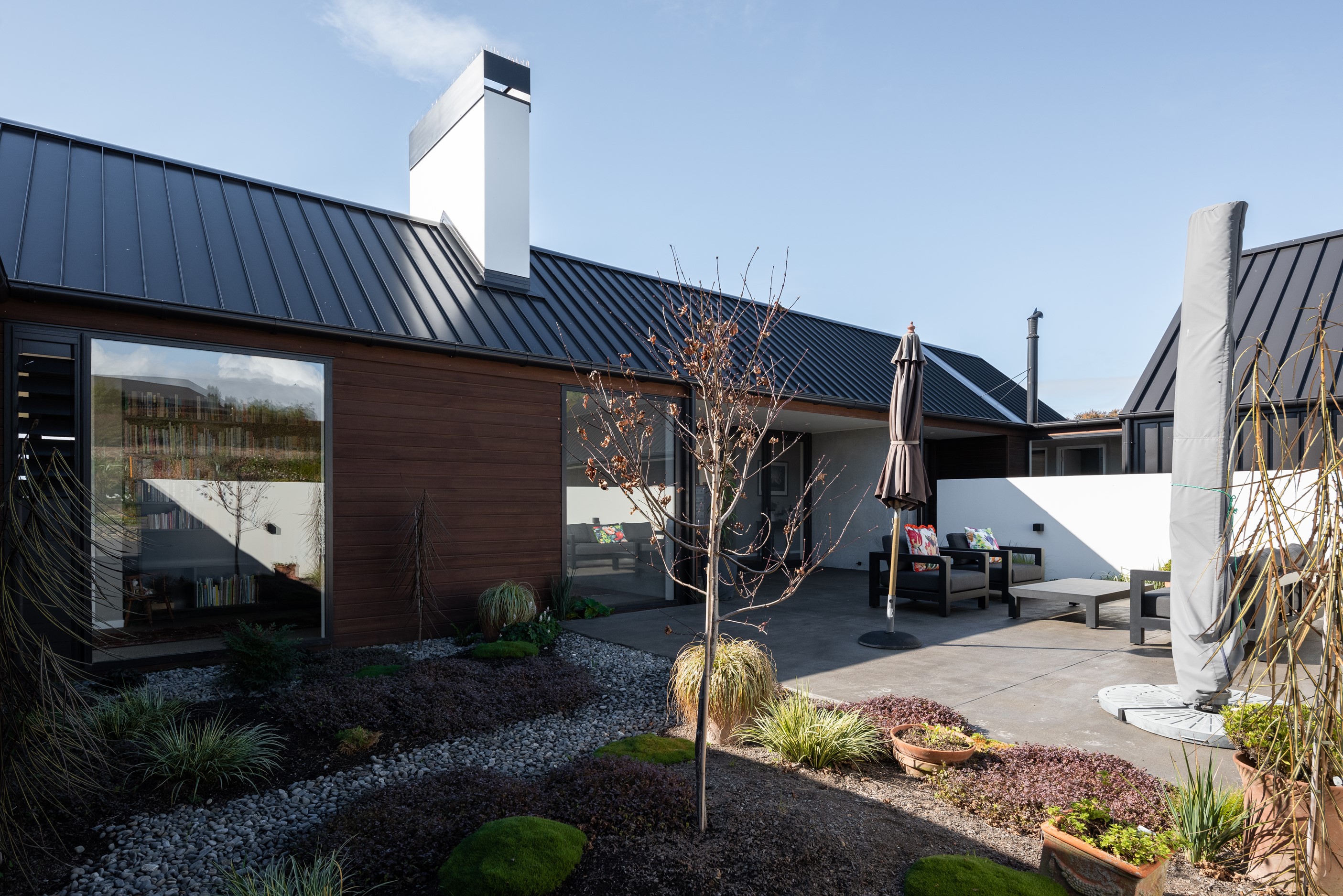 With Brancott Valley to the west and Cook Strait and Cloudy Bay to the east, this site enjoys myriad views – the objective was to make the most of them, while creating protection on the exposed site. Architecture ensures everything has been accomplished. The impressive four-bedroom home hunkers into its elevated site, while celebrating the vistas and making them an integral part of this rich offering.The three gabled forms are arranged in a U shape to create multiple outdoor areas. The southern concrete-block courtyard defines the entry and is the most sheltered of the outside spaces. Beautiful dark standing-seam Colorsteel and timber cladding give the exterior balance and texture. A soft palette provides a warm, inviting transition to the interior, and establishes cohesion throughout. There’s grandeur in the lofty cedar-lined ceilings, with timber floors and polished precast concrete panels adding richness and depth. A double-sided fireplace anchors the 391sqm house to its site and separates the entertaining area from a retreat. The generously sized bedroom and service wings provide privacy when family and guests are staying.