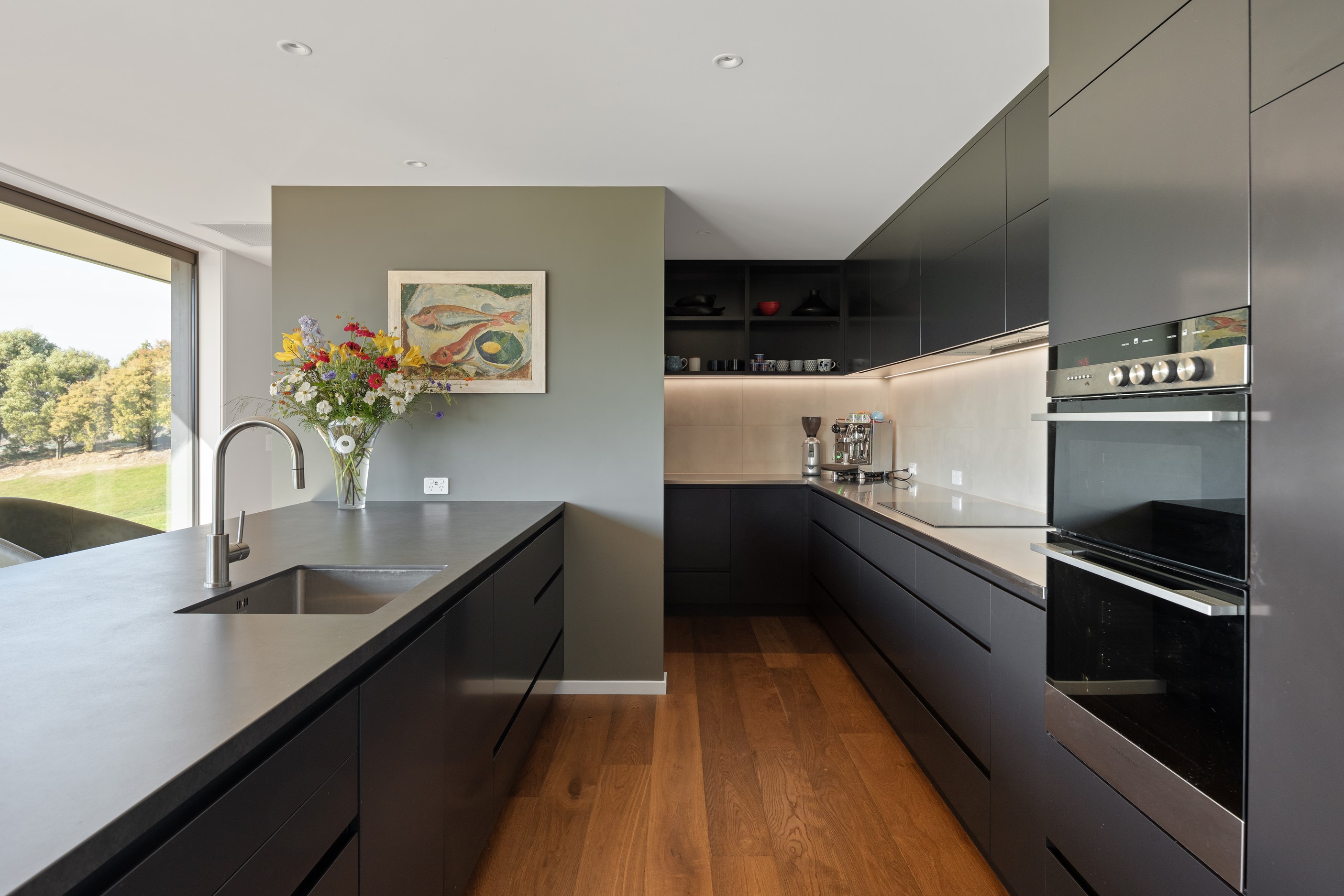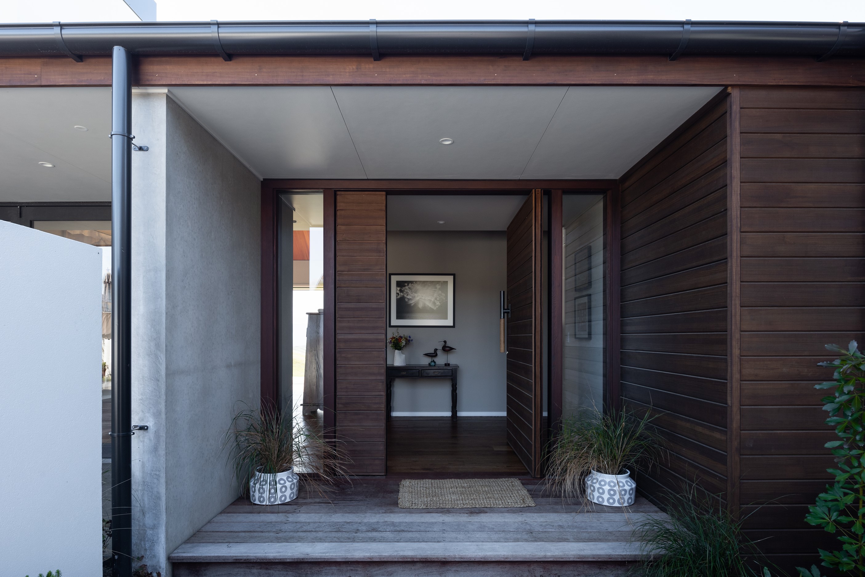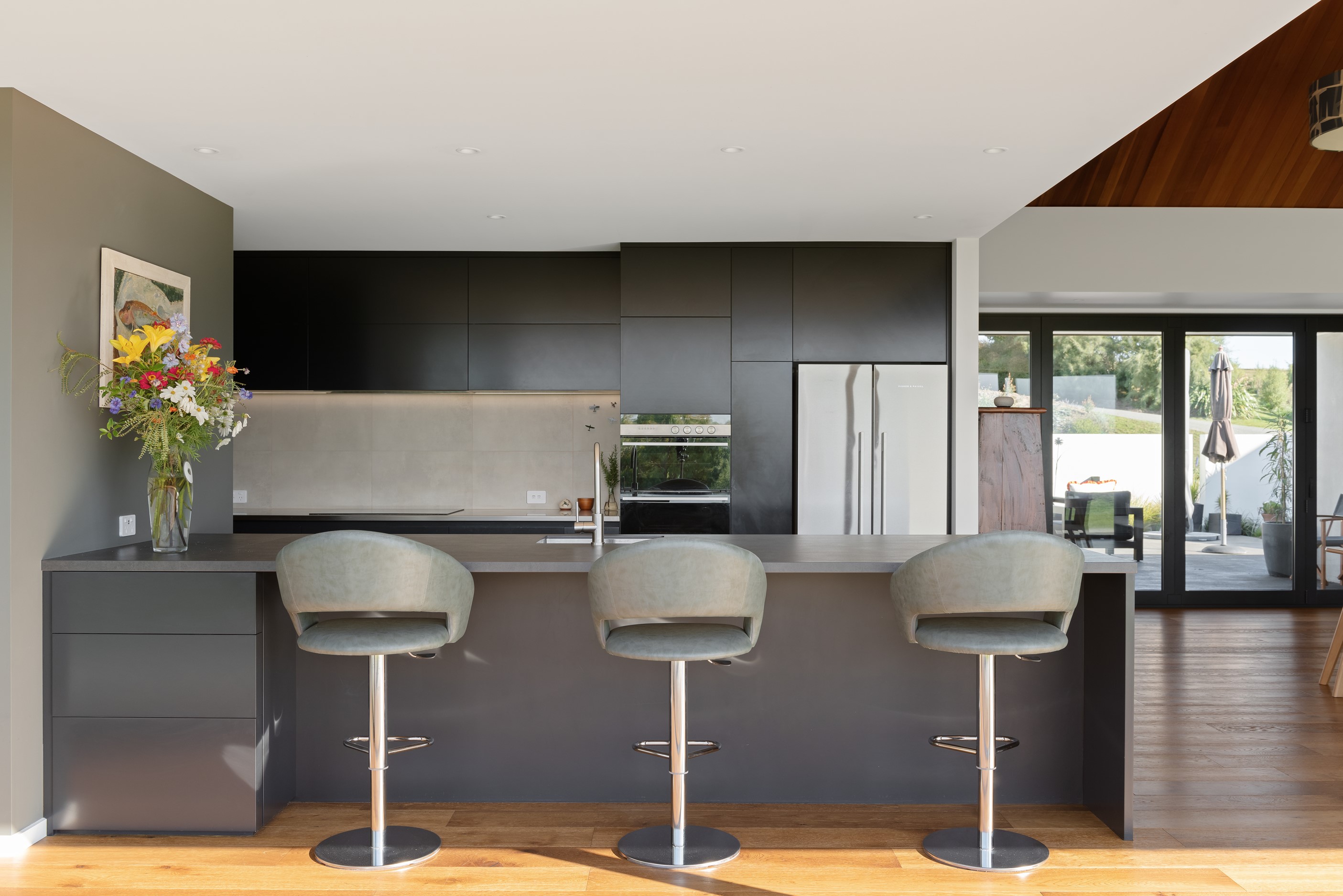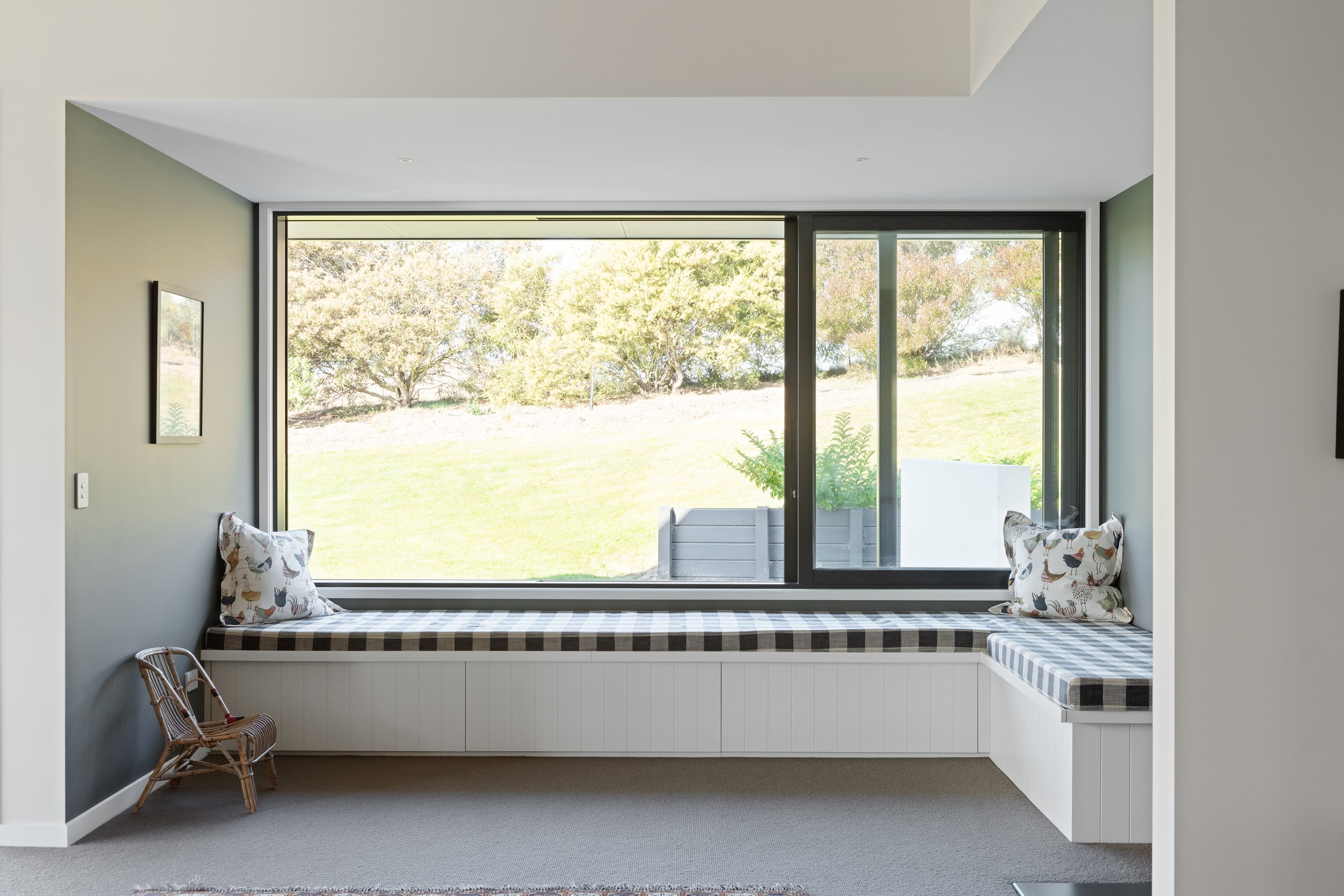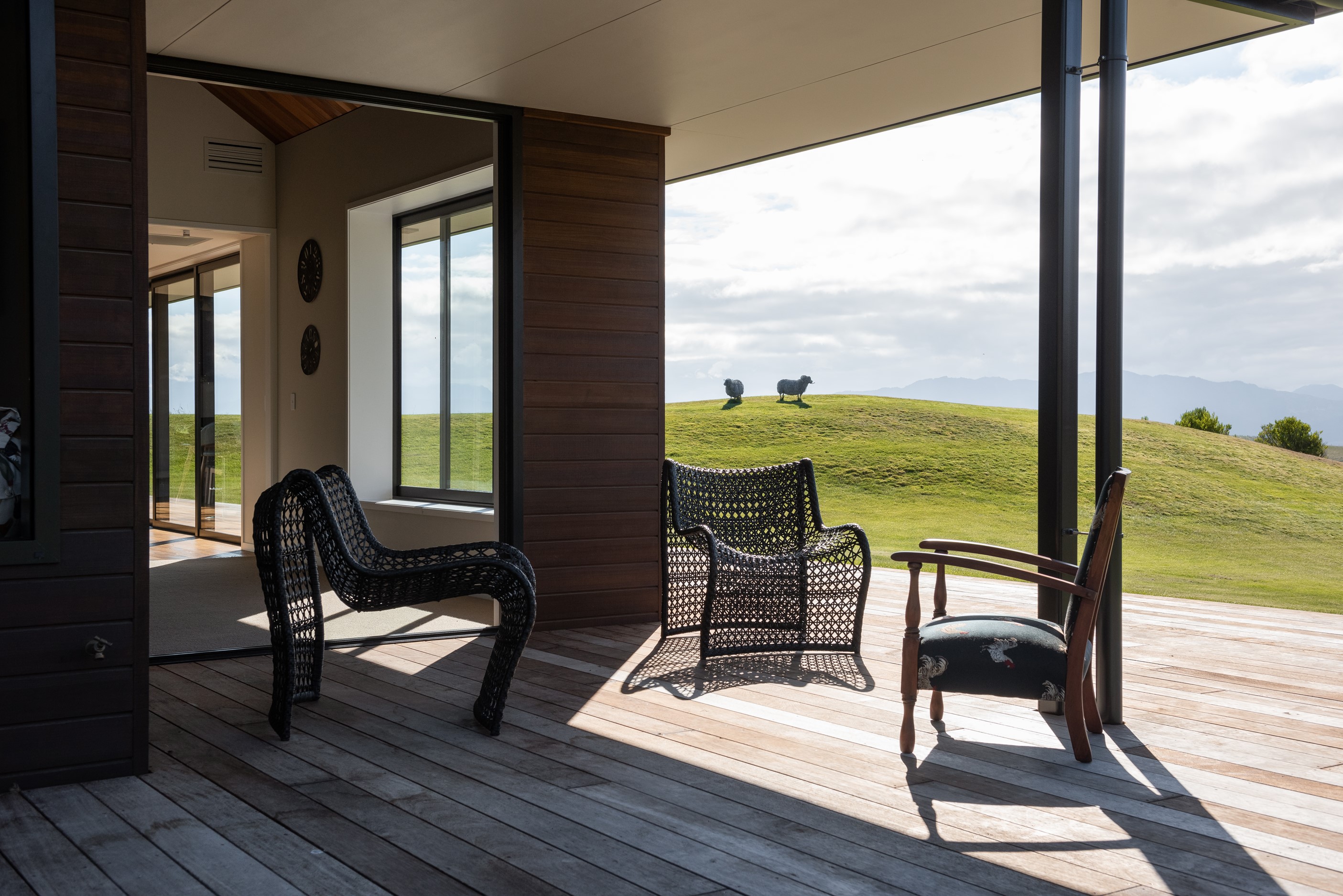 With Brancott Valley to the west and Cook Strait and Cloudy Bay to the east, this site enjoys myriad views – the objective was to make the most of them, while creating protection on the exposed site. Architecture ensures everything has been accomplished. The impressive four-bedroom home hunkers into its elevated site, while celebrating the vistas and making them an integral part of this rich offering.The three gabled forms are arranged in a U shape to create multiple outdoor areas. The southern concrete-block courtyard defines the entry and is the most sheltered of the outside spaces. Beautiful dark standing-seam Colorsteel and timber cladding give the exterior balance and texture. A soft palette provides a warm, inviting transition to the interior, and establishes cohesion throughout. There’s grandeur in the lofty cedar-lined ceilings, with timber floors and polished precast concrete panels adding richness and depth. A double-sided fireplace anchors the 391sqm house to its site and separates the entertaining area from a retreat. The generously sized bedroom and service wings provide privacy when family and guests are staying.