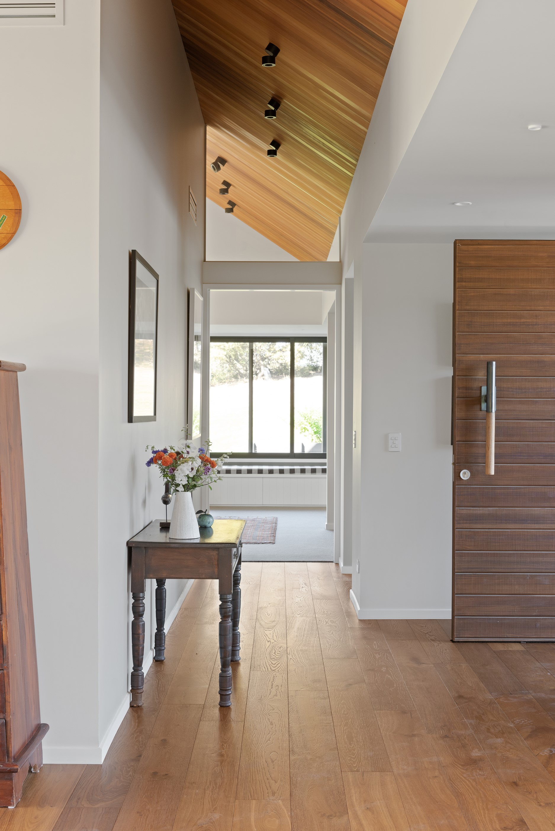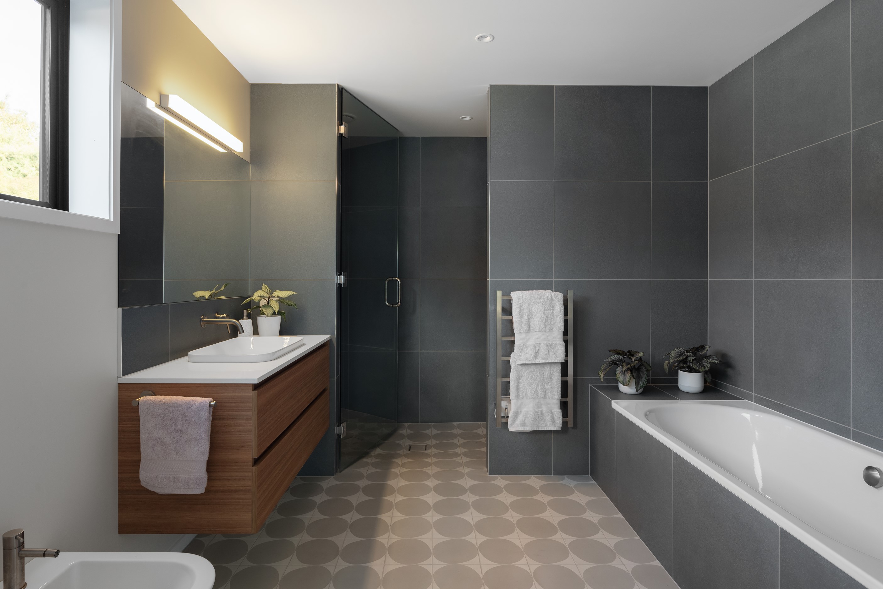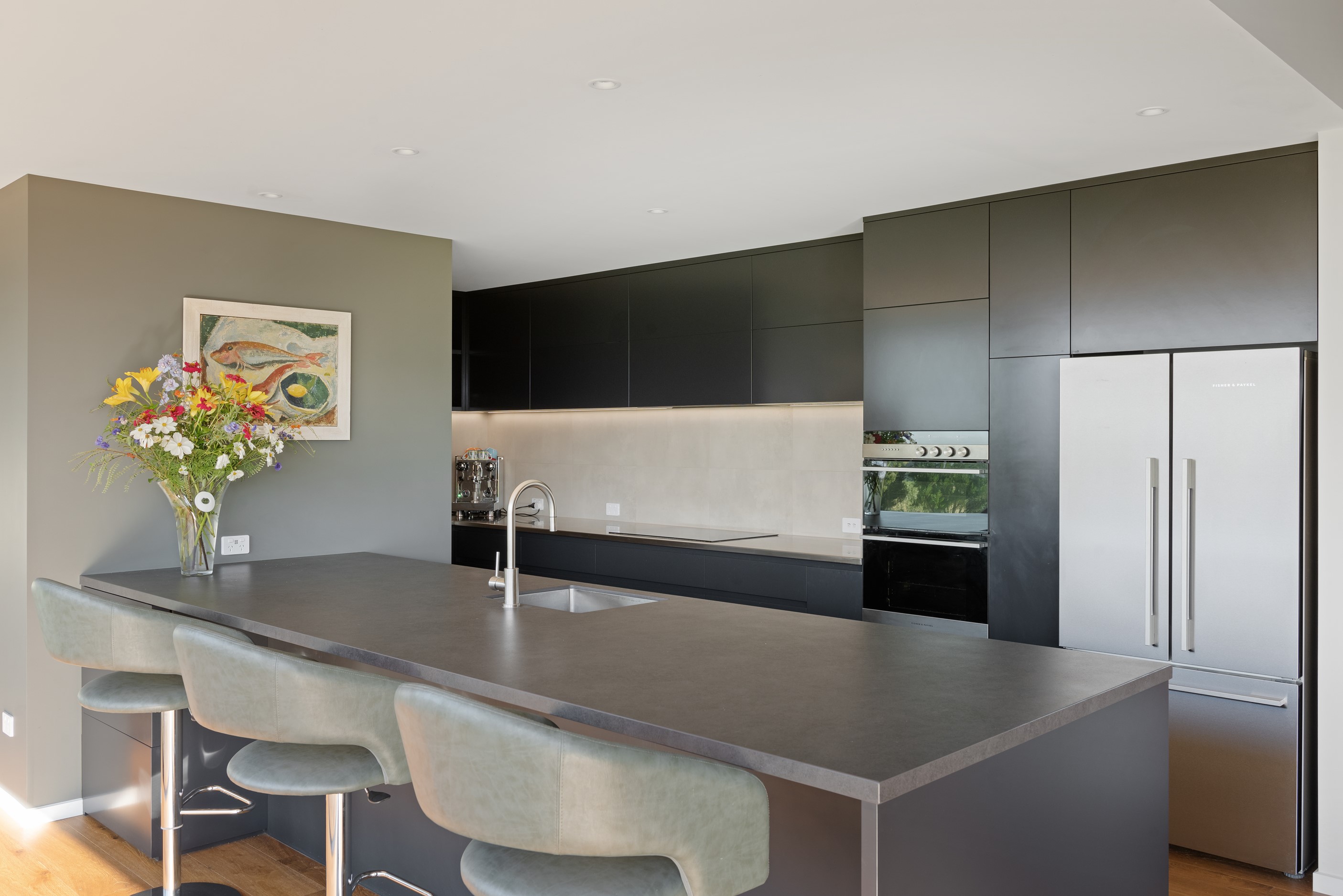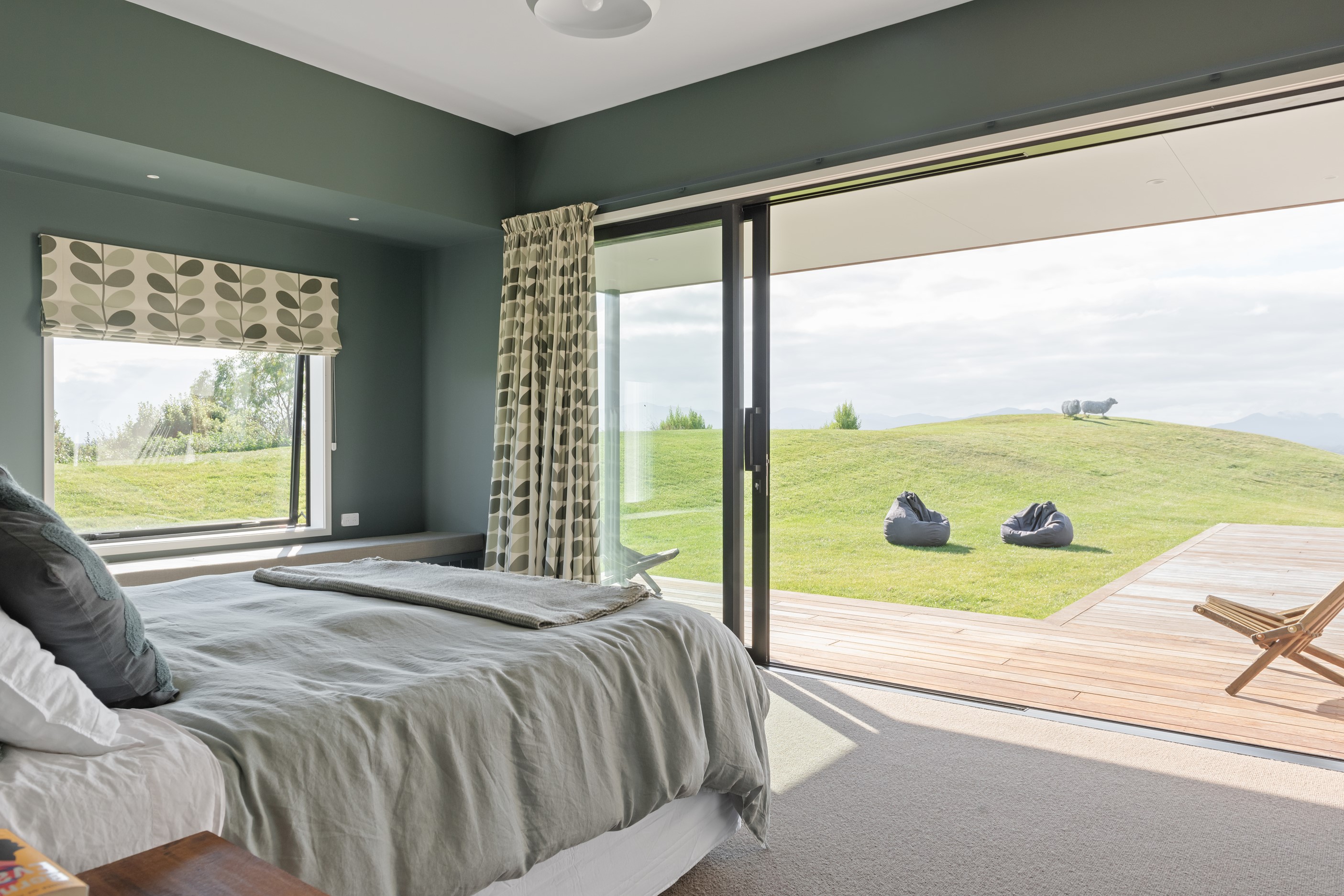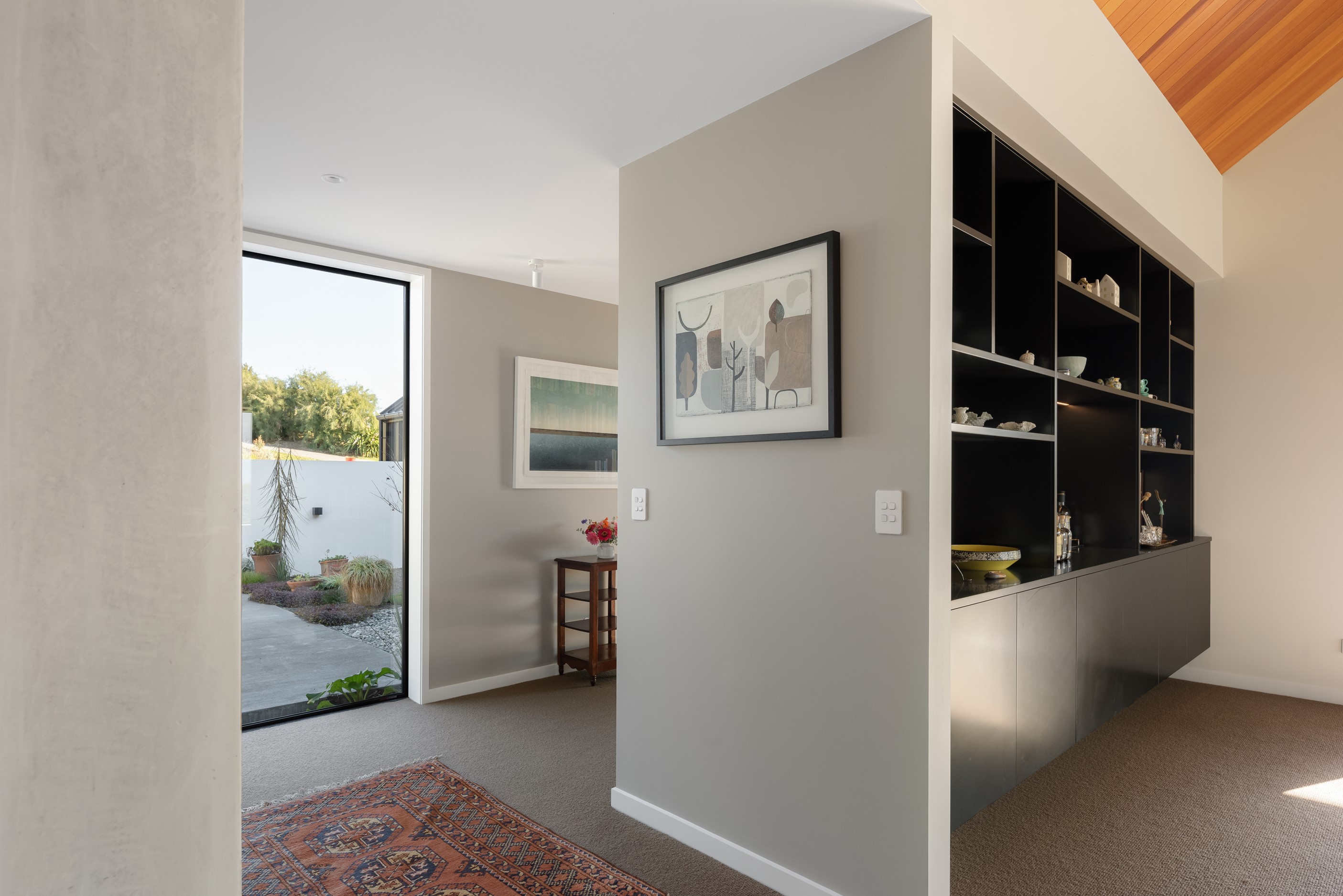 With Brancott Valley to the west and Cook Strait and Cloudy Bay to the east, this site enjoys myriad views – the objective was to make the most of them, while creating protection on the exposed site. Architecture ensures everything has been accomplished. The impressive four-bedroom home hunkers into its elevated site, while celebrating the vistas and making them an integral part of this rich offering.The three gabled forms are arranged in a U shape to create multiple outdoor areas. The southern concrete-block courtyard defines the entry and is the most sheltered of the outside spaces. Beautiful dark standing-seam Colorsteel and timber cladding give the exterior balance and texture. A soft palette provides a warm, inviting transition to the interior, and establishes cohesion throughout. There’s grandeur in the lofty cedar-lined ceilings, with timber floors and polished precast concrete panels adding richness and depth. A double-sided fireplace anchors the 391sqm house to its site and separates the entertaining area from a retreat. The generously sized bedroom and service wings provide privacy when family and guests are staying.