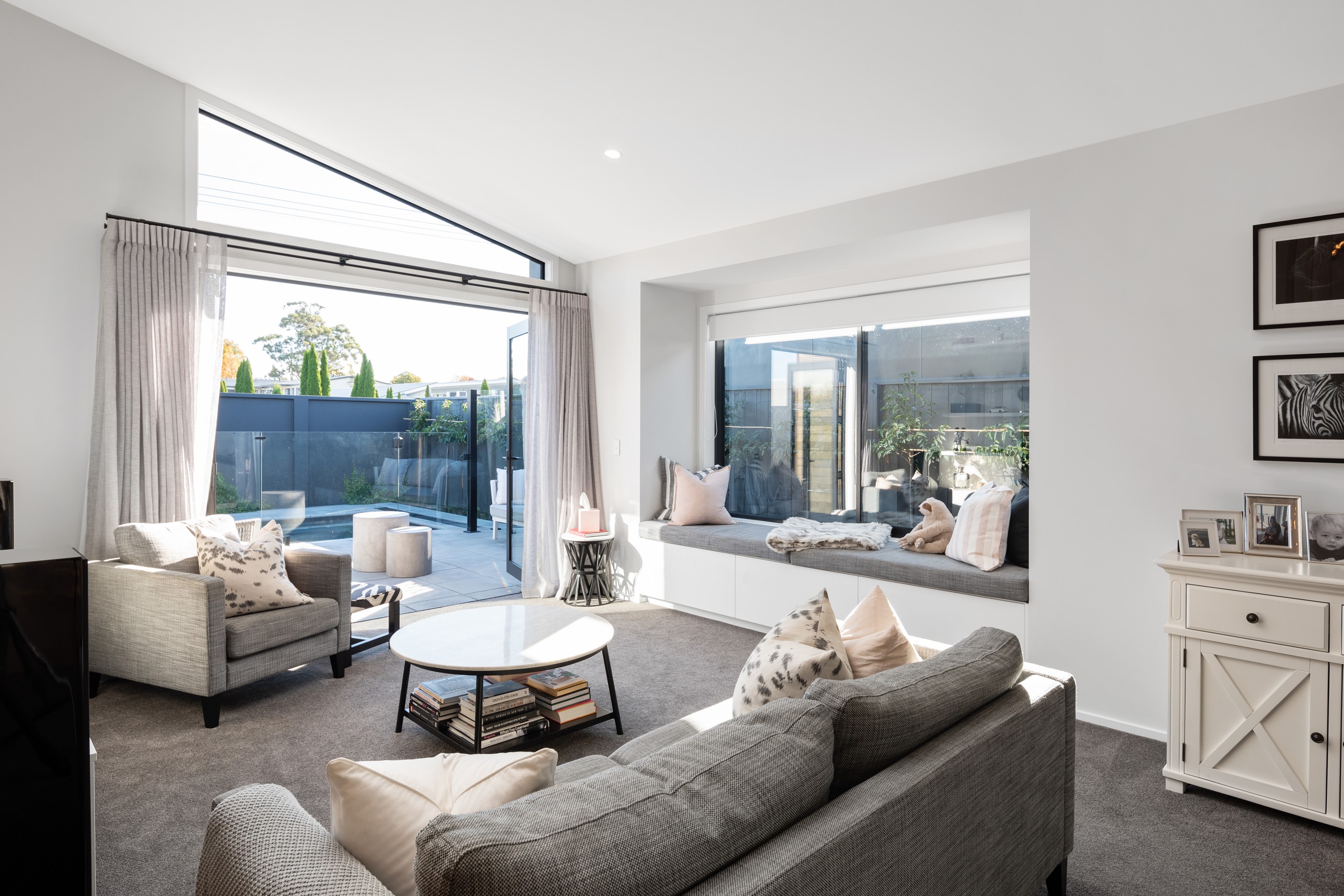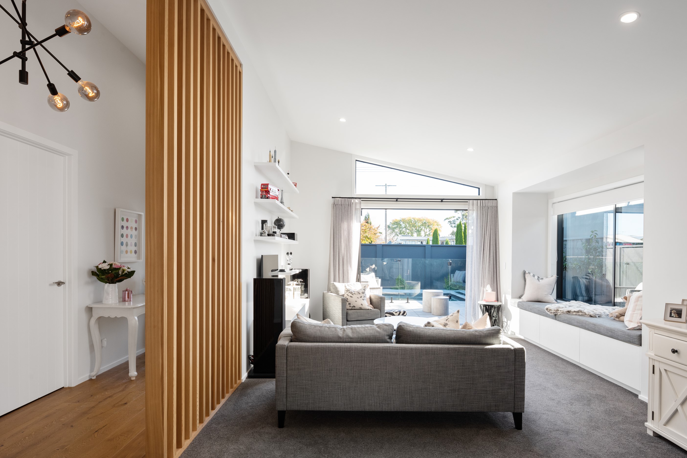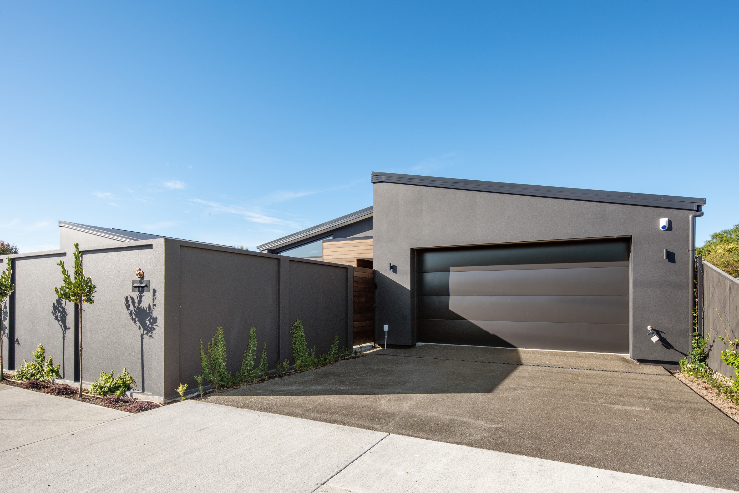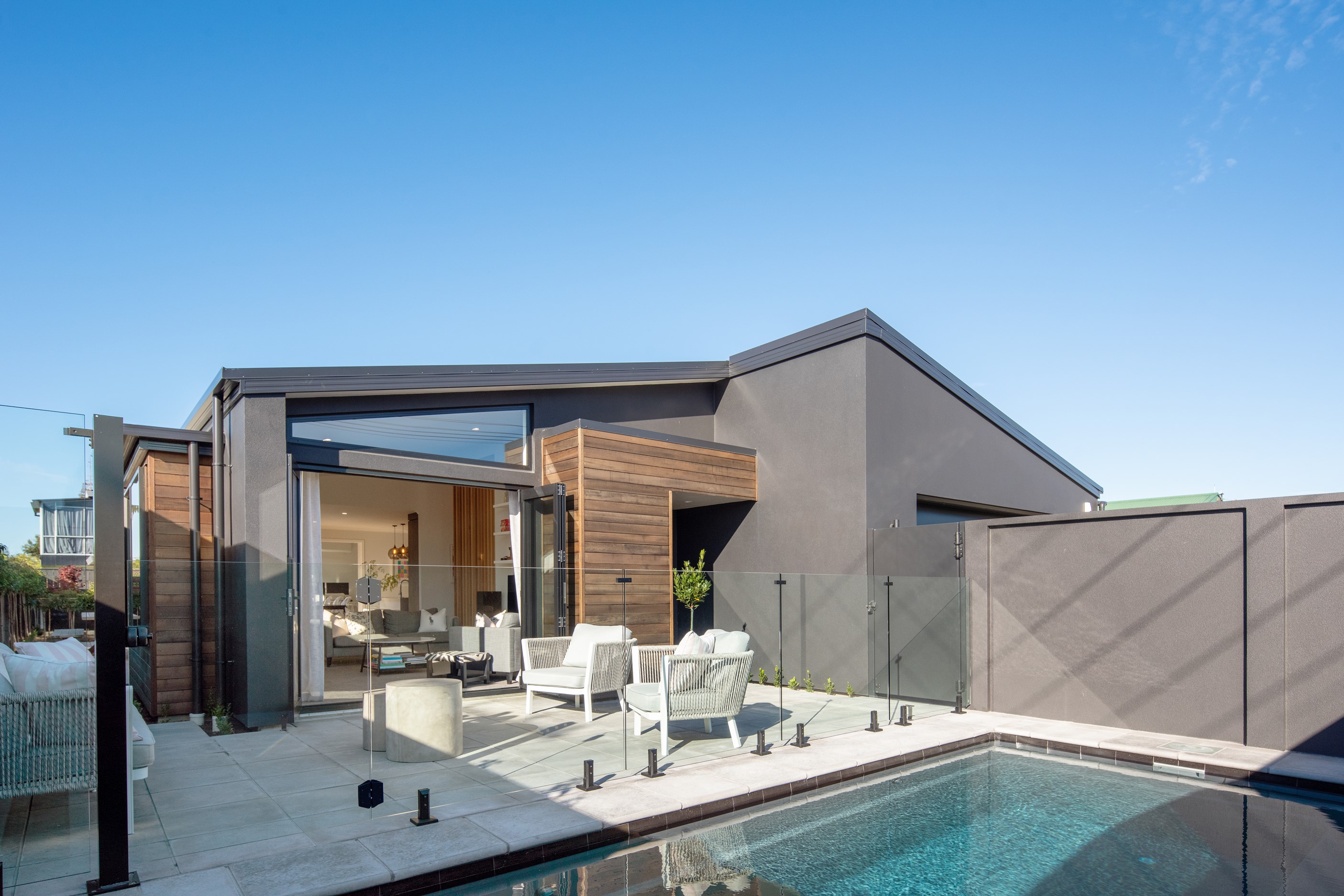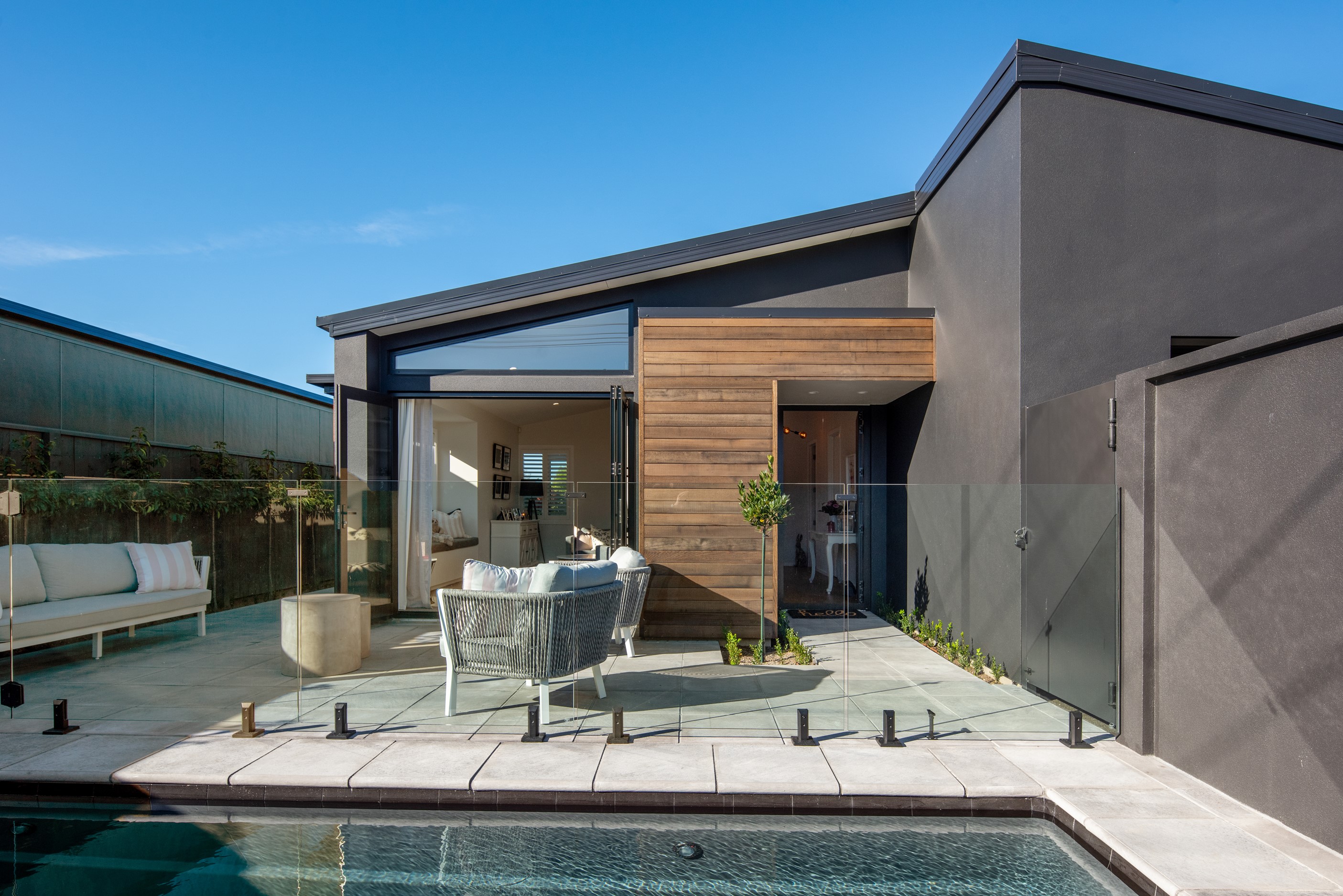 Sleek, ultra-modern and with a plunge pool, this three-bedroom house covers every base. From the outside, the 204sqm residence is all clean lines and handsome dark features punctuated with timber accents. Inside, the theme continues within light and airy spaces, thanks to raking ceilings, a pale wall palette and sliders that encourage the Marlborough sunshine inside. A decorative cedar screen separates the entry from the living space, which features a raking window. Stepping into the living area, the window seat offers just the spot to bask in the sun with a book in hand. The matching engineered stone benchtops and splashback set the scene in the kitchen, which has contrasting dark cabinetry, a gas cooktop, integrated dishwasher and engineered timber floors. A trio of pendant lights illuminates the island bench. Rooms are linked by a central hall, which is bathed in light thanks to two skylights. Two bathrooms, including an ensuite, have fully tiled showers. You’ll also find a snug/office, separate toilet, laundry and garage.