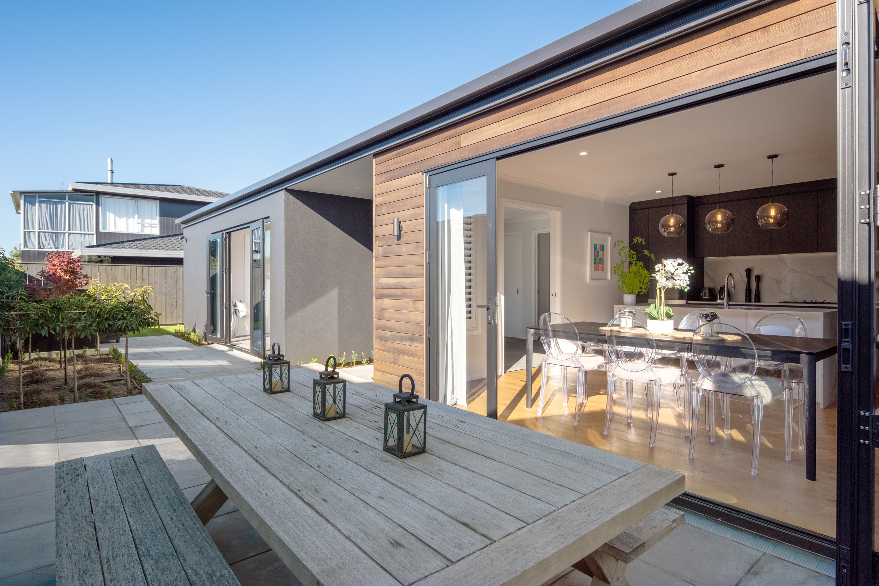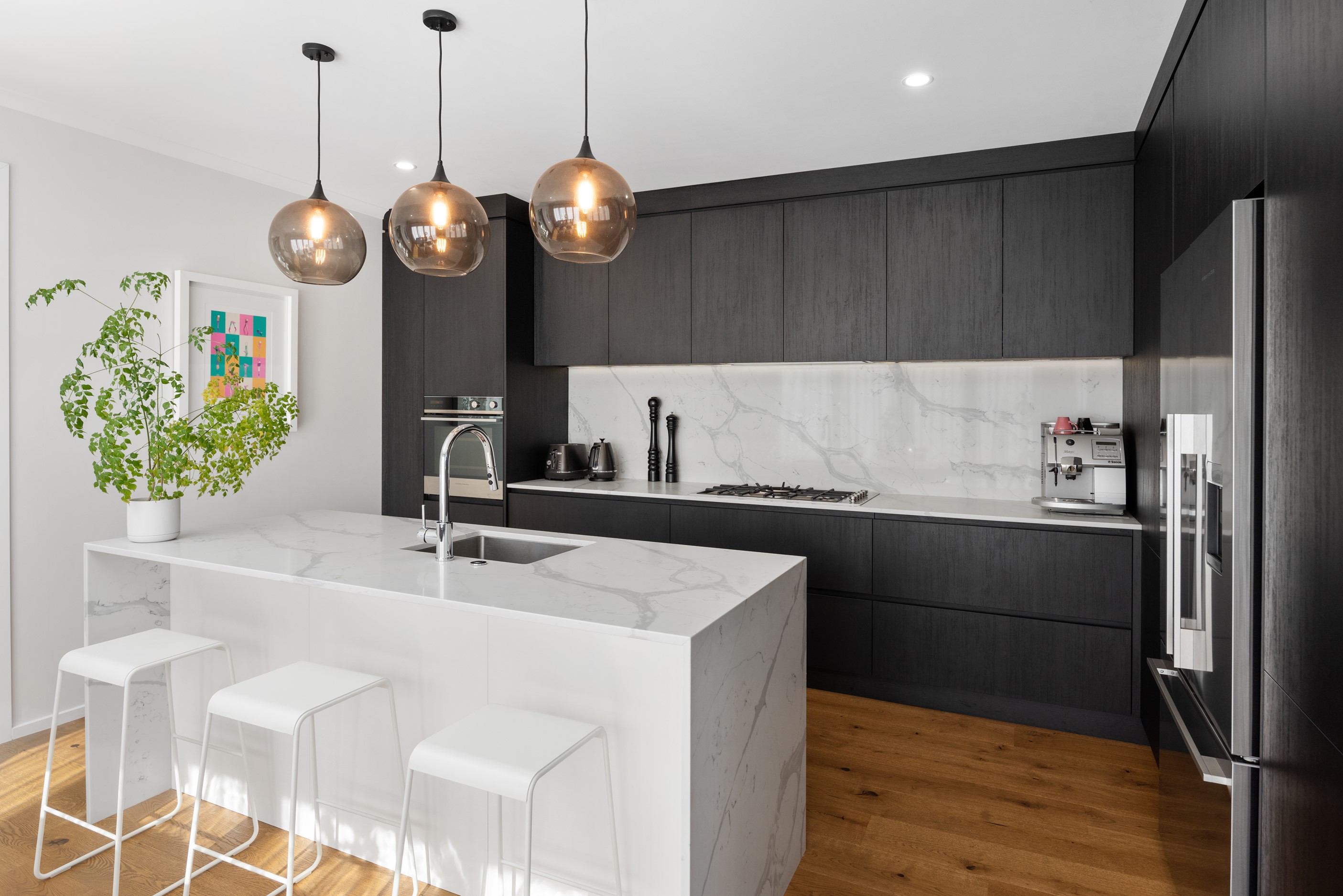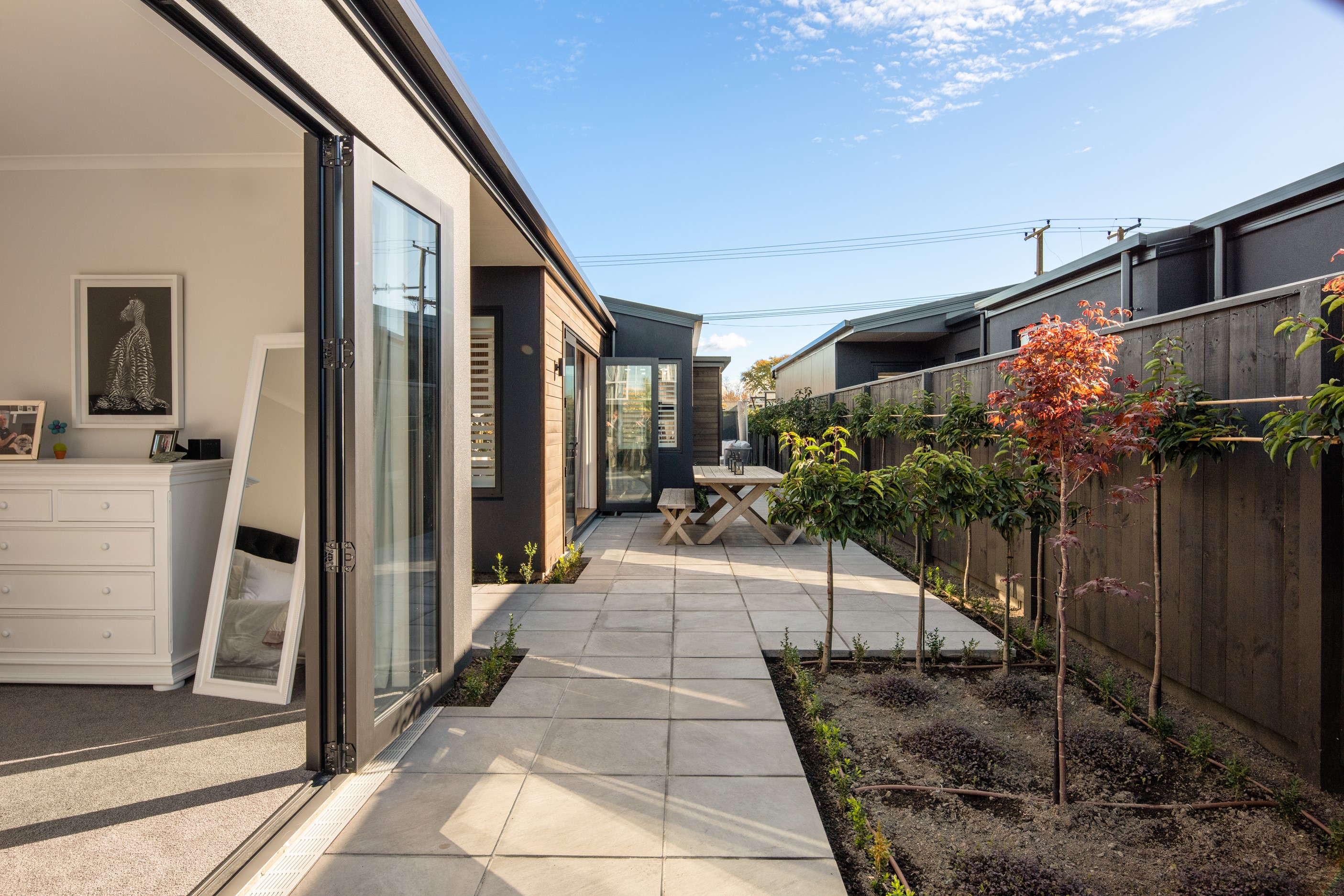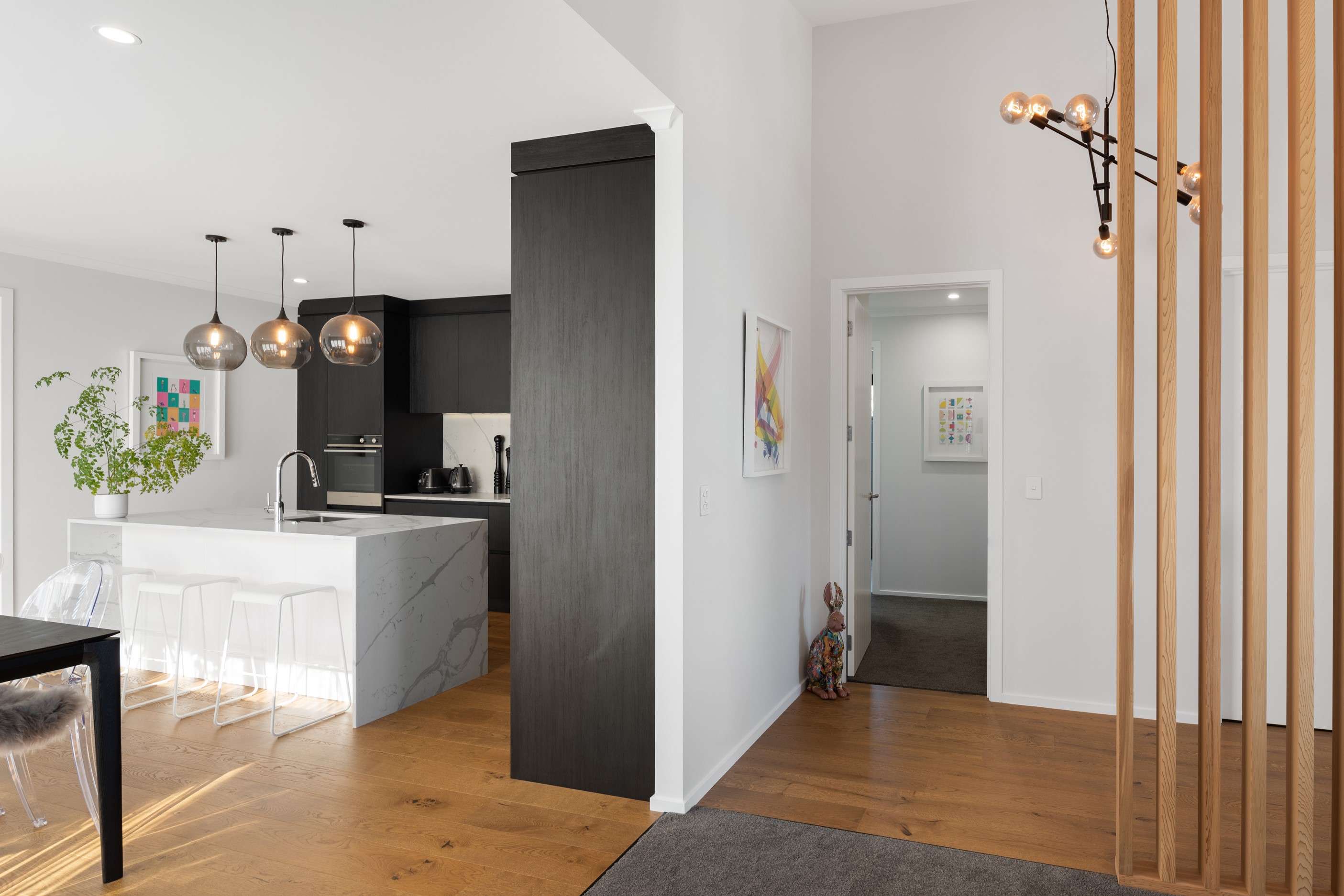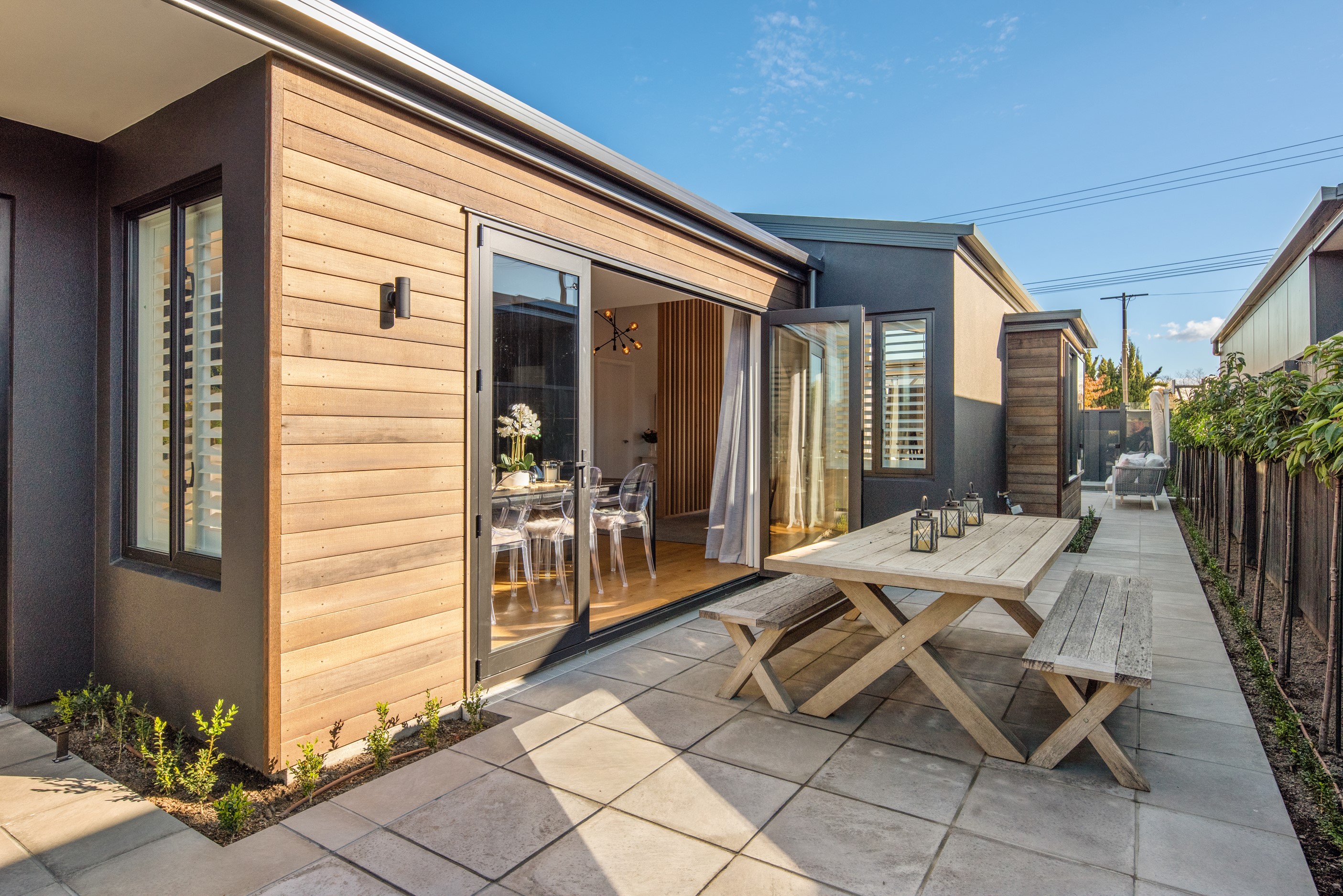 Sleek, ultra-modern and with a plunge pool, this three-bedroom house covers every base. From the outside, the 204sqm residence is all clean lines and handsome dark features punctuated with timber accents. Inside, the theme continues within light and airy spaces, thanks to raking ceilings, a pale wall palette and sliders that encourage the Marlborough sunshine inside. A decorative cedar screen separates the entry from the living space, which features a raking window. Stepping into the living area, the window seat offers just the spot to bask in the sun with a book in hand. The matching engineered stone benchtops and splashback set the scene in the kitchen, which has contrasting dark cabinetry, a gas cooktop, integrated dishwasher and engineered timber floors. A trio of pendant lights illuminates the island bench. Rooms are linked by a central hall, which is bathed in light thanks to two skylights. Two bathrooms, including an ensuite, have fully tiled showers. You’ll also find a snug/office, separate toilet, laundry and garage.