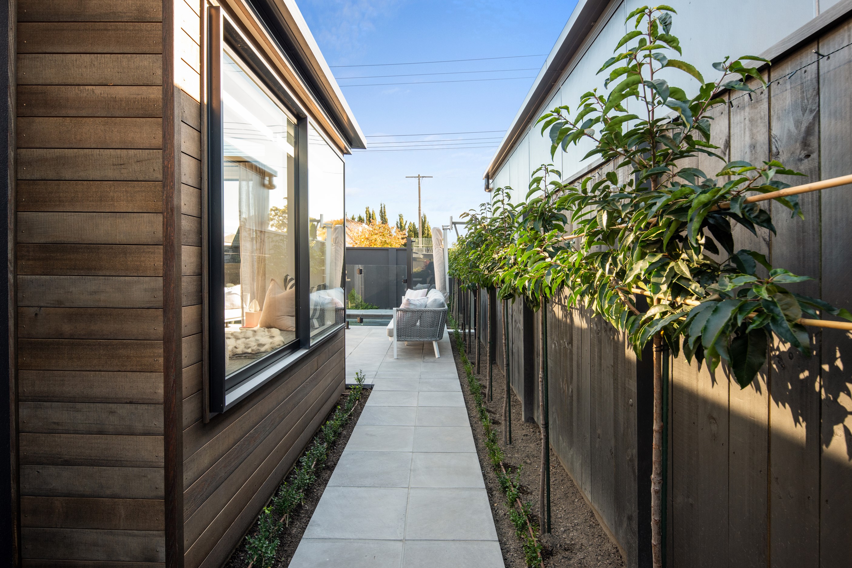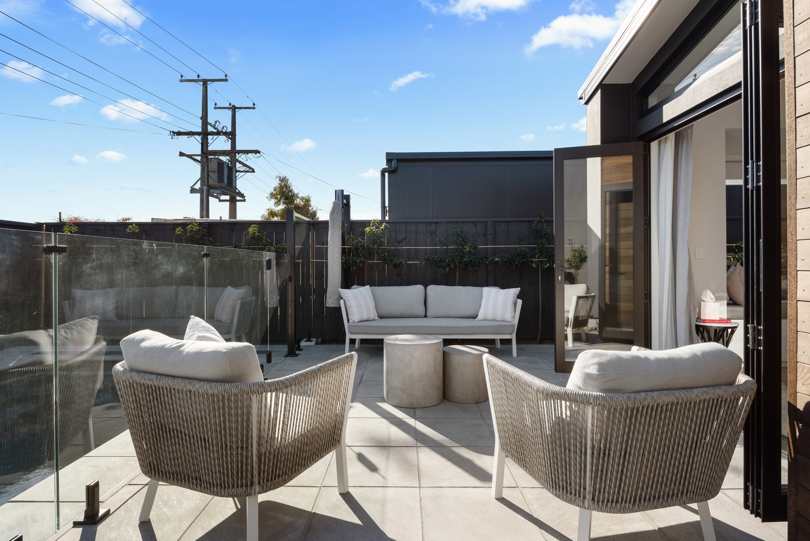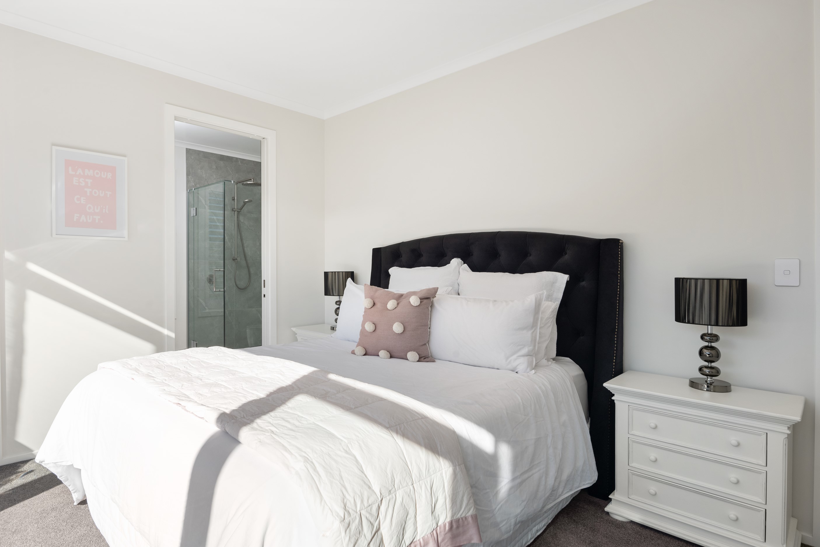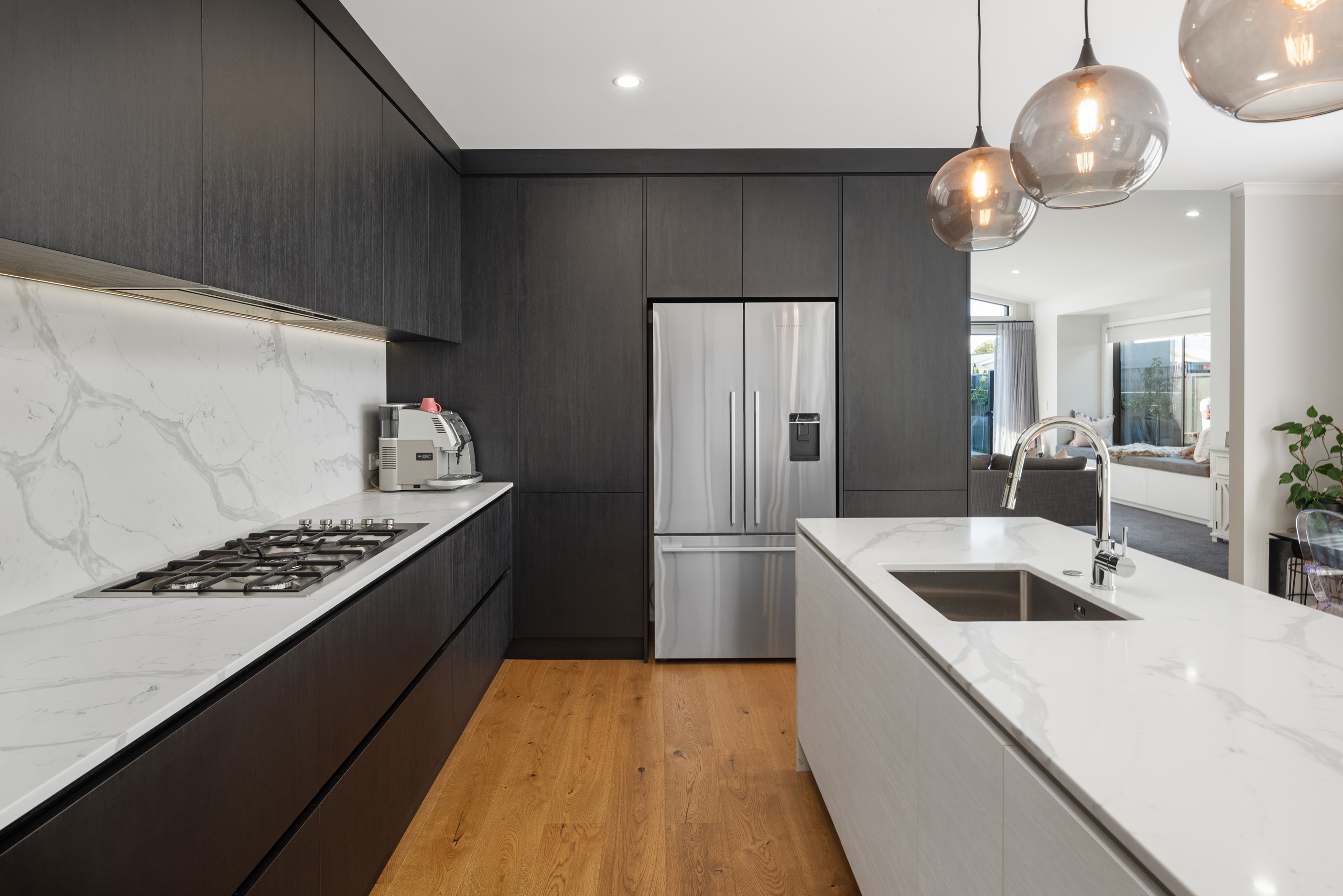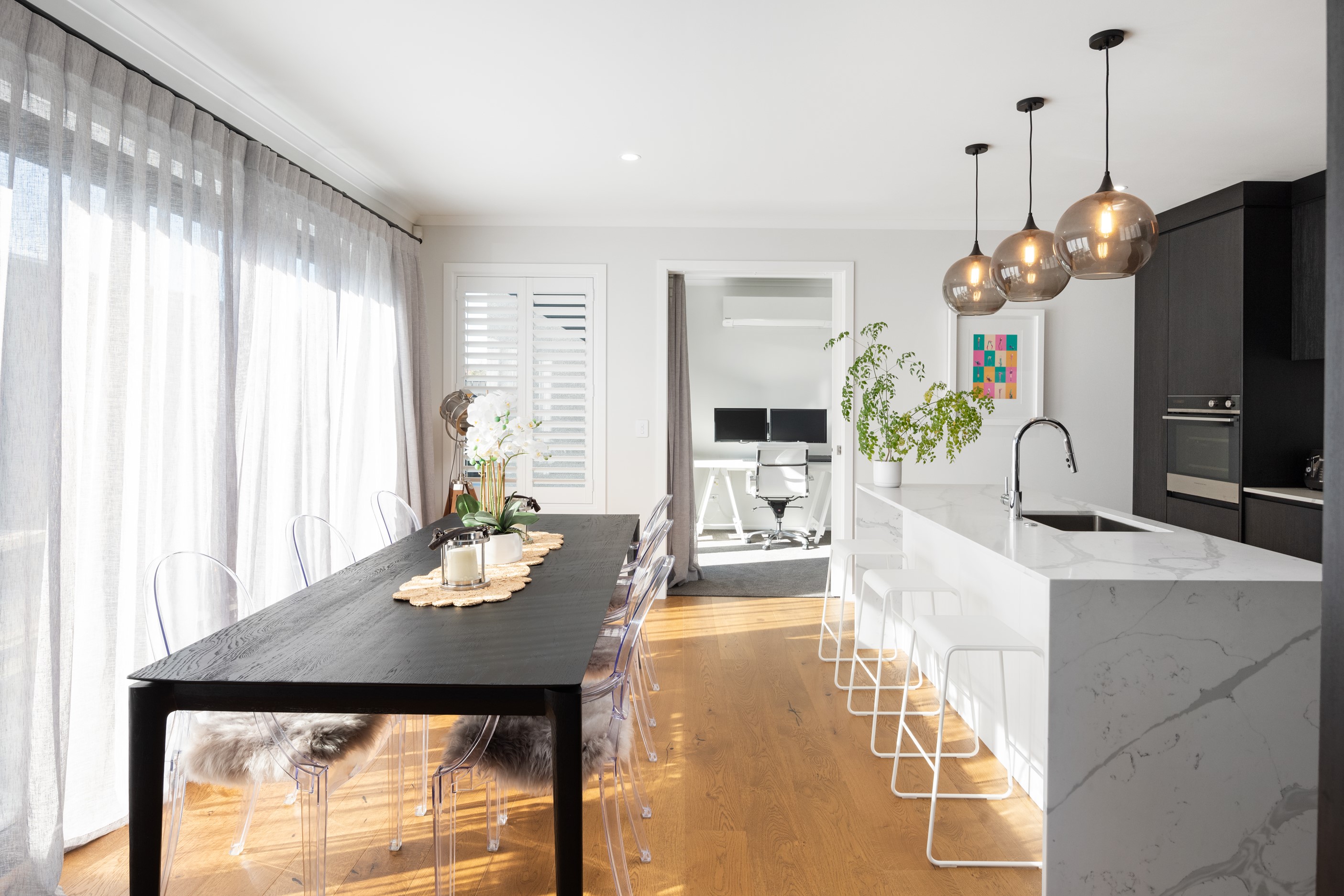 Sleek, ultra-modern and with a plunge pool, this three-bedroom house covers every base. From the outside, the 204sqm residence is all clean lines and handsome dark features punctuated with timber accents. Inside, the theme continues within light and airy spaces, thanks to raking ceilings, a pale wall palette and sliders that encourage the Marlborough sunshine inside. A decorative cedar screen separates the entry from the living space, which features a raking window. Stepping into the living area, the window seat offers just the spot to bask in the sun with a book in hand. The matching engineered stone benchtops and splashback set the scene in the kitchen, which has contrasting dark cabinetry, a gas cooktop, integrated dishwasher and engineered timber floors. A trio of pendant lights illuminates the island bench. Rooms are linked by a central hall, which is bathed in light thanks to two skylights. Two bathrooms, including an ensuite, have fully tiled showers. You’ll also find a snug/office, separate toilet, laundry and garage.