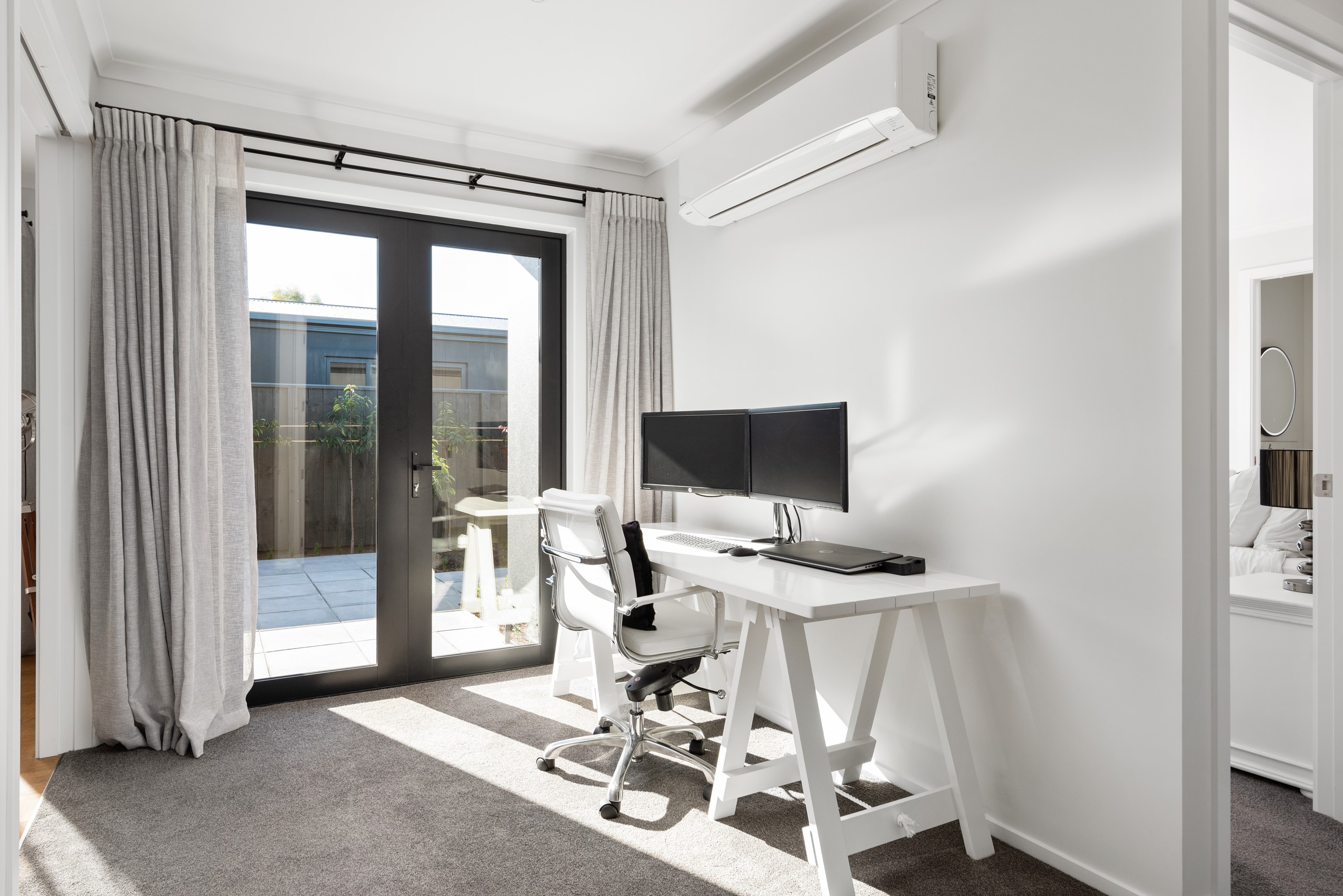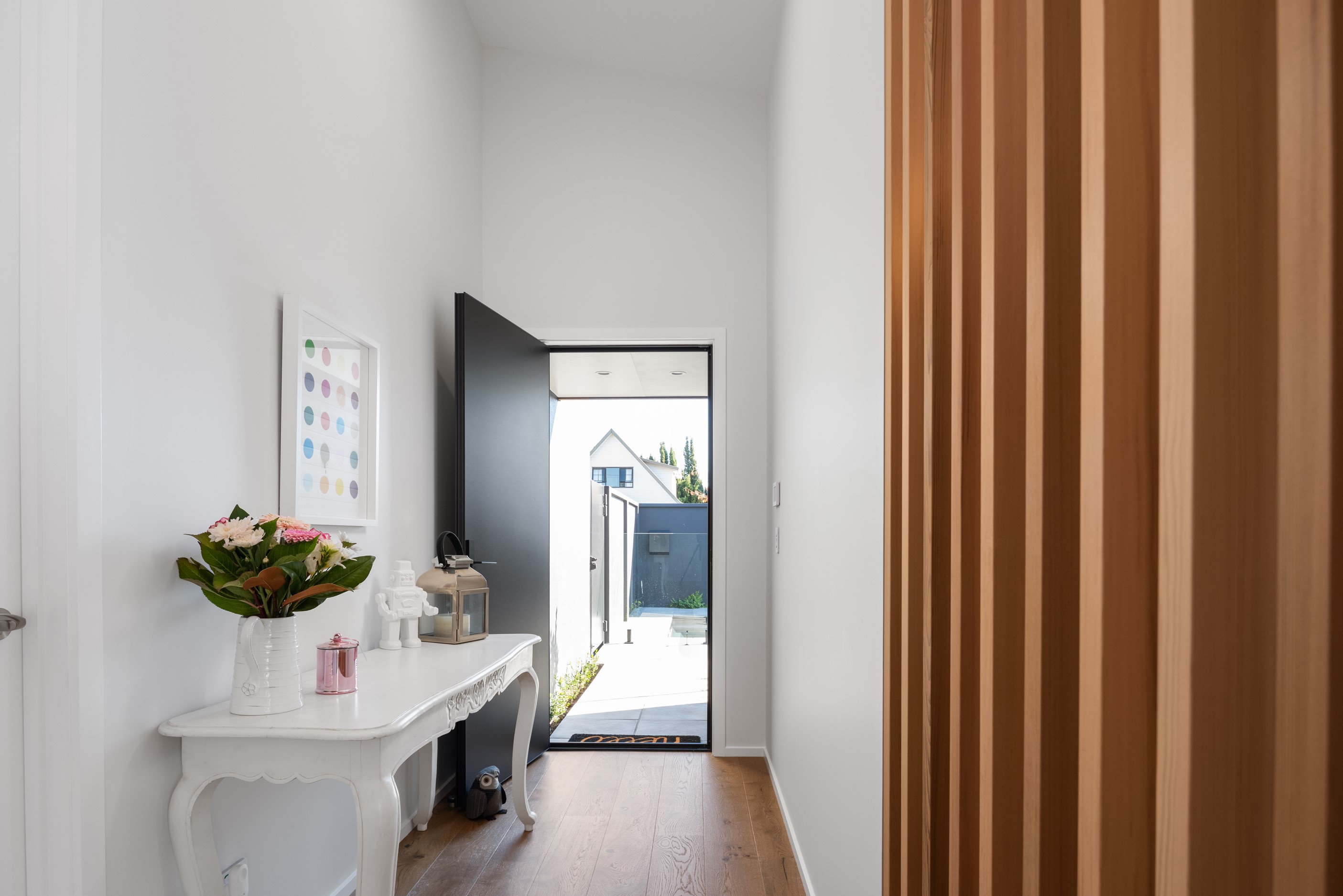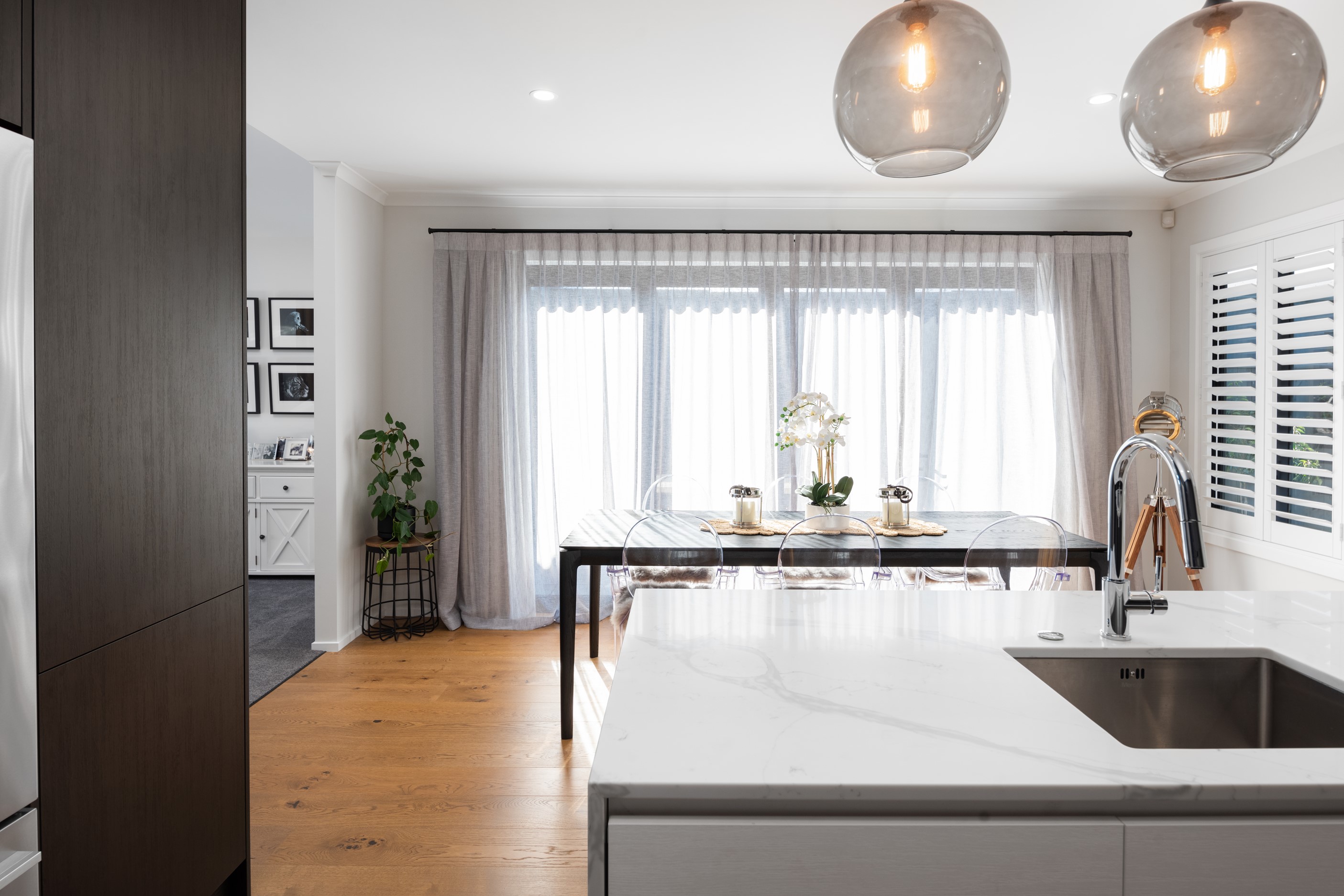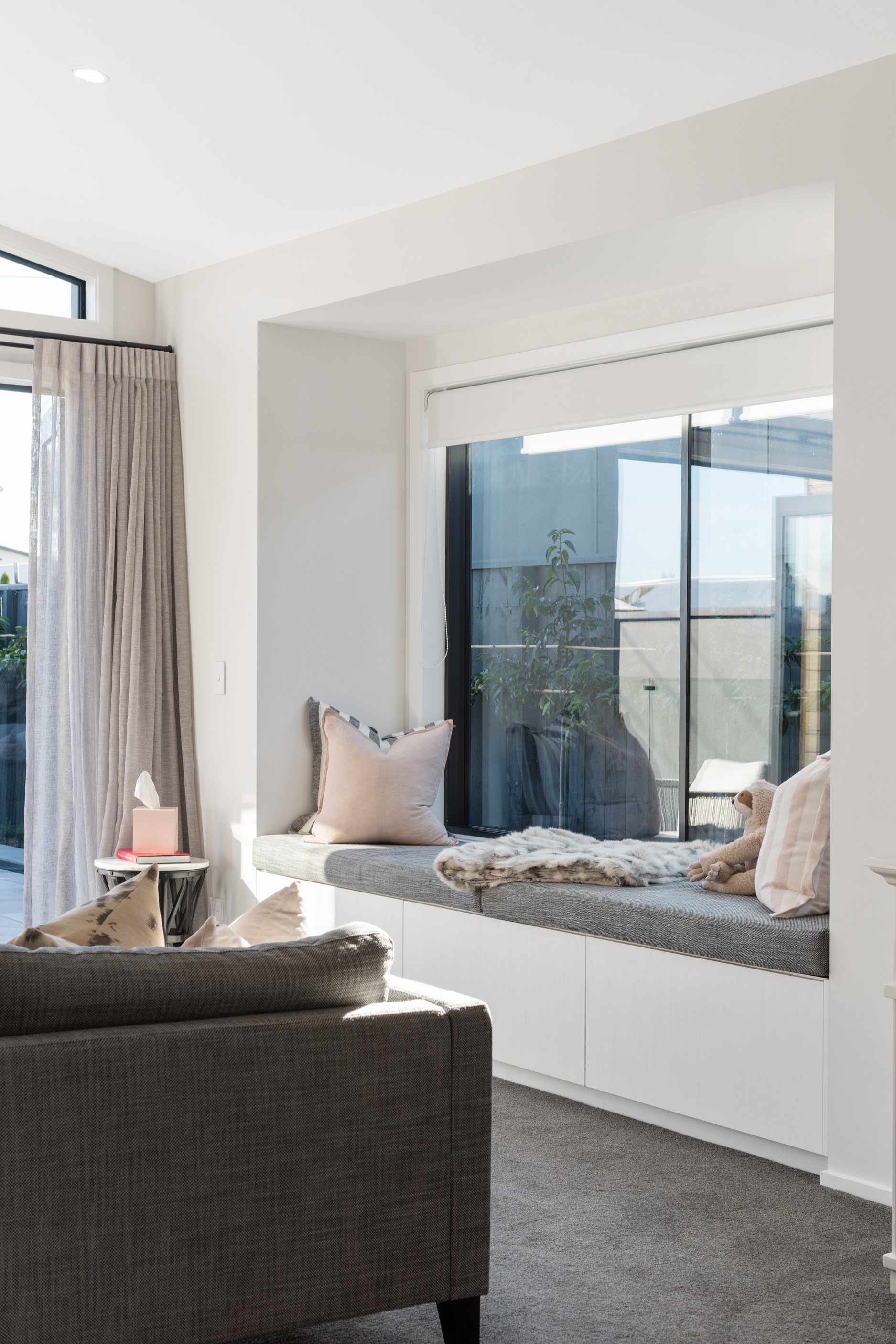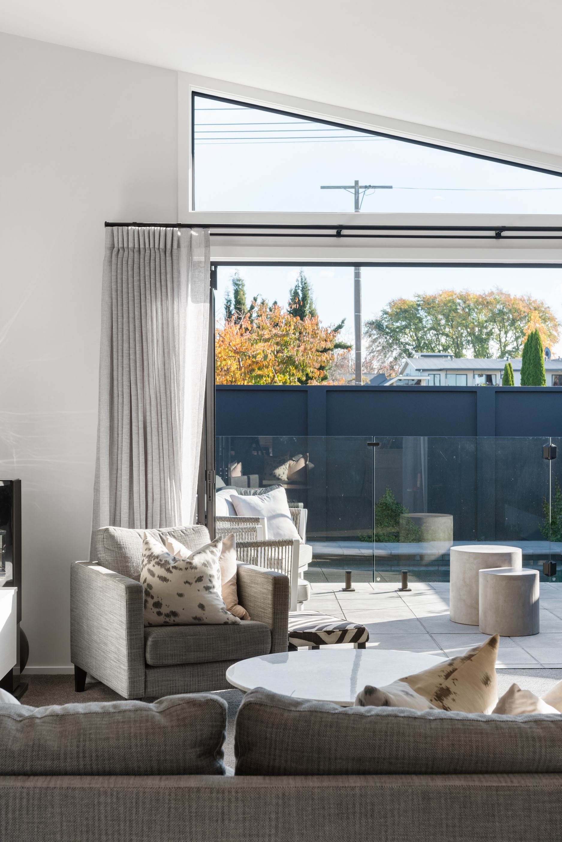Sleek, ultra-modern and with a plunge pool, this three-bedroom house covers every base. From the outside, the 204sqm residence is all clean lines and handsome dark features punctuated with timber accents. Inside, the theme continues within light and airy spaces, thanks to raking ceilings, a pale wall palette and sliders that encourage the Marlborough sunshine inside. A decorative cedar screen separates the entry from the living space, which features a raking window. Stepping into the living area, the window seat offers just the spot to bask in the sun with a book in hand. The matching engineered stone benchtops and splashback set the scene in the kitchen, which has contrasting dark cabinetry, a gas cooktop, integrated dishwasher and engineered timber floors. A trio of pendant lights illuminates the island bench. Rooms are linked by a central hall, which is bathed in light thanks to two skylights. Two bathrooms, including an ensuite, have fully tiled showers. You’ll also find a snug/office, separate toilet, laundry and garage.