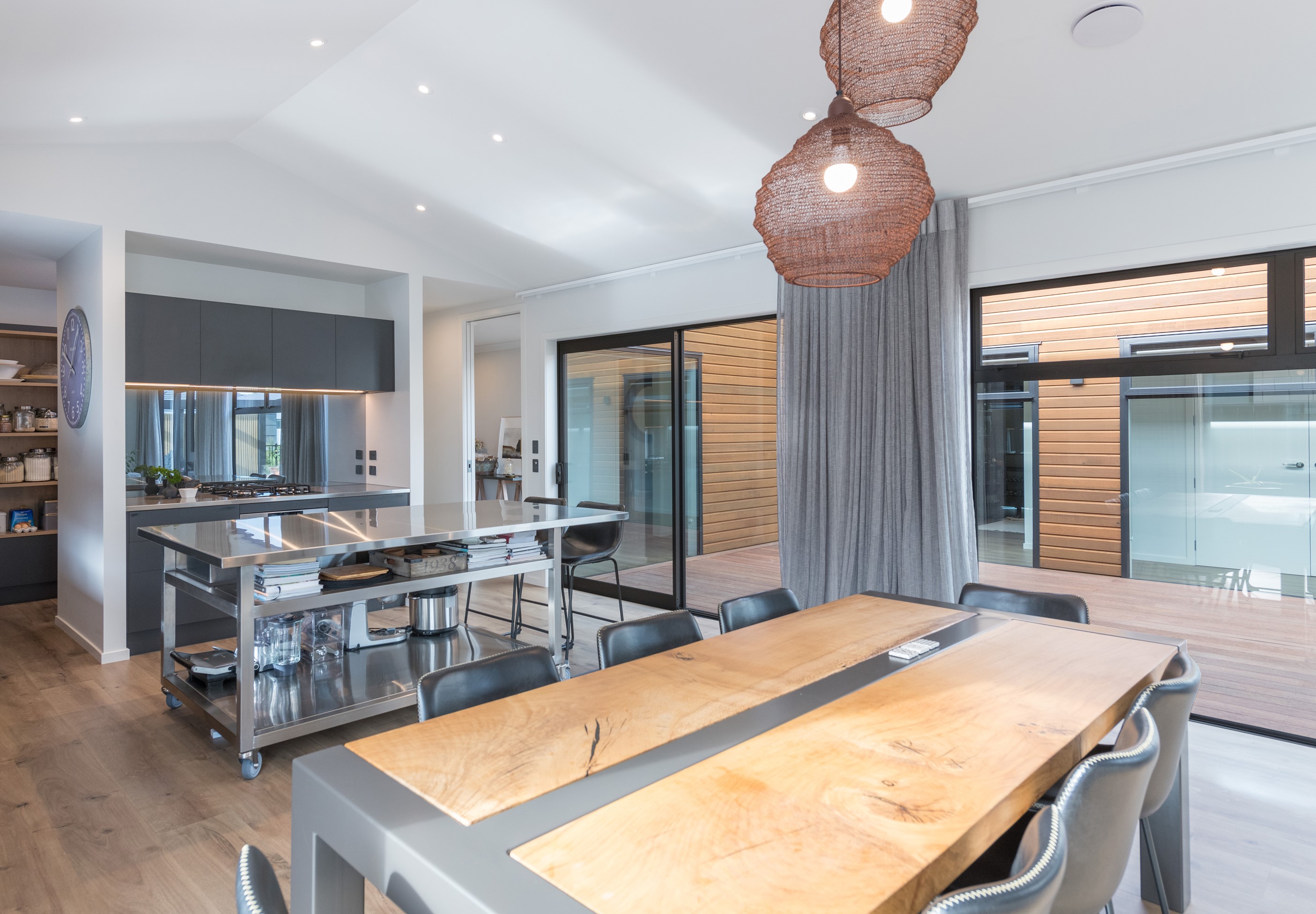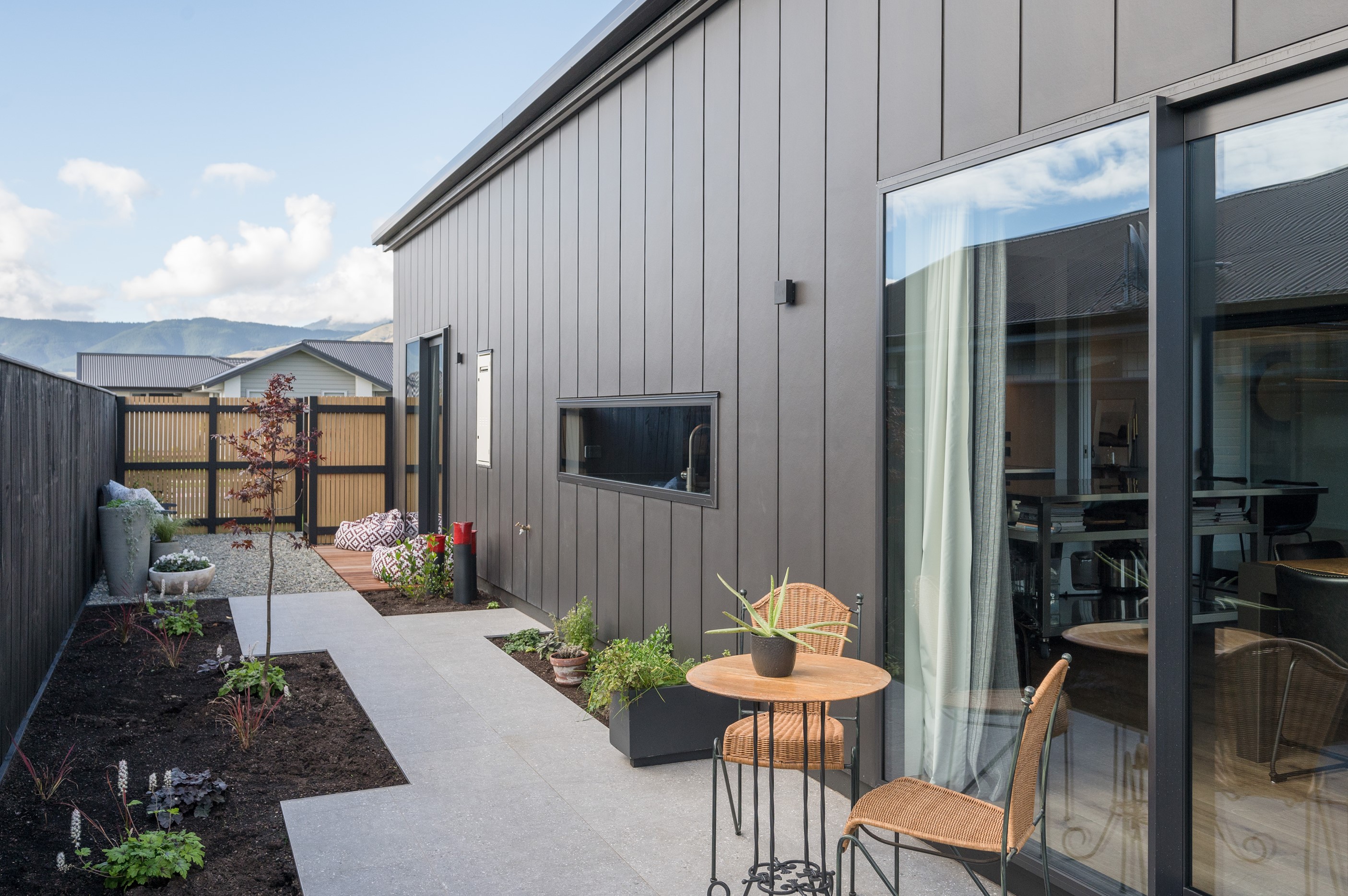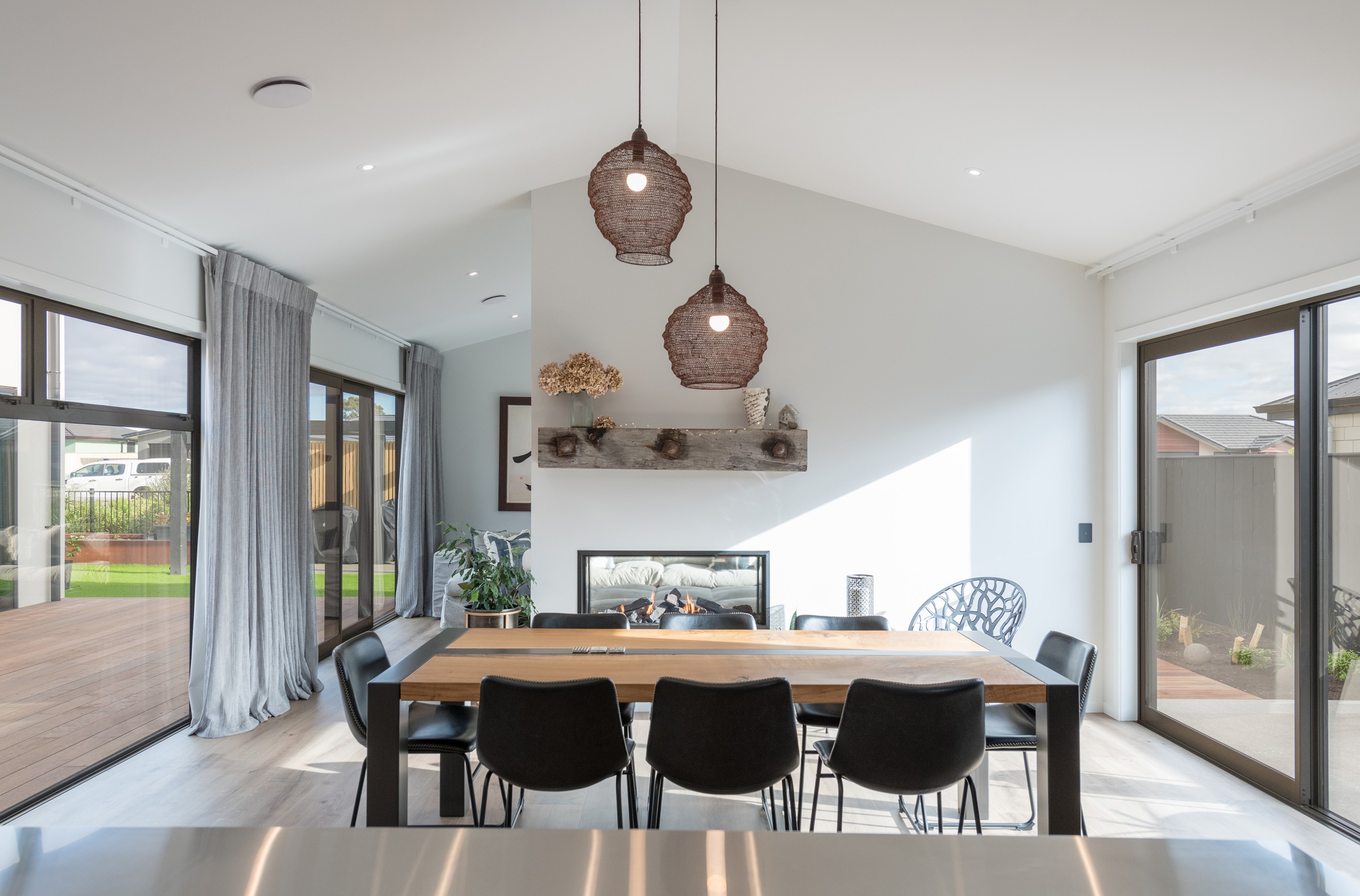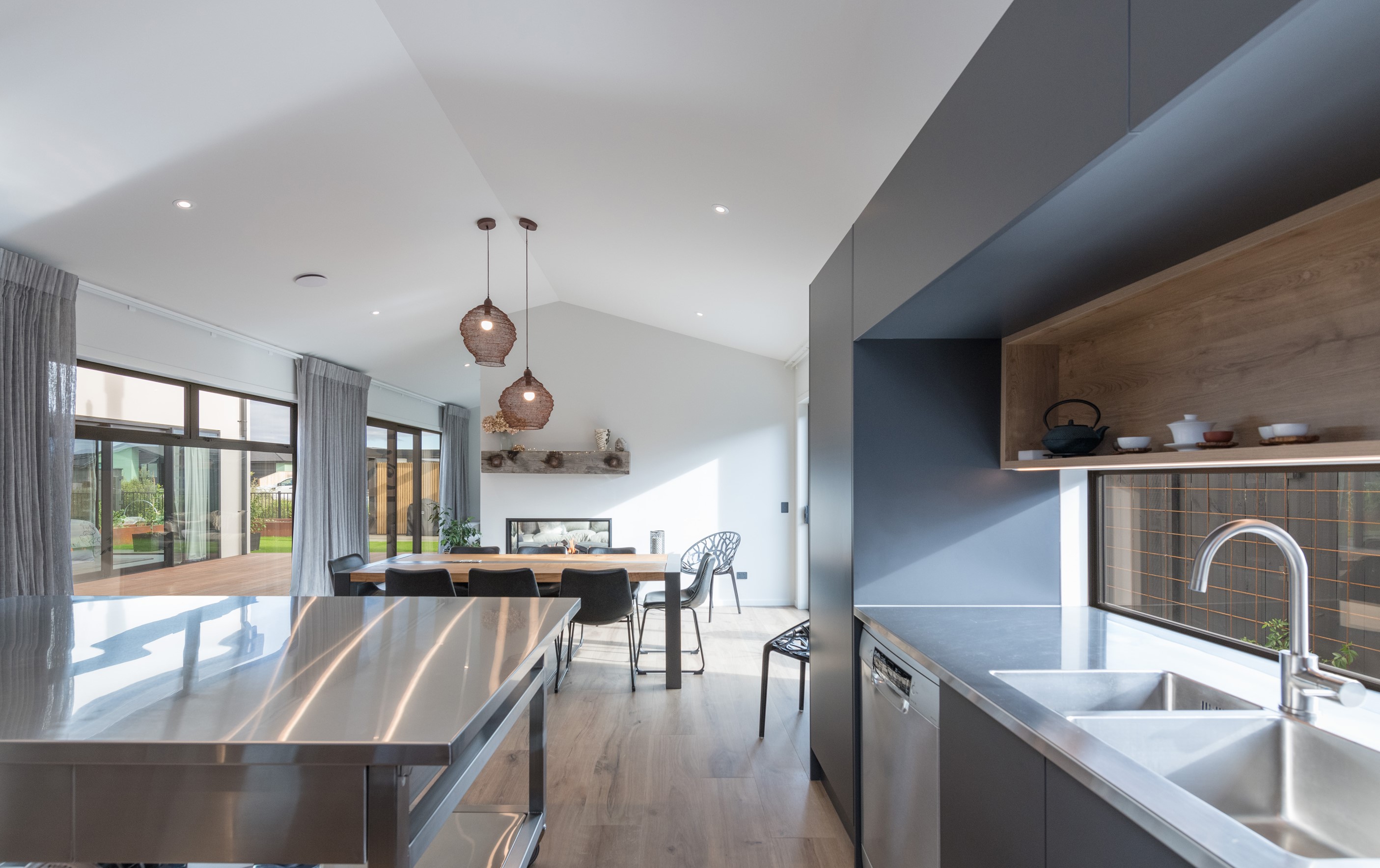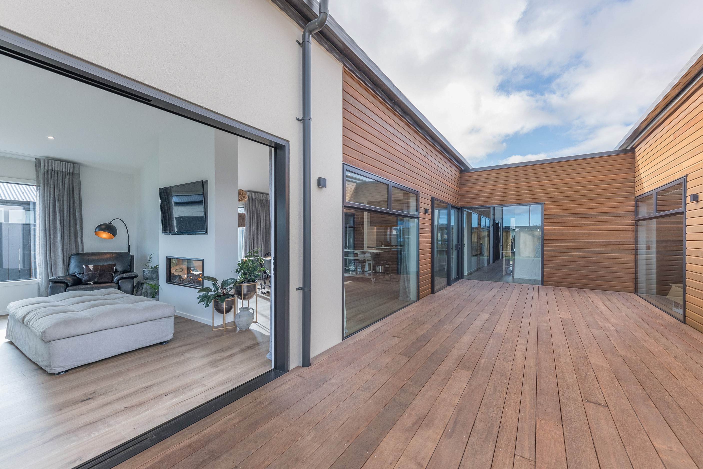 This stunning 221sqm home was architecturally designed for its discerning owners. Moving from a rural property, the couple wanted their home to deliver quality craftsmanship, privacy and multi-purpose spaces. Each has been achieved with style and skill. The exterior of the handsome home is the first hint of quality evident throughout. A sophisticated partnering of cedar and attractive black weatherboards sets the scene. As you step inside, the light-filled and luxurious living spaces are inviting. A double-sided gas fire contributes to the comfort factor. The main bedroom is equally impressive with an extra-large ensuite and walk-in wardrobe. The two other bedrooms are serviced by a bathroom that can also serve as an ensuite. One bedroom is set up for the owners to use as a hobby room and workspace, with shelving and a built-in desk. The main bedroom, kitchen, dining and living spaces all open out to a central decked area, which allows light to flood in and creates fantastic outdoor flow.