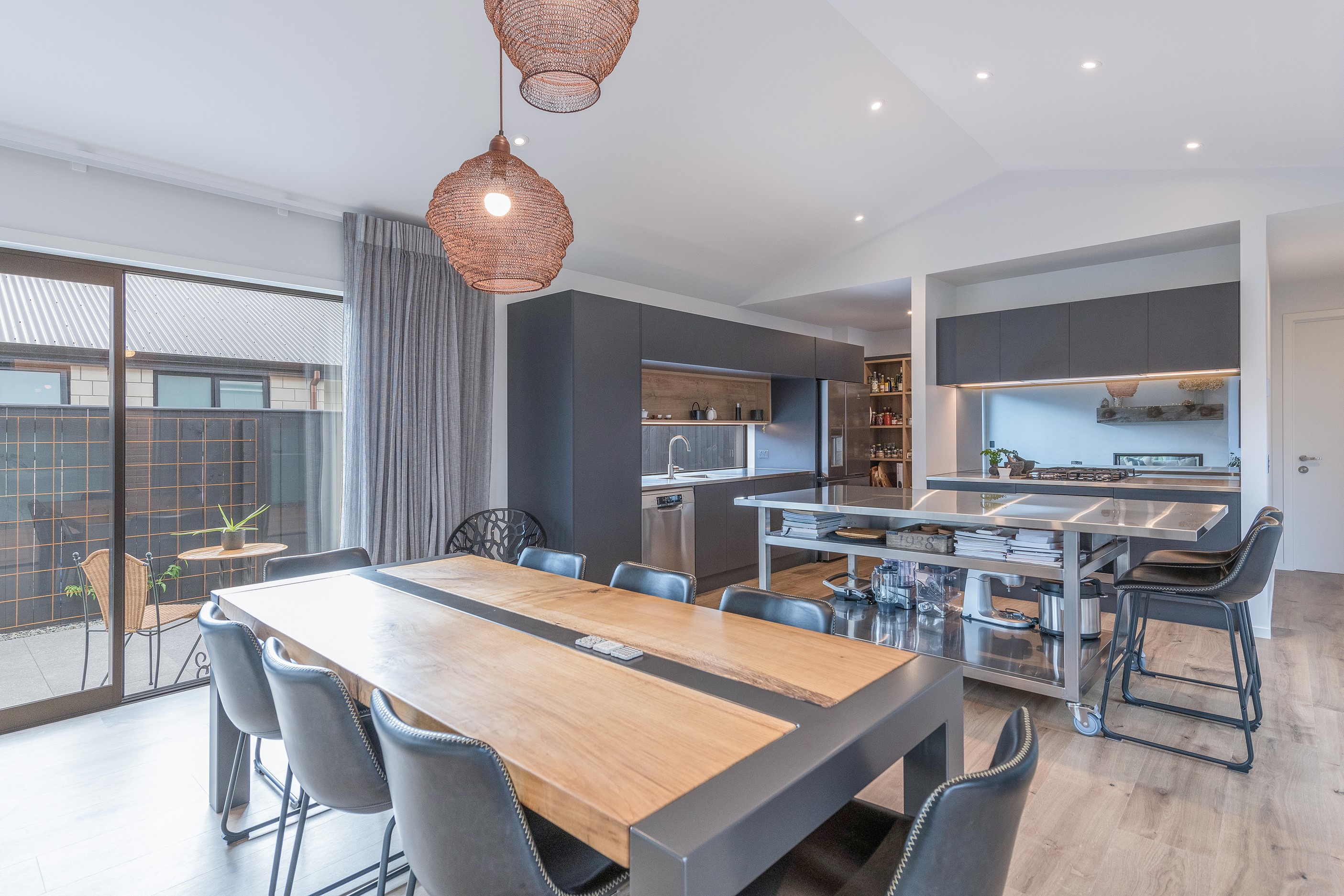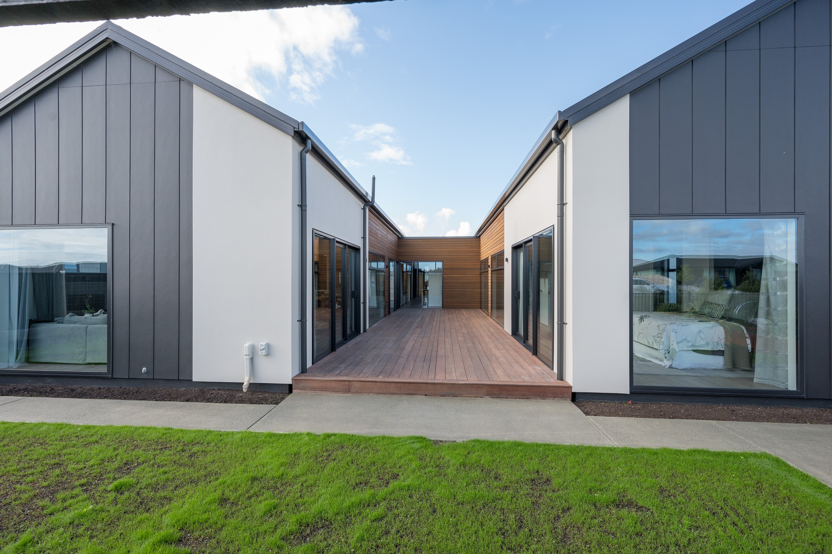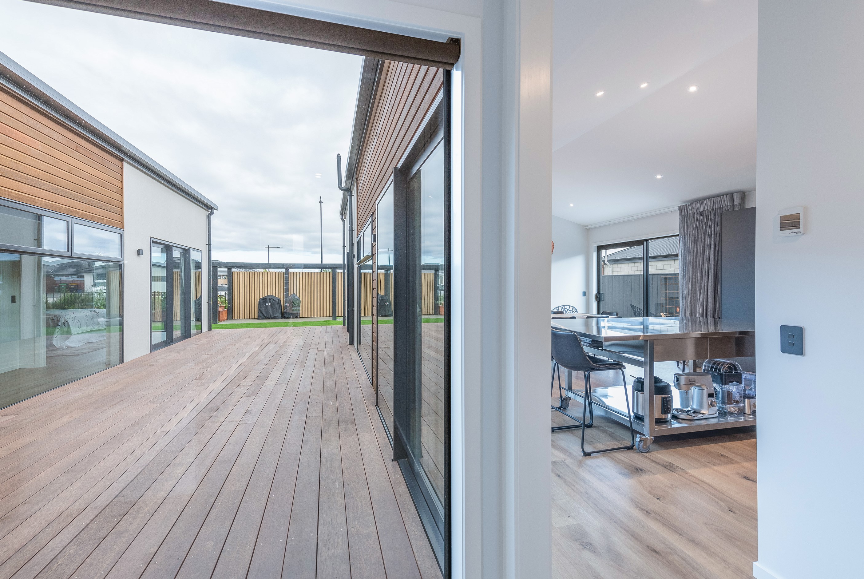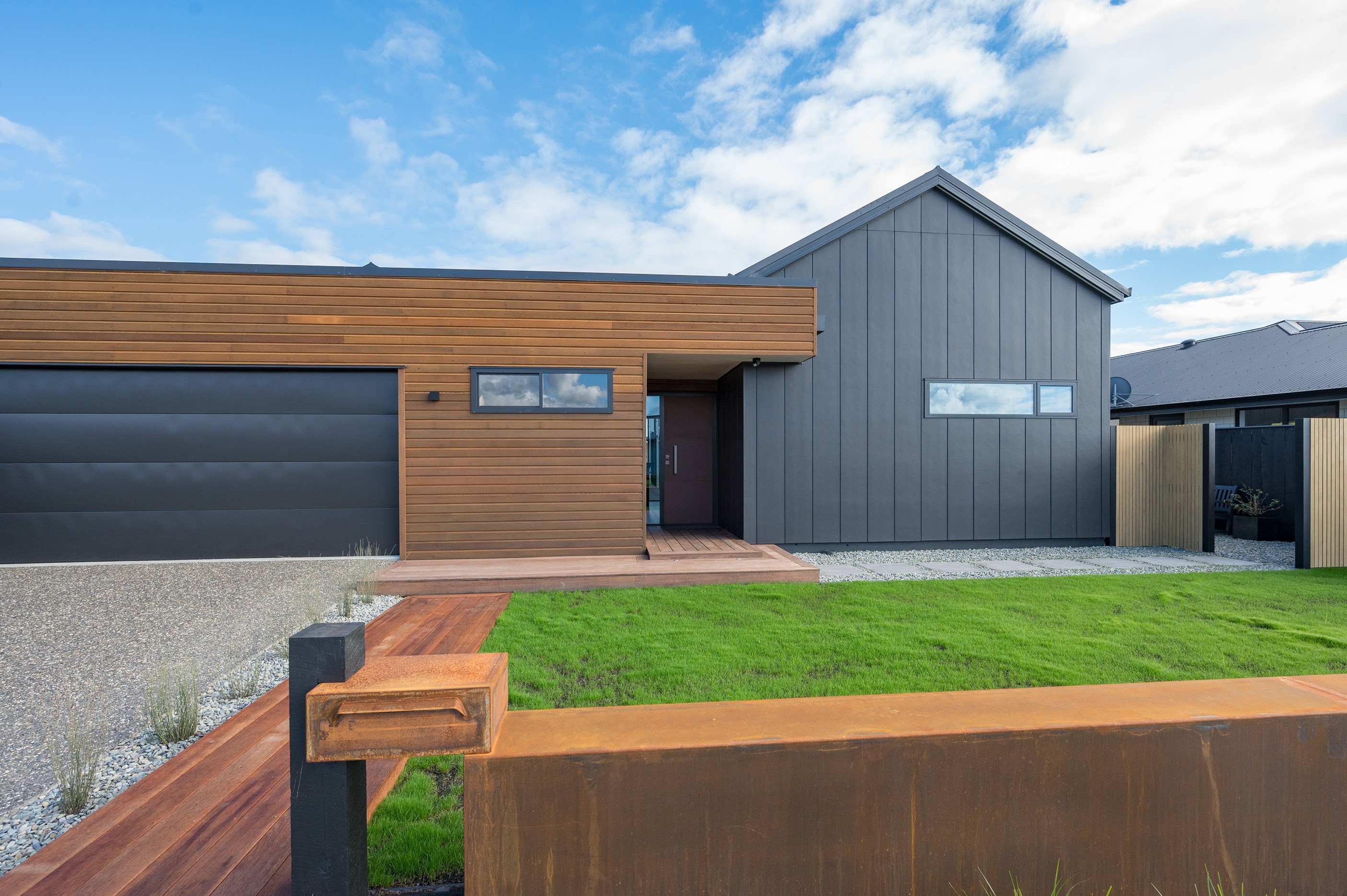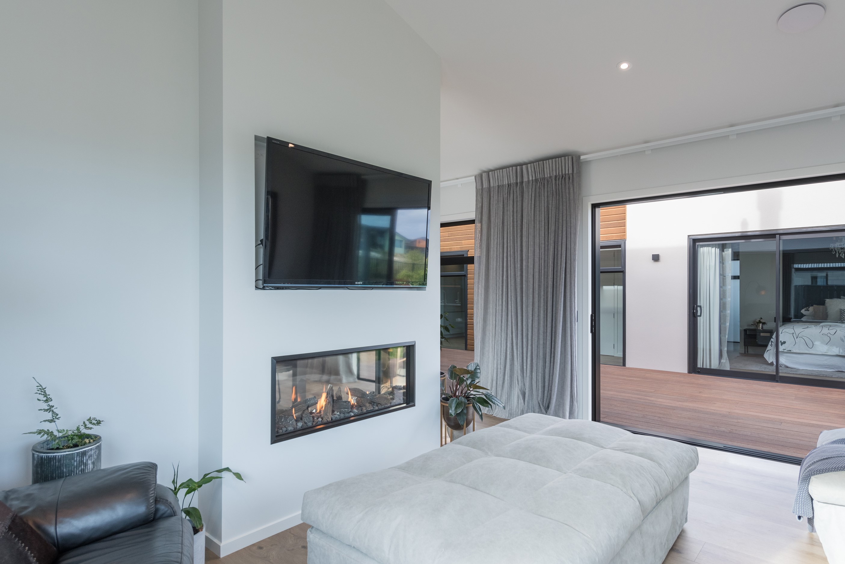This stunning 221sqm home was architecturally designed for its discerning owners. Moving from a rural property, the couple wanted their home to deliver quality craftsmanship, privacy and multi-purpose spaces. Each has been achieved with style and skill. The exterior of the handsome home is the first hint of quality evident throughout. A sophisticated partnering of cedar and attractive black weatherboards sets the scene. As you step inside, the light-filled and luxurious living spaces are inviting. A double-sided gas fire contributes to the comfort factor. The main bedroom is equally impressive with an extra-large ensuite and walk-in wardrobe. The two other bedrooms are serviced by a bathroom that can also serve as an ensuite. One bedroom is set up for the owners to use as a hobby room and workspace, with shelving and a built-in desk. The main bedroom, kitchen, dining and living spaces all open out to a central decked area, which allows light to flood in and creates fantastic outdoor flow.