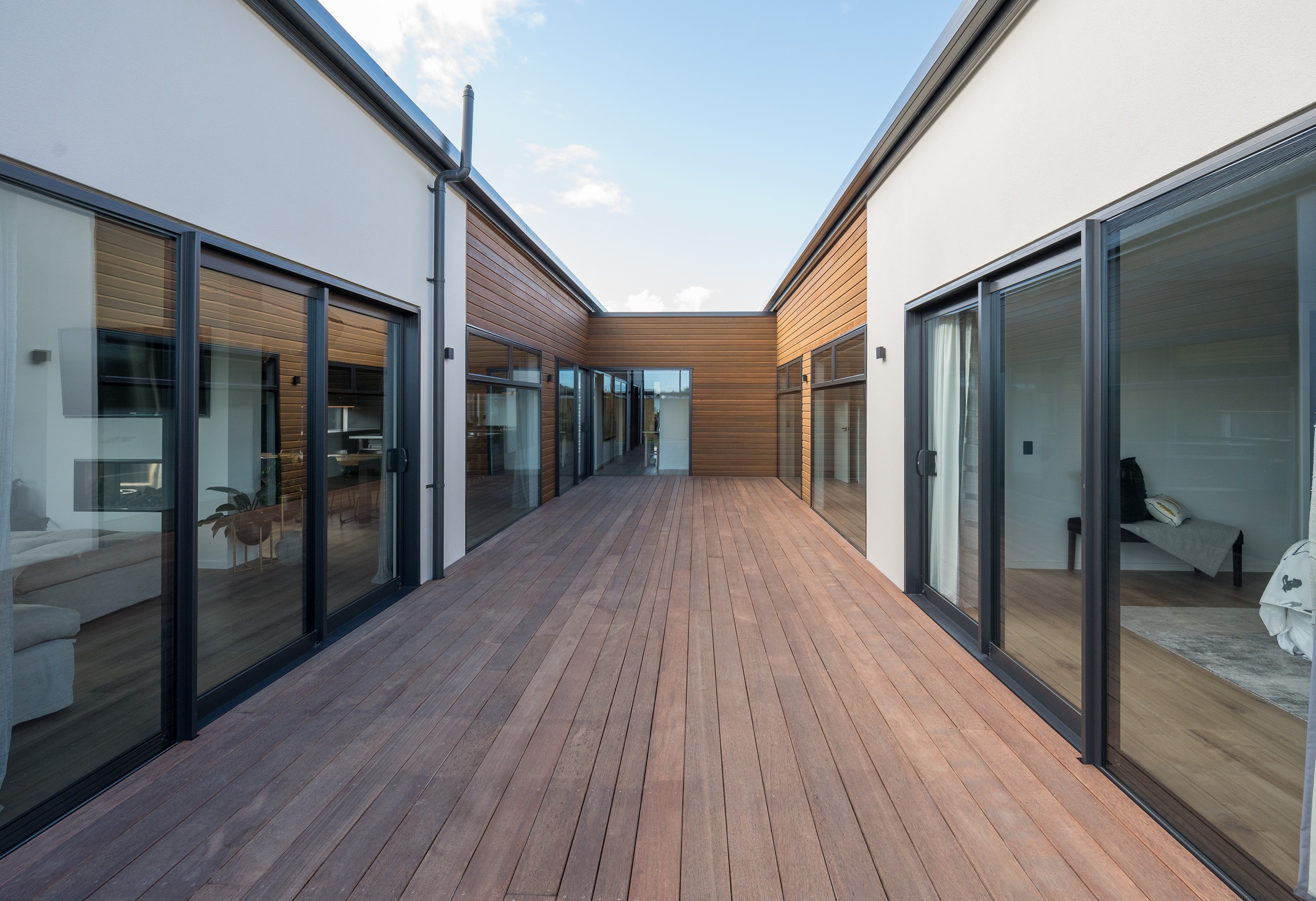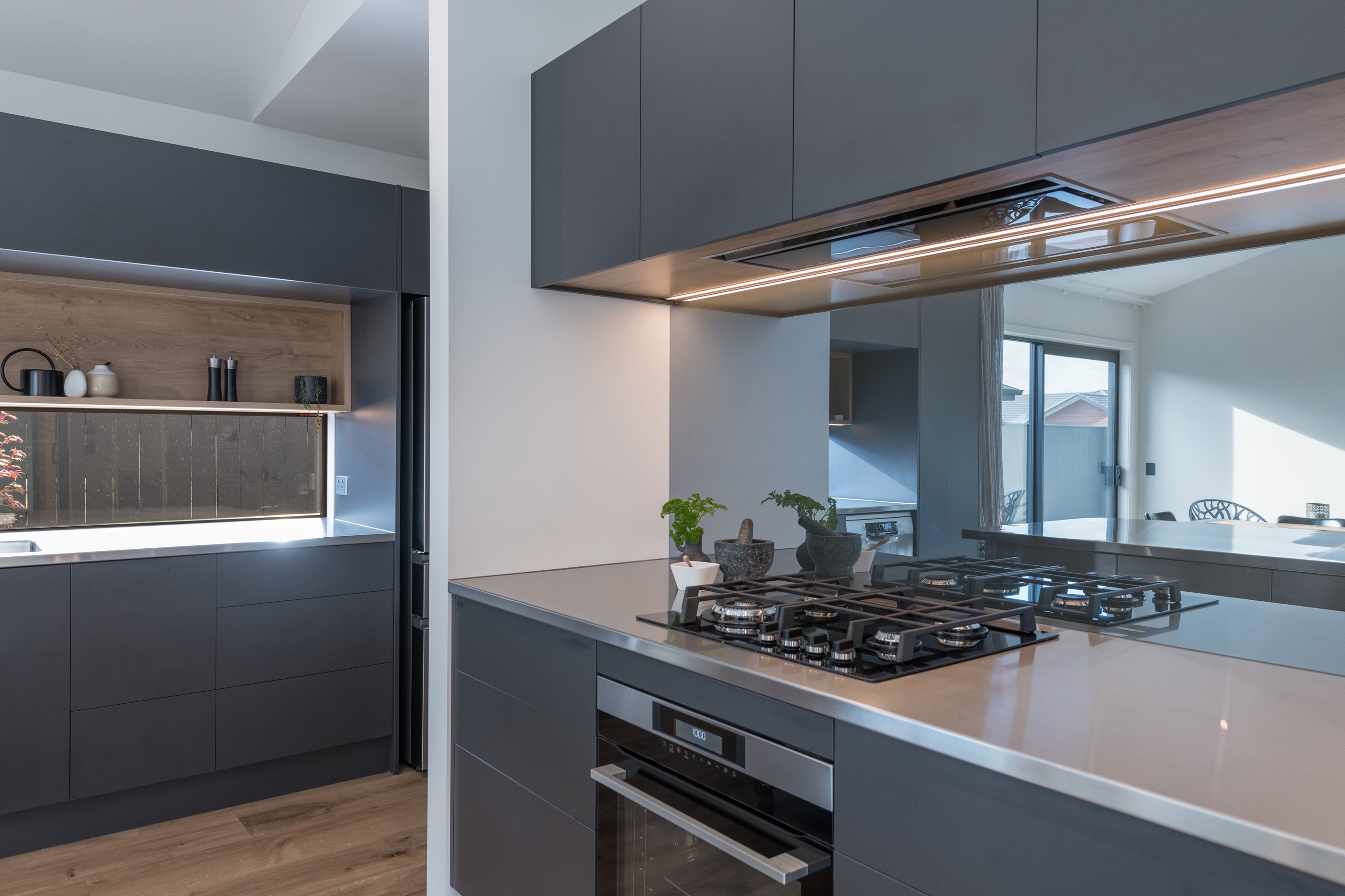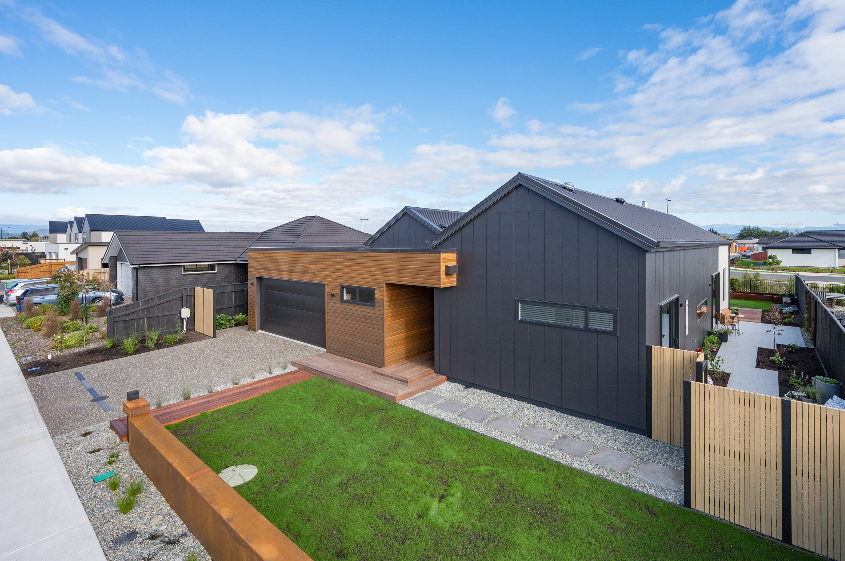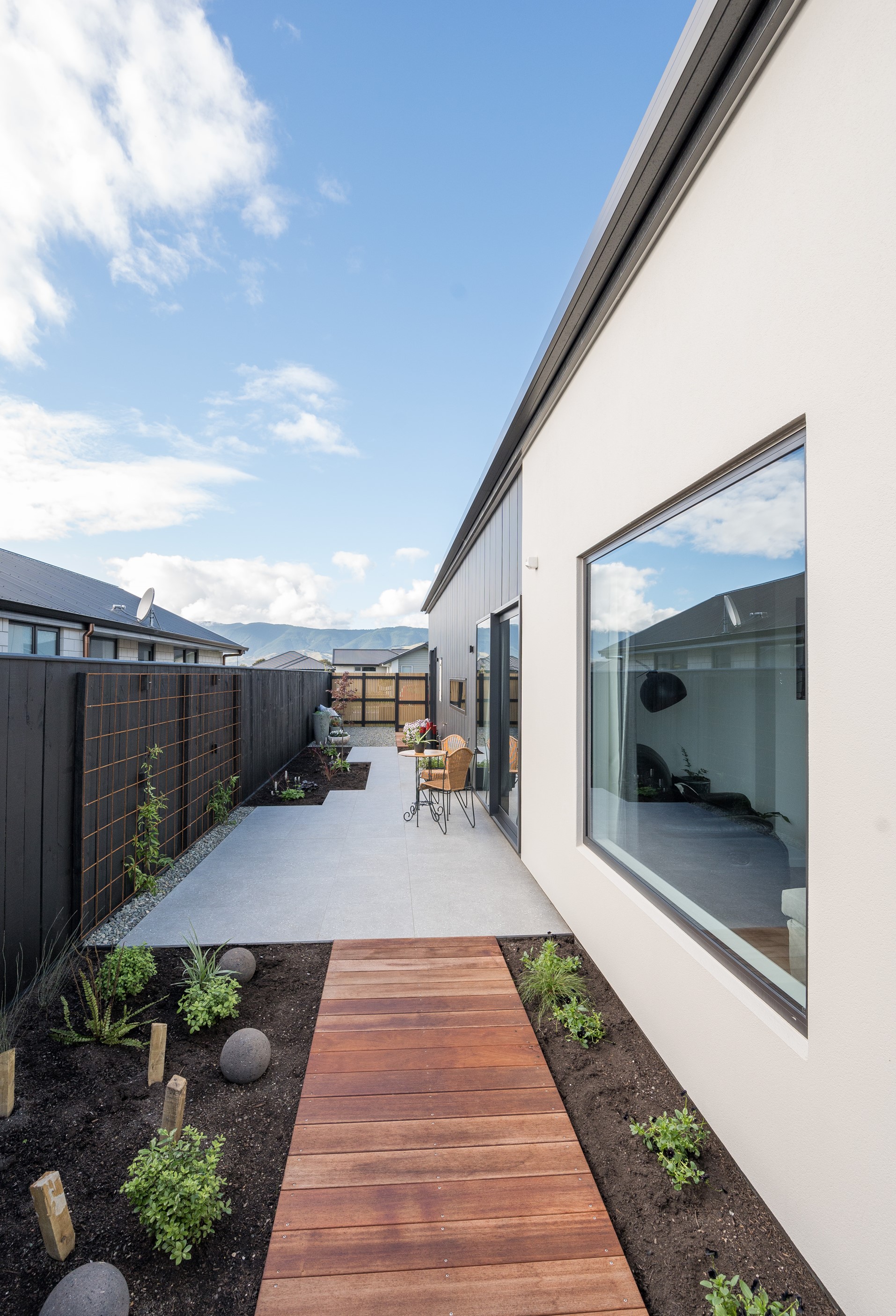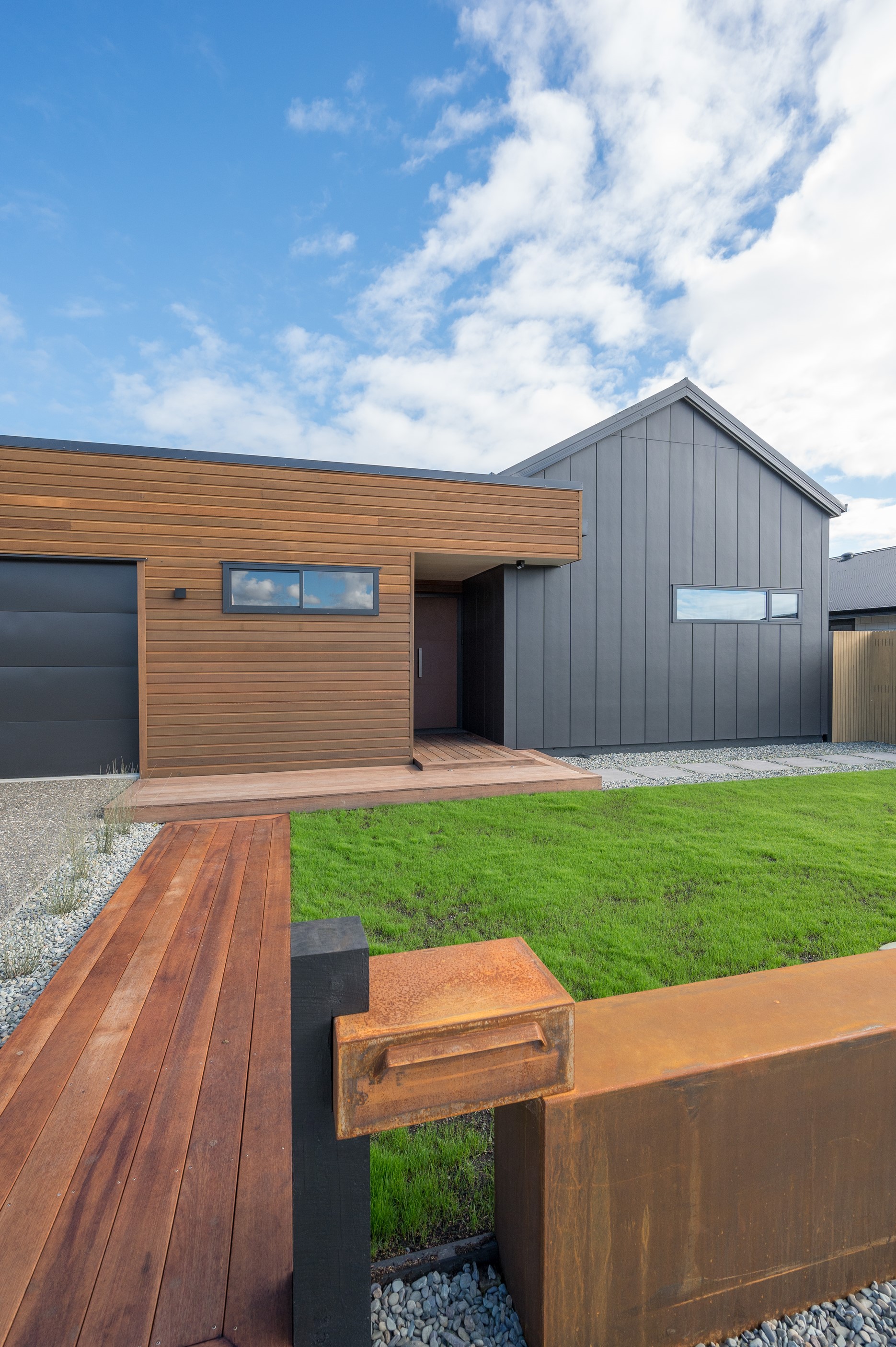 This stunning 221sqm home was architecturally designed for its discerning owners. Moving from a rural property, the couple wanted their home to deliver quality craftsmanship, privacy and multi-purpose spaces. Each has been achieved with style and skill. The exterior of the handsome home is the first hint of quality evident throughout. A sophisticated partnering of cedar and attractive black weatherboards sets the scene. As you step inside, the light-filled and luxurious living spaces are inviting. A double-sided gas fire contributes to the comfort factor. The main bedroom is equally impressive with an extra-large ensuite and walk-in wardrobe. The two other bedrooms are serviced by a bathroom that can also serve as an ensuite. One bedroom is set up for the owners to use as a hobby room and workspace, with shelving and a built-in desk. The main bedroom, kitchen, dining and living spaces all open out to a central decked area, which allows light to flood in and creates fantastic outdoor flow.