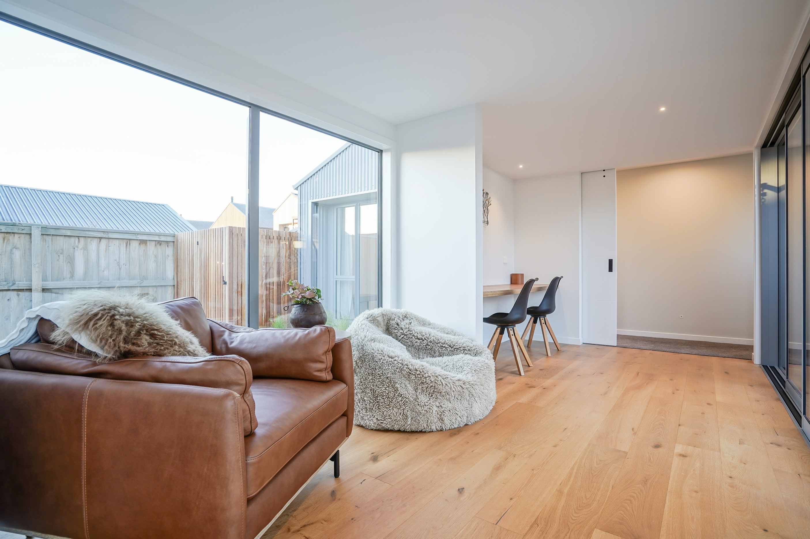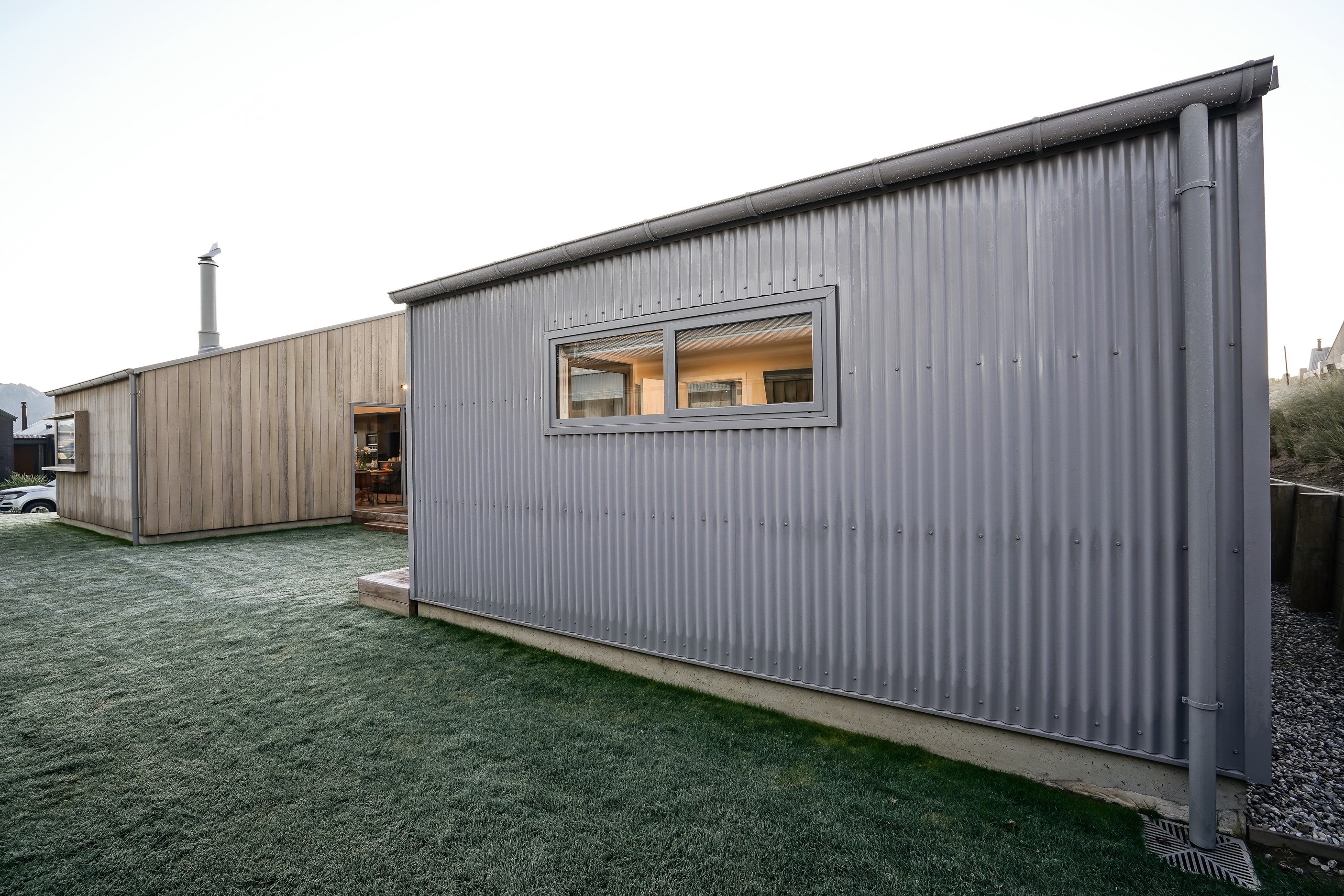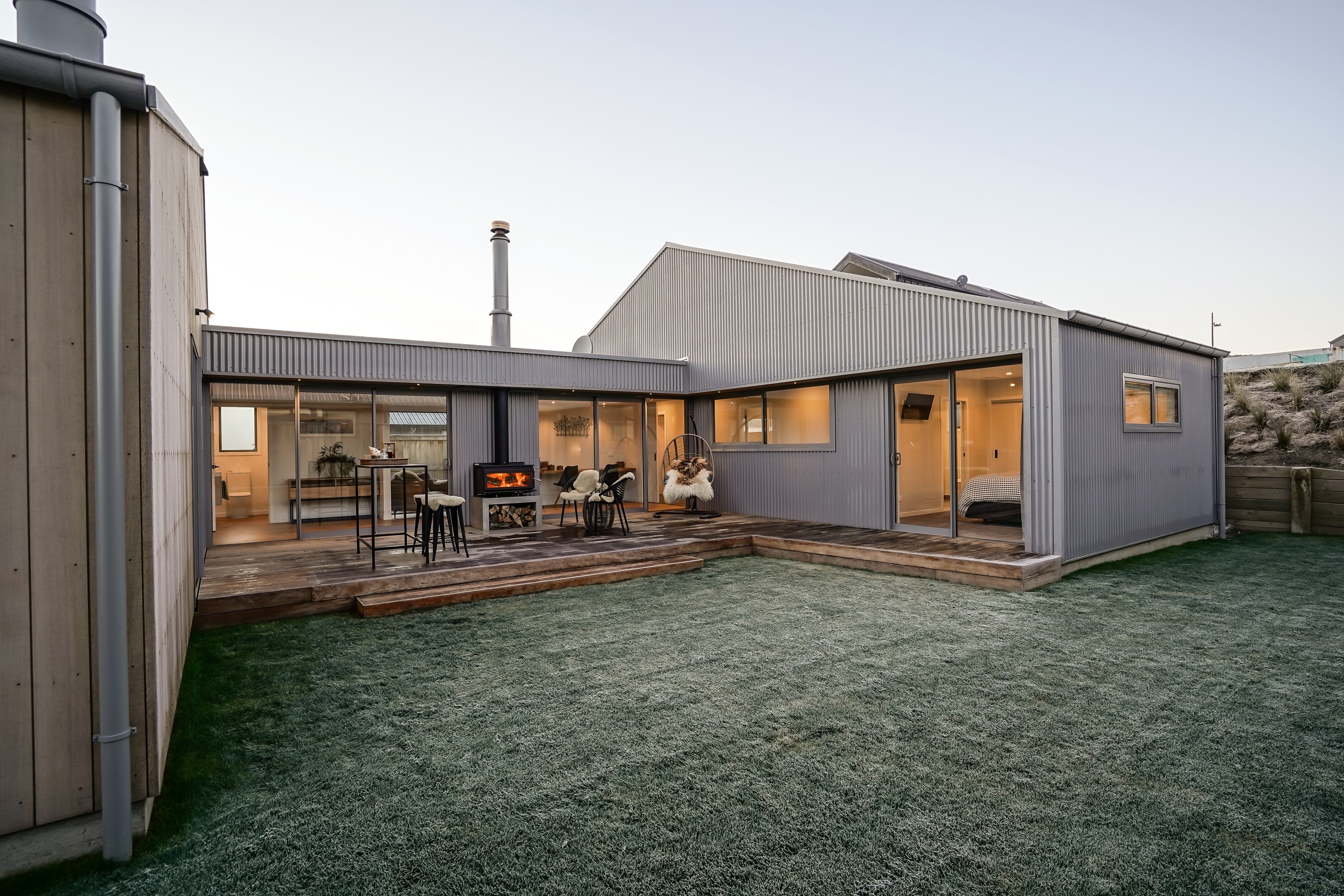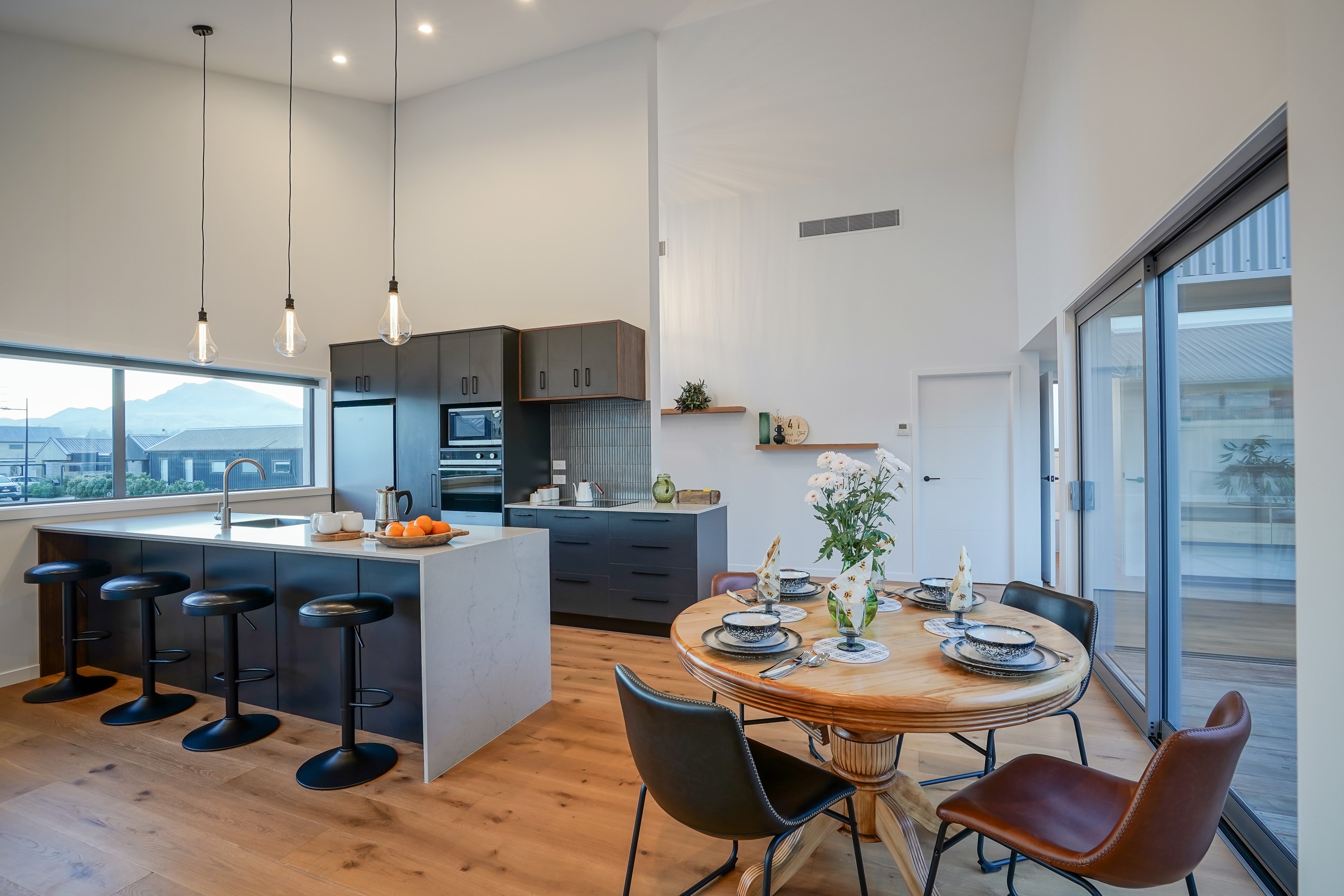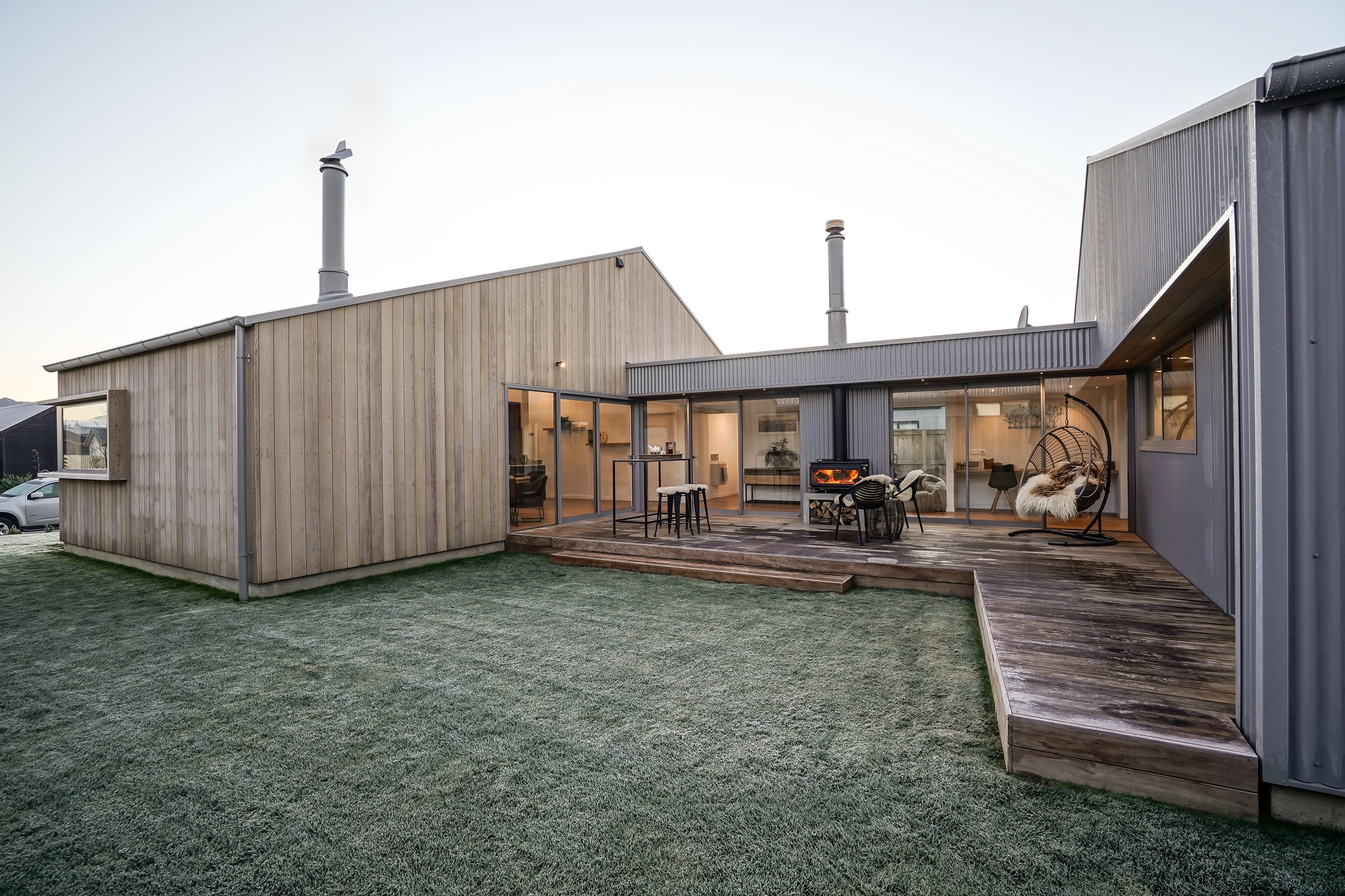 Here’s a stellar example of a familiar architectural form that has been executed to perfection. Looking from the street, you’re immediately drawn to the strong lines and angled soffit in western red cedar. And that’s only part of the story. The back portion of the 168sqm H-shaped Wānaka property is clad in vertical corrugated metal. Timber and metal – it’s all part of the Kiwi vernacular. Step inside and you’ll find soaring ceilings and light-filled spaces – the kitchen-dining area has three picture windows that capture the outlook. Connecting this part of the house with the bedroom wing is a sunny link with two large flush stacker doors that take you out to a sheltered hardwood deck. Too chilly? No worries. A log-burner pizza oven is mounted on a polished concrete pedestal. It’s here the combination of cedar and corrugate comes to the fore. Craftsmanship is evident everywhere, especially in the detailed flashings. Head through the link, which has a study nook, and a sliding barn door leads to the wing containing three bedrooms. The main suite, with ensuite, has direct access to the deck and courtyard. Other bonuses in this beauty include a freestanding bath and underfloor heating in the main bathroom.