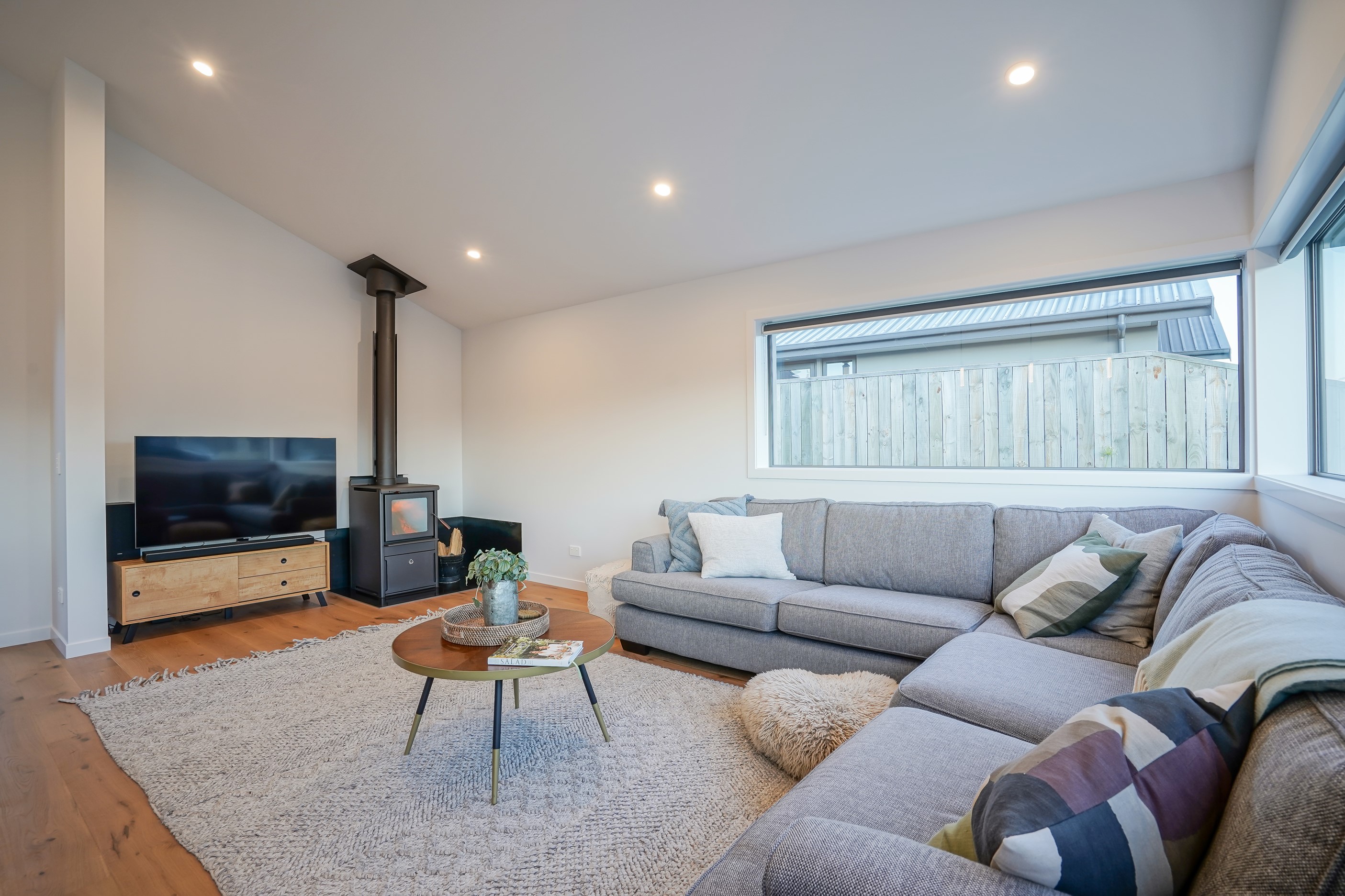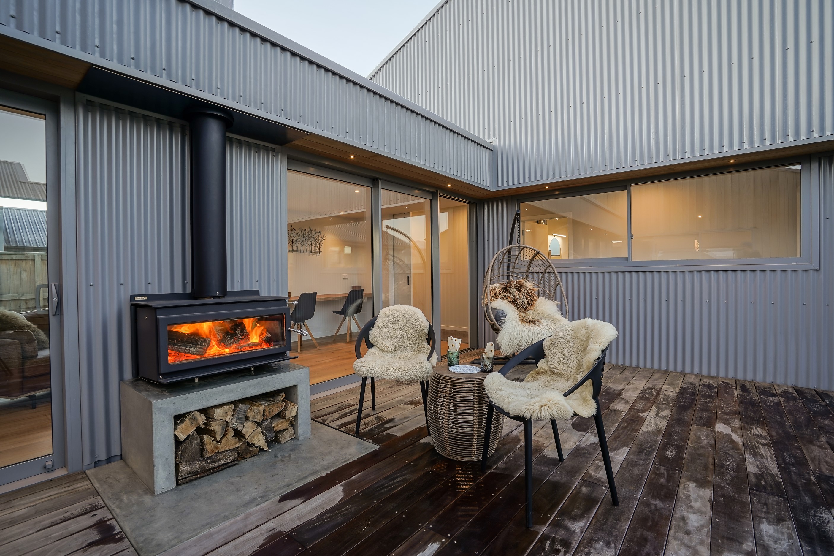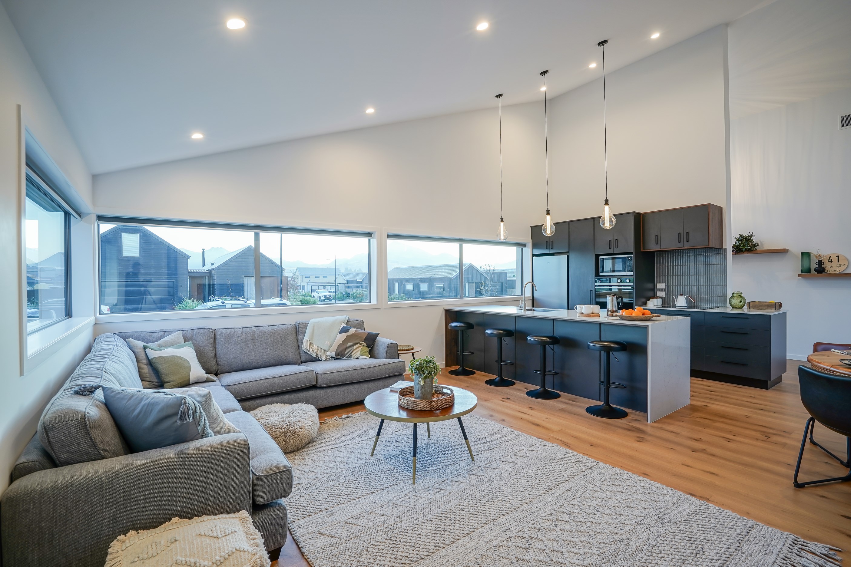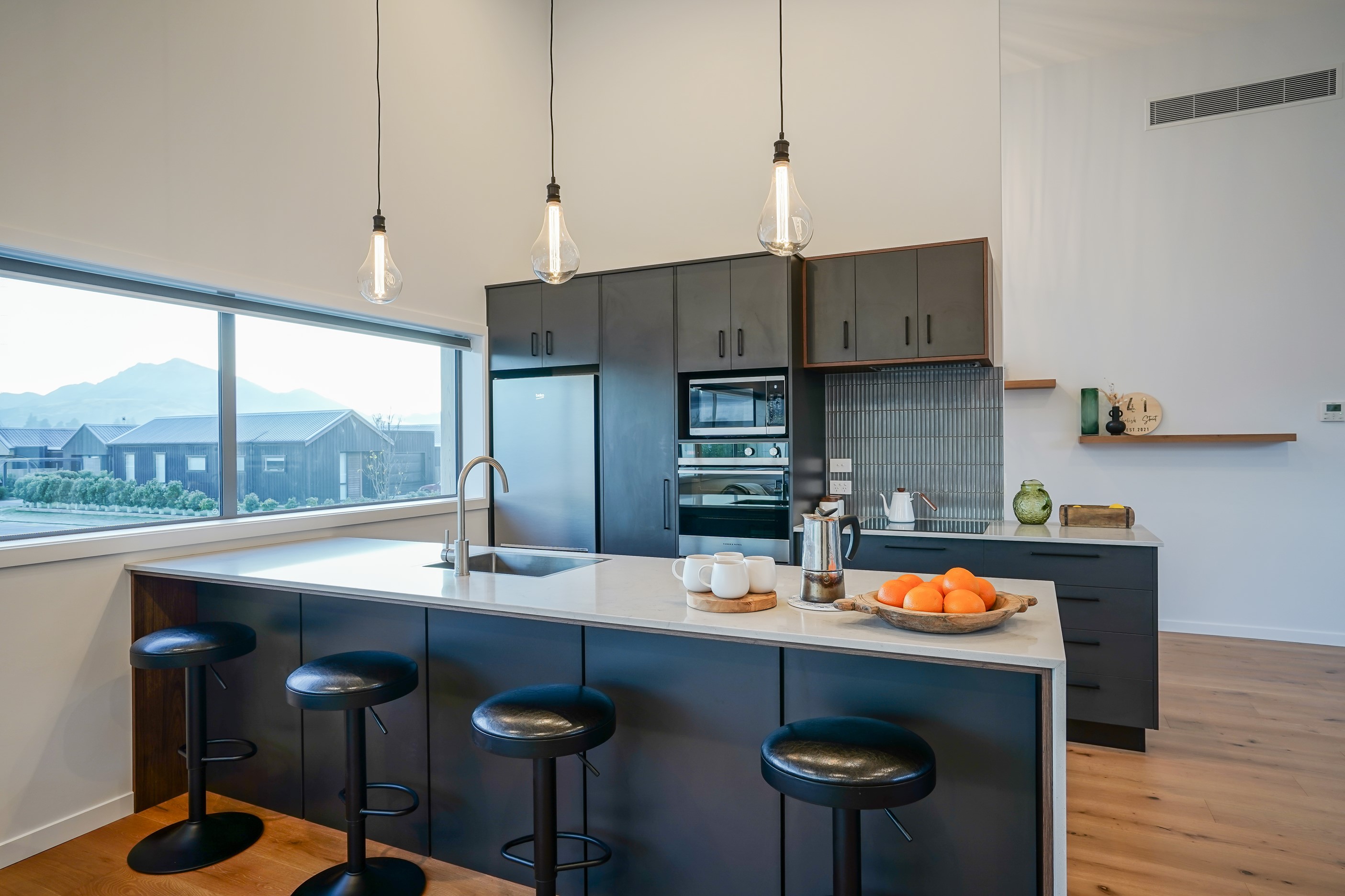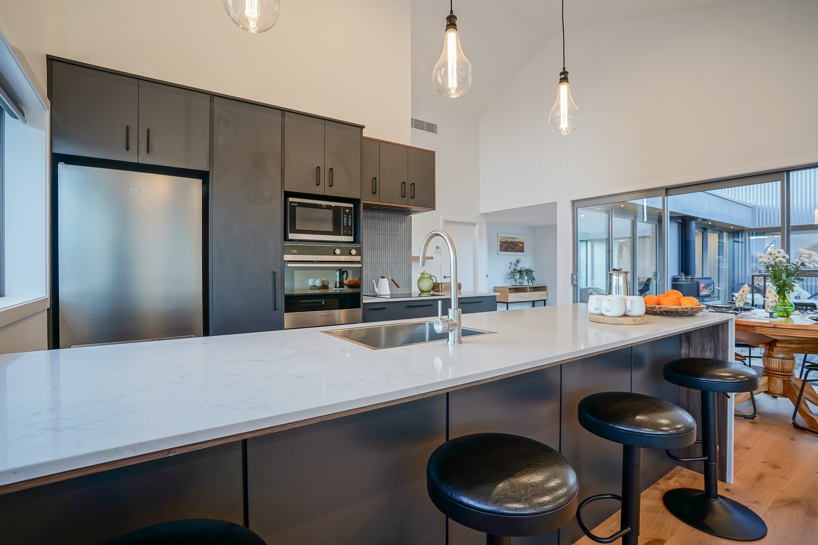 Here’s a stellar example of a familiar architectural form that has been executed to perfection. Looking from the street, you’re immediately drawn to the strong lines and angled soffit in western red cedar. And that’s only part of the story. The back portion of the 168sqm H-shaped Wānaka property is clad in vertical corrugated metal. Timber and metal – it’s all part of the Kiwi vernacular. Step inside and you’ll find soaring ceilings and light-filled spaces – the kitchen-dining area has three picture windows that capture the outlook. Connecting this part of the house with the bedroom wing is a sunny link with two large flush stacker doors that take you out to a sheltered hardwood deck. Too chilly? No worries. A log-burner pizza oven is mounted on a polished concrete pedestal. It’s here the combination of cedar and corrugate comes to the fore. Craftsmanship is evident everywhere, especially in the detailed flashings. Head through the link, which has a study nook, and a sliding barn door leads to the wing containing three bedrooms. The main suite, with ensuite, has direct access to the deck and courtyard. Other bonuses in this beauty include a freestanding bath and underfloor heating in the main bathroom.