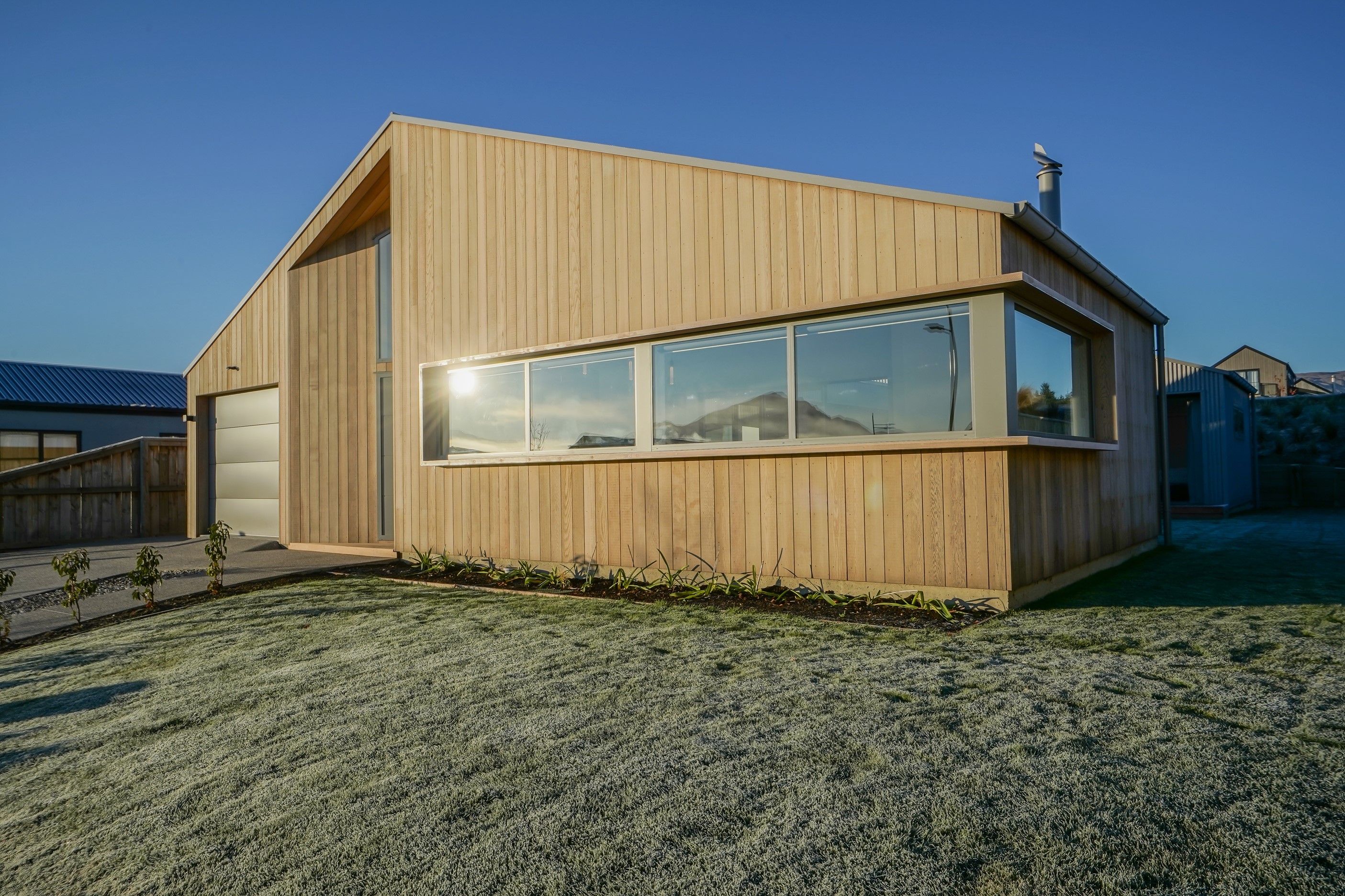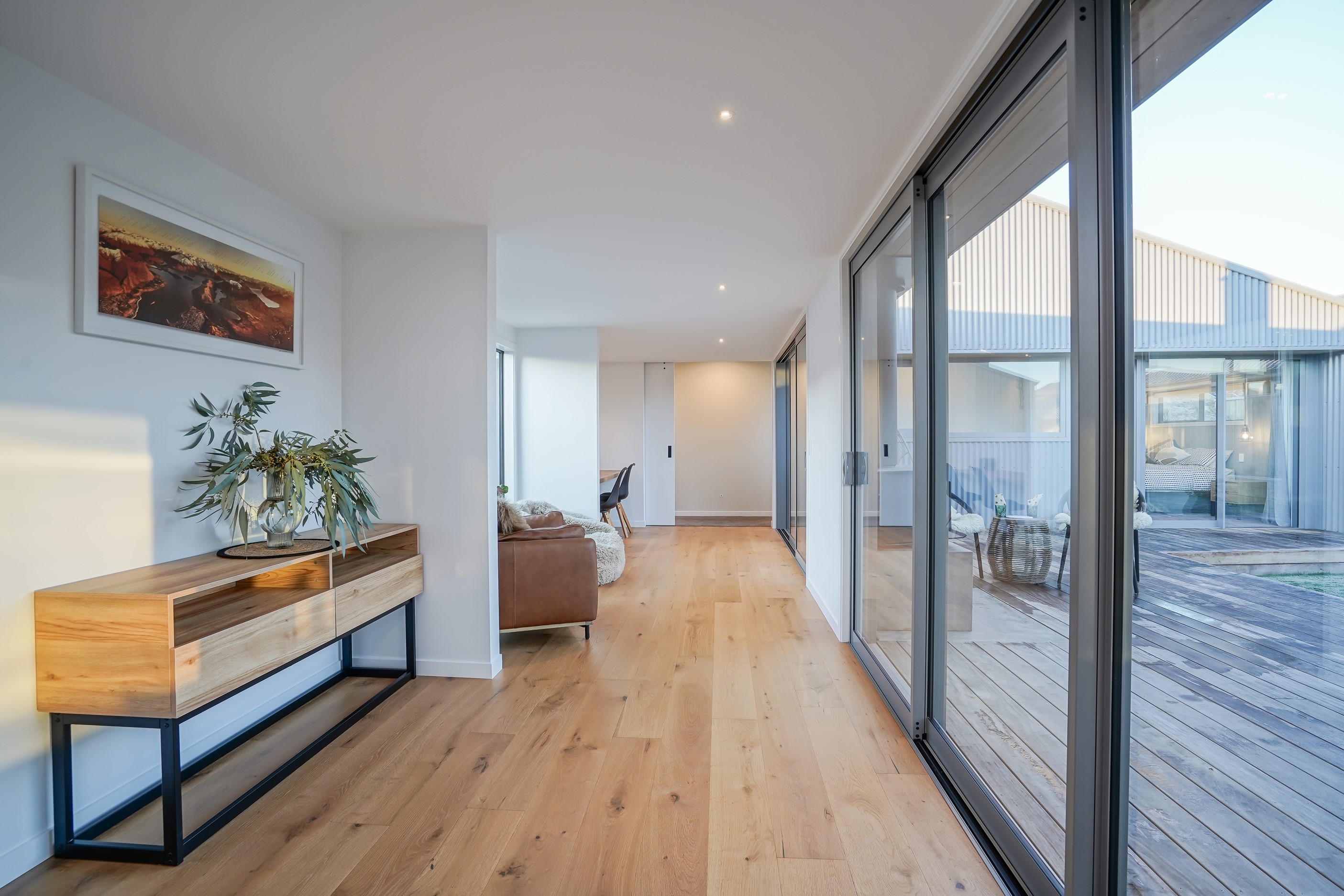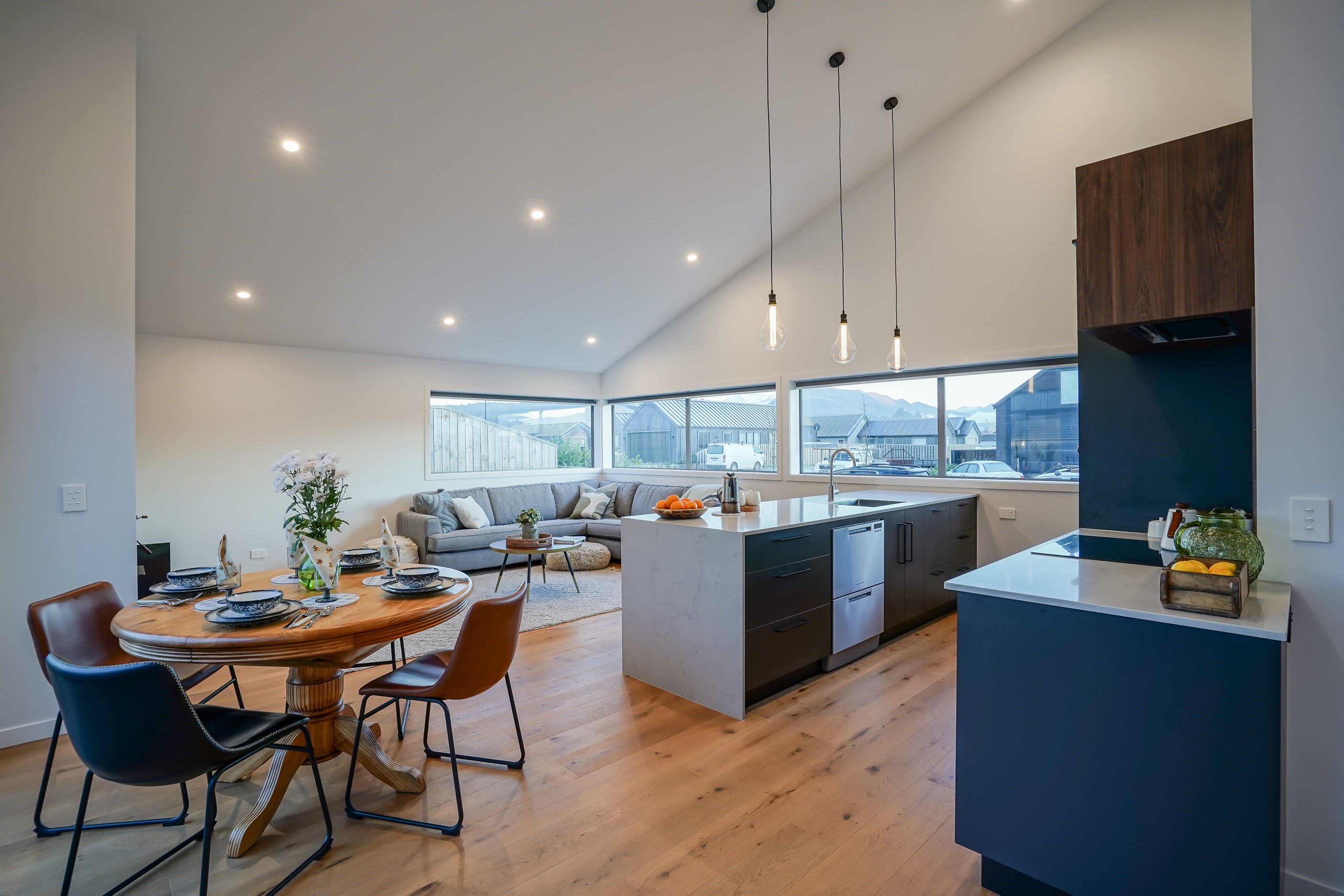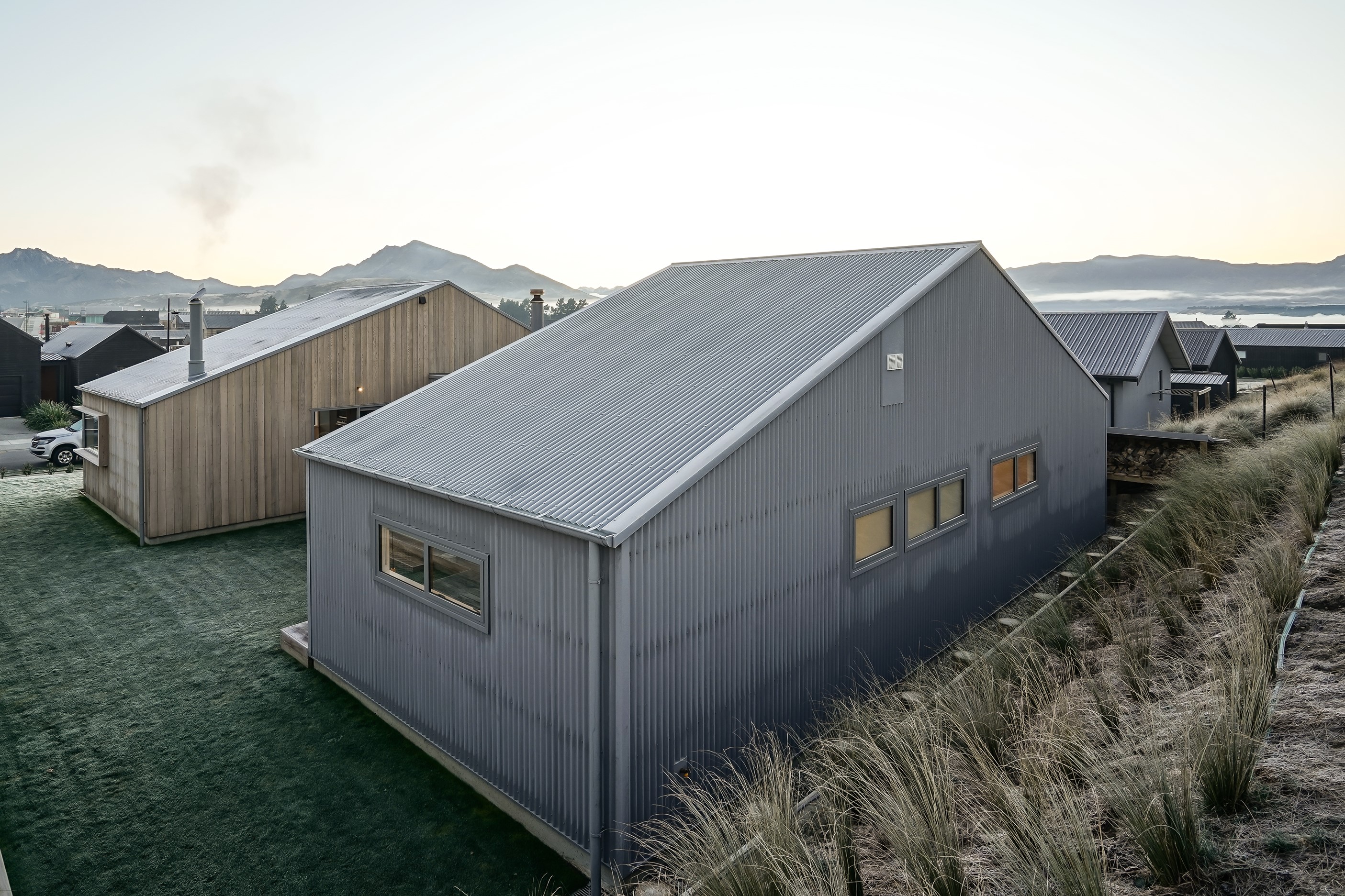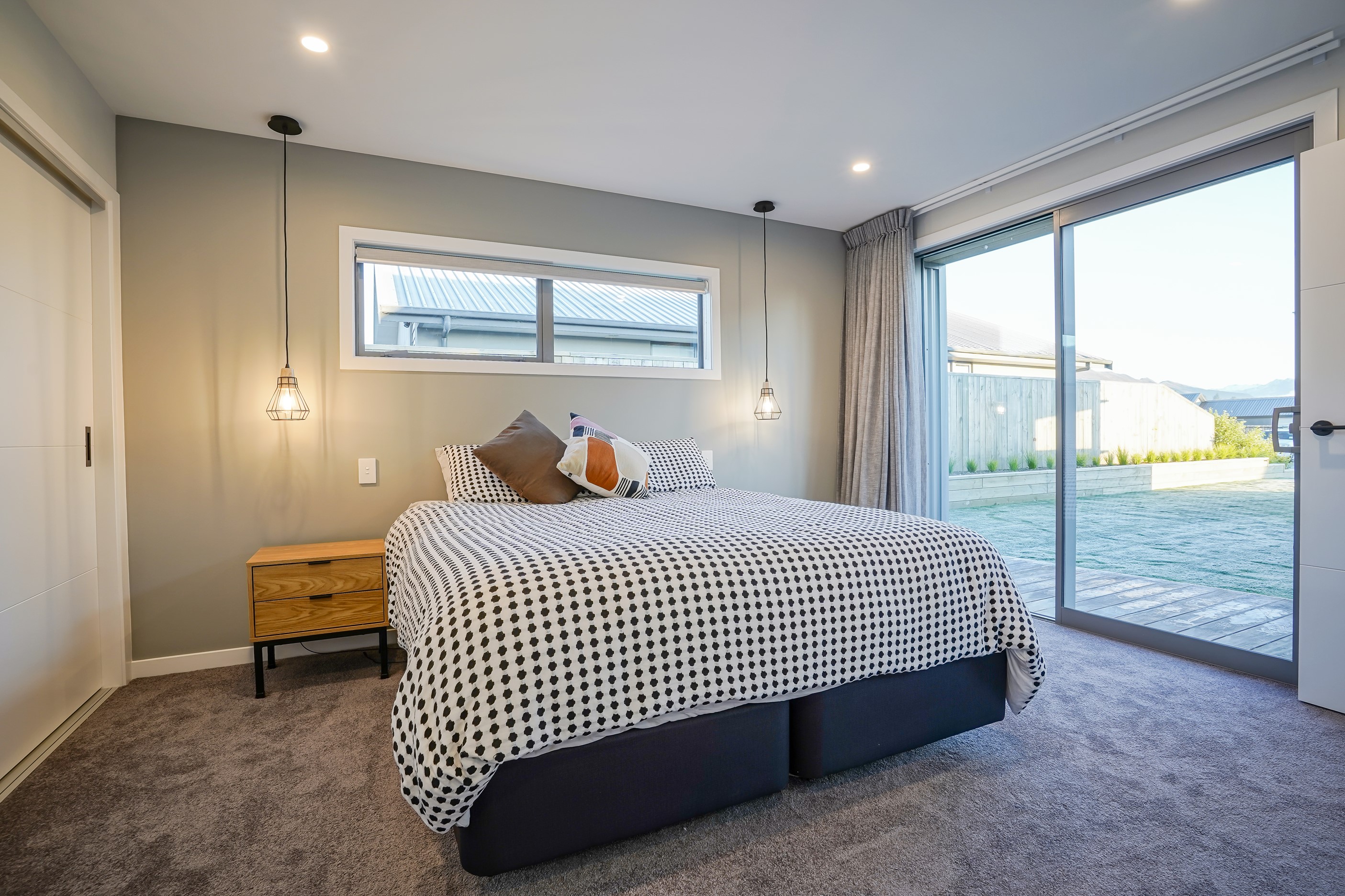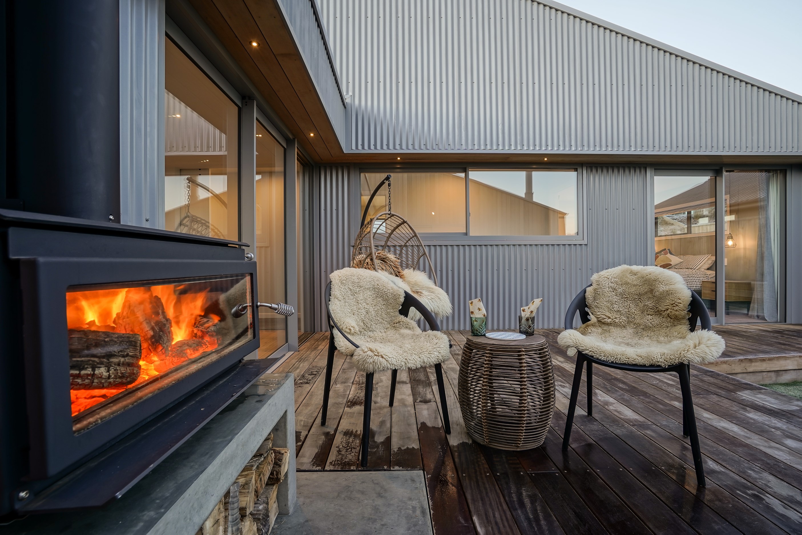 Here’s a stellar example of a familiar architectural form that has been executed to perfection. Looking from the street, you’re immediately drawn to the strong lines and angled soffit in western red cedar. And that’s only part of the story. The back portion of the 168sqm H-shaped Wānaka property is clad in vertical corrugated metal. Timber and metal – it’s all part of the Kiwi vernacular. Step inside and you’ll find soaring ceilings and light-filled spaces – the kitchen-dining area has three picture windows that capture the outlook. Connecting this part of the house with the bedroom wing is a sunny link with two large flush stacker doors that take you out to a sheltered hardwood deck. Too chilly? No worries. A log-burner pizza oven is mounted on a polished concrete pedestal. It’s here the combination of cedar and corrugate comes to the fore. Craftsmanship is evident everywhere, especially in the detailed flashings. Head through the link, which has a study nook, and a sliding barn door leads to the wing containing three bedrooms. The main suite, with ensuite, has direct access to the deck and courtyard. Other bonuses in this beauty include a freestanding bath and underfloor heating in the main bathroom.