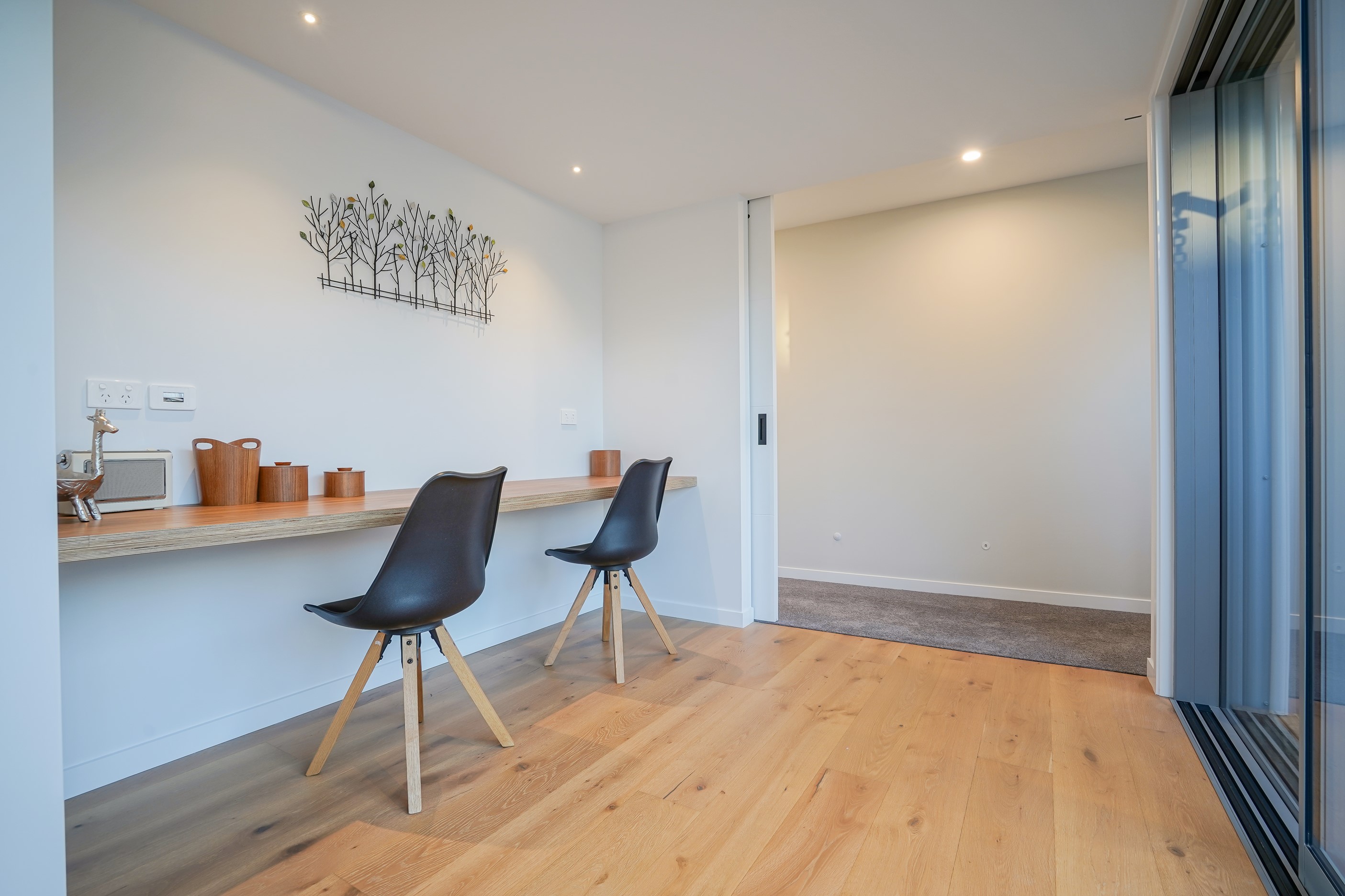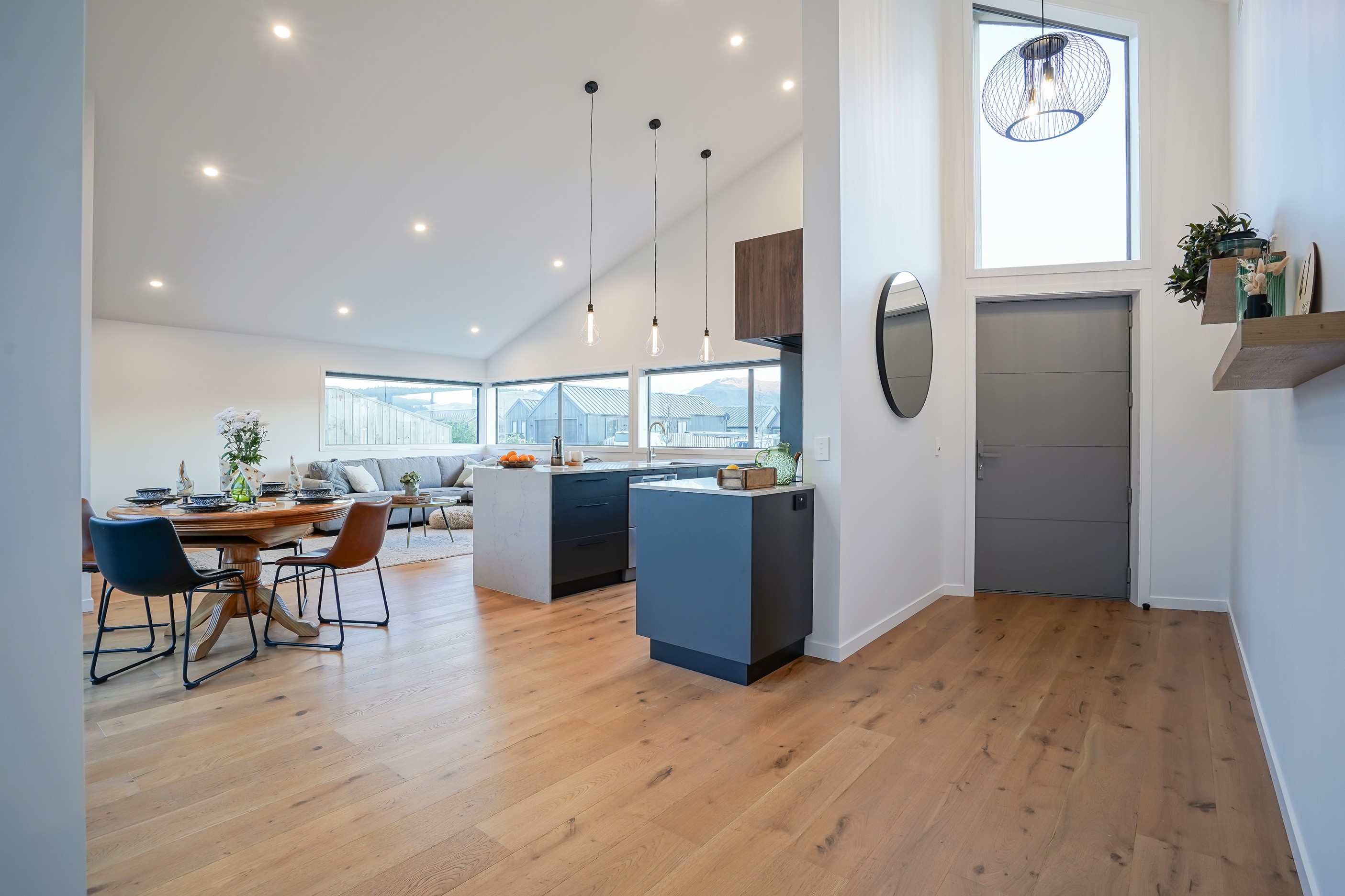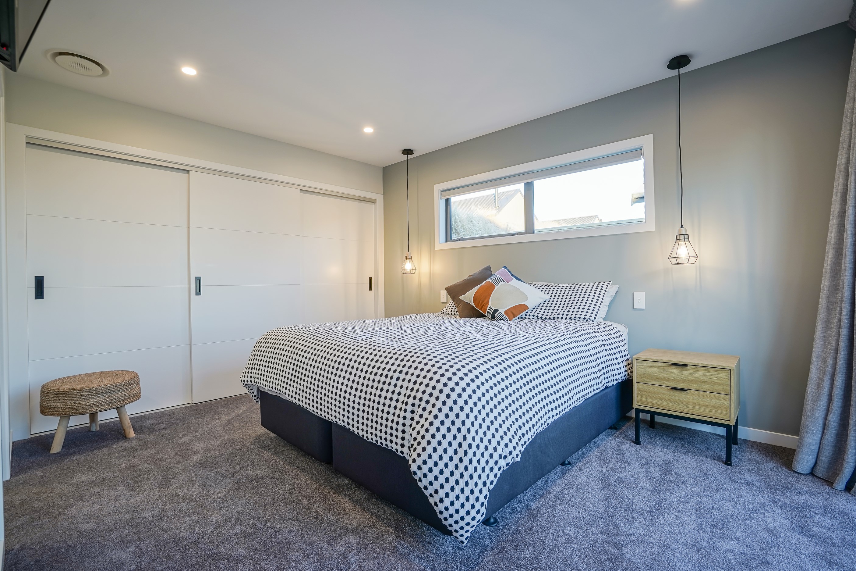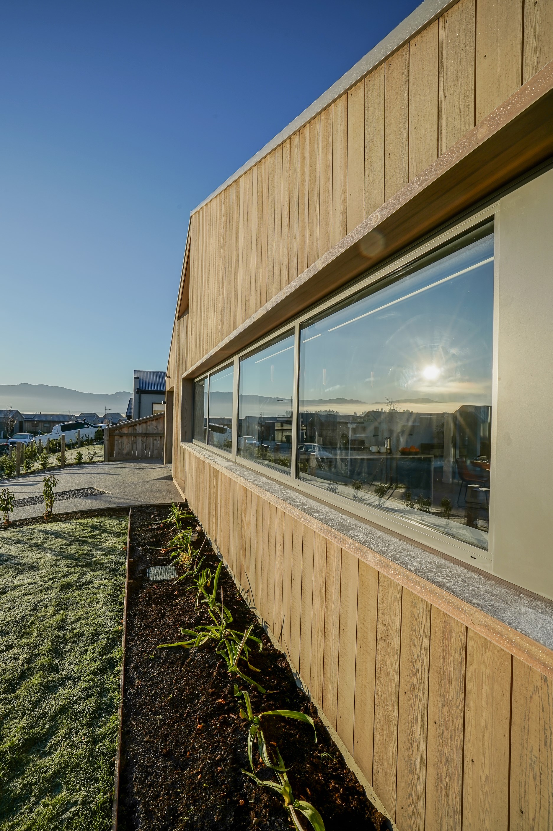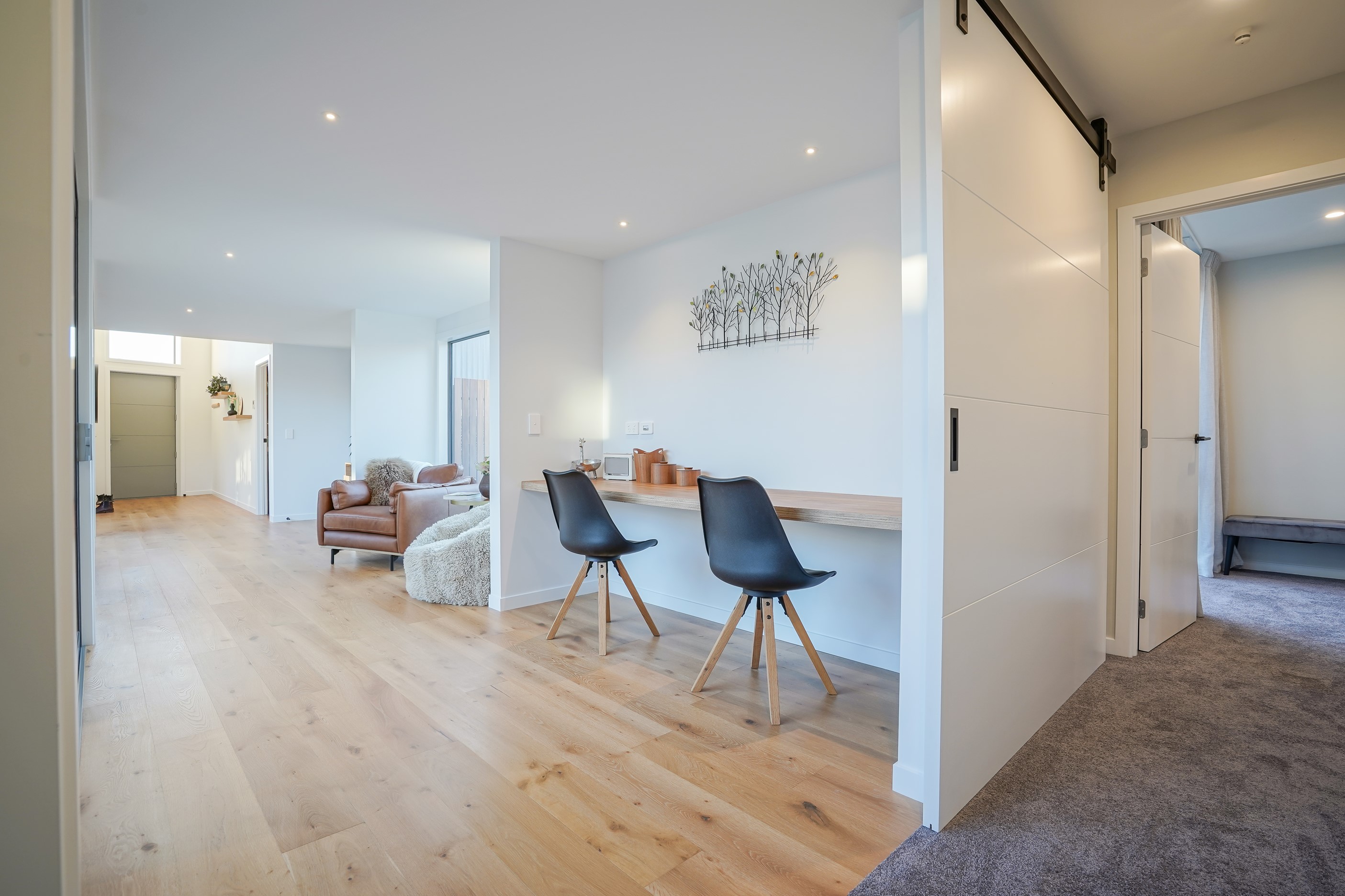 Here’s a stellar example of a familiar architectural form that has been executed to perfection. Looking from the street, you’re immediately drawn to the strong lines and angled soffit in western red cedar. And that’s only part of the story. The back portion of the 168sqm H-shaped Wānaka property is clad in vertical corrugated metal. Timber and metal – it’s all part of the Kiwi vernacular. Step inside and you’ll find soaring ceilings and light-filled spaces – the kitchen-dining area has three picture windows that capture the outlook. Connecting this part of the house with the bedroom wing is a sunny link with two large flush stacker doors that take you out to a sheltered hardwood deck. Too chilly? No worries. A log-burner pizza oven is mounted on a polished concrete pedestal. It’s here the combination of cedar and corrugate comes to the fore. Craftsmanship is evident everywhere, especially in the detailed flashings. Head through the link, which has a study nook, and a sliding barn door leads to the wing containing three bedrooms. The main suite, with ensuite, has direct access to the deck and courtyard. Other bonuses in this beauty include a freestanding bath and underfloor heating in the main bathroom.
