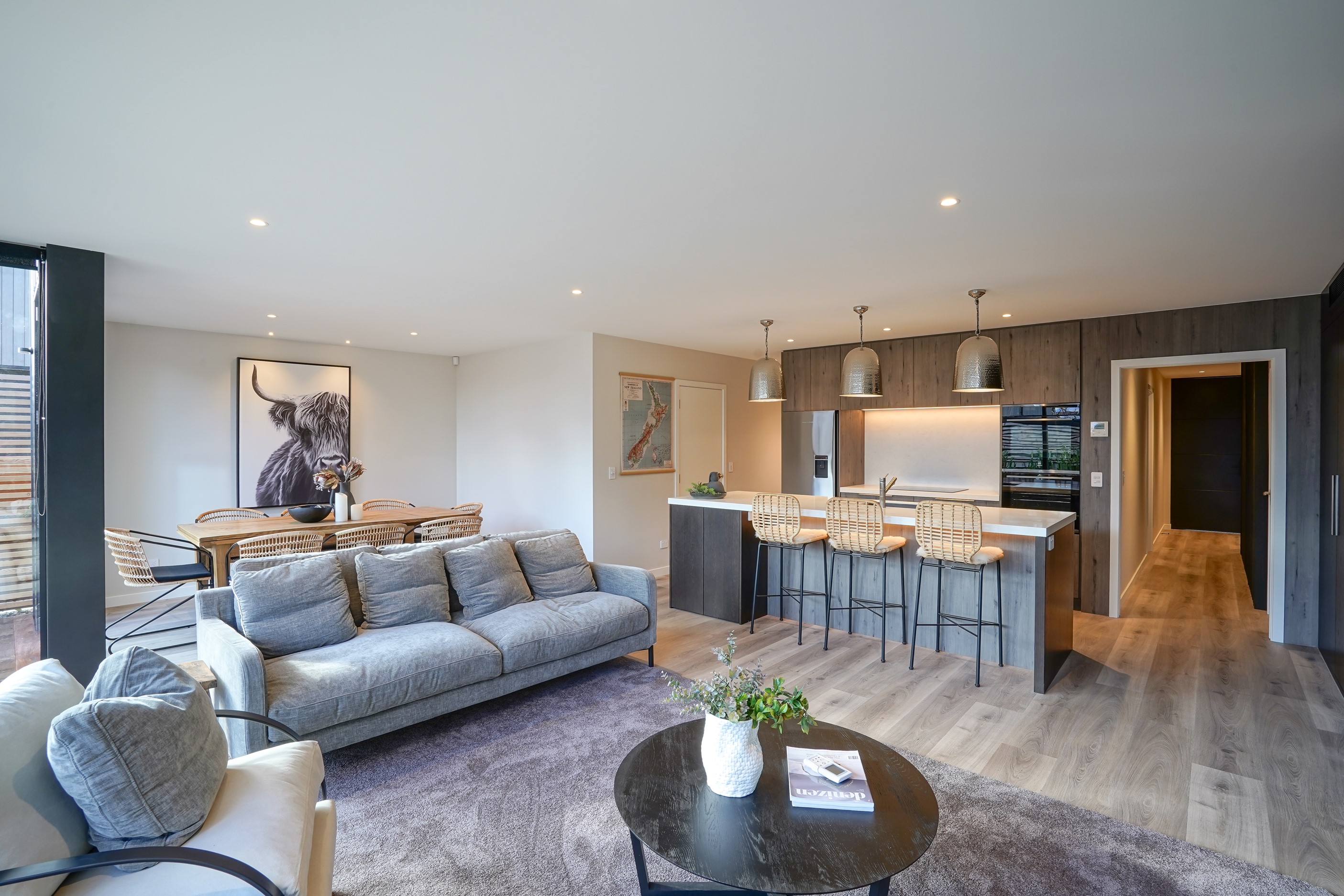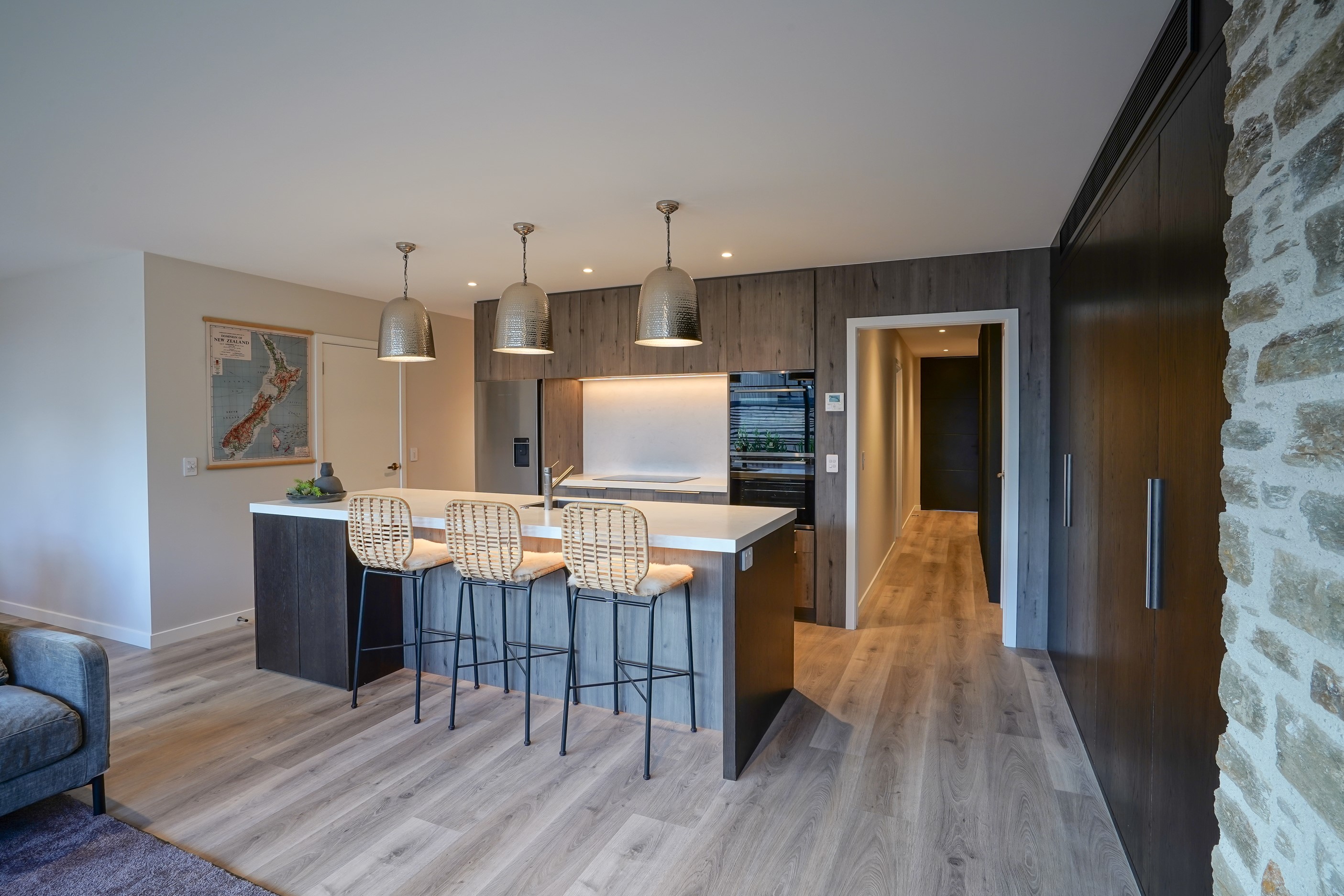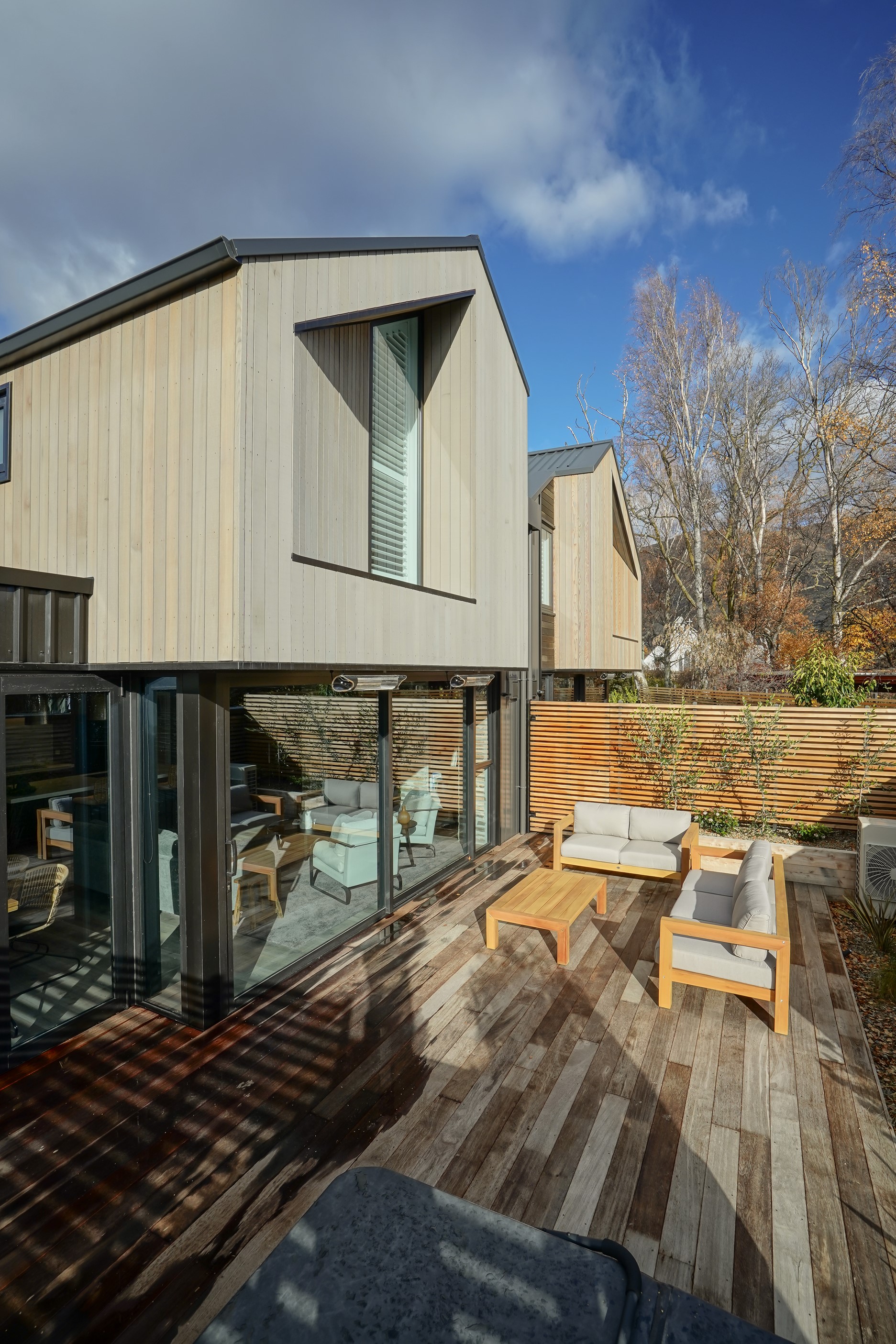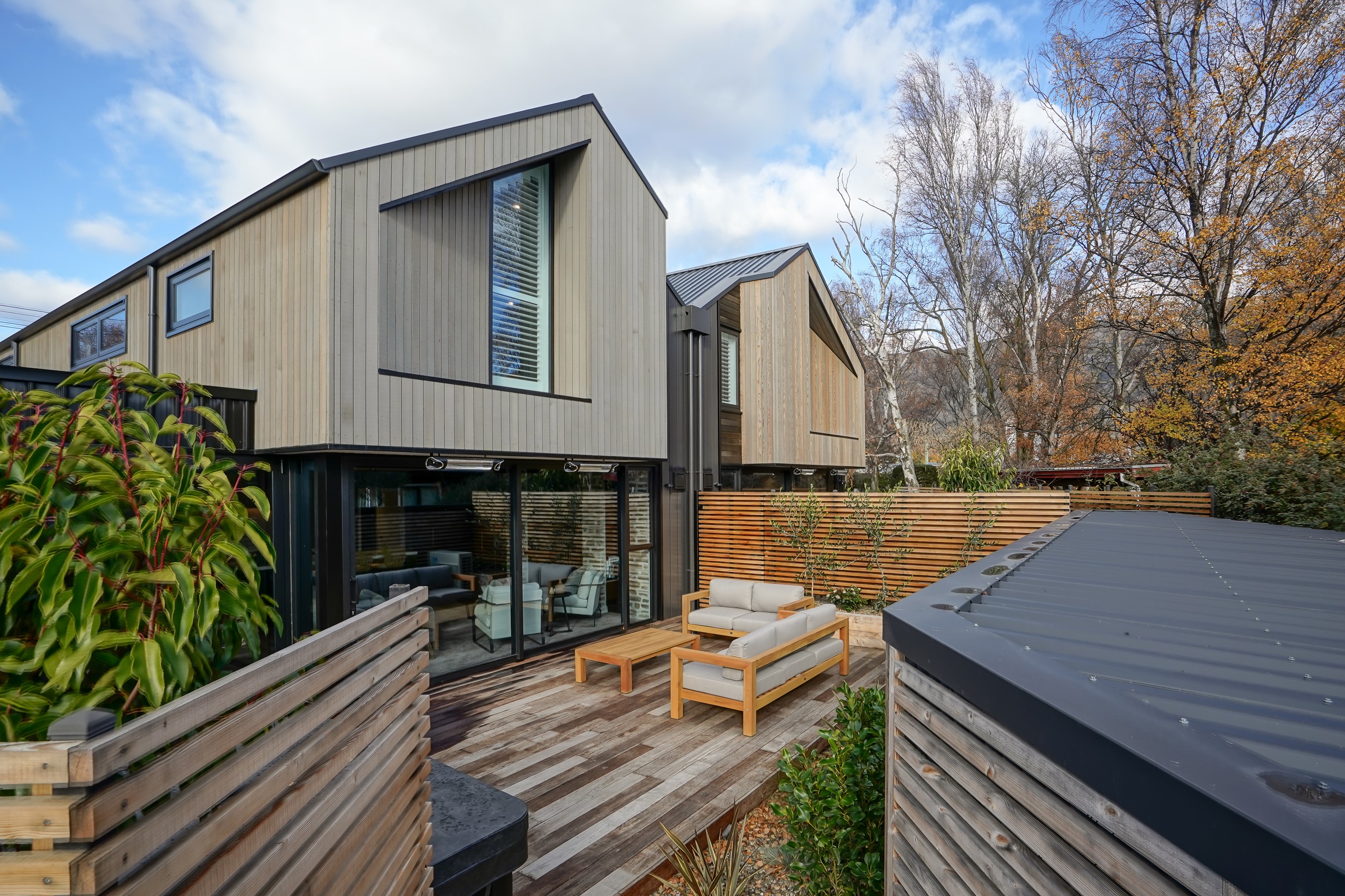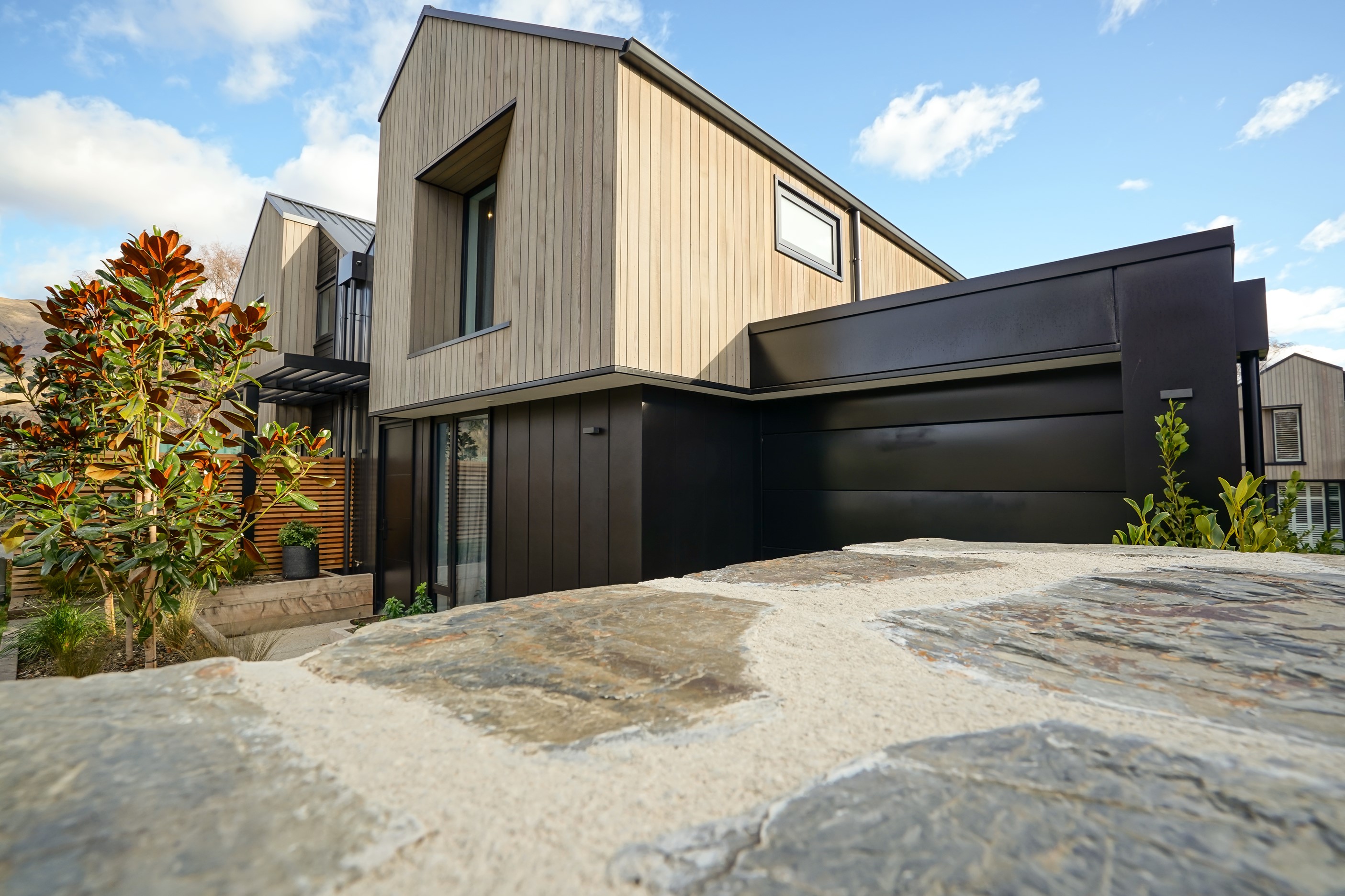 Think of apartments or duplex homes, and your mind doesn’t automatically spring to expansive living areas and multiple bedrooms with their own exquisitely tiled bathrooms. But these 300sqm mirror-image luxury homes have all the bells and whistles, and because of top-notch design, they also have space to burn. Architecturally designed and part of an upscale village, each is kitted out with butler’s pantry, open-plan living and dining area, internal-access garage, and the first of three bedrooms with their own ensuites on the ground floor. Upstairs are two more bedrooms, each with pitched ceilings and walk-in wardrobes, and a study. Yes, there’s plenty here in terms of space and must-haves, but there is also a focus on elegance and style. The exterior of the homes, in vertical timber and black steel, displays angles and recesses that require, time, skill and creativity. The same can be said of the interiors. Schist features pop in the downstairs living area, dark floor-to-ceiling timber balusters separate the entrance from the stairwell, and almost the entire lower-level can be opened up to a private courtyard. Which is precisely where you want to be on warm Central Otago summer evenings.