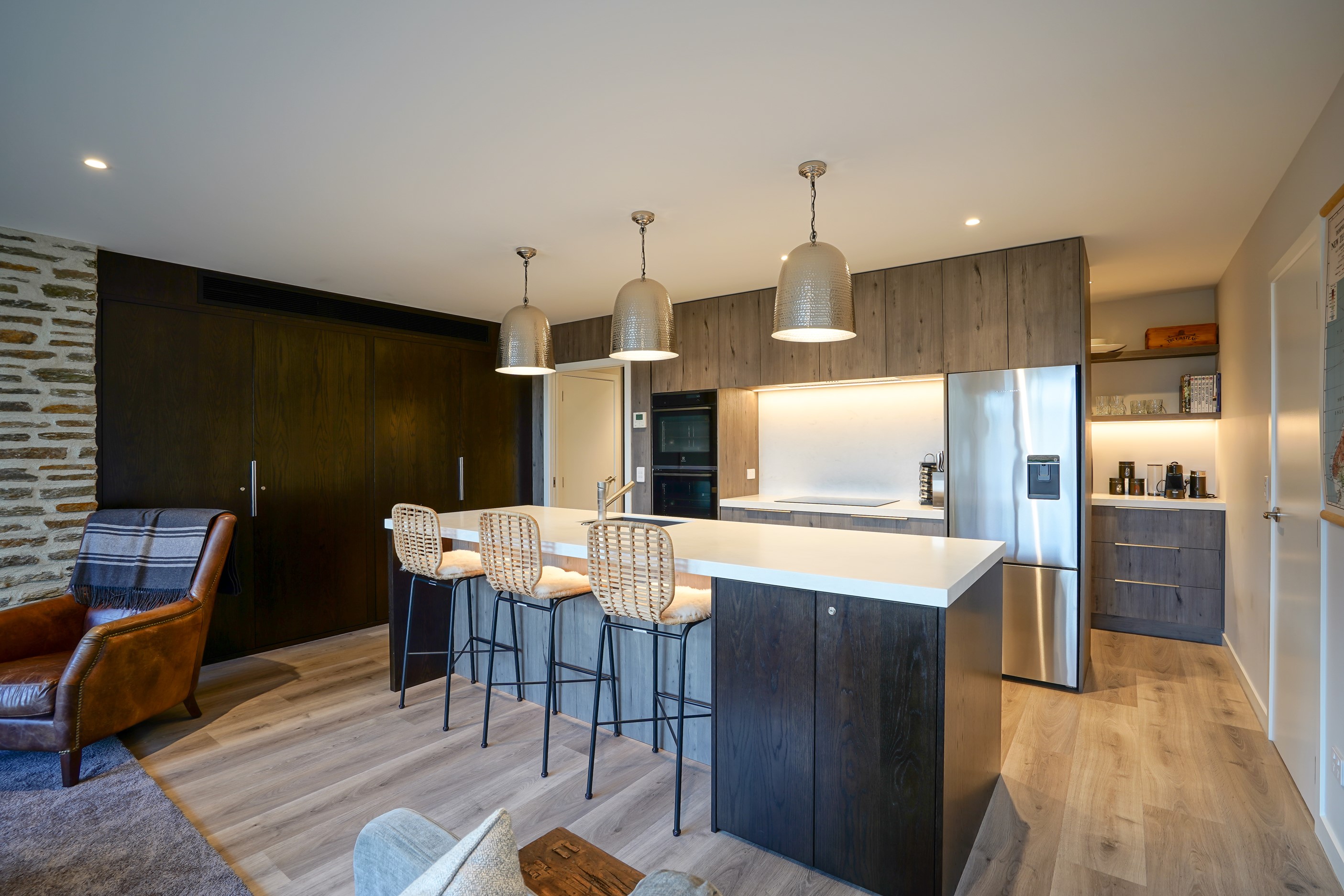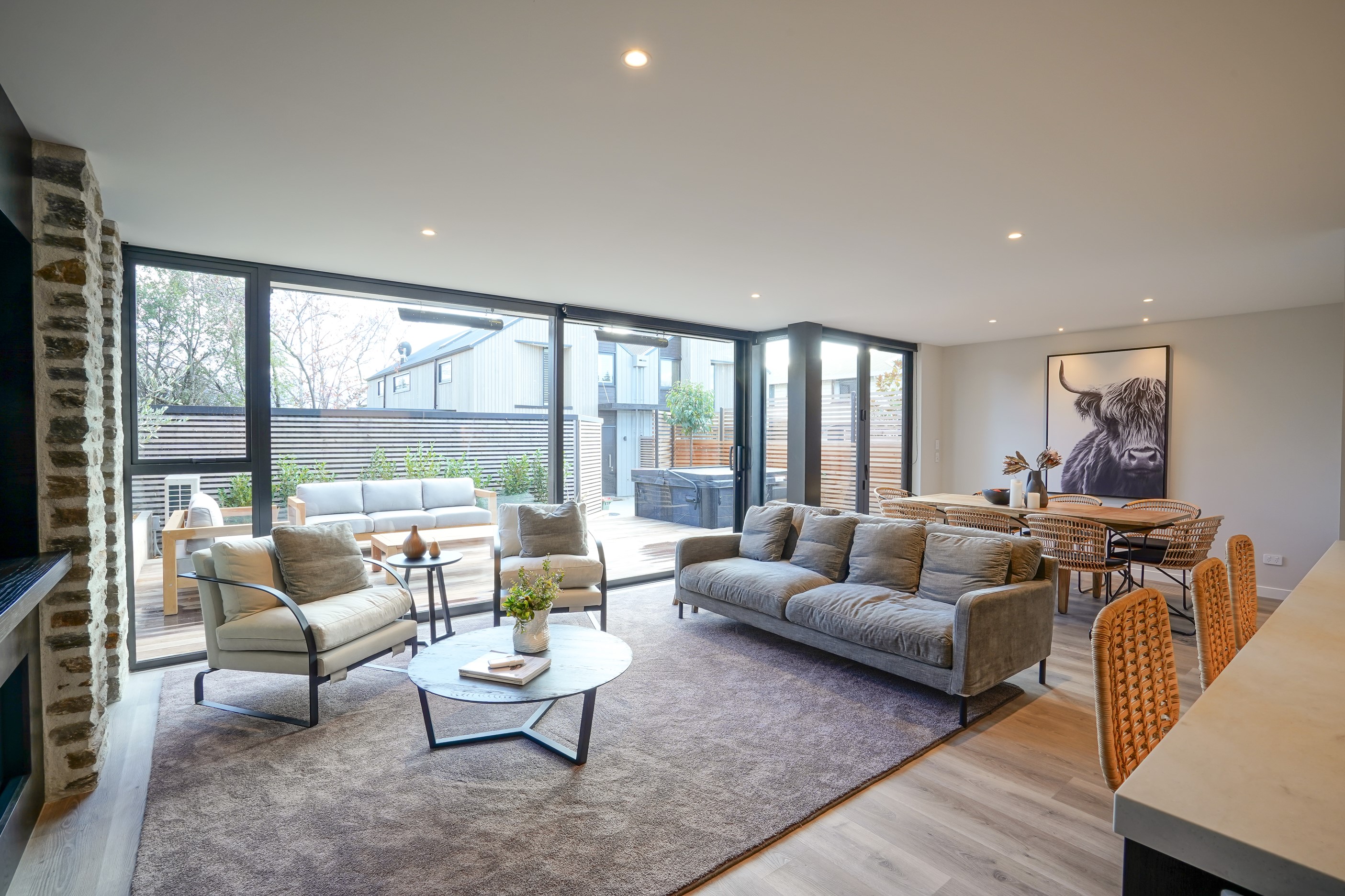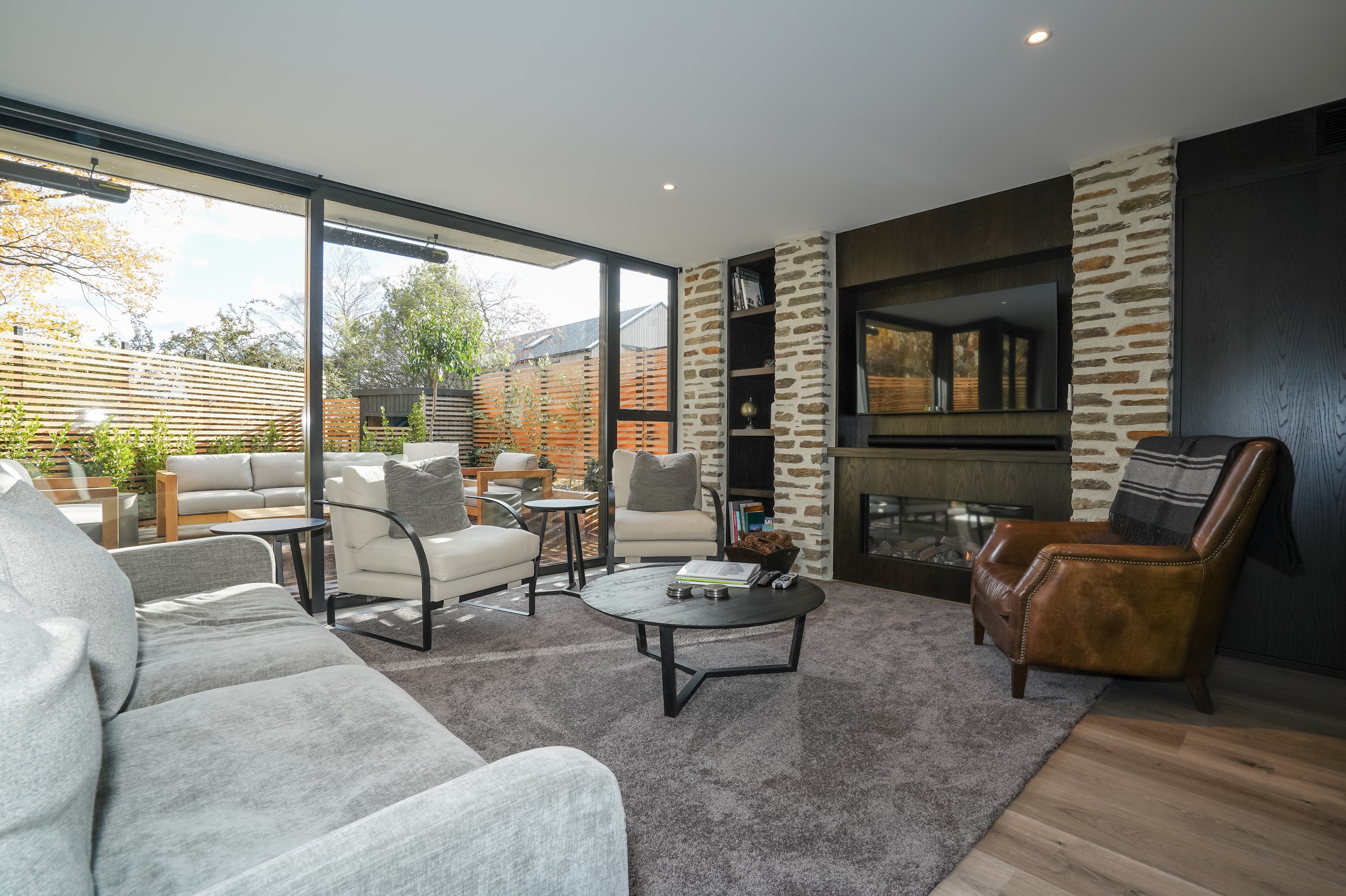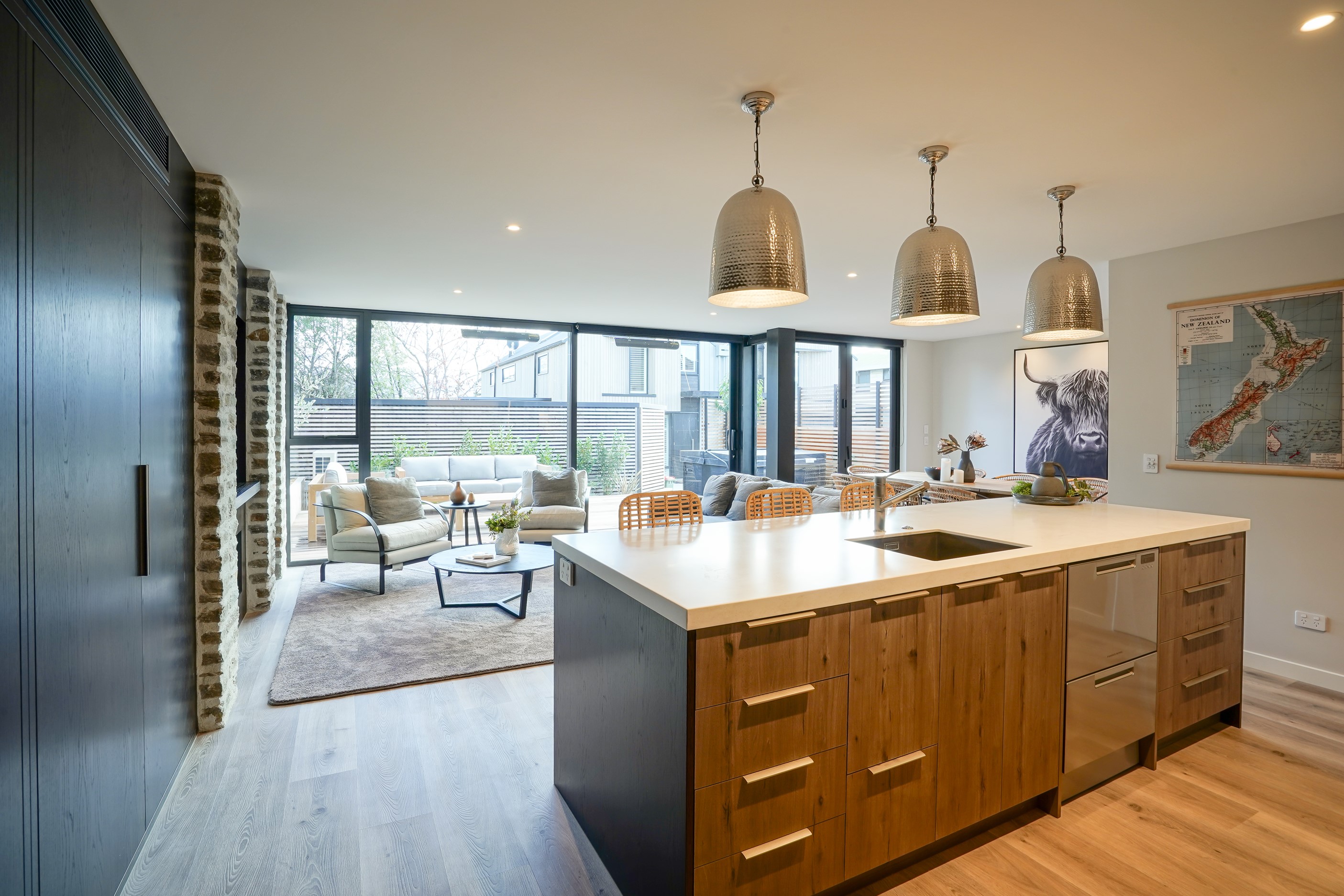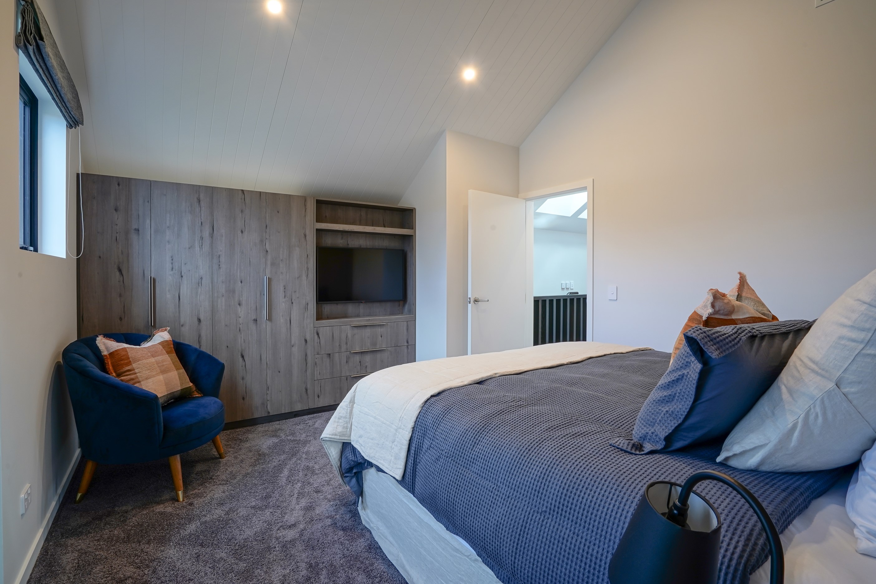Think of apartments or duplex homes, and your mind doesn’t automatically spring to expansive living areas and multiple bedrooms with their own exquisitely tiled bathrooms. But these 300sqm mirror-image luxury homes have all the bells and whistles, and because of top-notch design, they also have space to burn. Architecturally designed and part of an upscale village, each is kitted out with butler’s pantry, open-plan living and dining area, internal-access garage, and the first of three bedrooms with their own ensuites on the ground floor. Upstairs are two more bedrooms, each with pitched ceilings and walk-in wardrobes, and a study. Yes, there’s plenty here in terms of space and must-haves, but there is also a focus on elegance and style. The exterior of the homes, in vertical timber and black steel, displays angles and recesses that require, time, skill and creativity. The same can be said of the interiors. Schist features pop in the downstairs living area, dark floor-to-ceiling timber balusters separate the entrance from the stairwell, and almost the entire lower-level can be opened up to a private courtyard. Which is precisely where you want to be on warm Central Otago summer evenings.
