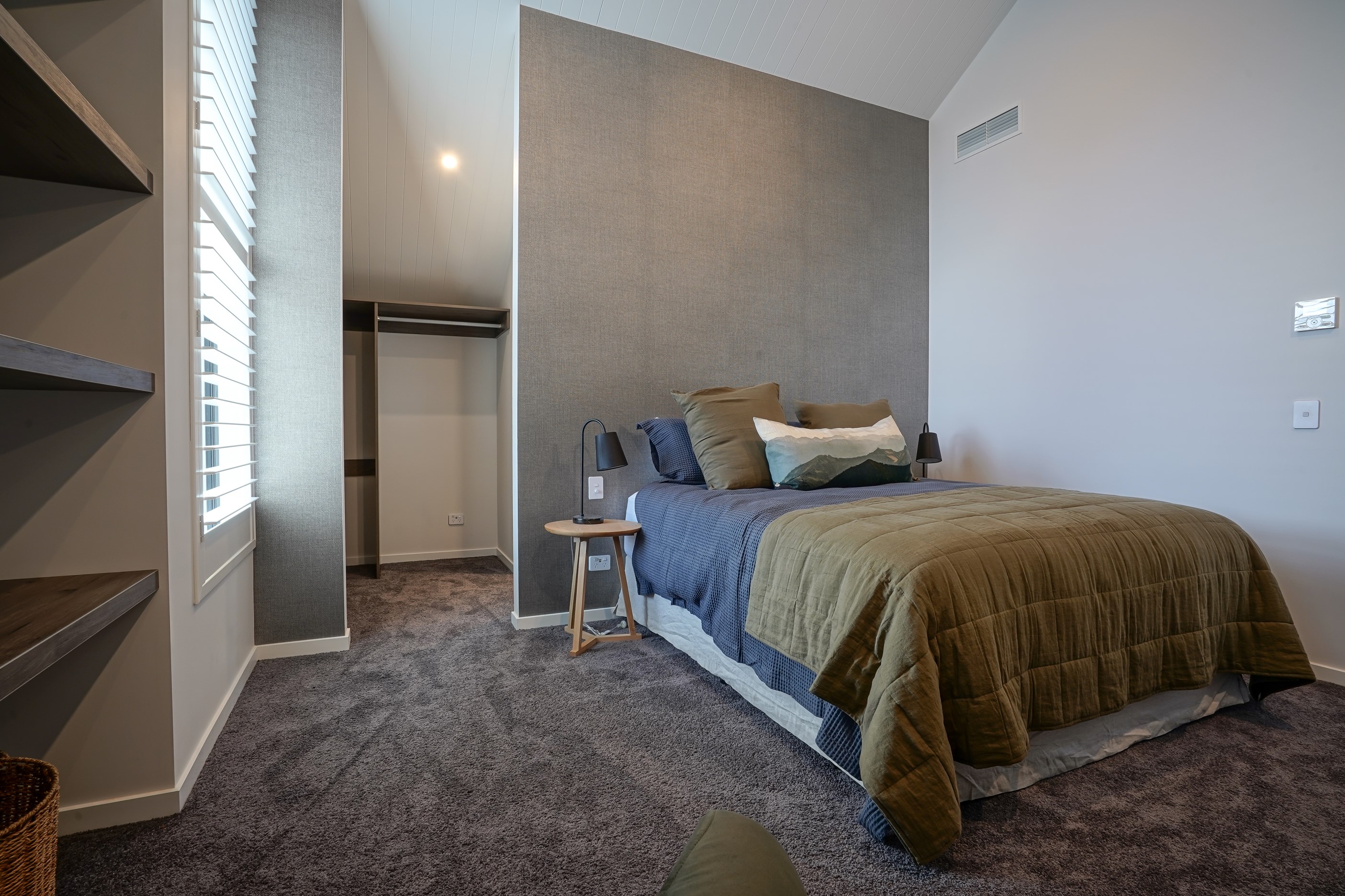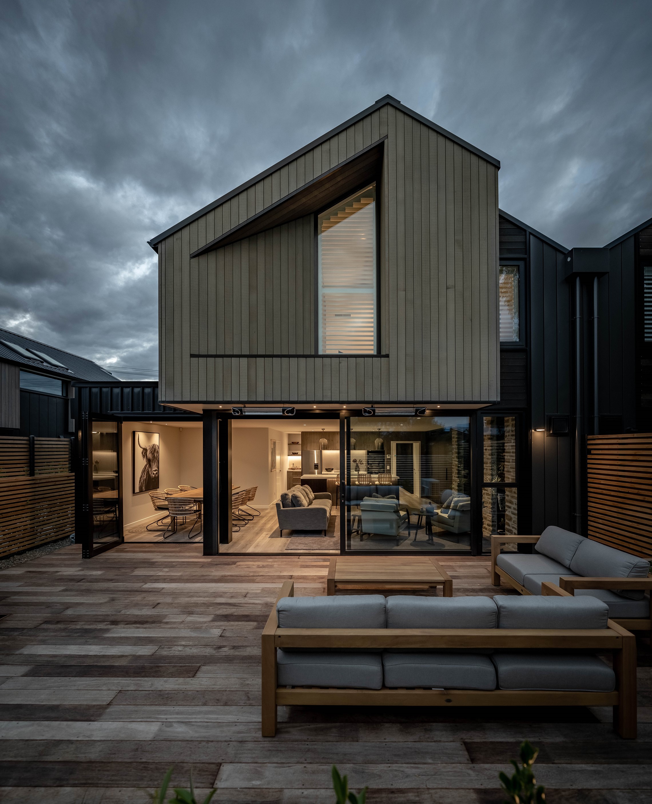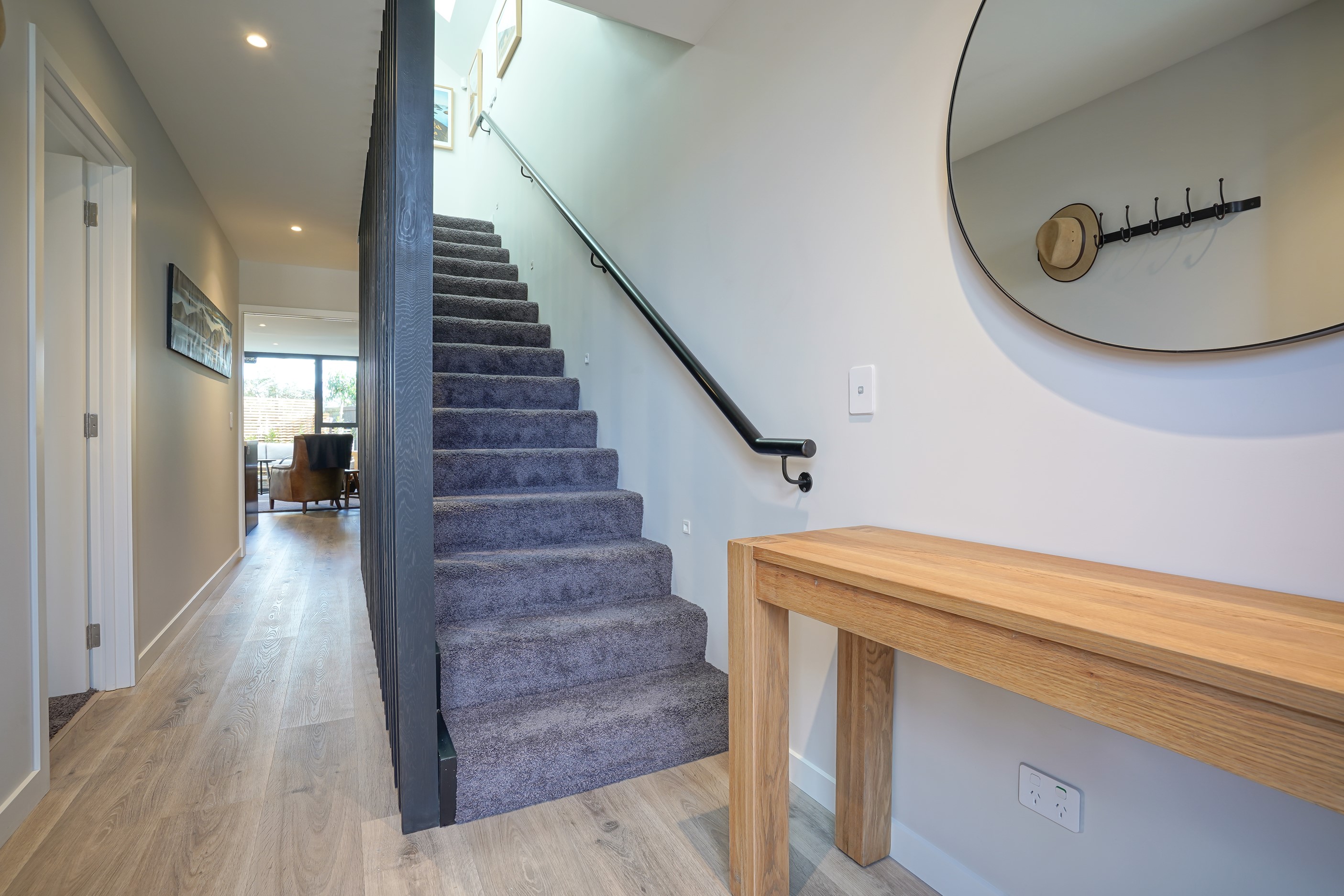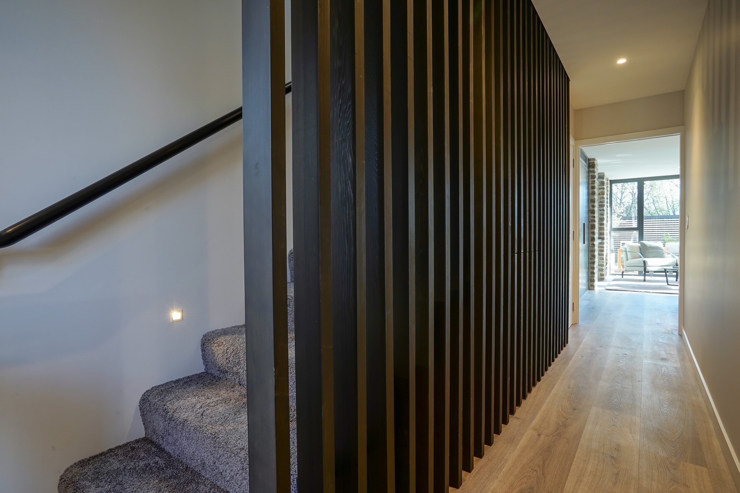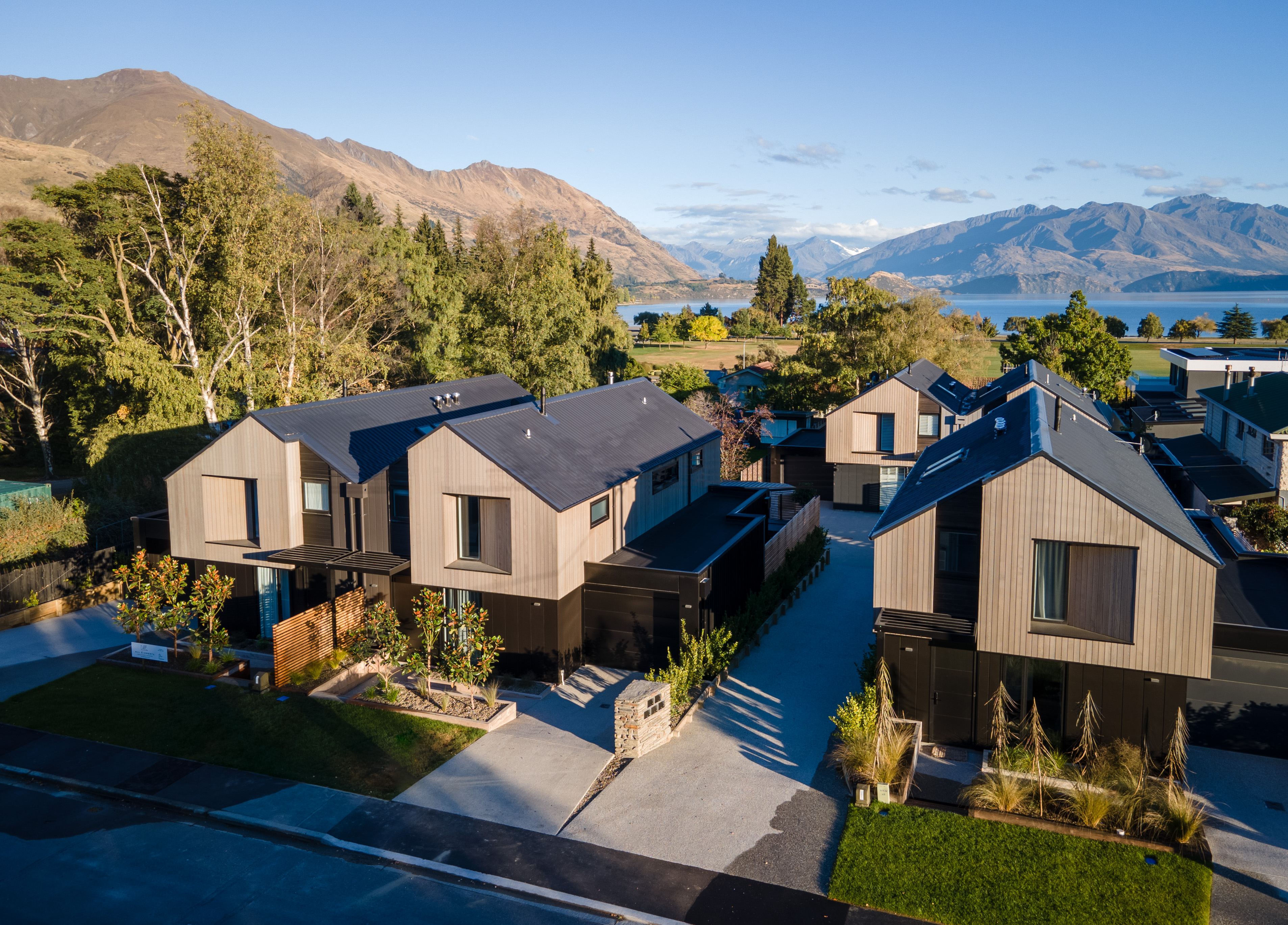 Think of apartments or duplex homes, and your mind doesn’t automatically spring to expansive living areas and multiple bedrooms with their own exquisitely tiled bathrooms. But these 300sqm mirror-image luxury homes have all the bells and whistles, and because of top-notch design, they also have space to burn. Architecturally designed and part of an upscale village, each is kitted out with butler’s pantry, open-plan living and dining area, internal-access garage, and the first of three bedrooms with their own ensuites on the ground floor. Upstairs are two more bedrooms, each with pitched ceilings and walk-in wardrobes, and a study. Yes, there’s plenty here in terms of space and must-haves, but there is also a focus on elegance and style. The exterior of the homes, in vertical timber and black steel, displays angles and recesses that require, time, skill and creativity. The same can be said of the interiors. Schist features pop in the downstairs living area, dark floor-to-ceiling timber balusters separate the entrance from the stairwell, and almost the entire lower-level can be opened up to a private courtyard. Which is precisely where you want to be on warm Central Otago summer evenings.