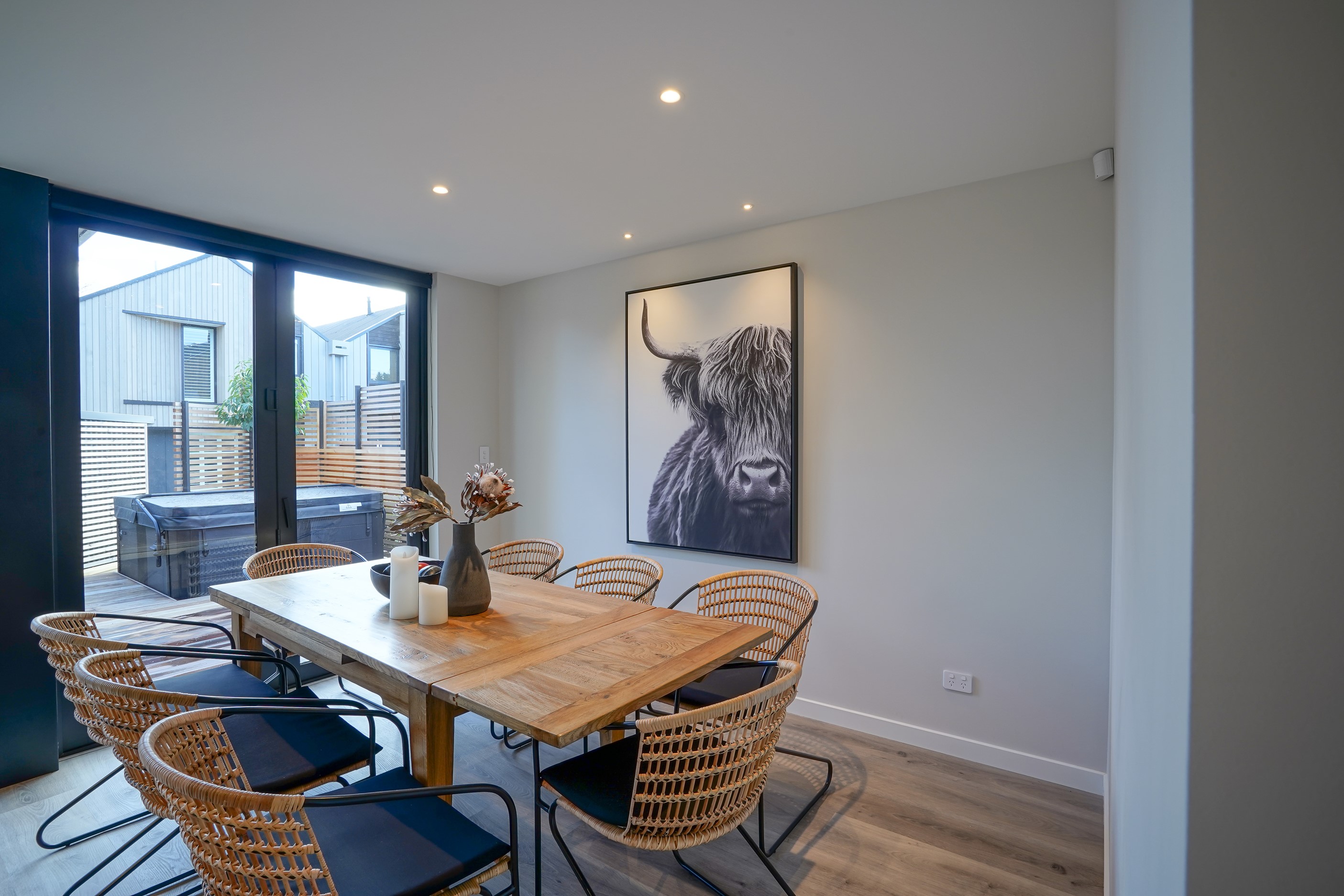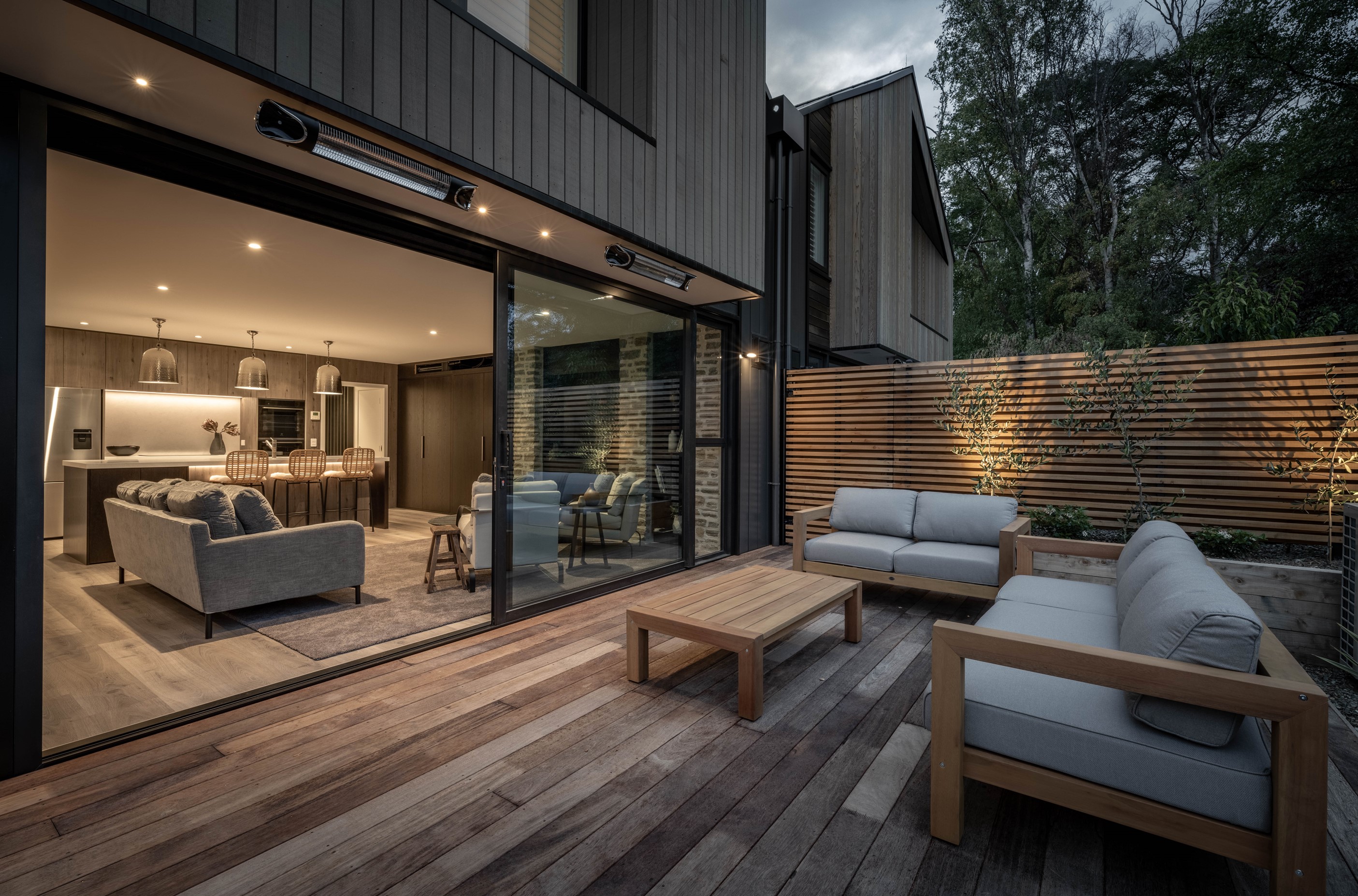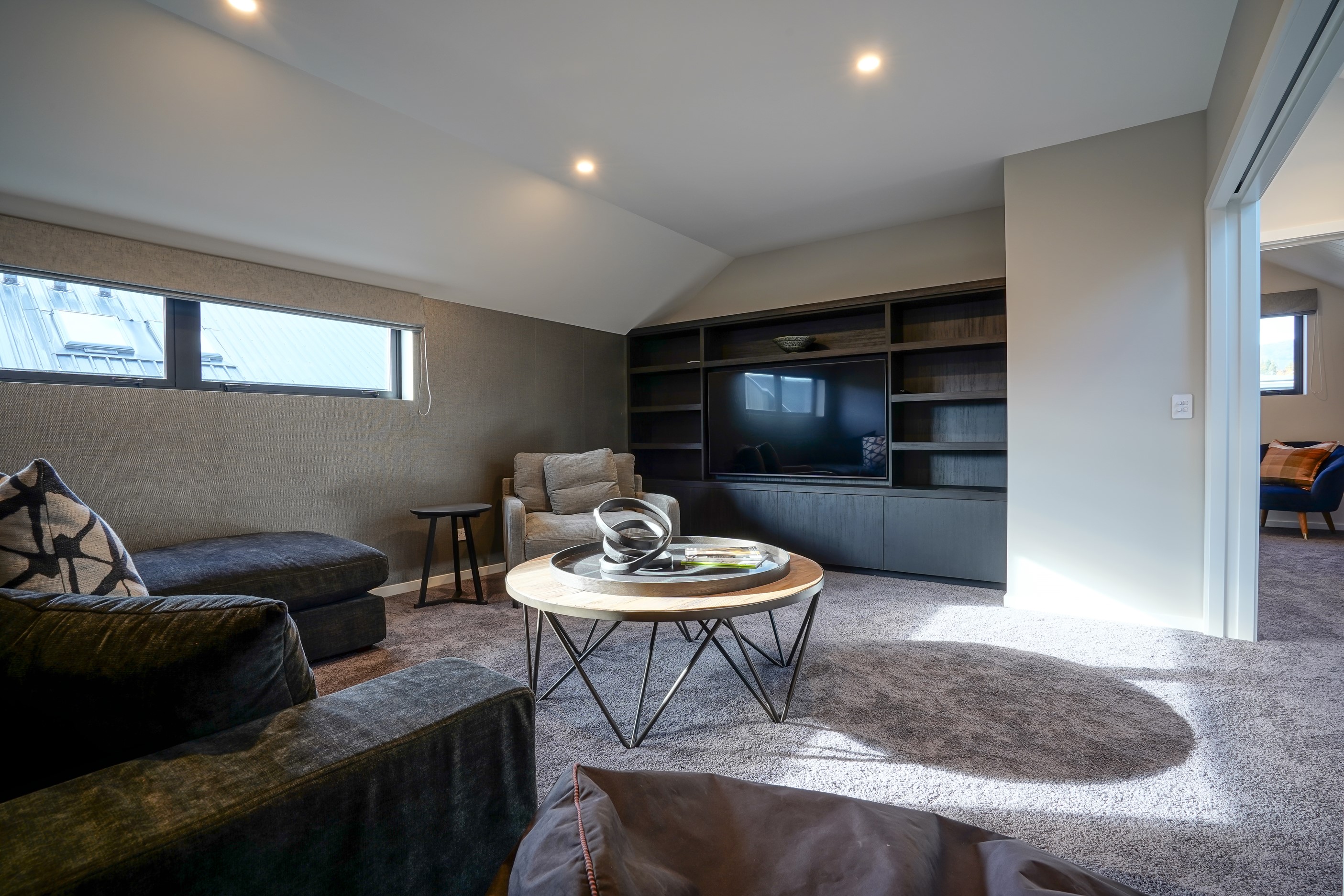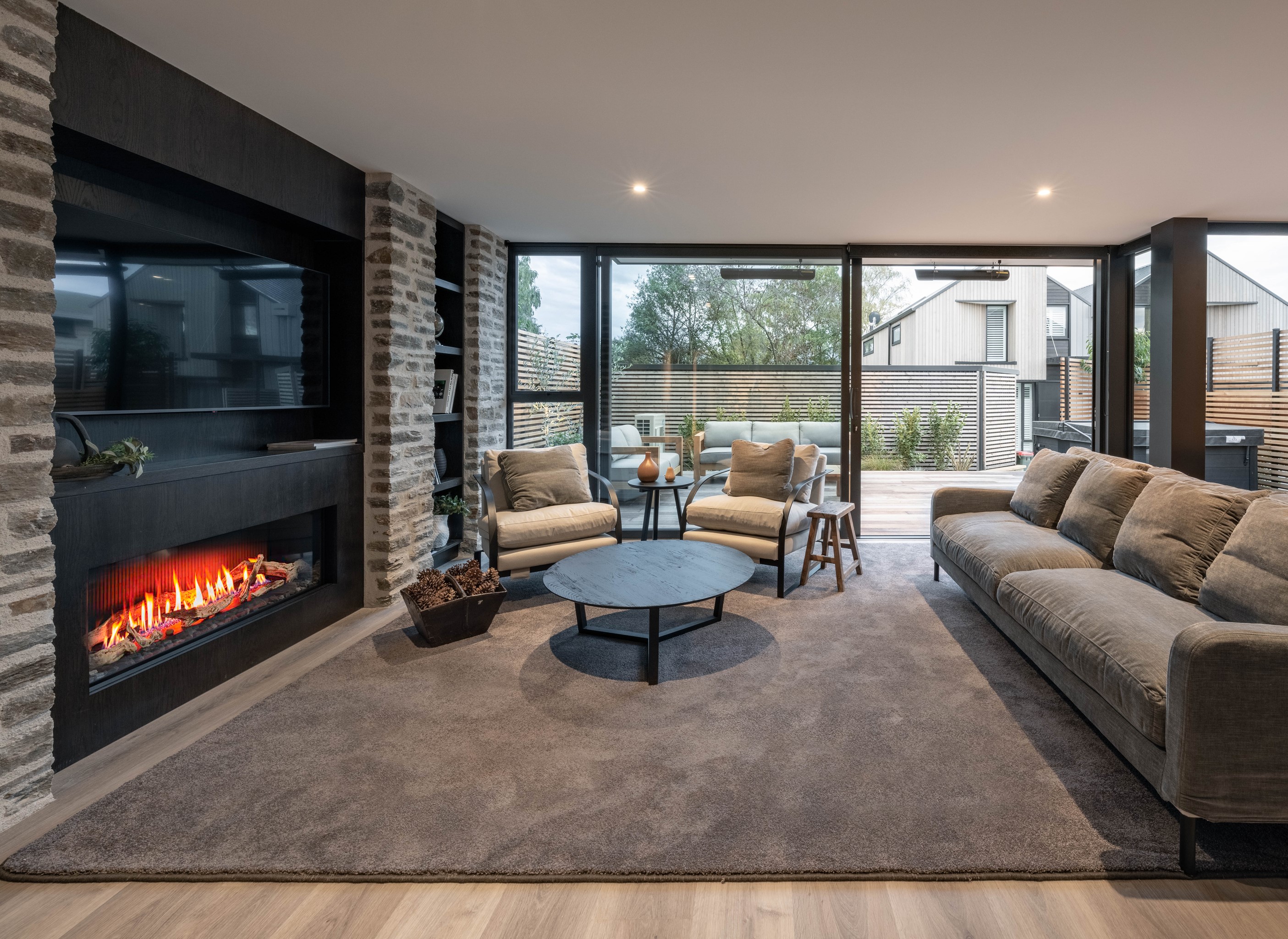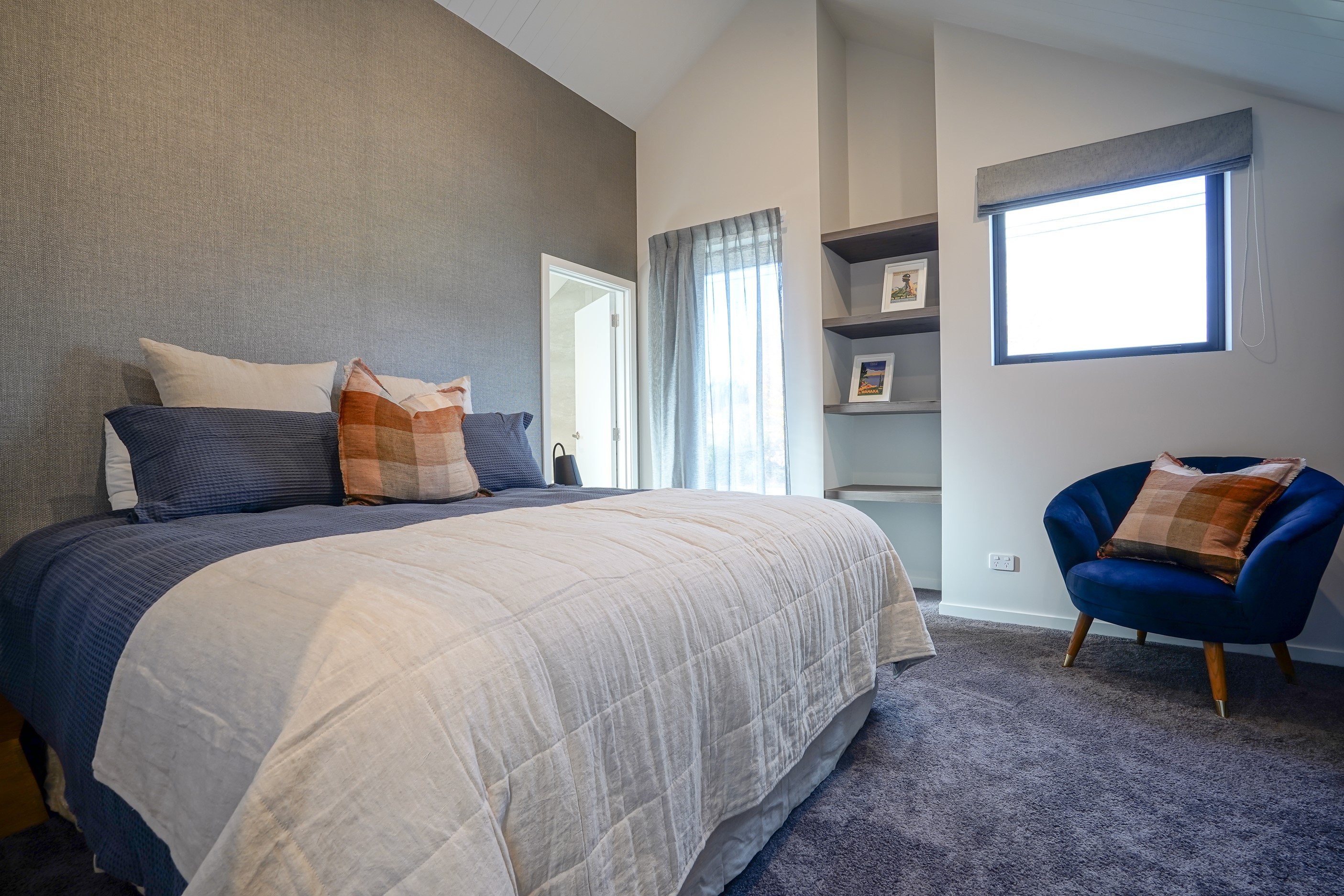 Think of apartments or duplex homes, and your mind doesn’t automatically spring to expansive living areas and multiple bedrooms with their own exquisitely tiled bathrooms. But these 300sqm mirror-image luxury homes have all the bells and whistles, and because of top-notch design, they also have space to burn. Architecturally designed and part of an upscale village, each is kitted out with butler’s pantry, open-plan living and dining area, internal-access garage, and the first of three bedrooms with their own ensuites on the ground floor. Upstairs are two more bedrooms, each with pitched ceilings and walk-in wardrobes, and a study. Yes, there’s plenty here in terms of space and must-haves, but there is also a focus on elegance and style. The exterior of the homes, in vertical timber and black steel, displays angles and recesses that require, time, skill and creativity. The same can be said of the interiors. Schist features pop in the downstairs living area, dark floor-to-ceiling timber balusters separate the entrance from the stairwell, and almost the entire lower-level can be opened up to a private courtyard. Which is precisely where you want to be on warm Central Otago summer evenings.