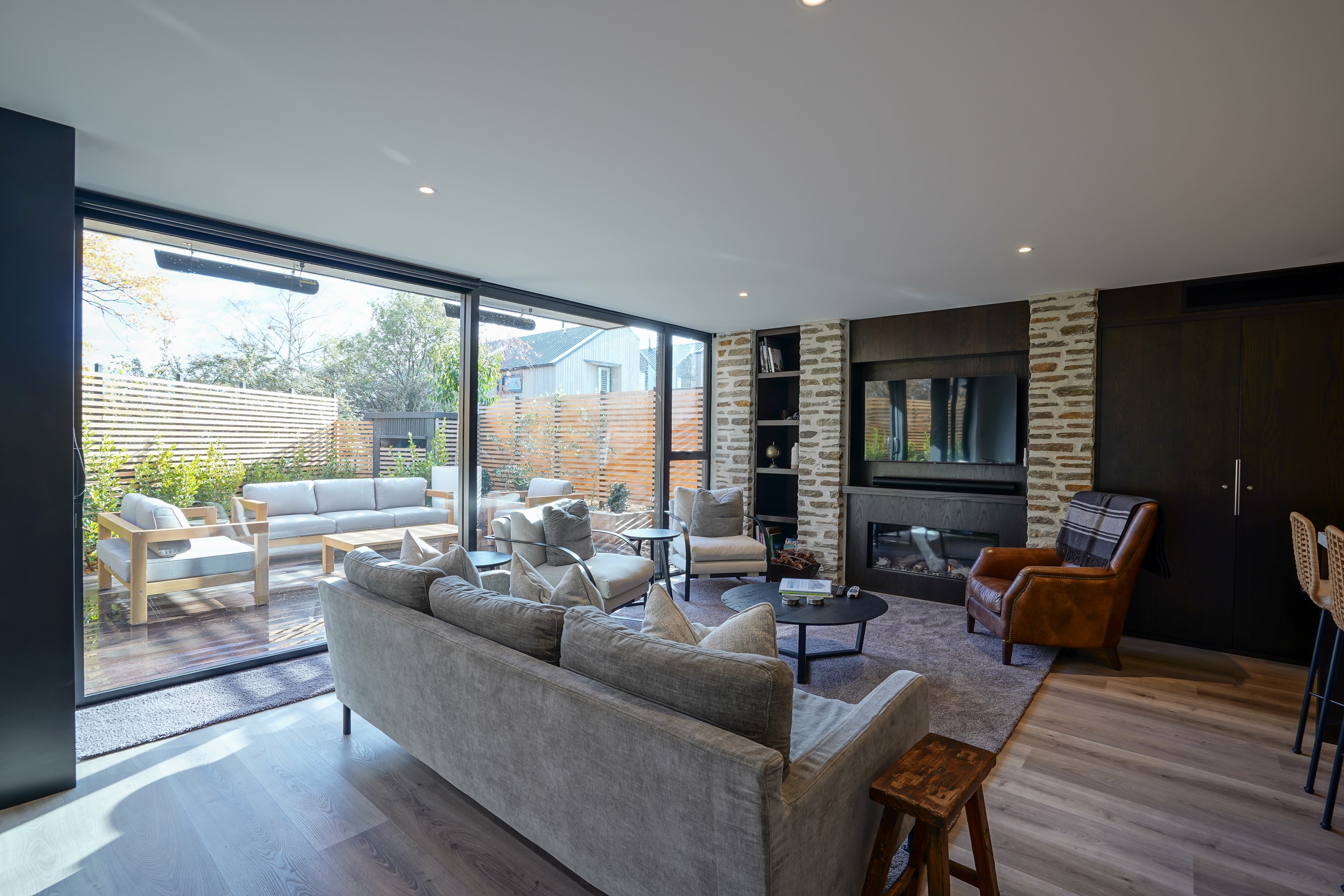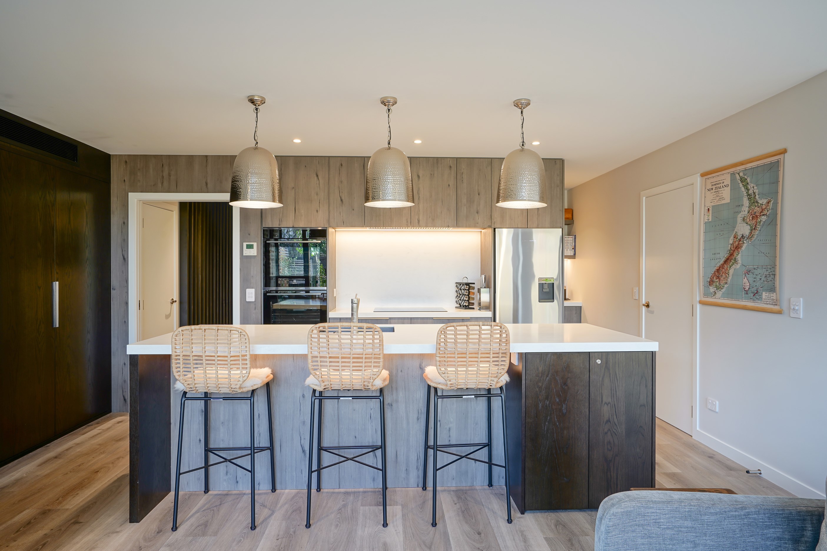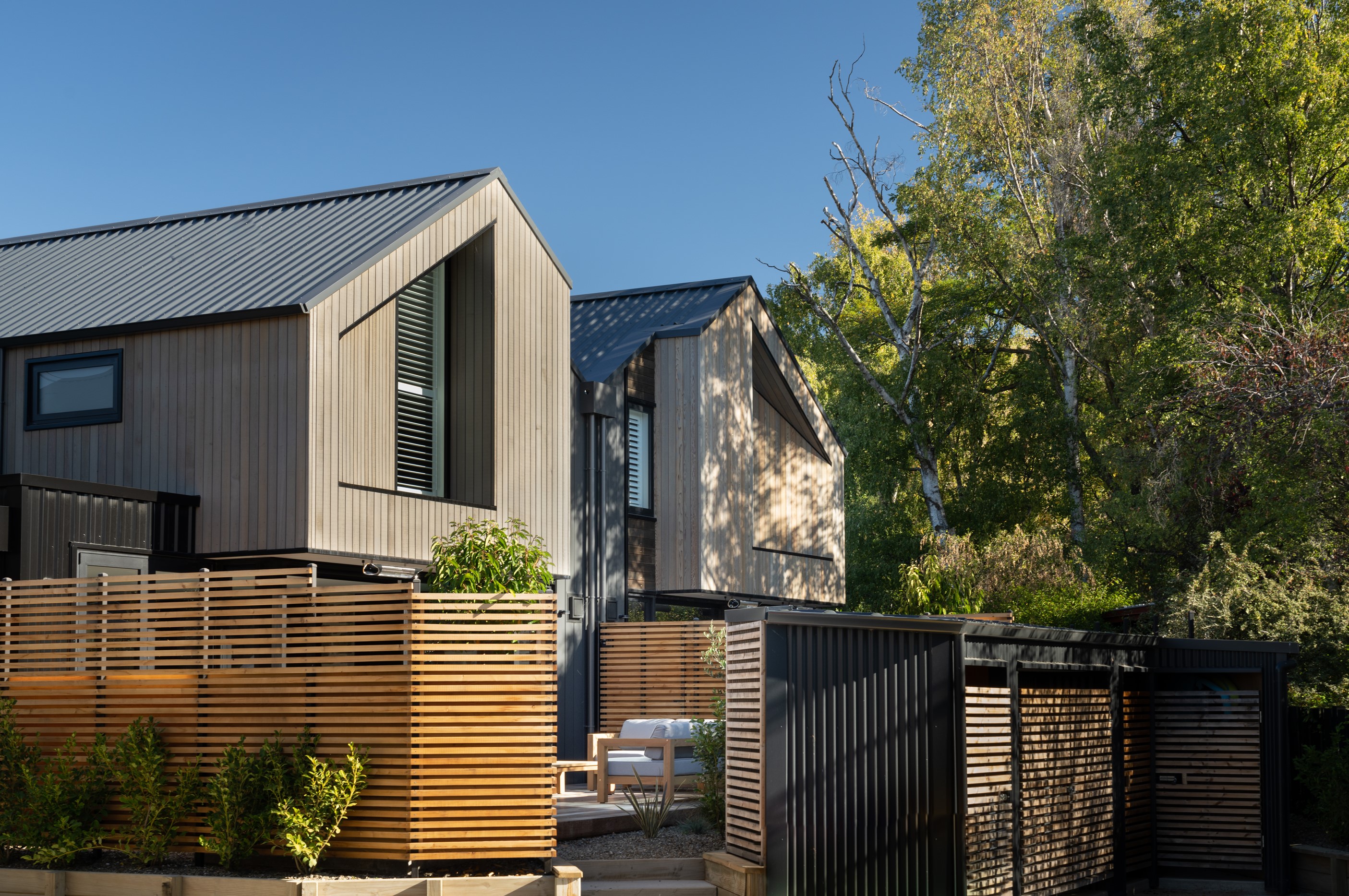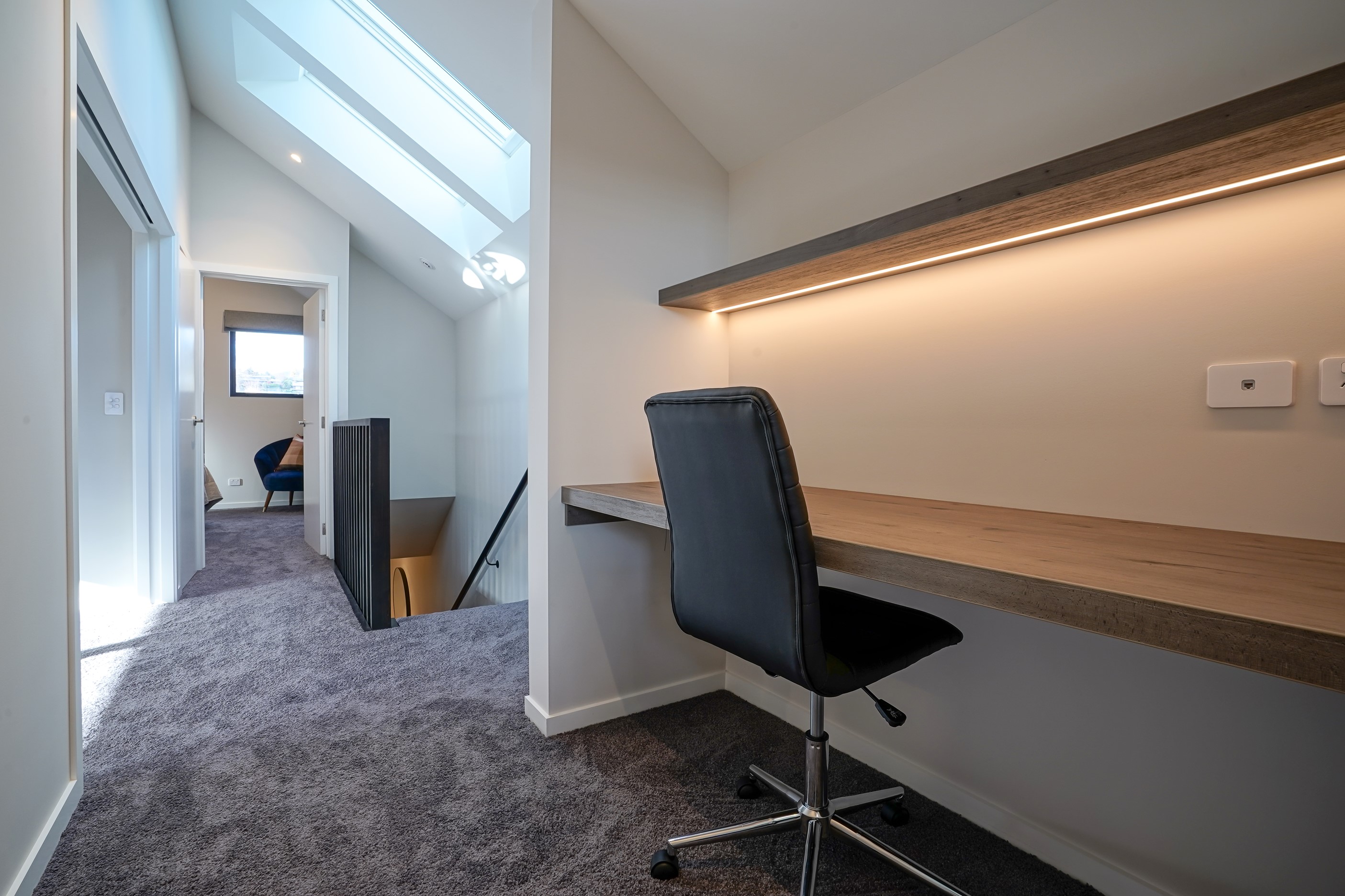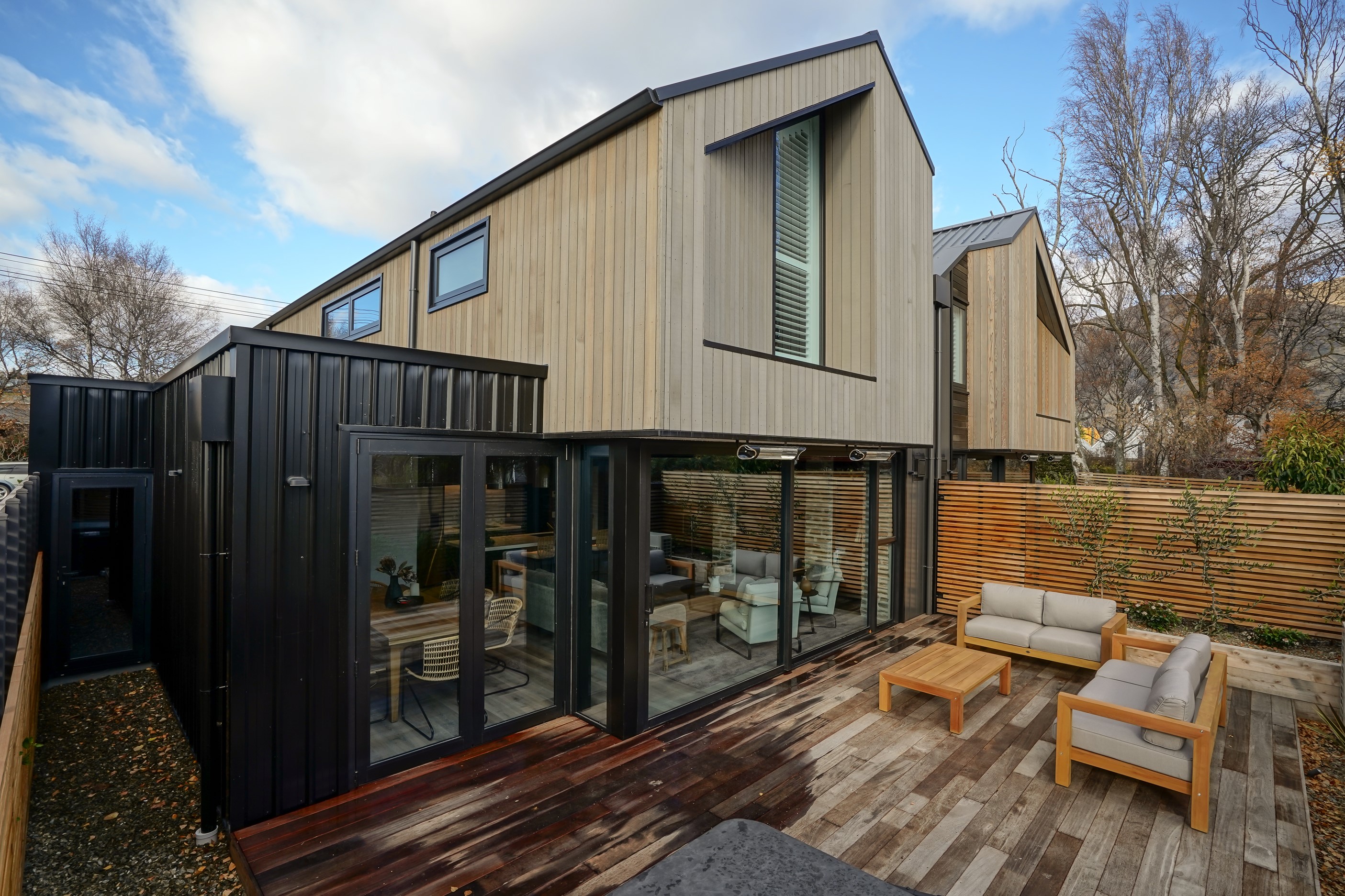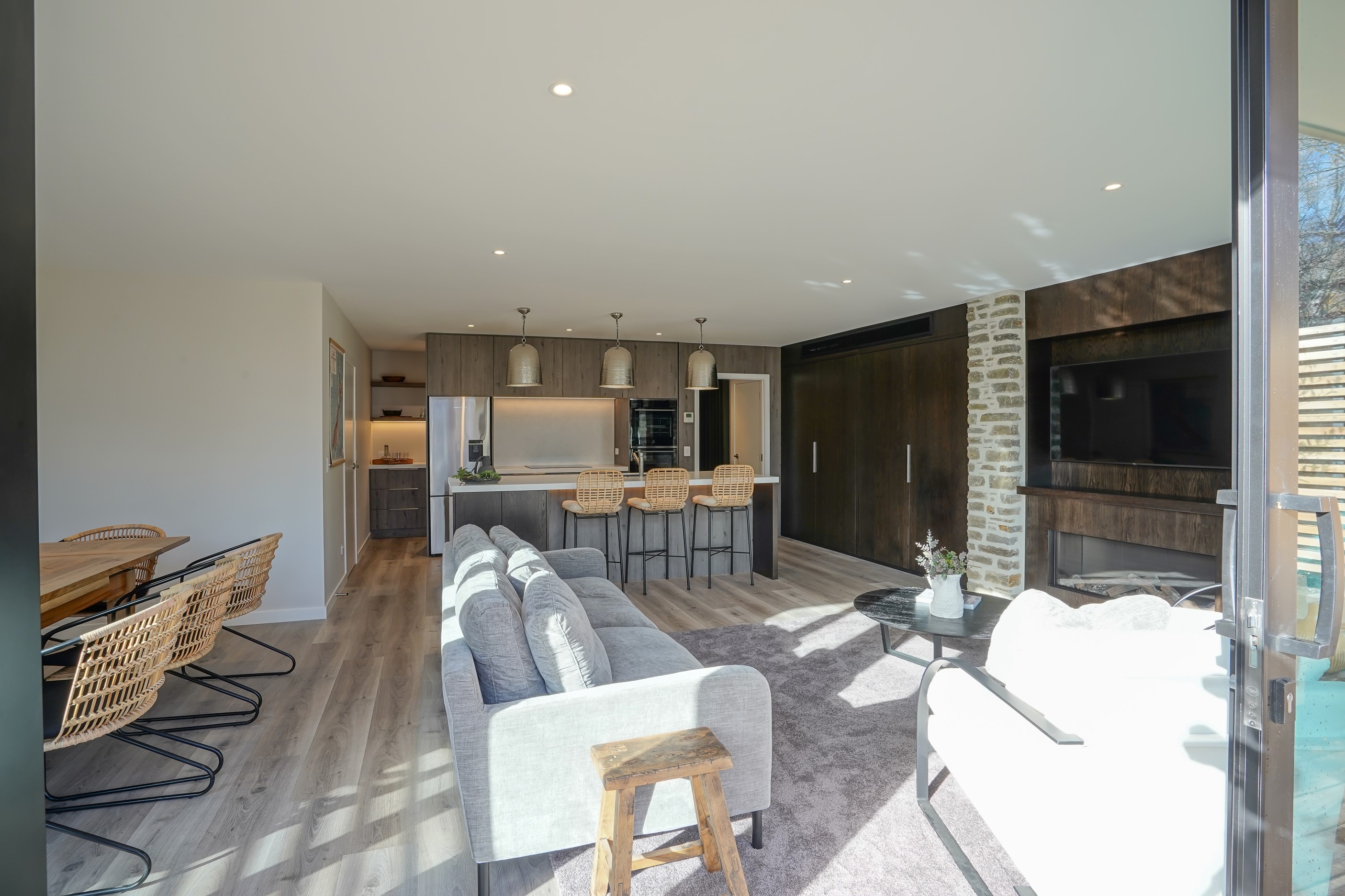 Think of apartments or duplex homes, and your mind doesn’t automatically spring to expansive living areas and multiple bedrooms with their own exquisitely tiled bathrooms. But these 300sqm mirror-image luxury homes have all the bells and whistles, and because of top-notch design, they also have space to burn. Architecturally designed and part of an upscale village, each is kitted out with butler’s pantry, open-plan living and dining area, internal-access garage, and the first of three bedrooms with their own ensuites on the ground floor. Upstairs are two more bedrooms, each with pitched ceilings and walk-in wardrobes, and a study. Yes, there’s plenty here in terms of space and must-haves, but there is also a focus on elegance and style. The exterior of the homes, in vertical timber and black steel, displays angles and recesses that require, time, skill and creativity. The same can be said of the interiors. Schist features pop in the downstairs living area, dark floor-to-ceiling timber balusters separate the entrance from the stairwell, and almost the entire lower-level can be opened up to a private courtyard. Which is precisely where you want to be on warm Central Otago summer evenings.