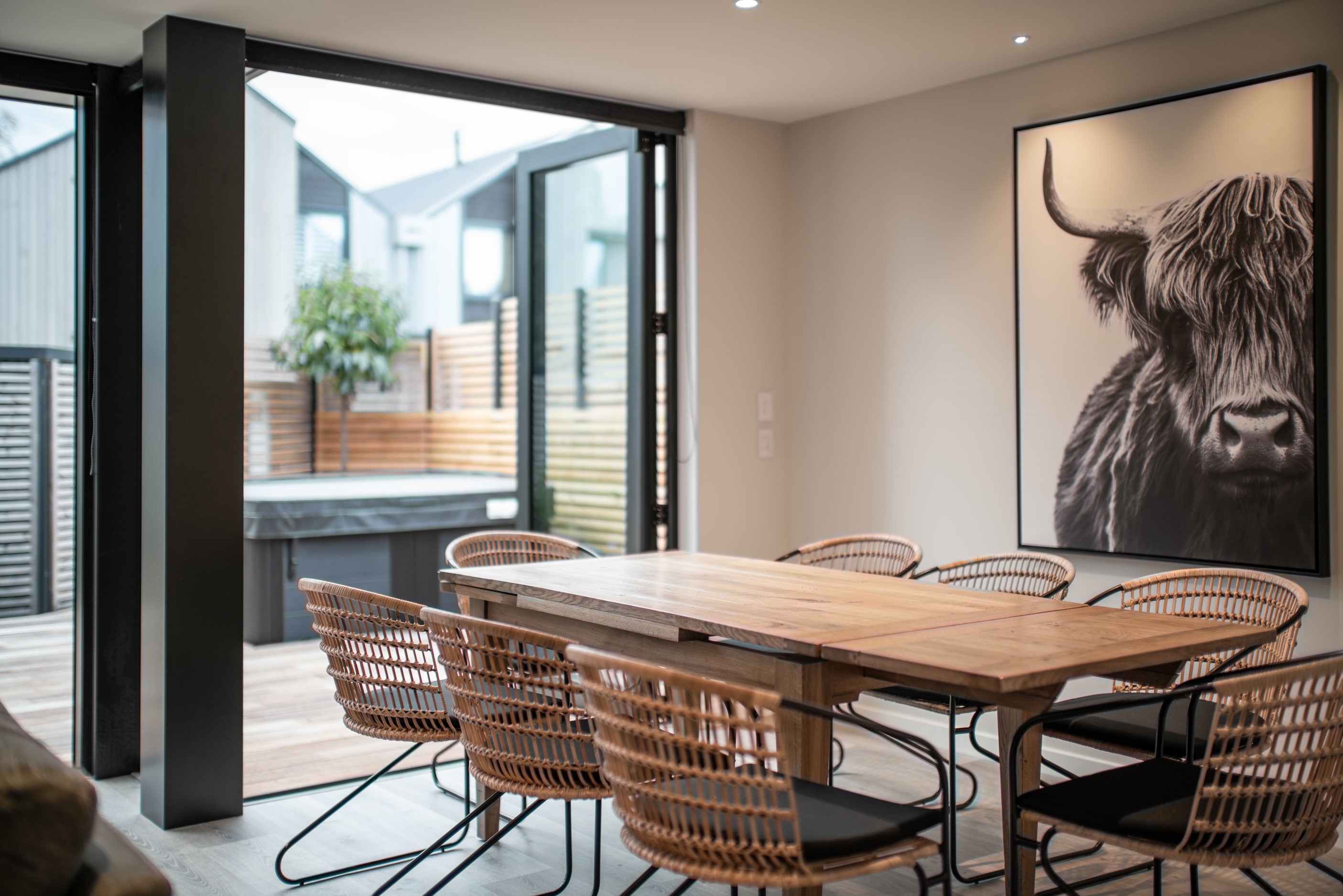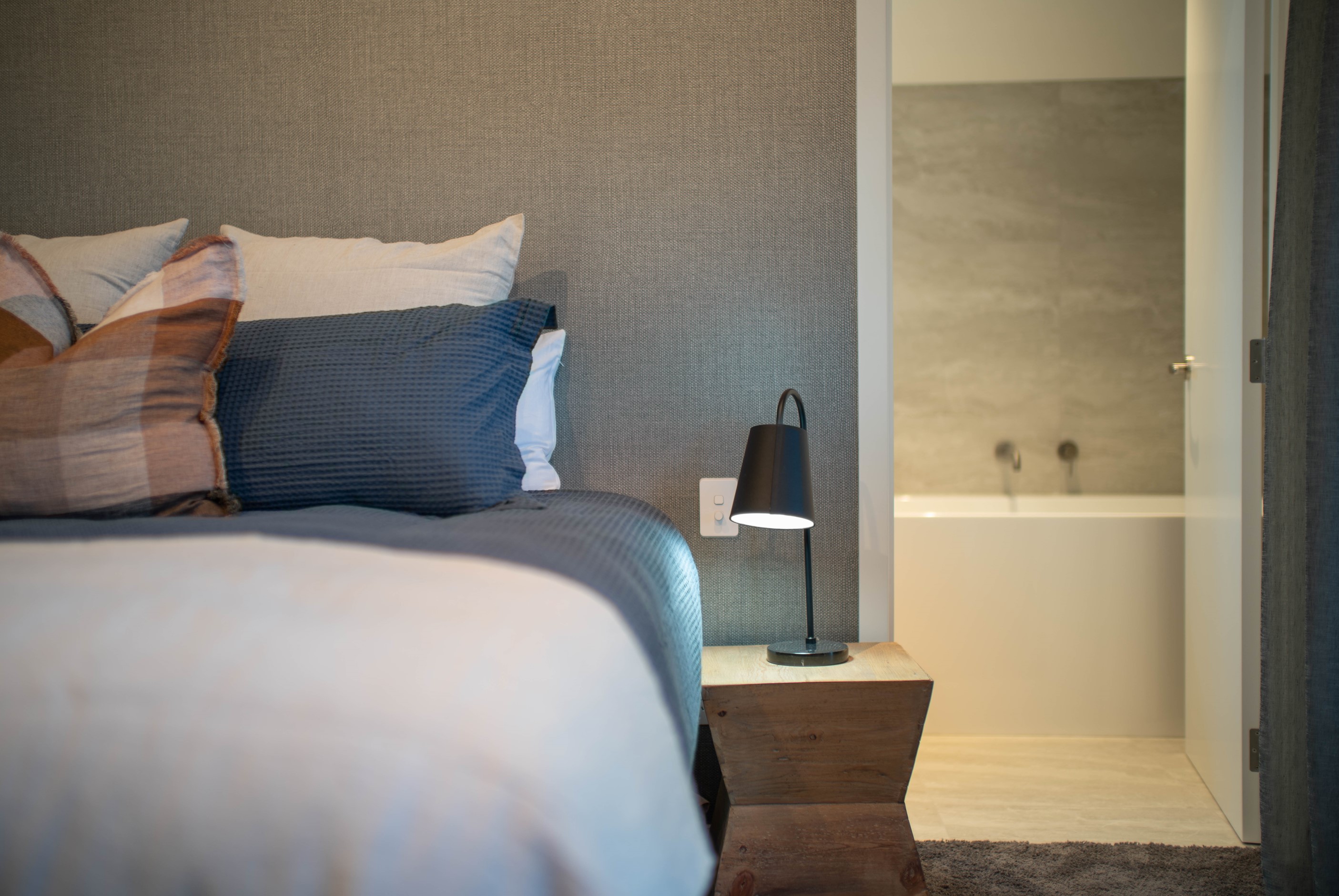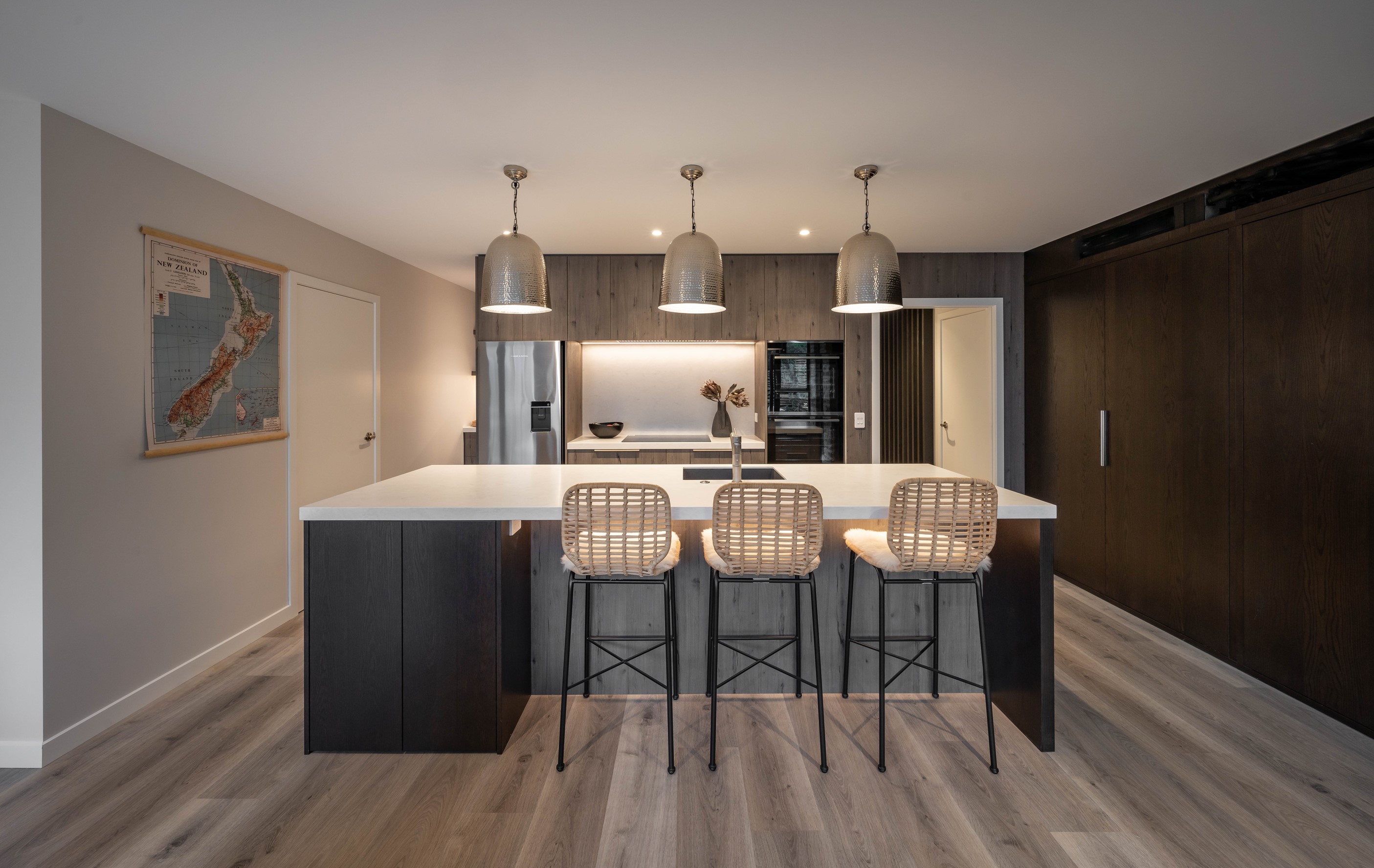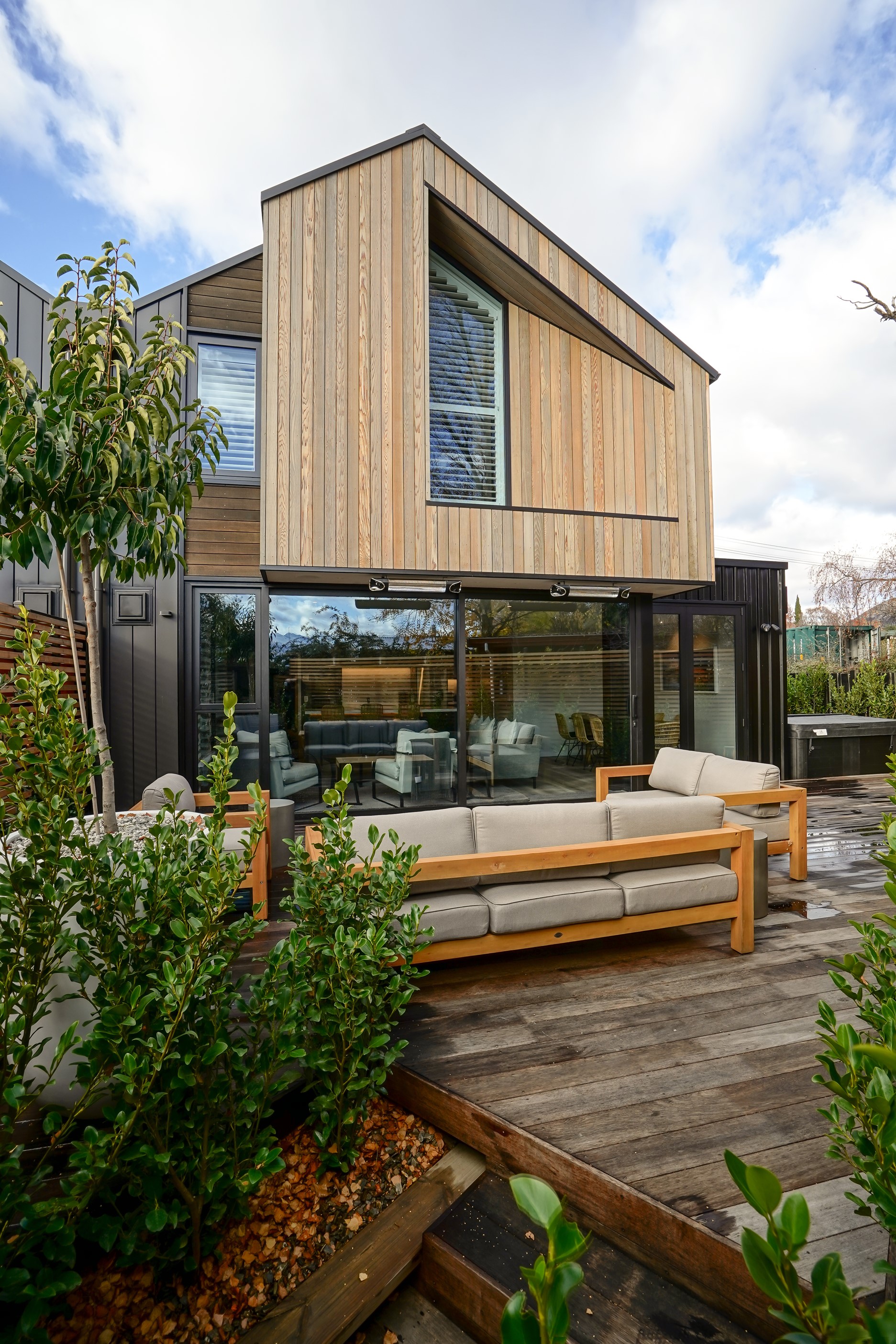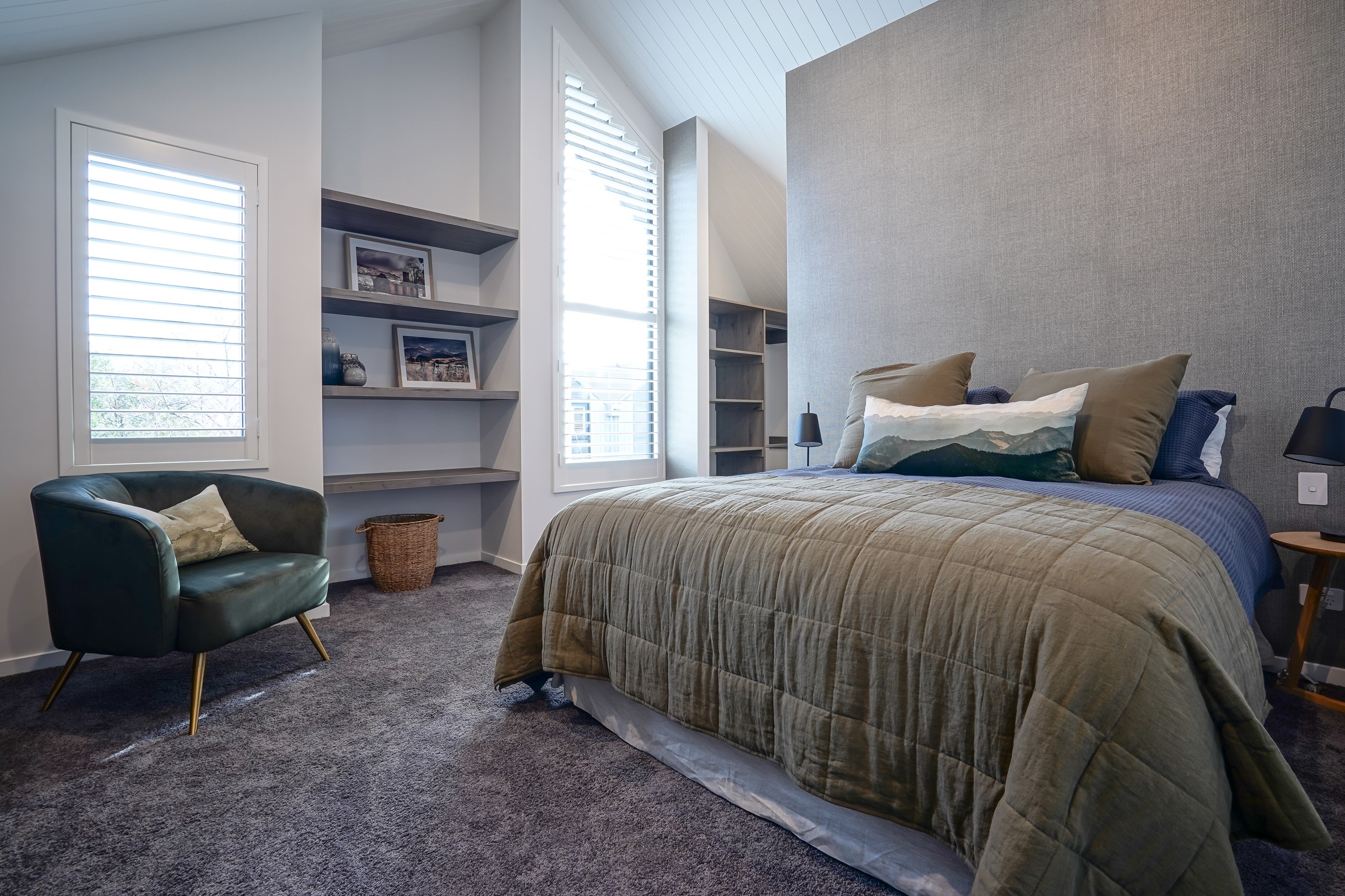 Think of apartments or duplex homes, and your mind doesn’t automatically spring to expansive living areas and multiple bedrooms with their own exquisitely tiled bathrooms. But these 300sqm mirror-image luxury homes have all the bells and whistles, and because of top-notch design, they also have space to burn. Architecturally designed and part of an upscale village, each is kitted out with butler’s pantry, open-plan living and dining area, internal-access garage, and the first of three bedrooms with their own ensuites on the ground floor. Upstairs are two more bedrooms, each with pitched ceilings and walk-in wardrobes, and a study. Yes, there’s plenty here in terms of space and must-haves, but there is also a focus on elegance and style. The exterior of the homes, in vertical timber and black steel, displays angles and recesses that require, time, skill and creativity. The same can be said of the interiors. Schist features pop in the downstairs living area, dark floor-to-ceiling timber balusters separate the entrance from the stairwell, and almost the entire lower-level can be opened up to a private courtyard. Which is precisely where you want to be on warm Central Otago summer evenings.