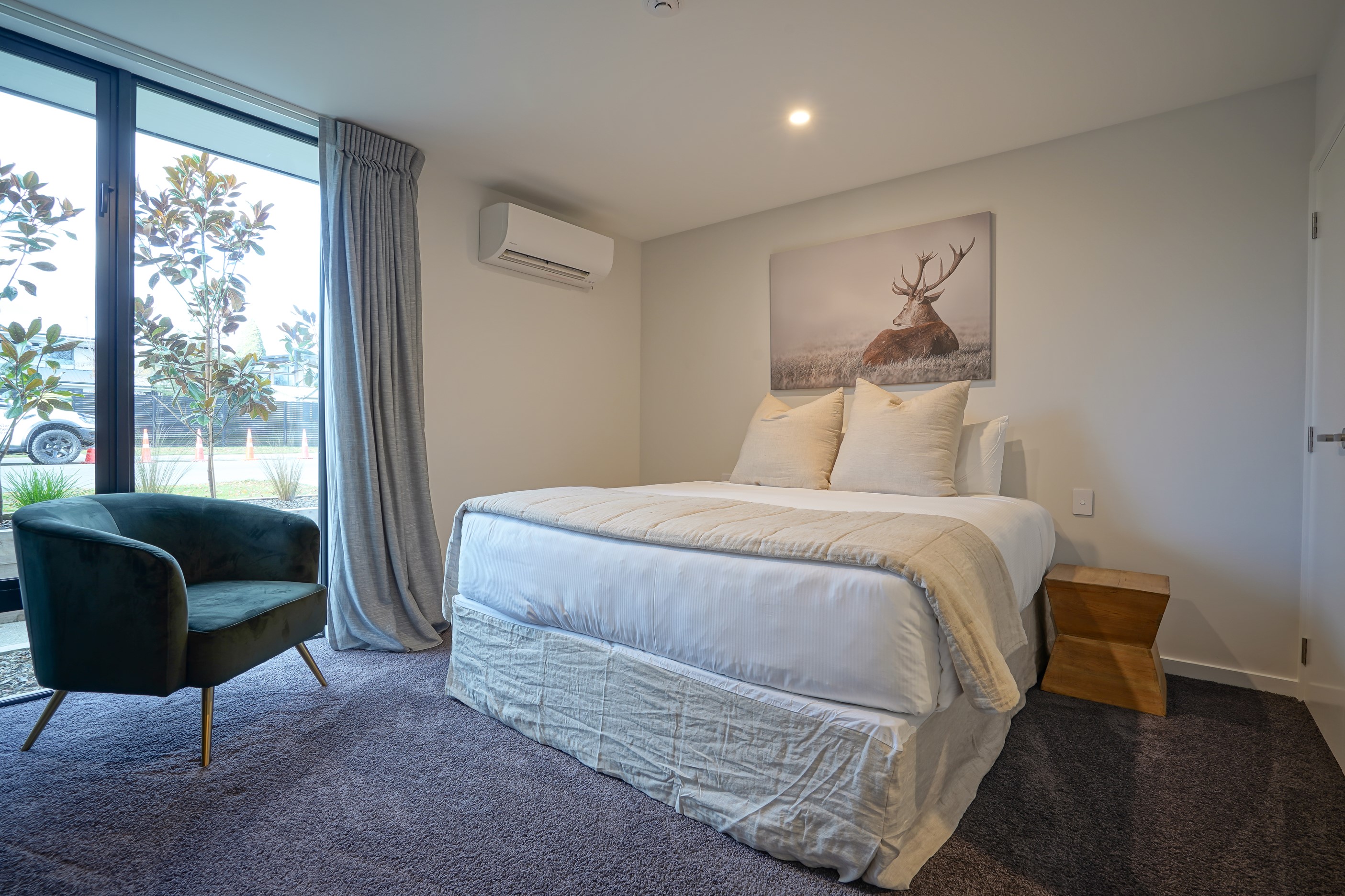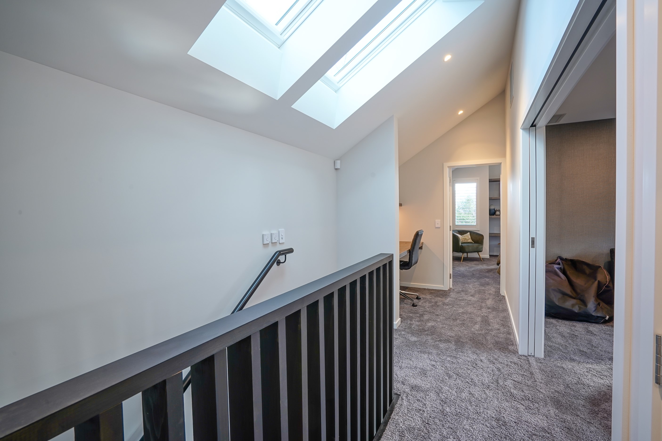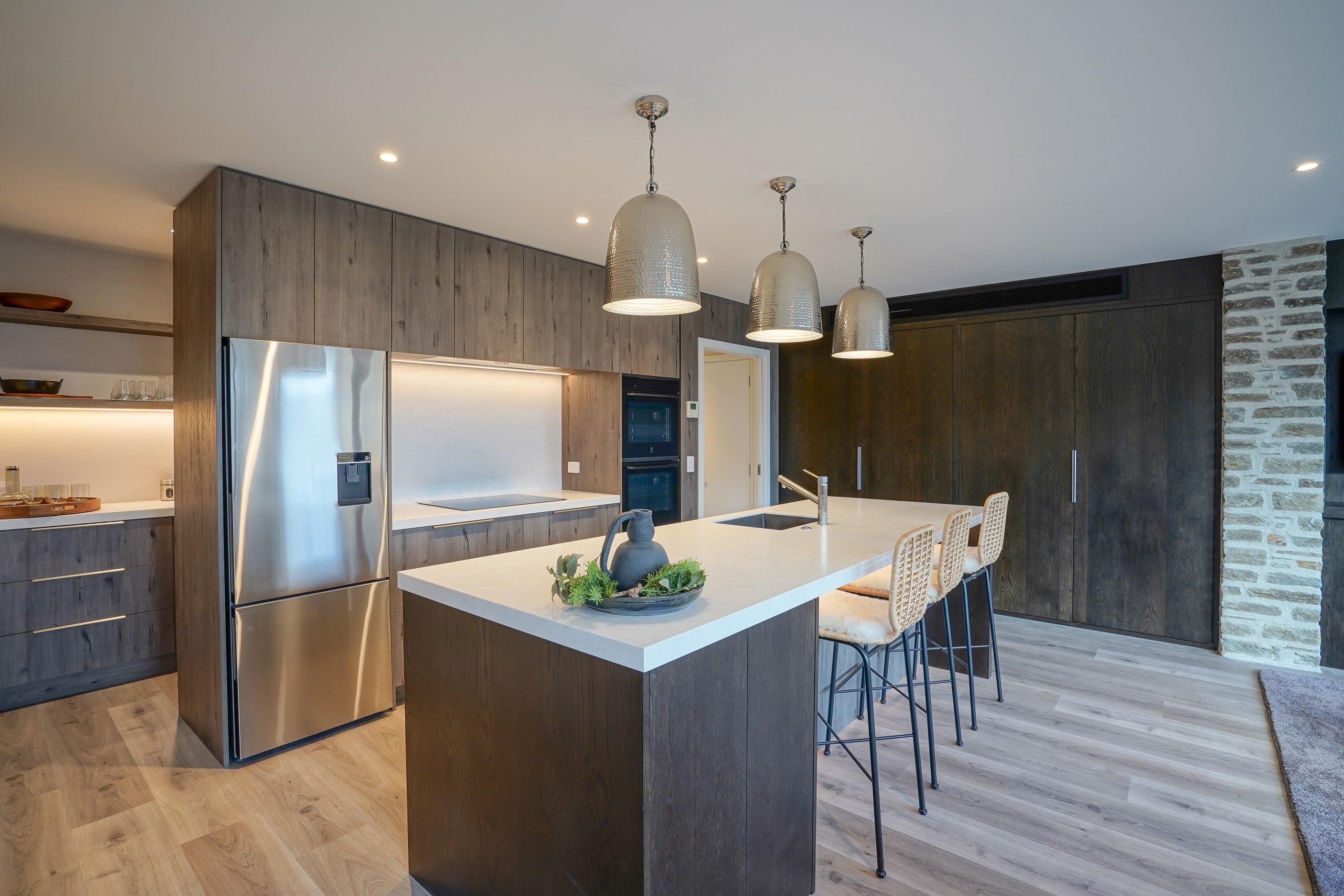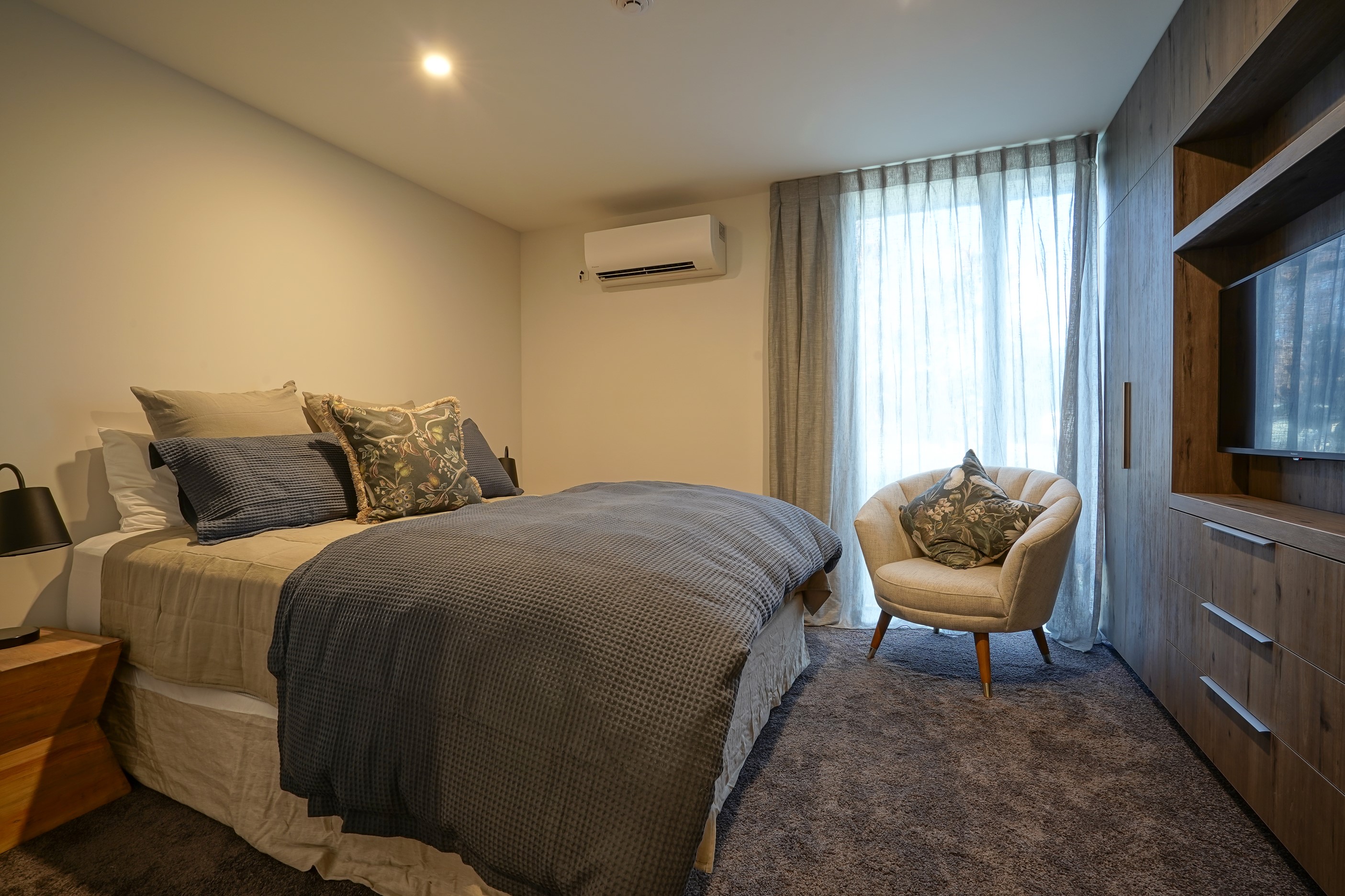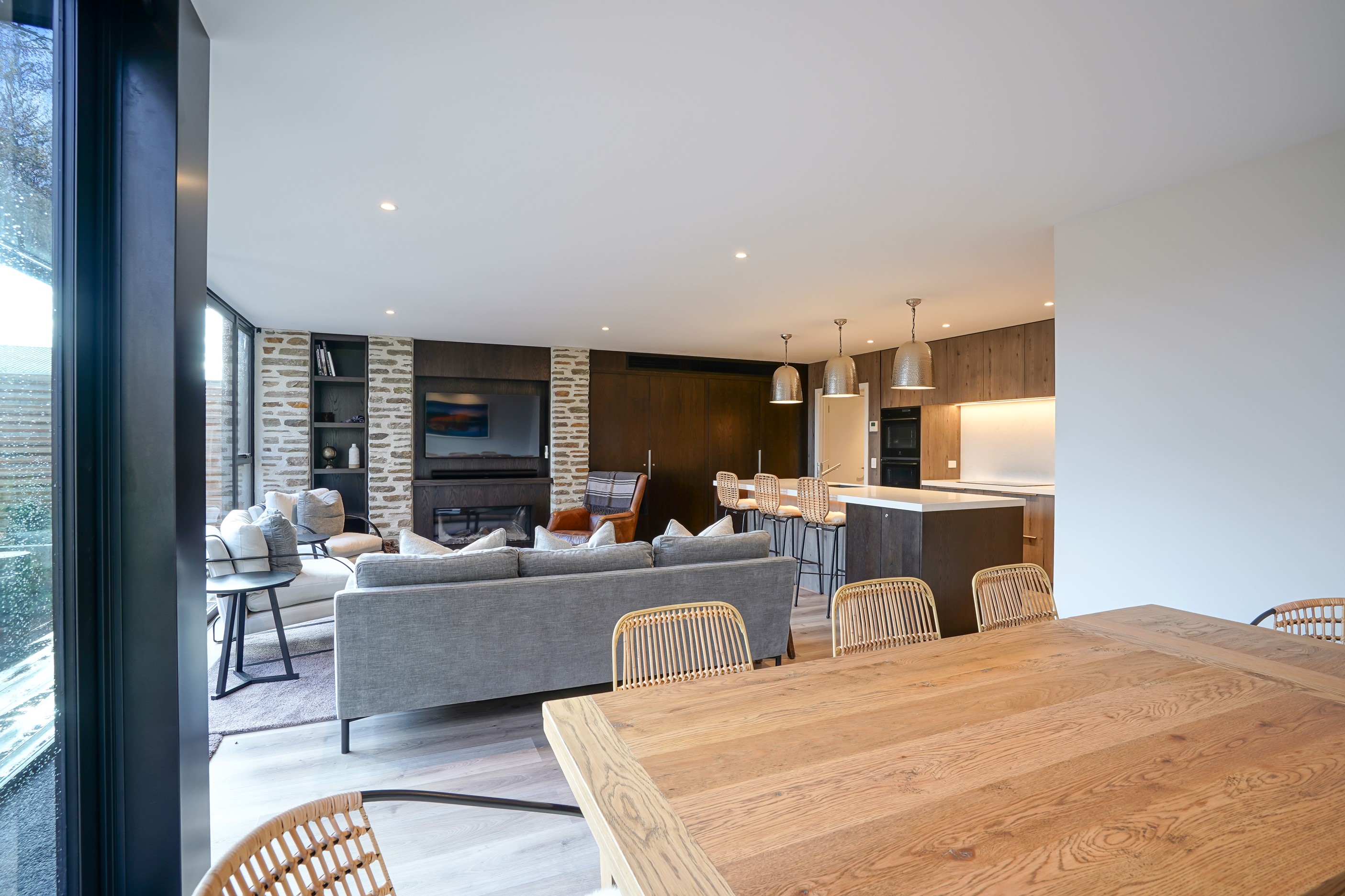 Think of apartments or duplex homes, and your mind doesn’t automatically spring to expansive living areas and multiple bedrooms with their own exquisitely tiled bathrooms. But these 300sqm mirror-image luxury homes have all the bells and whistles, and because of top-notch design, they also have space to burn. Architecturally designed and part of an upscale village, each is kitted out with butler’s pantry, open-plan living and dining area, internal-access garage, and the first of three bedrooms with their own ensuites on the ground floor. Upstairs are two more bedrooms, each with pitched ceilings and walk-in wardrobes, and a study. Yes, there’s plenty here in terms of space and must-haves, but there is also a focus on elegance and style. The exterior of the homes, in vertical timber and black steel, displays angles and recesses that require, time, skill and creativity. The same can be said of the interiors. Schist features pop in the downstairs living area, dark floor-to-ceiling timber balusters separate the entrance from the stairwell, and almost the entire lower-level can be opened up to a private courtyard. Which is precisely where you want to be on warm Central Otago summer evenings.