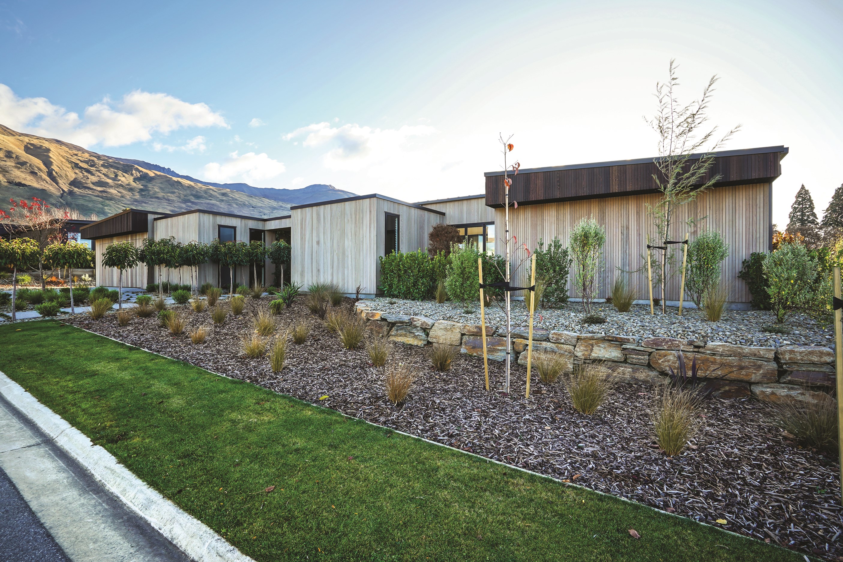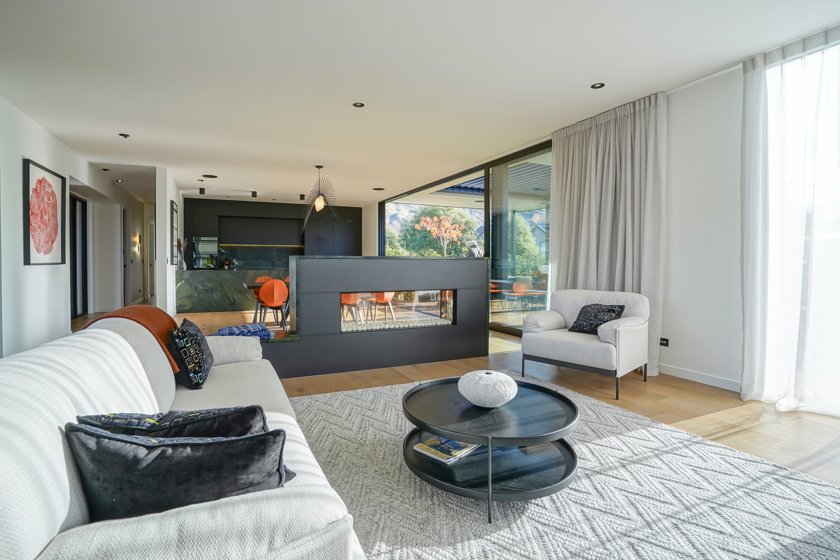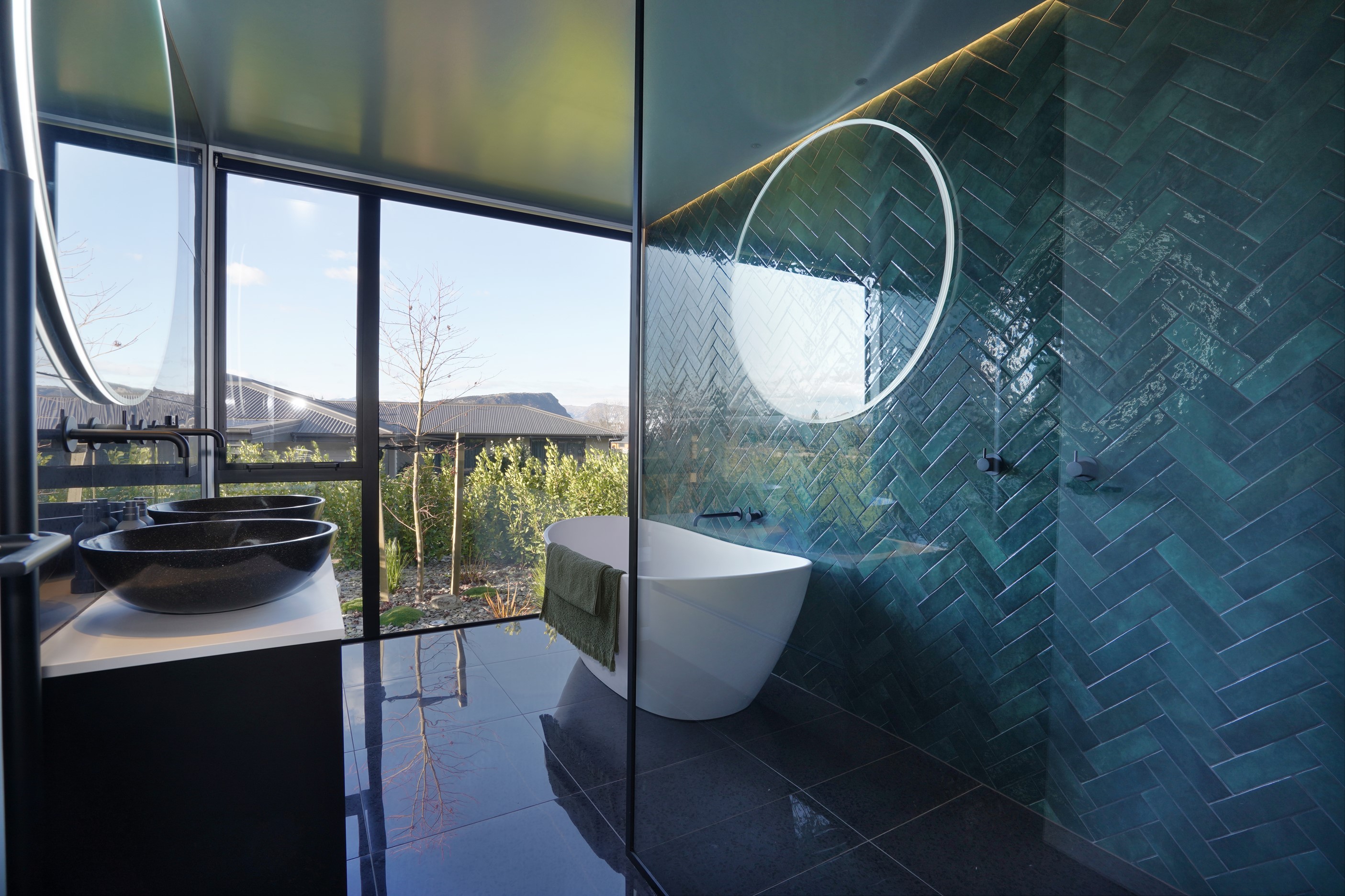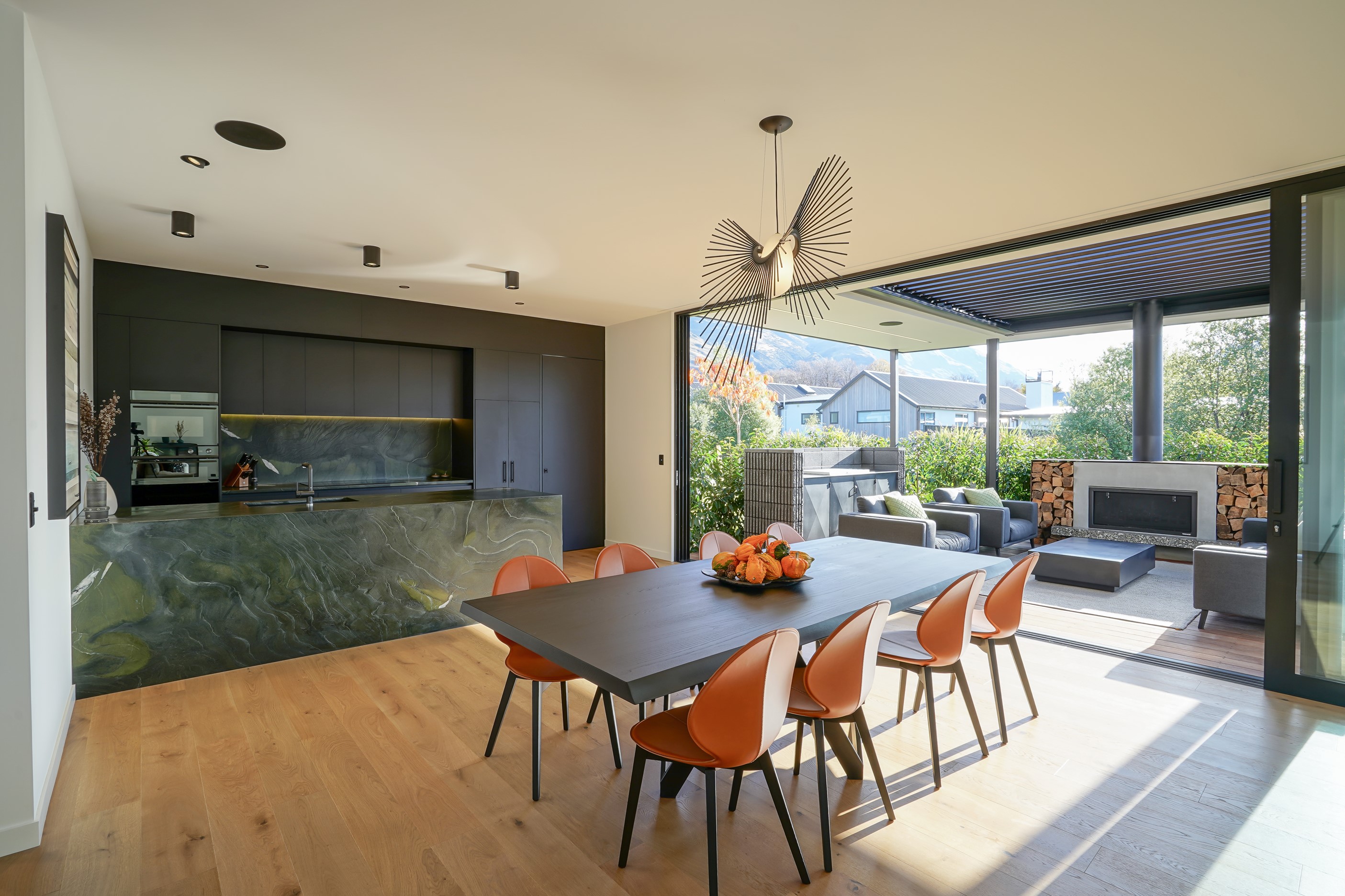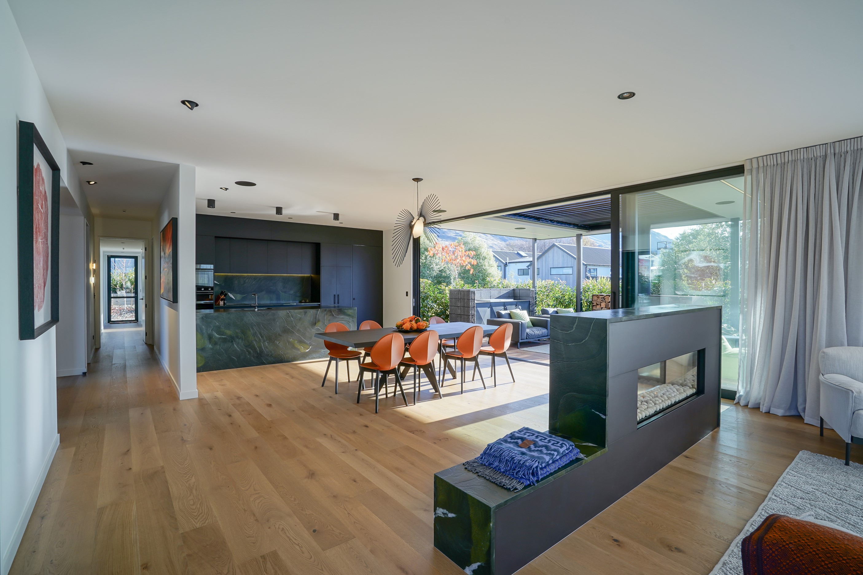 Prepare to be surprised when you open this perfectly wrapped present. The 240sqm three-bedroom home is clad in cedar, its tawny shades reflecting the Central Otago tussock, rock and mountains. It beautifully fulfils its architectural objectives of balance and earthiness. Step inside and you’re greeted by an aesthetic that’s minimalist, slick and eye-catching. Sheer presence. Two wings spread out from the central entrance in this home that’s inspired by nature. Thoughtfully designed elements catch the eye at every turn – in the pared-back kitchen, for instance, you’ll see marble on the waterfall-edge island and splashback. Head into the scullery and you’ll find intense green herringbone tiles contrasting with black. A bespoke pendant light hovers over the dining table. The three bathrooms are a study in nature-inspired greens, with tiles in varying shades and shapes. A feature wall in the powder room has delicate waves of clay and cerulean hues. The main living-dining space is separated by a standalone double-sided fire, with its flue directed through the flooring slab for warmth. Timber floorboards lead to a spacious media room on one side and an outdoor room with a woodfire on the other. Perfection.