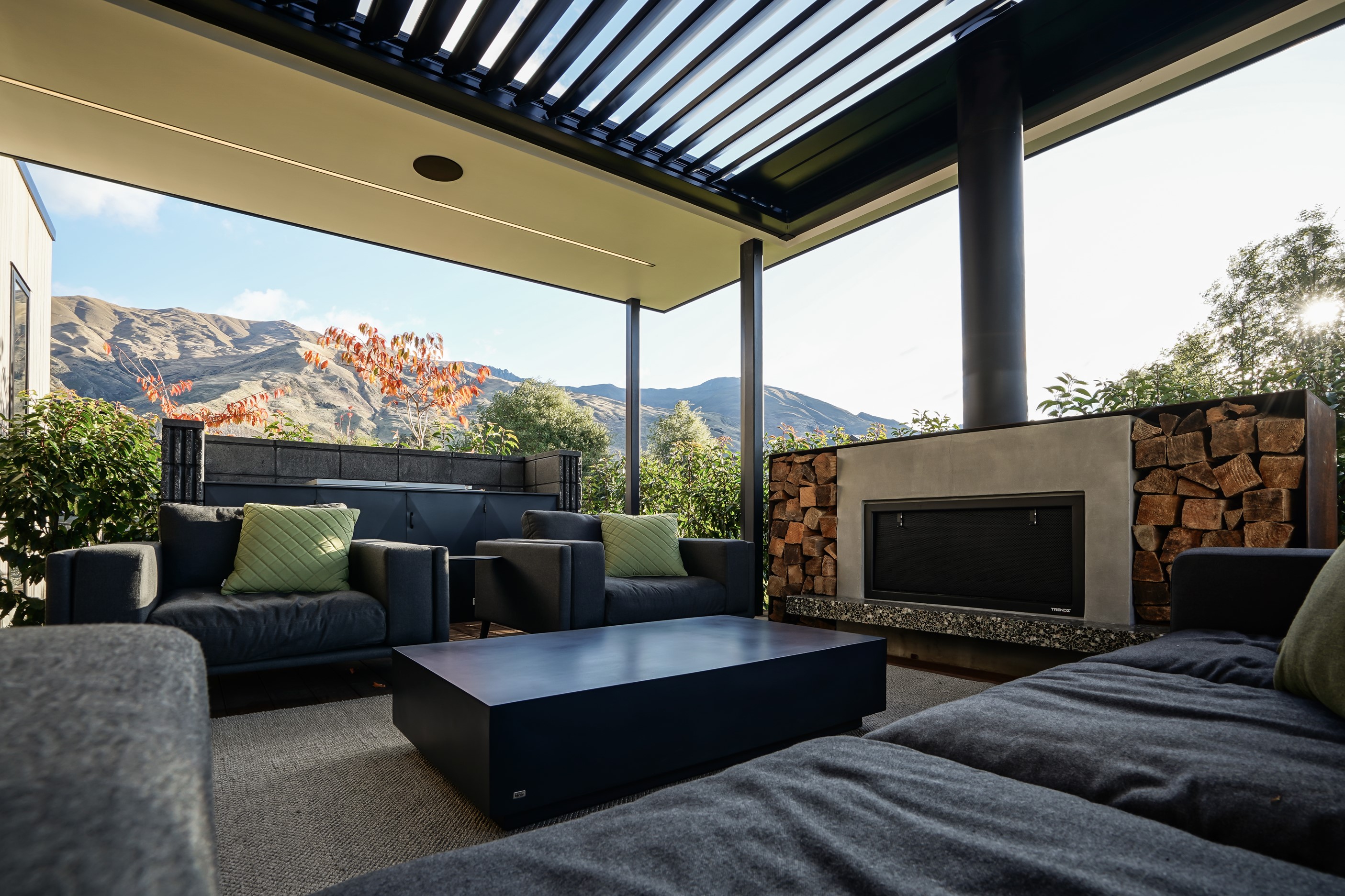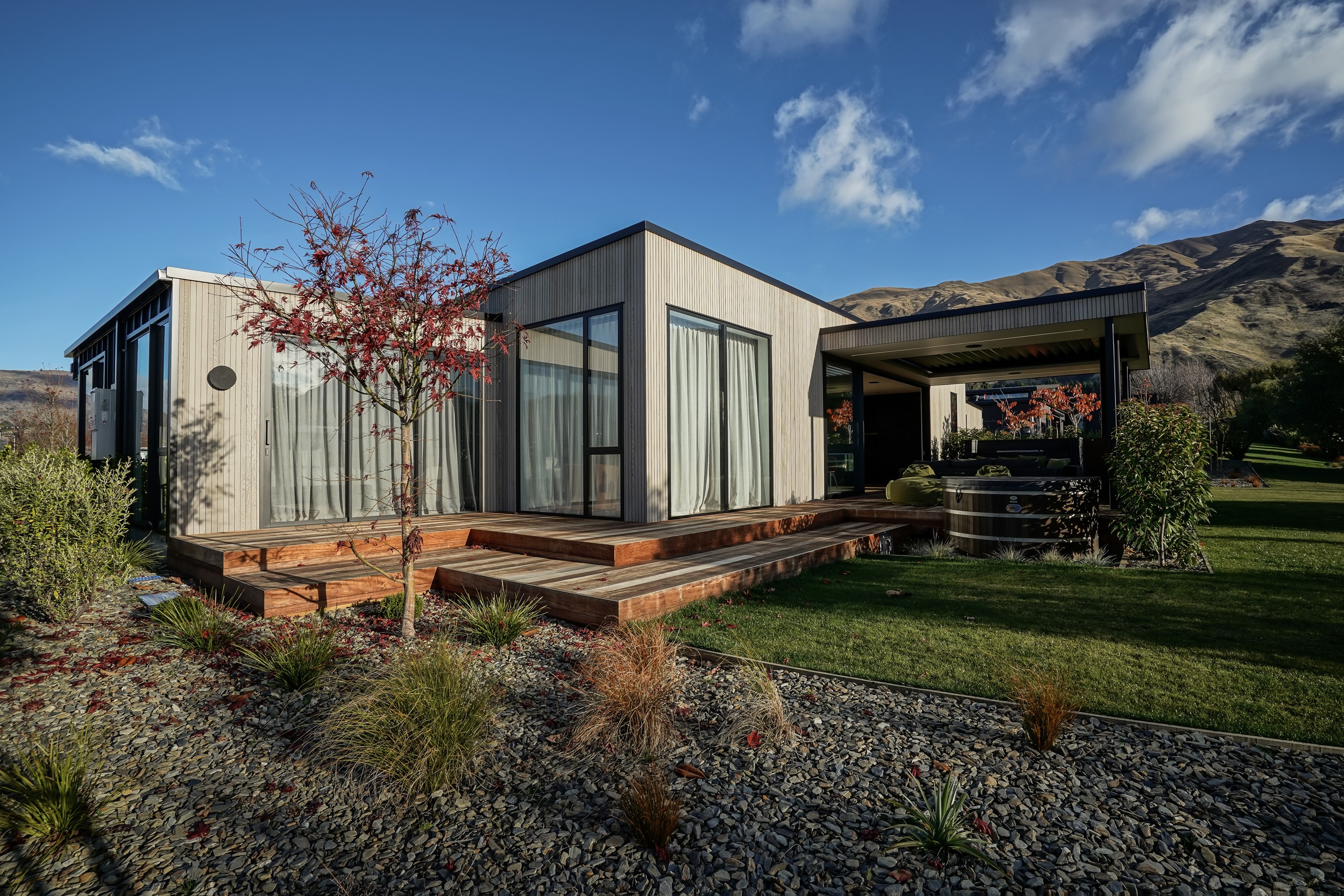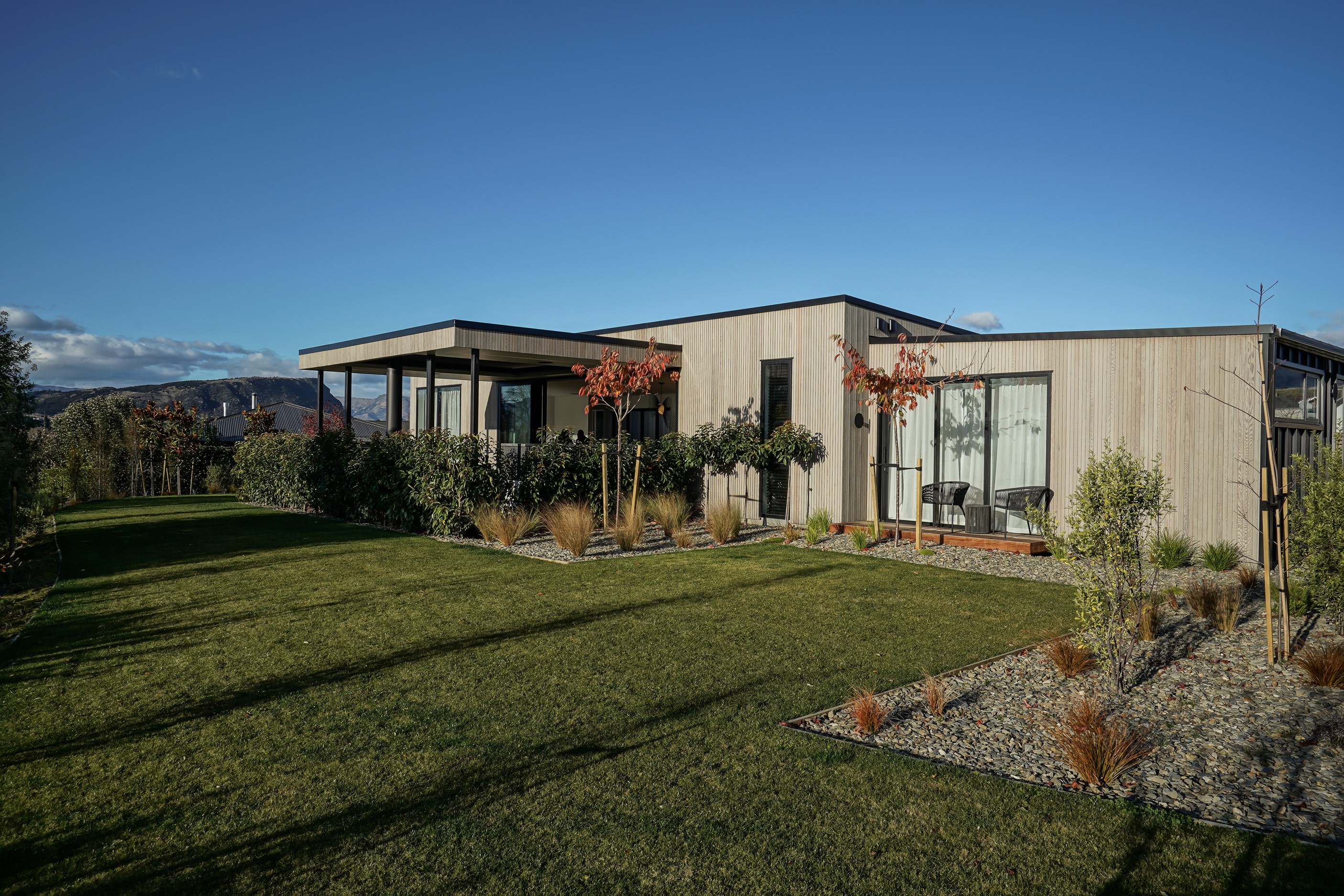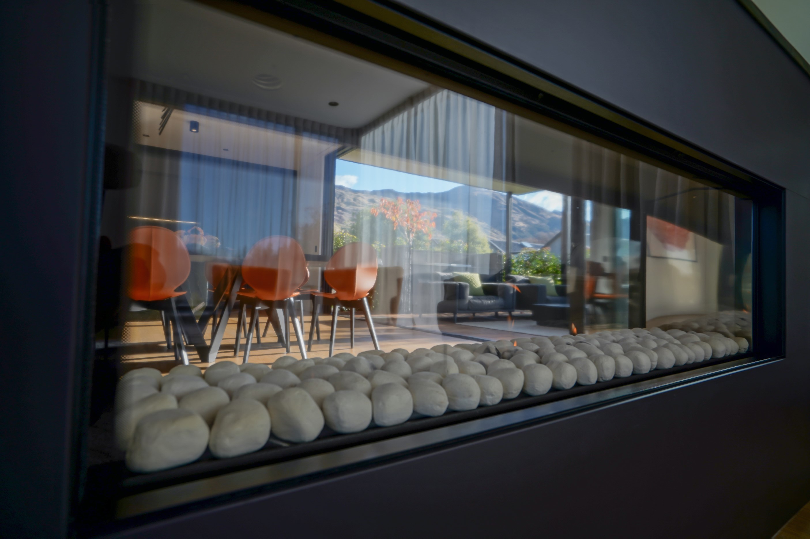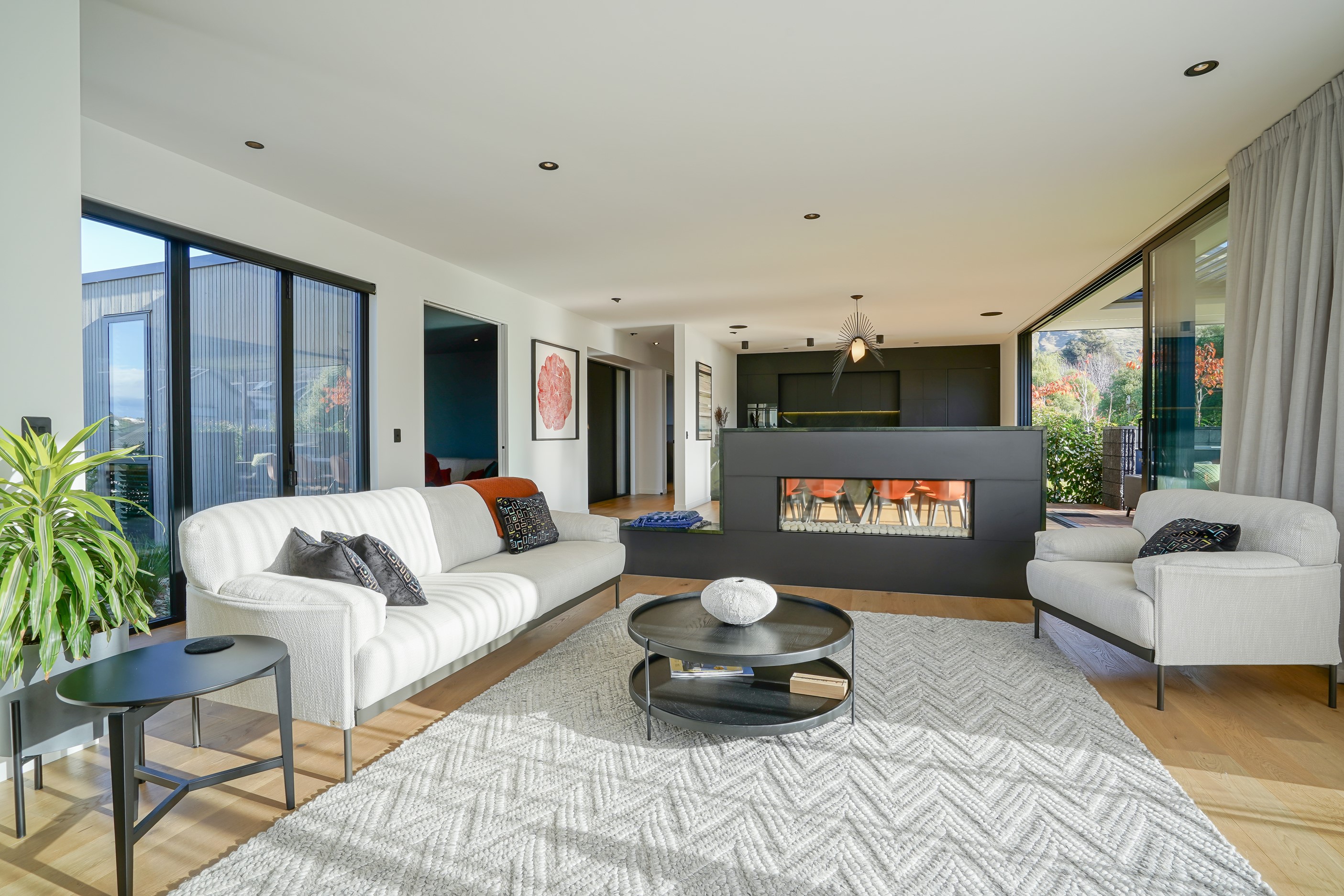 Prepare to be surprised when you open this perfectly wrapped present. The 240sqm three-bedroom home is clad in cedar, its tawny shades reflecting the Central Otago tussock, rock and mountains. It beautifully fulfils its architectural objectives of balance and earthiness. Step inside and you’re greeted by an aesthetic that’s minimalist, slick and eye-catching. Sheer presence. Two wings spread out from the central entrance in this home that’s inspired by nature. Thoughtfully designed elements catch the eye at every turn – in the pared-back kitchen, for instance, you’ll see marble on the waterfall-edge island and splashback. Head into the scullery and you’ll find intense green herringbone tiles contrasting with black. A bespoke pendant light hovers over the dining table. The three bathrooms are a study in nature-inspired greens, with tiles in varying shades and shapes. A feature wall in the powder room has delicate waves of clay and cerulean hues. The main living-dining space is separated by a standalone double-sided fire, with its flue directed through the flooring slab for warmth. Timber floorboards lead to a spacious media room on one side and an outdoor room with a woodfire on the other. Perfection.