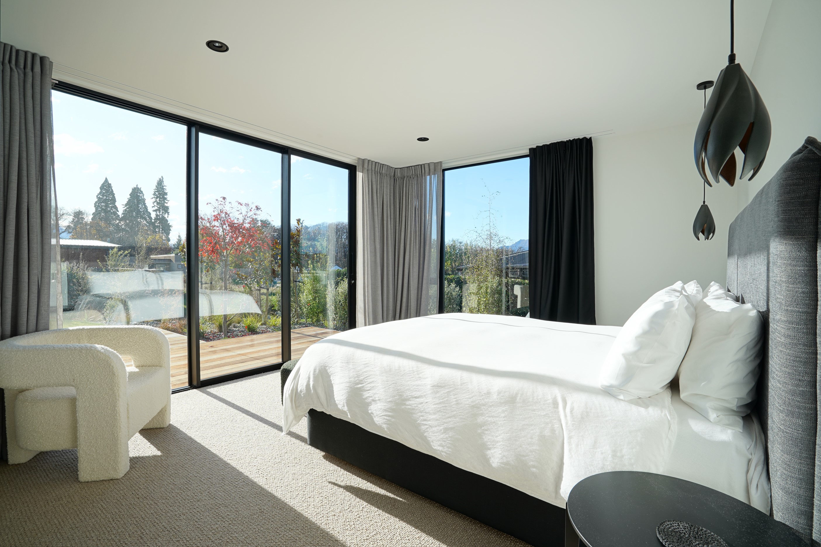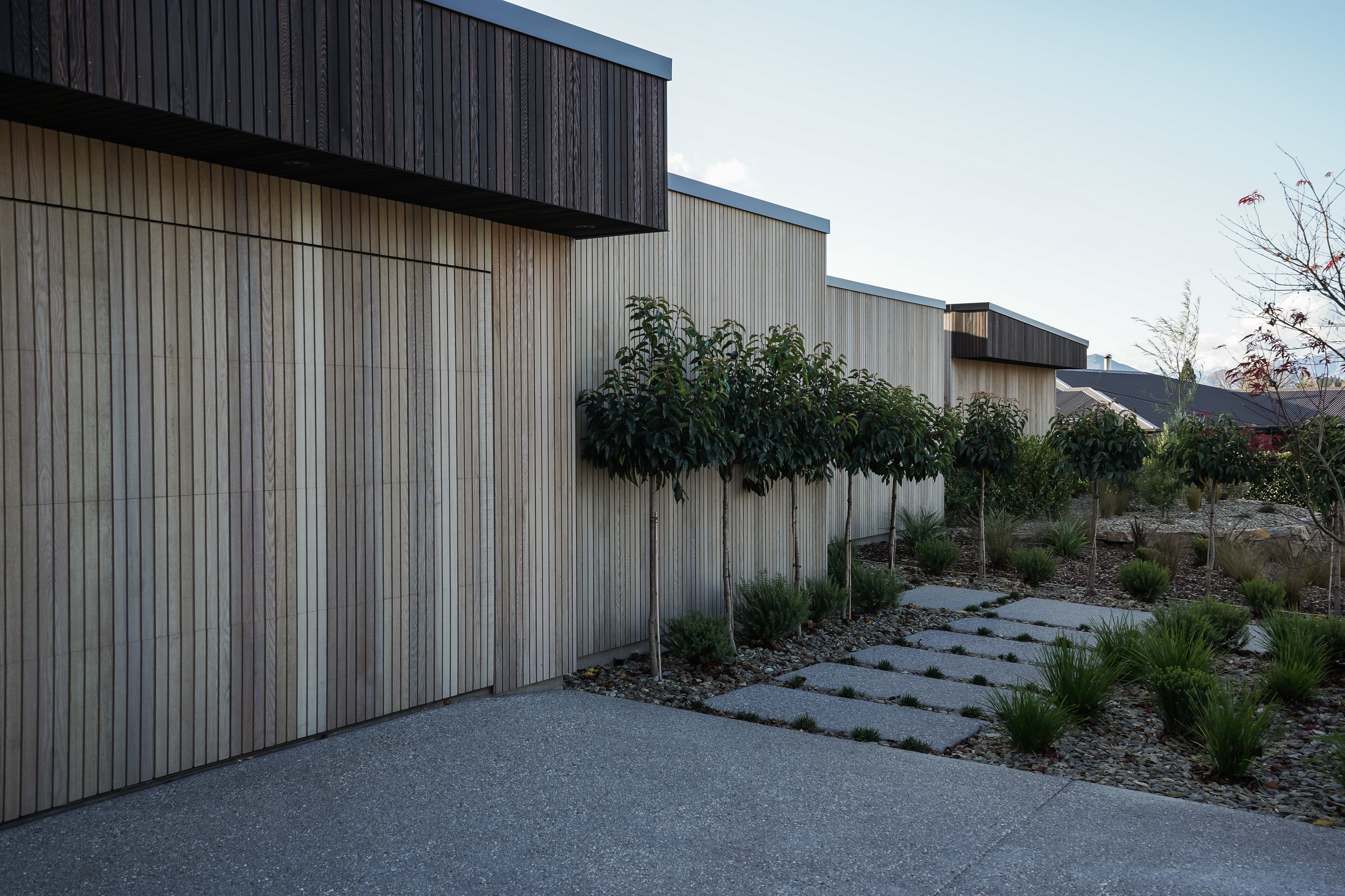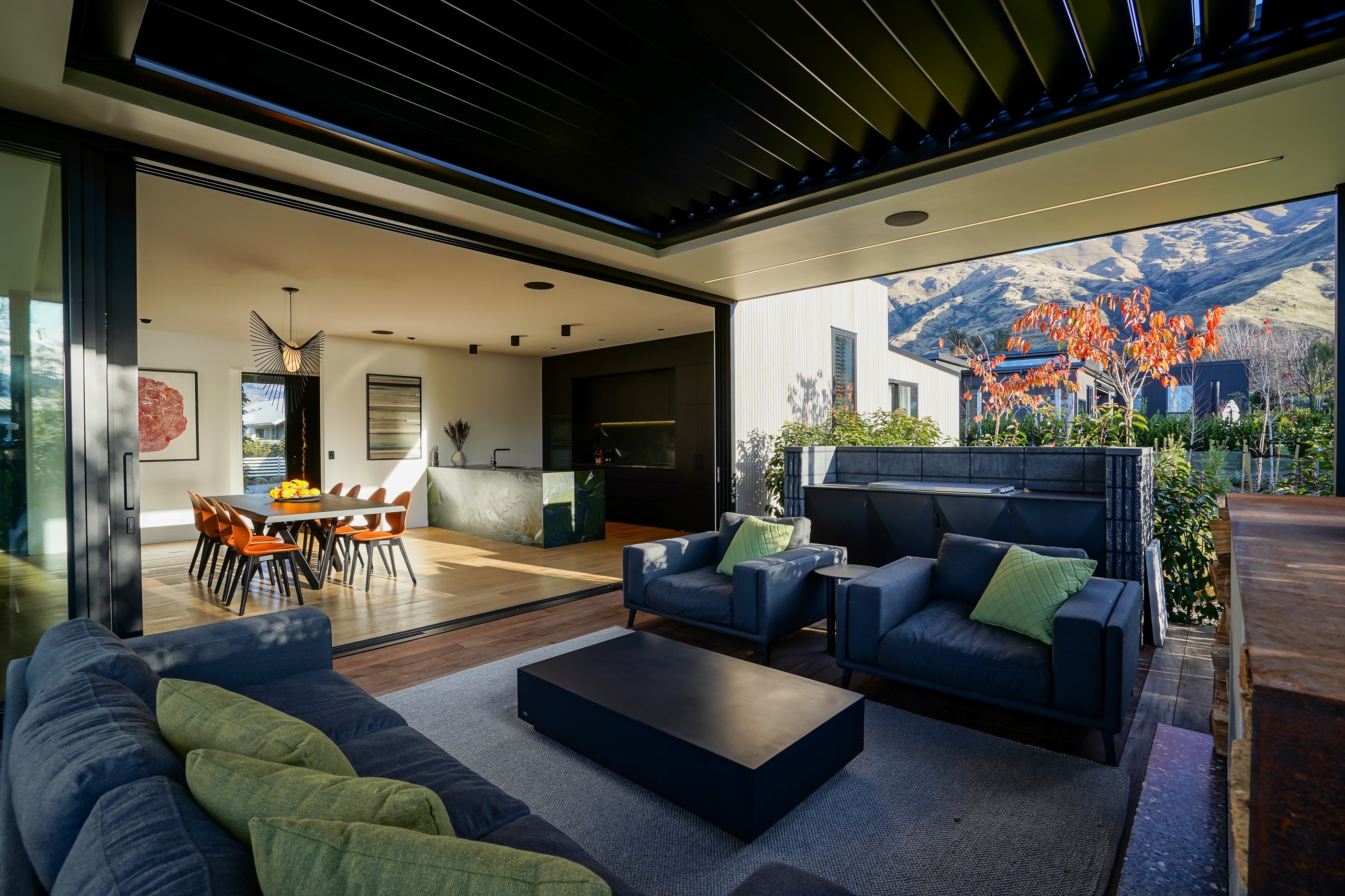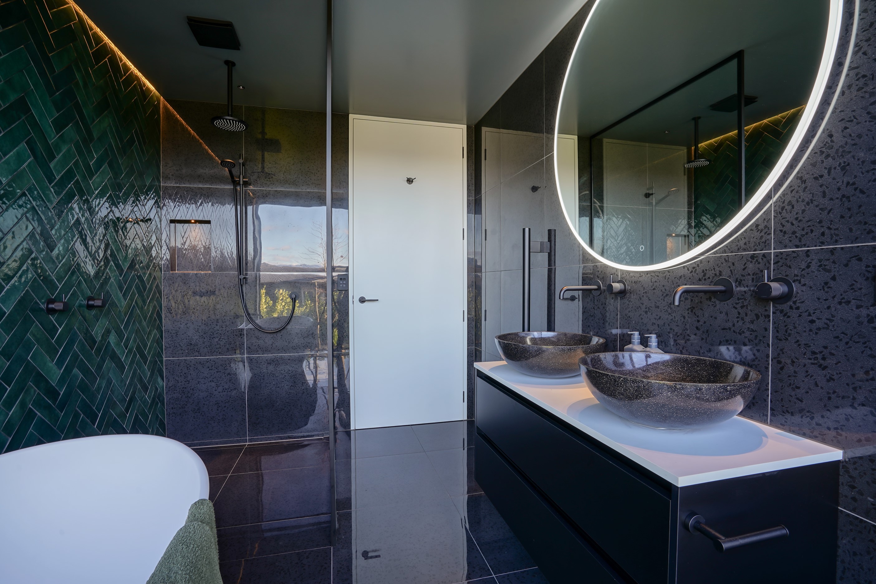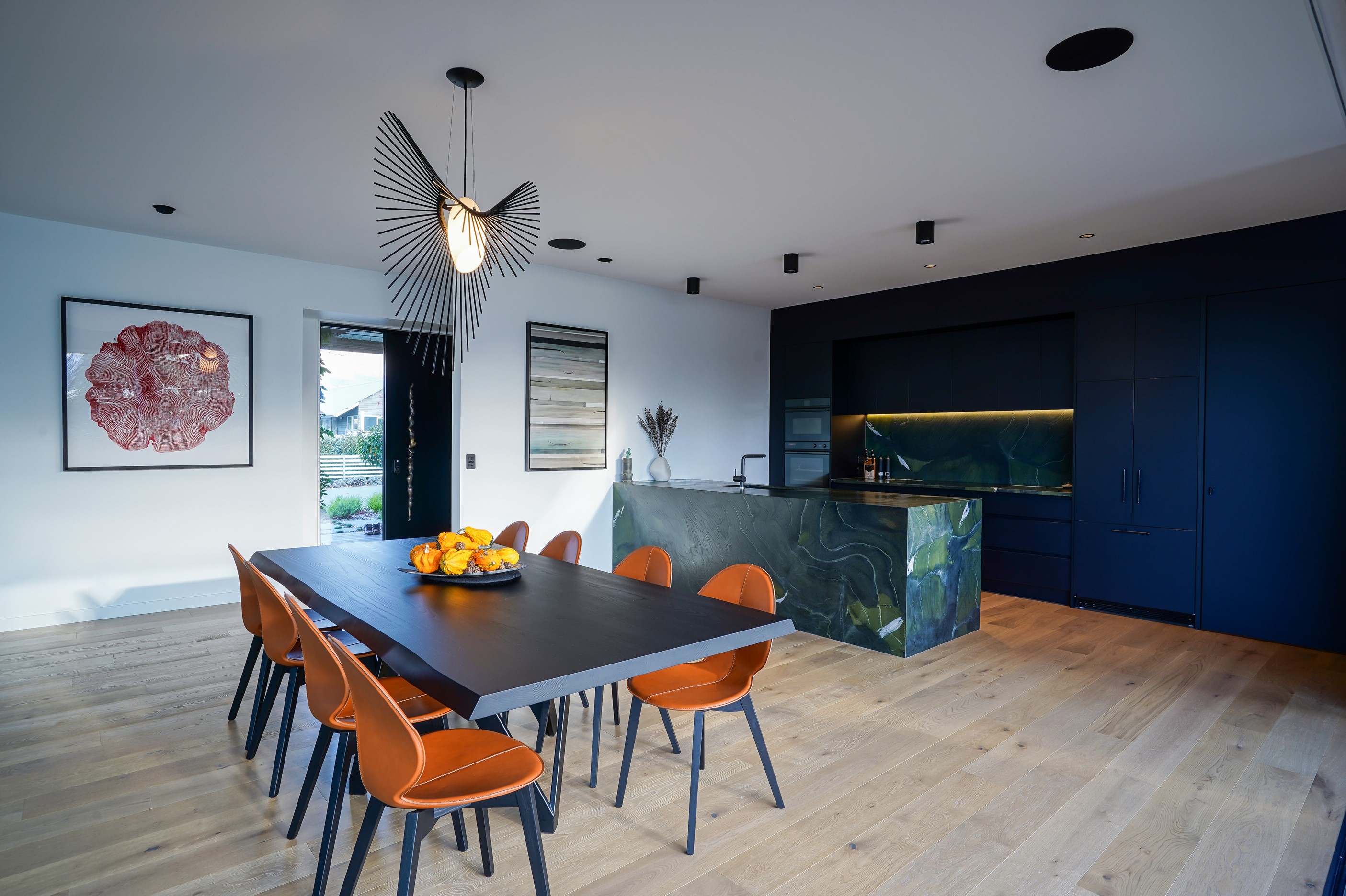 Prepare to be surprised when you open this perfectly wrapped present. The 240sqm three-bedroom home is clad in cedar, its tawny shades reflecting the Central Otago tussock, rock and mountains. It beautifully fulfils its architectural objectives of balance and earthiness. Step inside and you’re greeted by an aesthetic that’s minimalist, slick and eye-catching. Sheer presence. Two wings spread out from the central entrance in this home that’s inspired by nature. Thoughtfully designed elements catch the eye at every turn – in the pared-back kitchen, for instance, you’ll see marble on the waterfall-edge island and splashback. Head into the scullery and you’ll find intense green herringbone tiles contrasting with black. A bespoke pendant light hovers over the dining table. The three bathrooms are a study in nature-inspired greens, with tiles in varying shades and shapes. A feature wall in the powder room has delicate waves of clay and cerulean hues. The main living-dining space is separated by a standalone double-sided fire, with its flue directed through the flooring slab for warmth. Timber floorboards lead to a spacious media room on one side and an outdoor room with a woodfire on the other. Perfection.