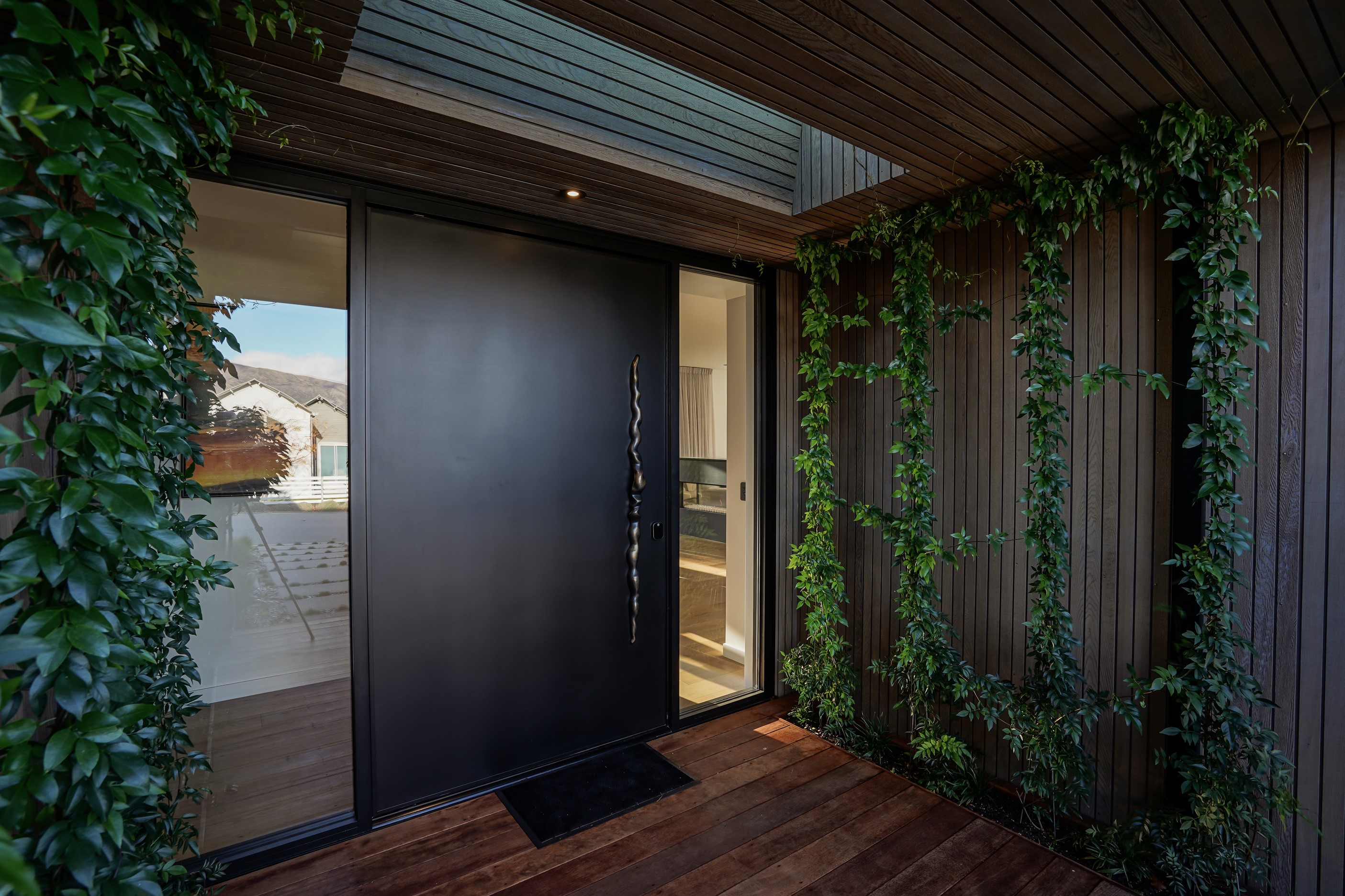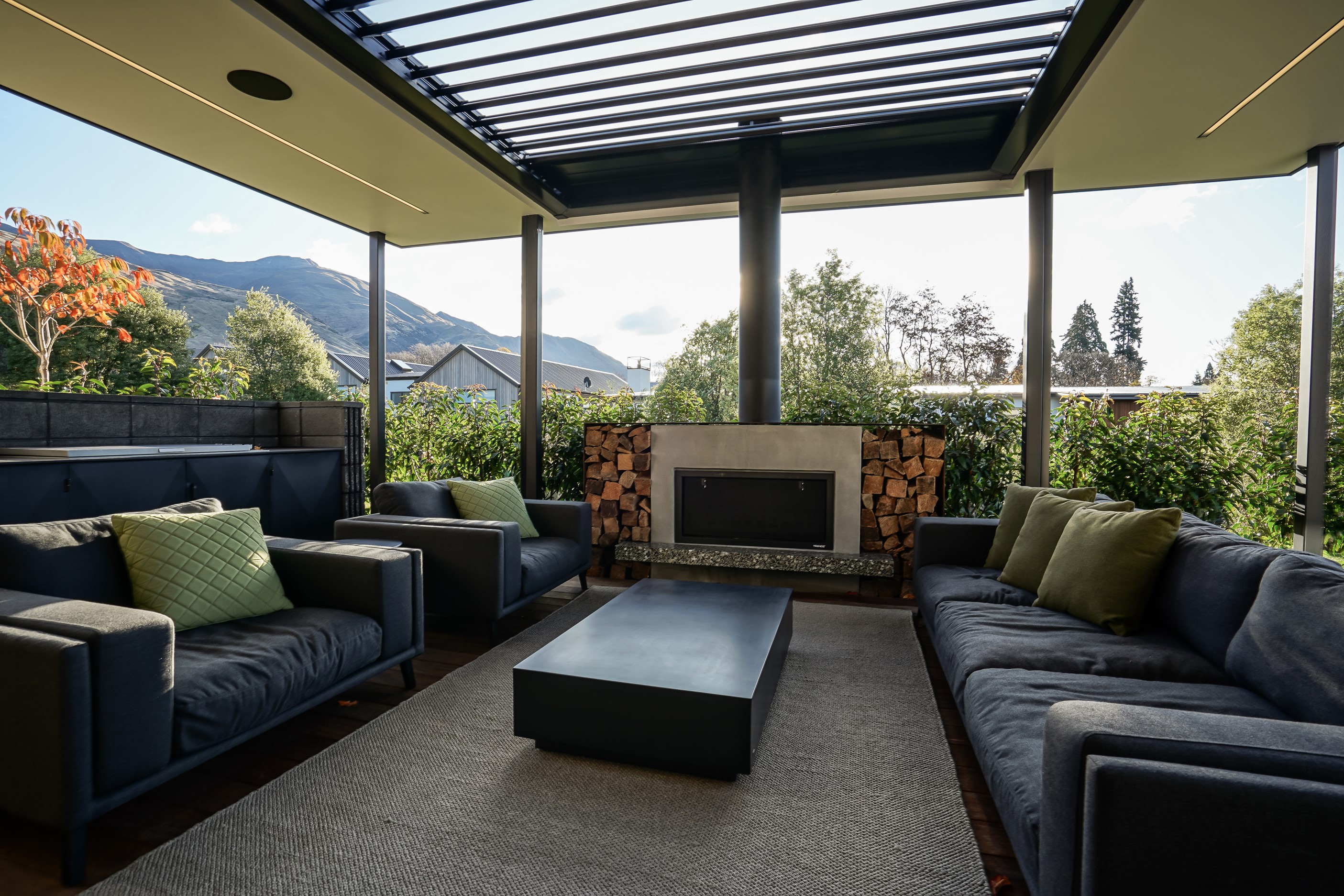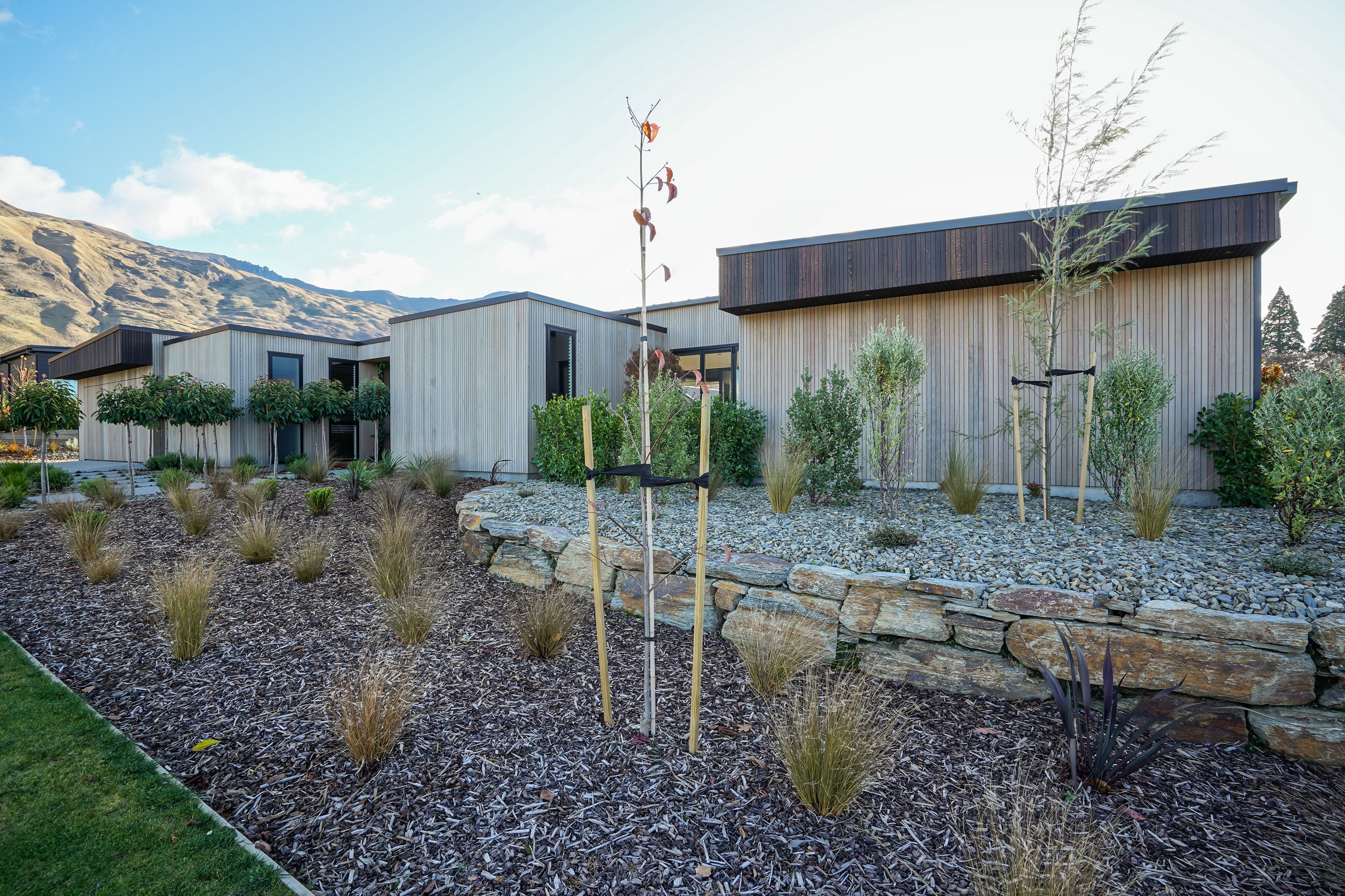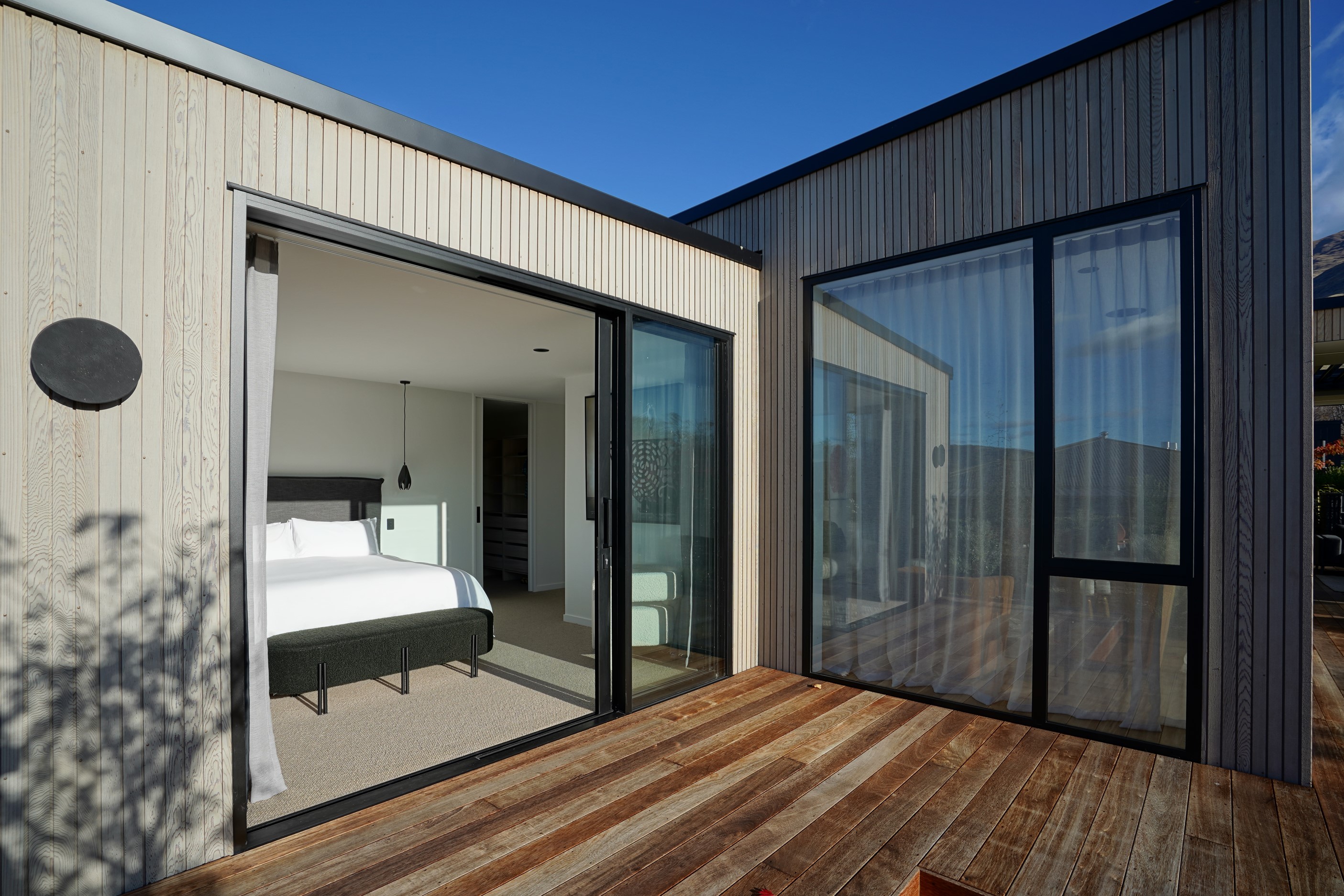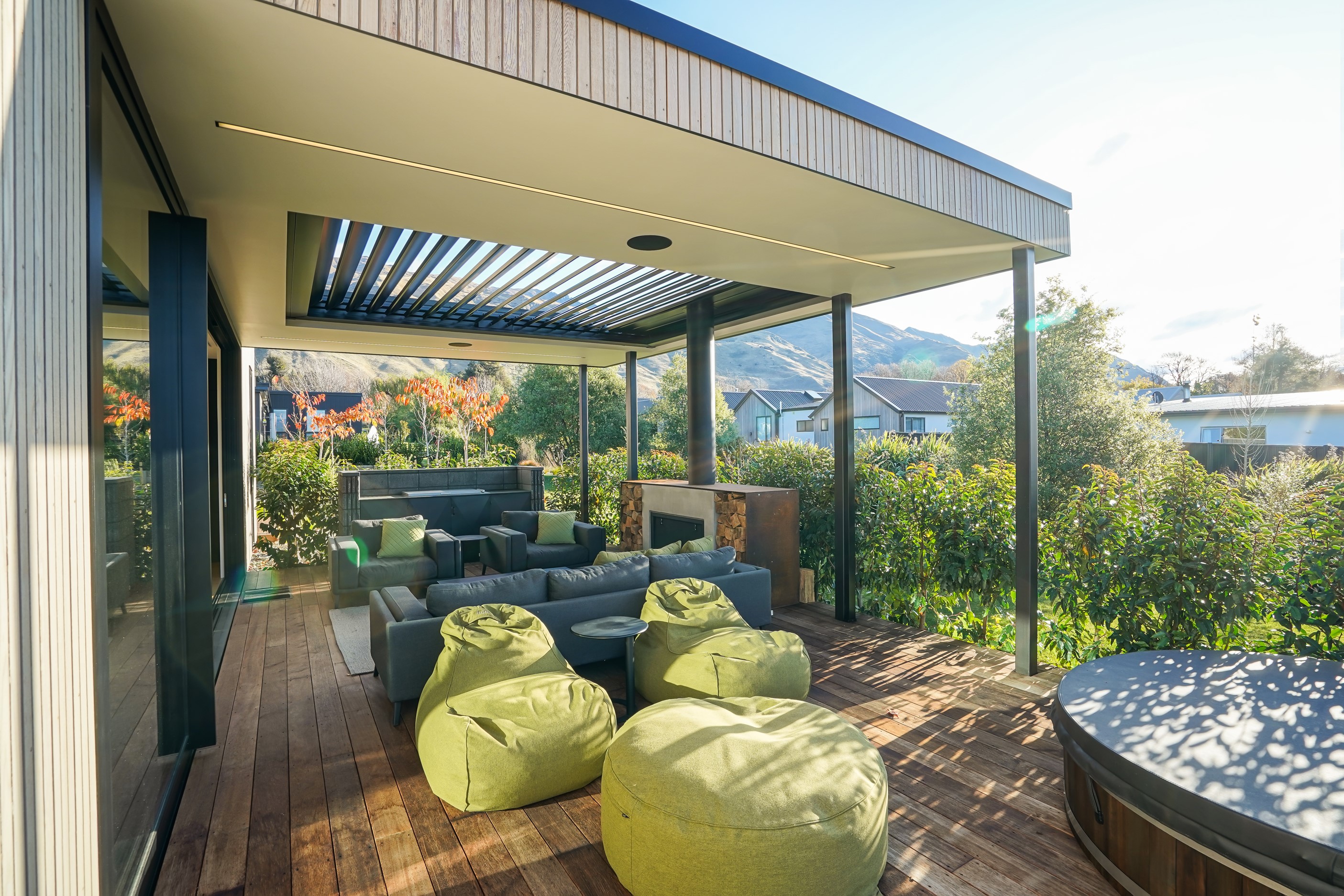 Prepare to be surprised when you open this perfectly wrapped present. The 240sqm three-bedroom home is clad in cedar, its tawny shades reflecting the Central Otago tussock, rock and mountains. It beautifully fulfils its architectural objectives of balance and earthiness. Step inside and you’re greeted by an aesthetic that’s minimalist, slick and eye-catching. Sheer presence. Two wings spread out from the central entrance in this home that’s inspired by nature. Thoughtfully designed elements catch the eye at every turn – in the pared-back kitchen, for instance, you’ll see marble on the waterfall-edge island and splashback. Head into the scullery and you’ll find intense green herringbone tiles contrasting with black. A bespoke pendant light hovers over the dining table. The three bathrooms are a study in nature-inspired greens, with tiles in varying shades and shapes. A feature wall in the powder room has delicate waves of clay and cerulean hues. The main living-dining space is separated by a standalone double-sided fire, with its flue directed through the flooring slab for warmth. Timber floorboards lead to a spacious media room on one side and an outdoor room with a woodfire on the other. Perfection.