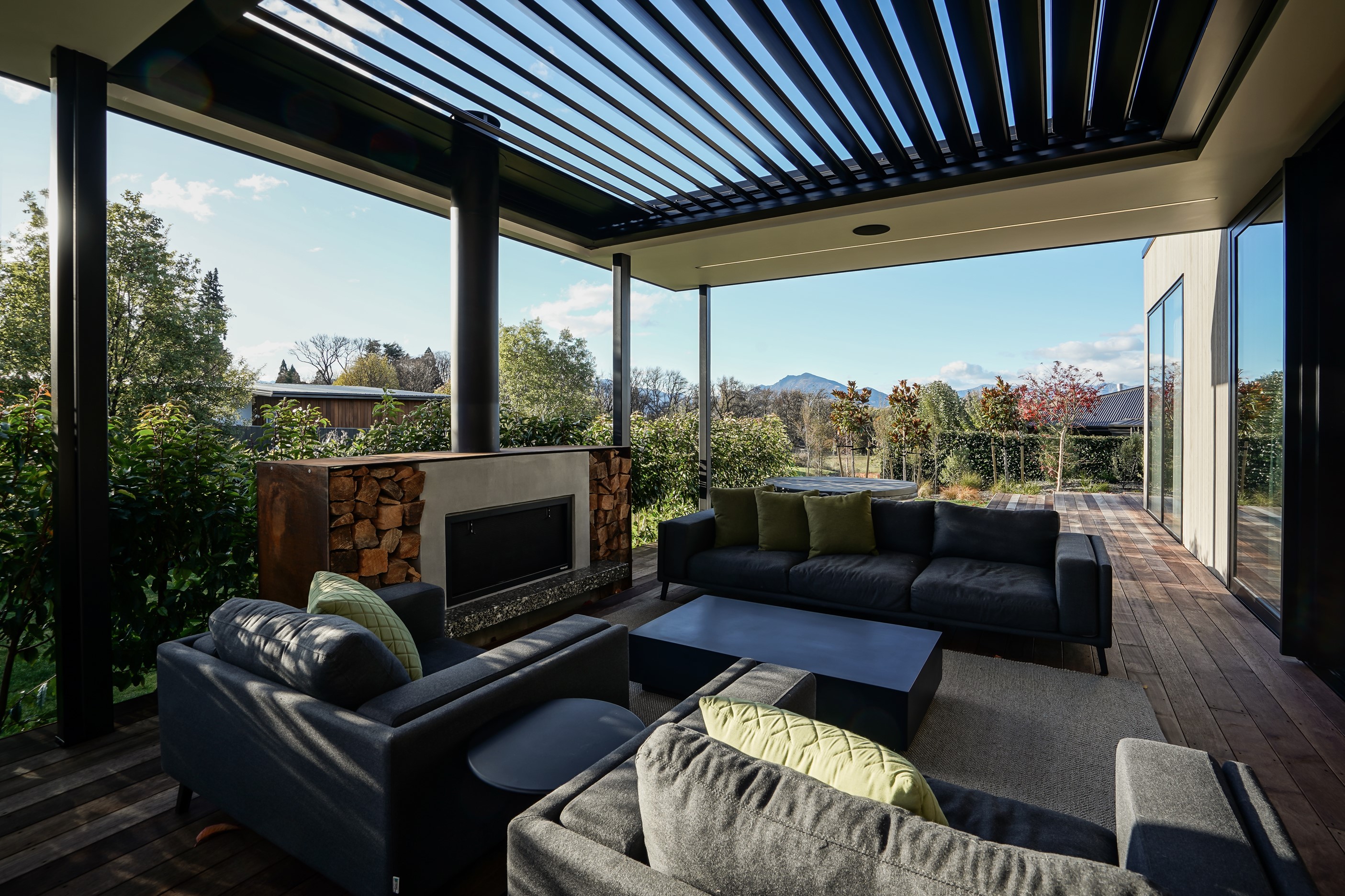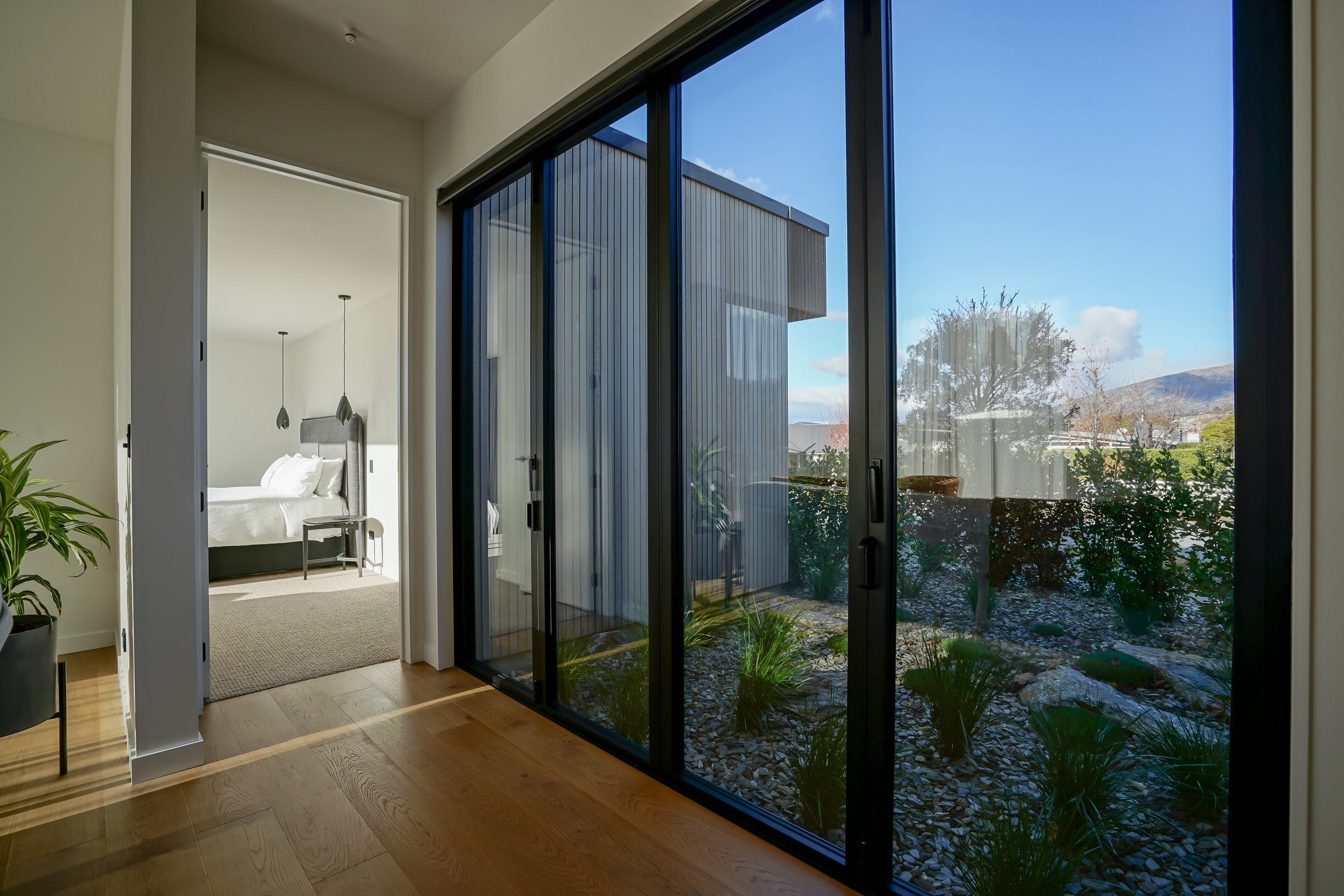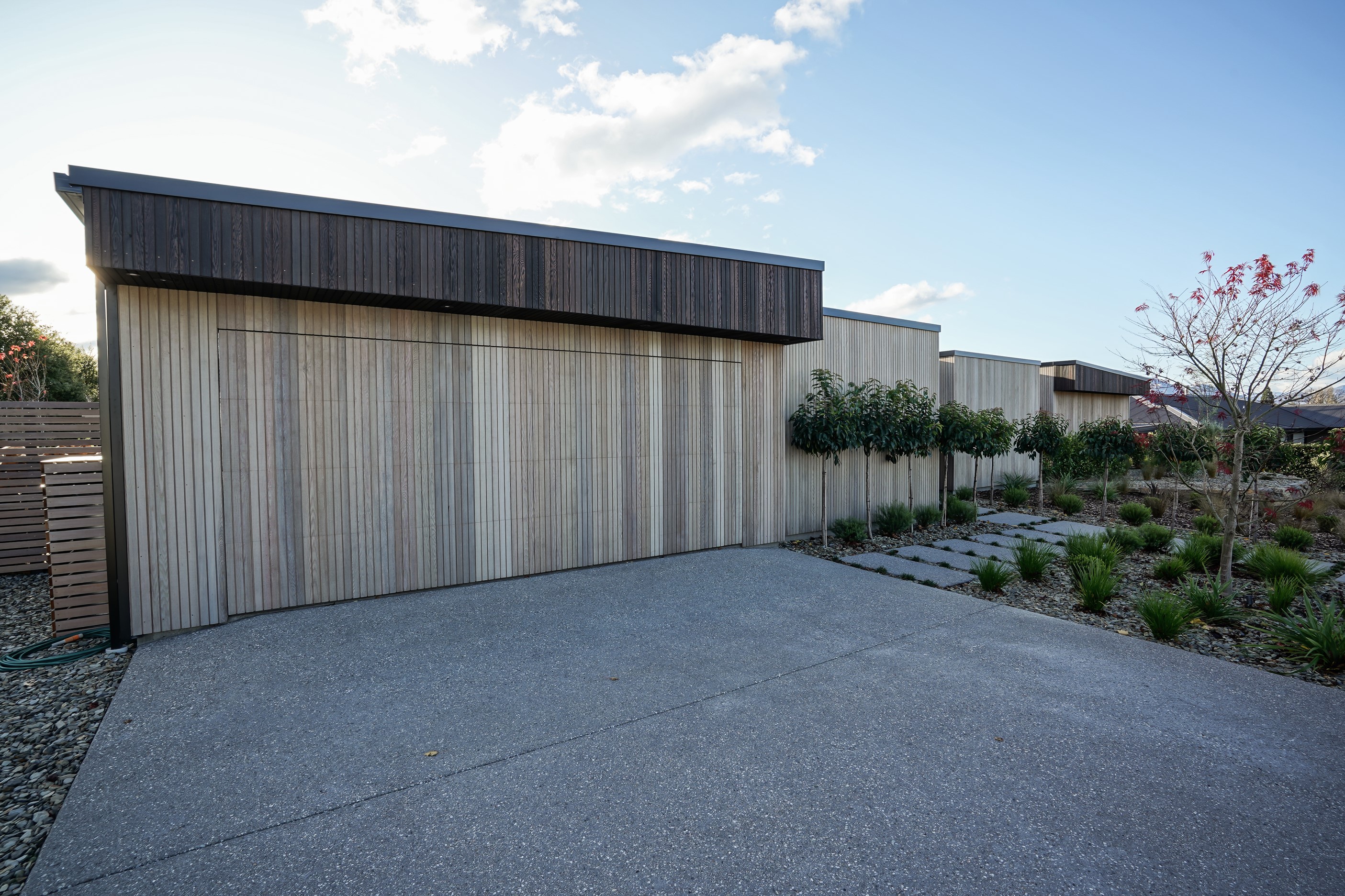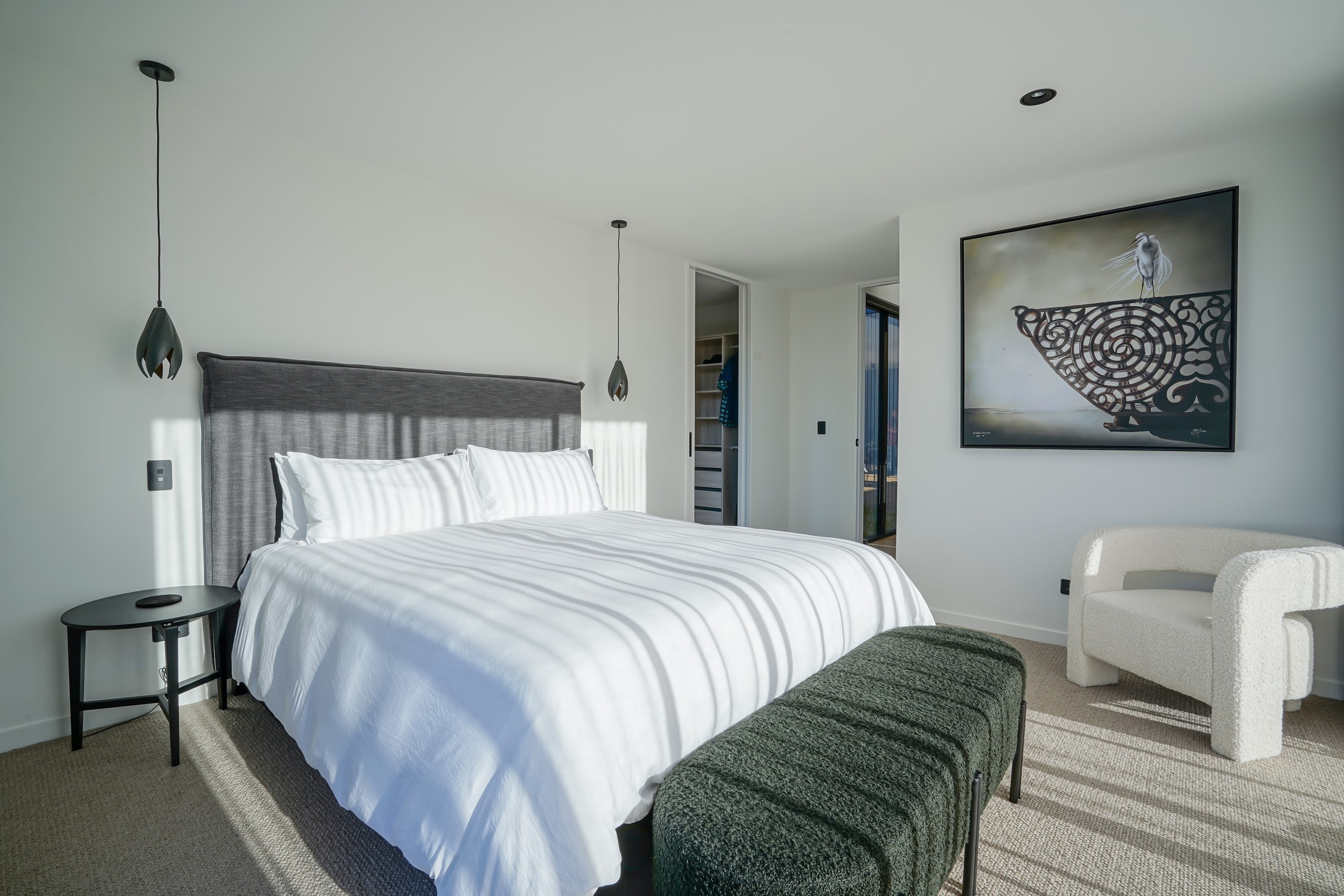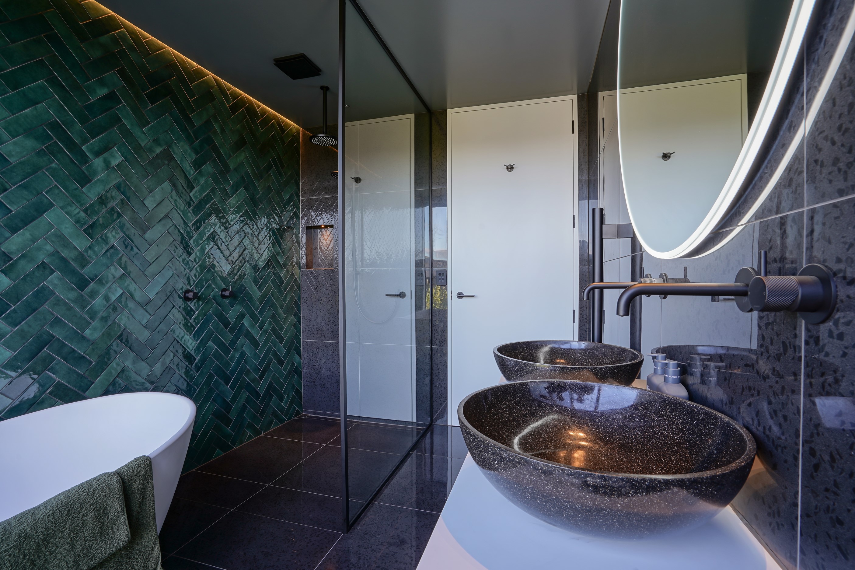 Prepare to be surprised when you open this perfectly wrapped present. The 240sqm three-bedroom home is clad in cedar, its tawny shades reflecting the Central Otago tussock, rock and mountains. It beautifully fulfils its architectural objectives of balance and earthiness. Step inside and you’re greeted by an aesthetic that’s minimalist, slick and eye-catching. Sheer presence. Two wings spread out from the central entrance in this home that’s inspired by nature. Thoughtfully designed elements catch the eye at every turn – in the pared-back kitchen, for instance, you’ll see marble on the waterfall-edge island and splashback. Head into the scullery and you’ll find intense green herringbone tiles contrasting with black. A bespoke pendant light hovers over the dining table. The three bathrooms are a study in nature-inspired greens, with tiles in varying shades and shapes. A feature wall in the powder room has delicate waves of clay and cerulean hues. The main living-dining space is separated by a standalone double-sided fire, with its flue directed through the flooring slab for warmth. Timber floorboards lead to a spacious media room on one side and an outdoor room with a woodfire on the other. Perfection.