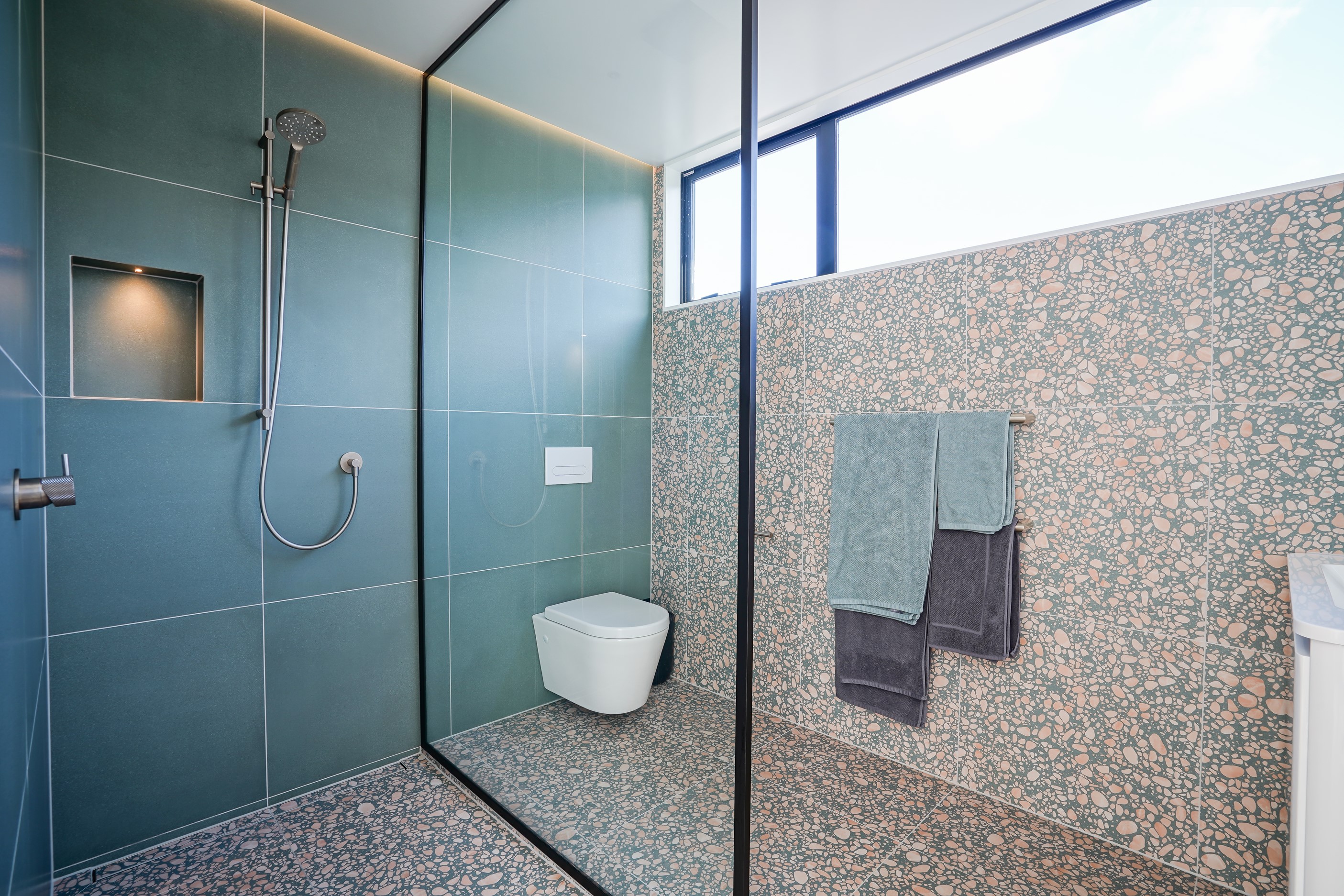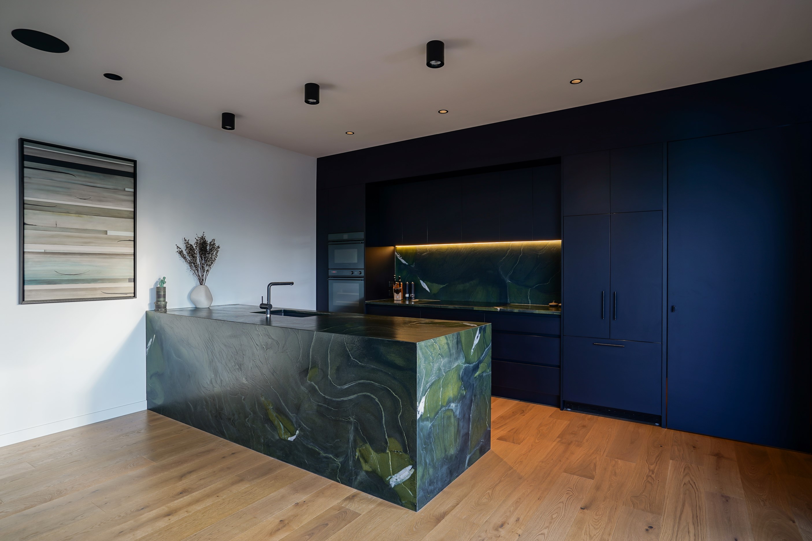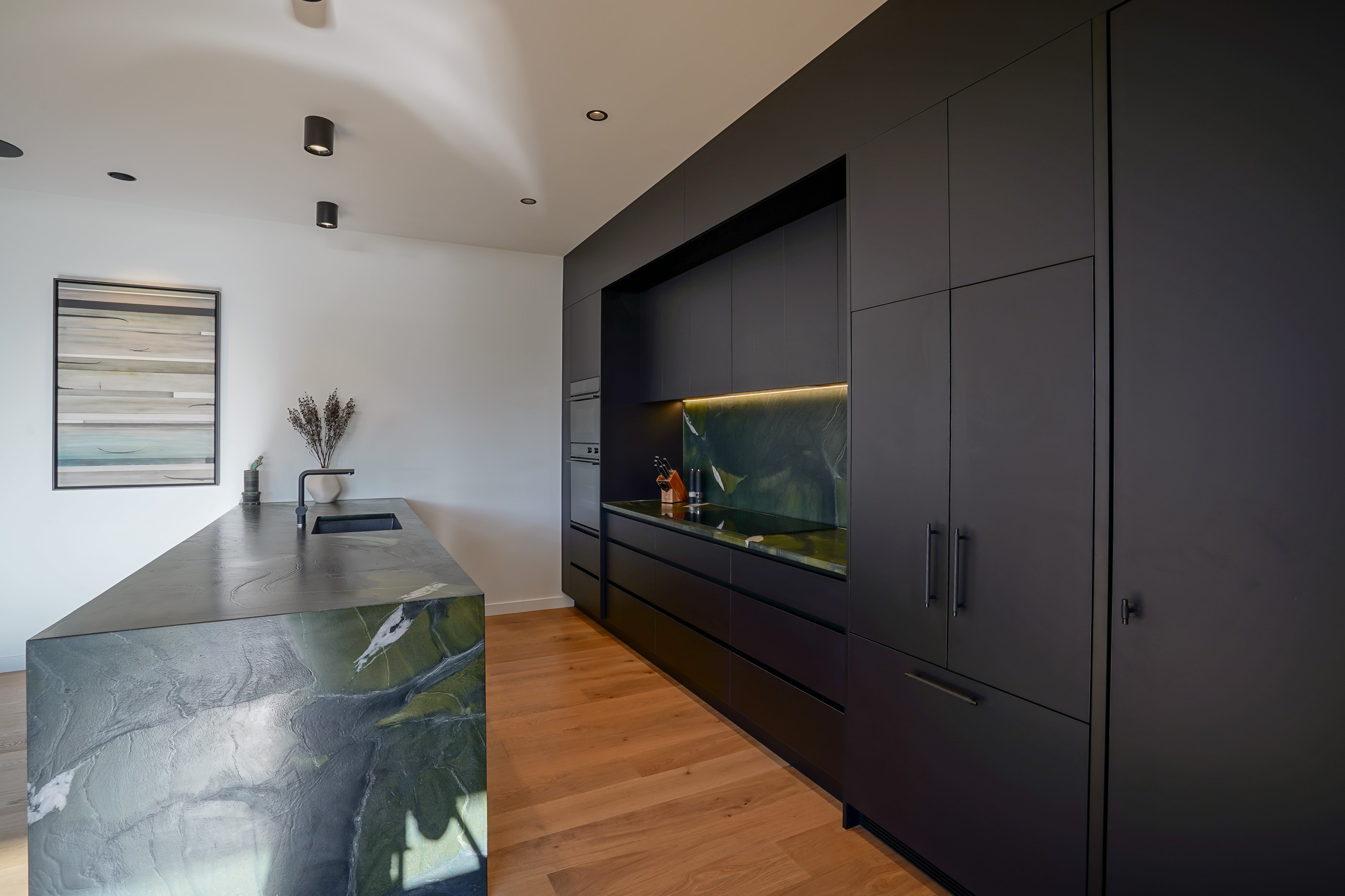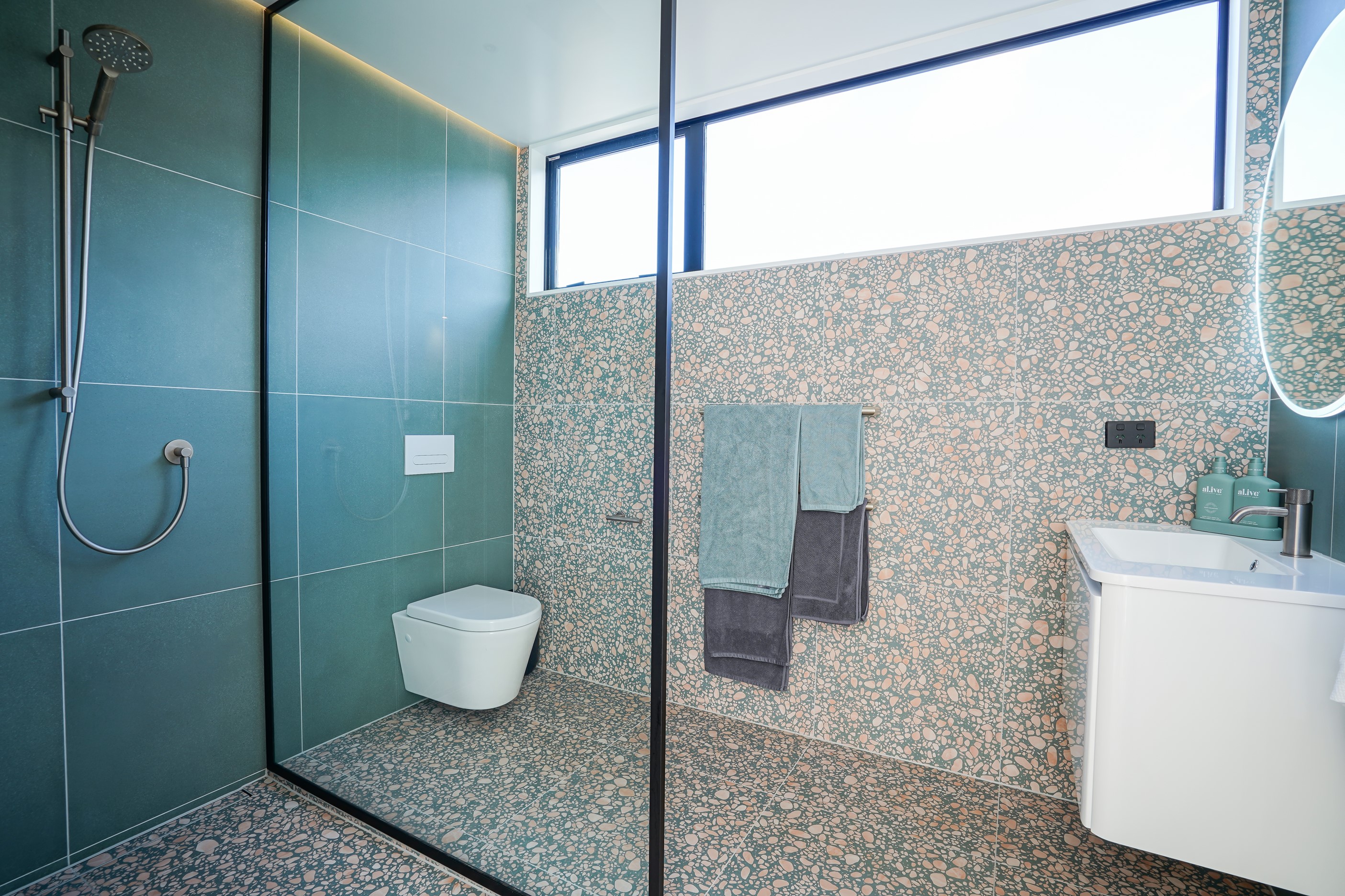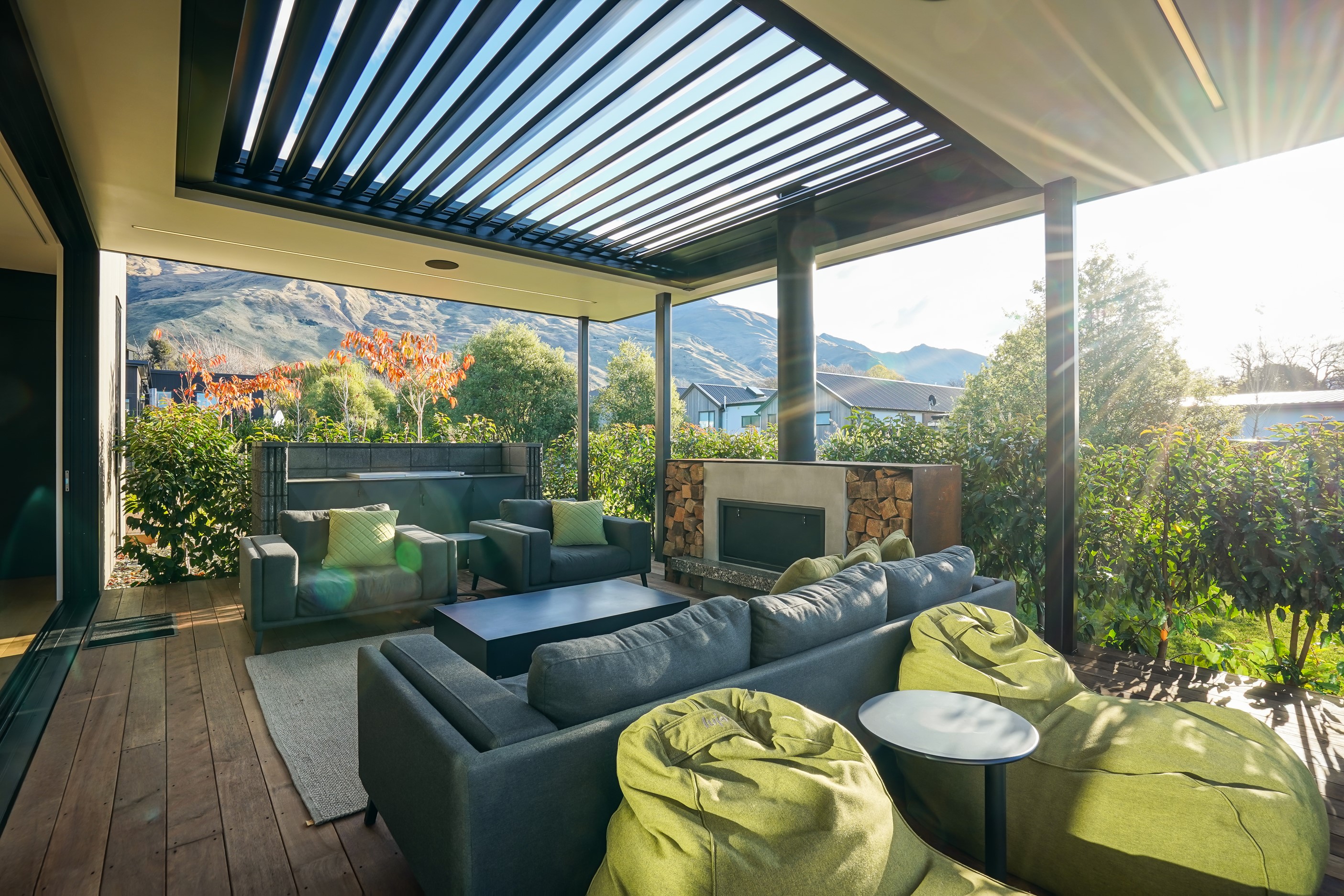Prepare to be surprised when you open this perfectly wrapped present. The 240sqm three-bedroom home is clad in cedar, its tawny shades reflecting the Central Otago tussock, rock and mountains. It beautifully fulfils its architectural objectives of balance and earthiness. Step inside and you’re greeted by an aesthetic that’s minimalist, slick and eye-catching. Sheer presence. Two wings spread out from the central entrance in this home that’s inspired by nature. Thoughtfully designed elements catch the eye at every turn – in the pared-back kitchen, for instance, you’ll see marble on the waterfall-edge island and splashback. Head into the scullery and you’ll find intense green herringbone tiles contrasting with black. A bespoke pendant light hovers over the dining table. The three bathrooms are a study in nature-inspired greens, with tiles in varying shades and shapes. A feature wall in the powder room has delicate waves of clay and cerulean hues. The main living-dining space is separated by a standalone double-sided fire, with its flue directed through the flooring slab for warmth. Timber floorboards lead to a spacious media room on one side and an outdoor room with a woodfire on the other. Perfection.