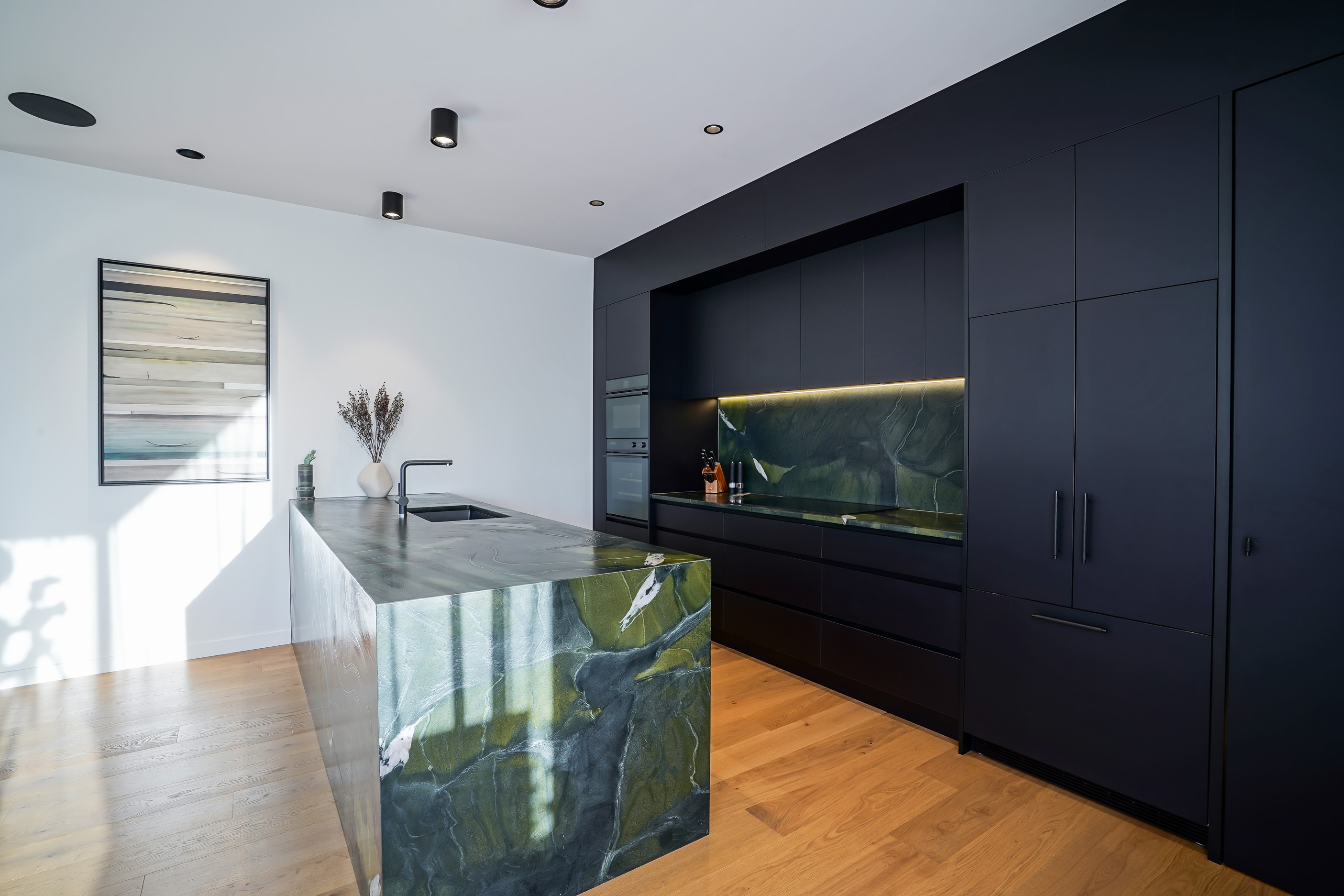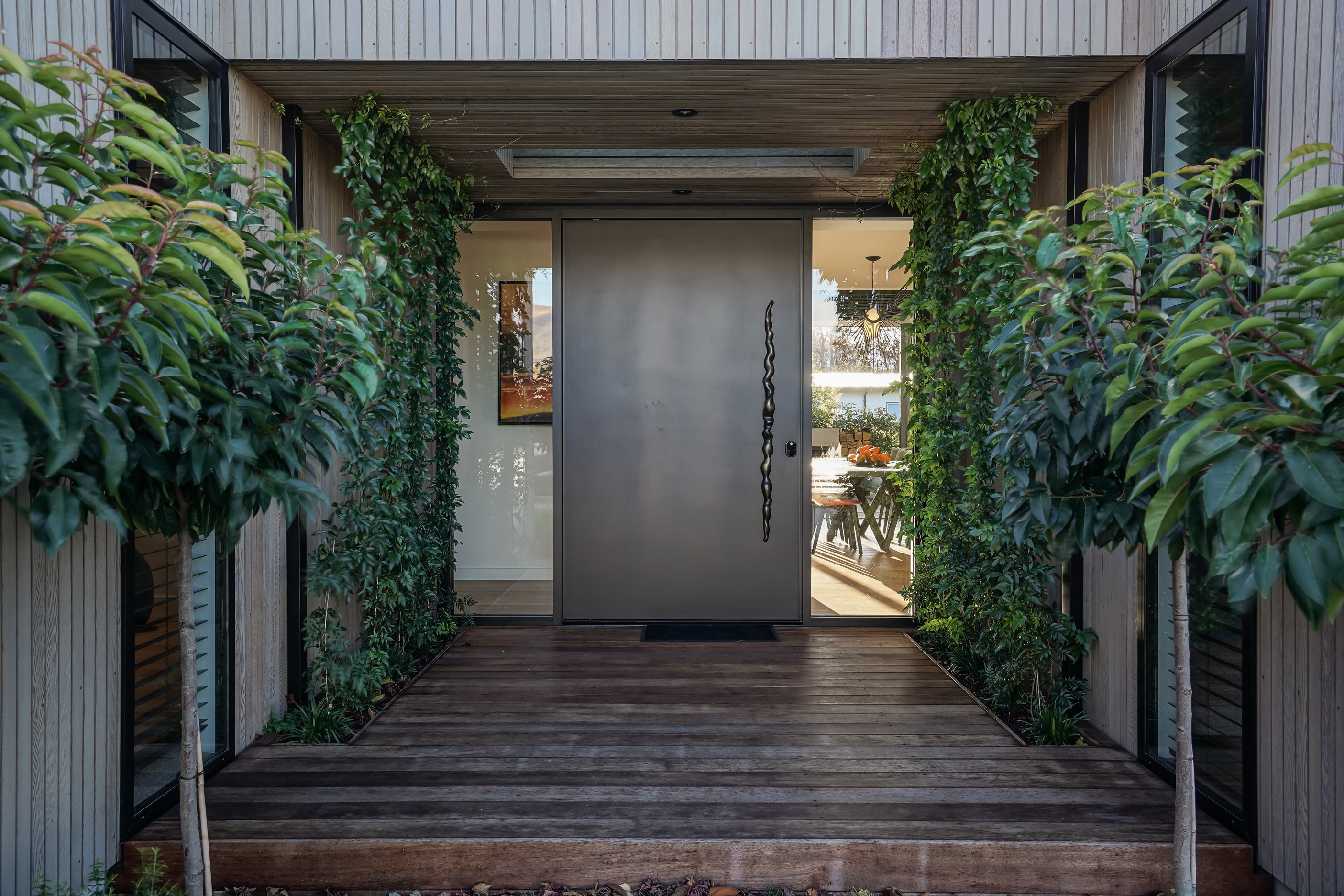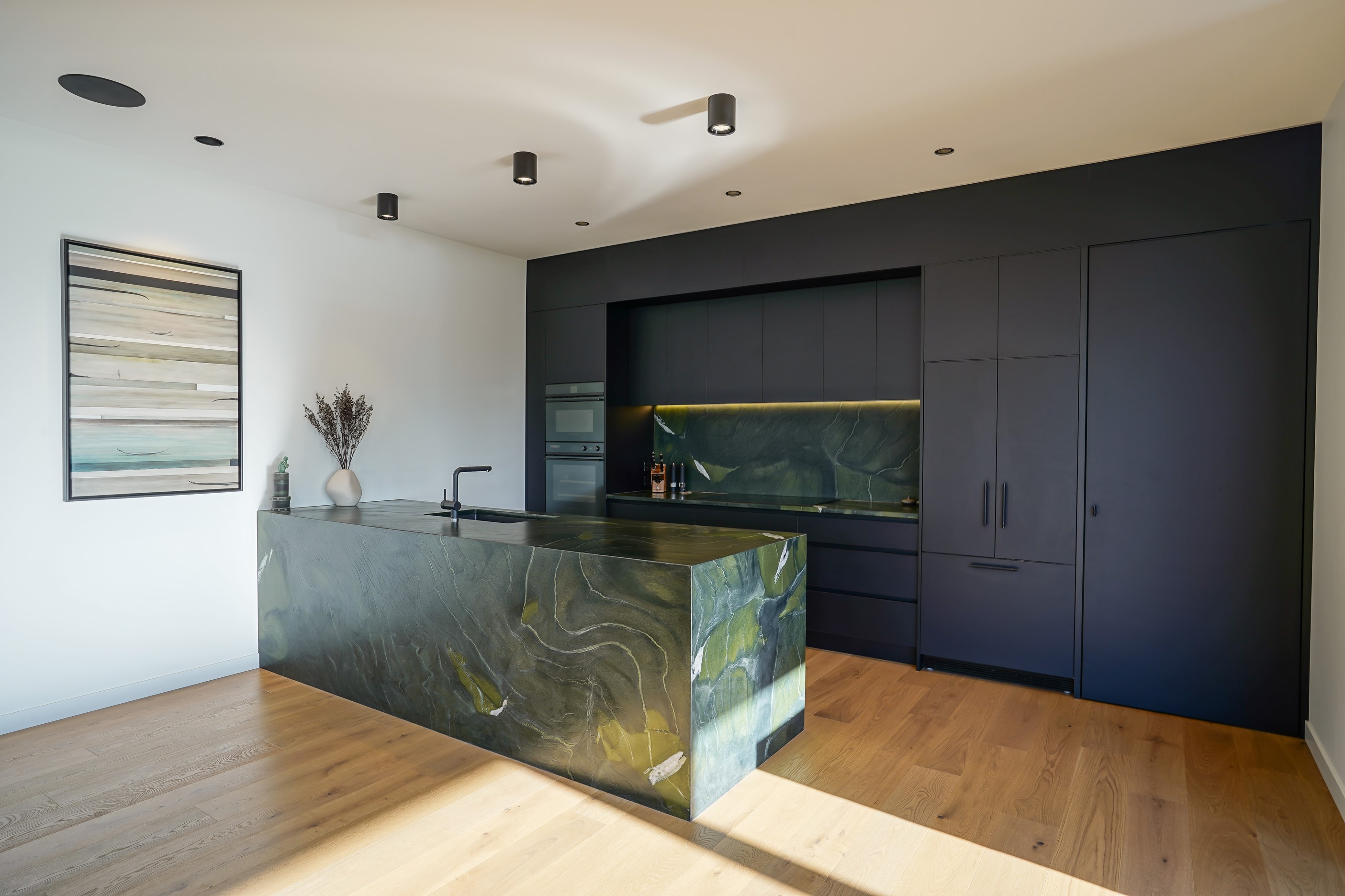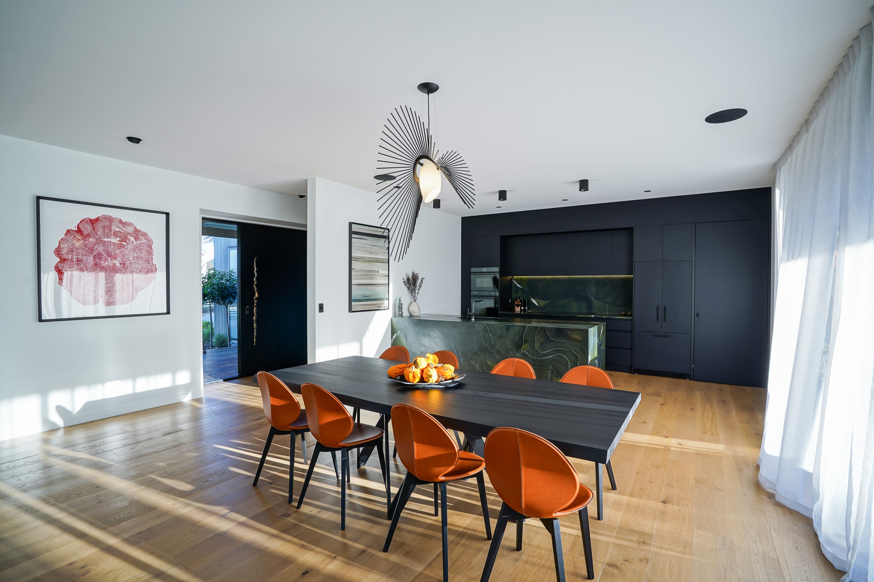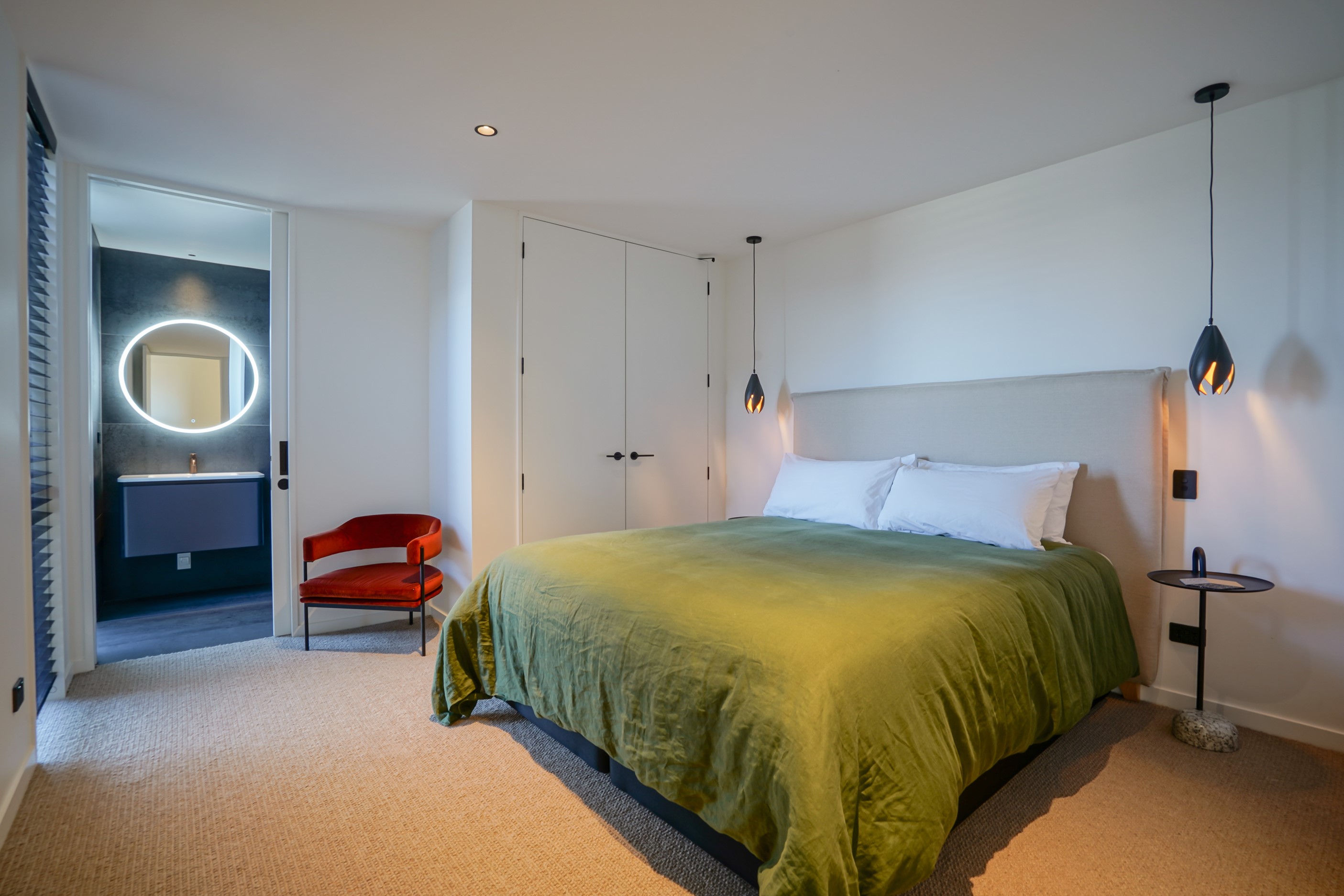 Prepare to be surprised when you open this perfectly wrapped present. The 240sqm three-bedroom home is clad in cedar, its tawny shades reflecting the Central Otago tussock, rock and mountains. It beautifully fulfils its architectural objectives of balance and earthiness. Step inside and you’re greeted by an aesthetic that’s minimalist, slick and eye-catching. Sheer presence. Two wings spread out from the central entrance in this home that’s inspired by nature. Thoughtfully designed elements catch the eye at every turn – in the pared-back kitchen, for instance, you’ll see marble on the waterfall-edge island and splashback. Head into the scullery and you’ll find intense green herringbone tiles contrasting with black. A bespoke pendant light hovers over the dining table. The three bathrooms are a study in nature-inspired greens, with tiles in varying shades and shapes. A feature wall in the powder room has delicate waves of clay and cerulean hues. The main living-dining space is separated by a standalone double-sided fire, with its flue directed through the flooring slab for warmth. Timber floorboards lead to a spacious media room on one side and an outdoor room with a woodfire on the other. Perfection.