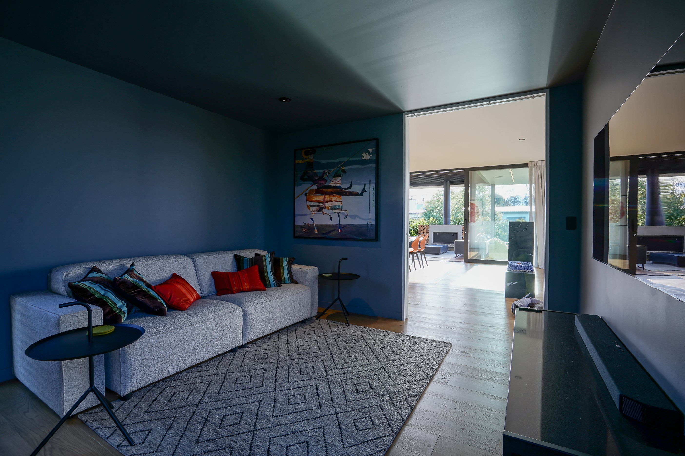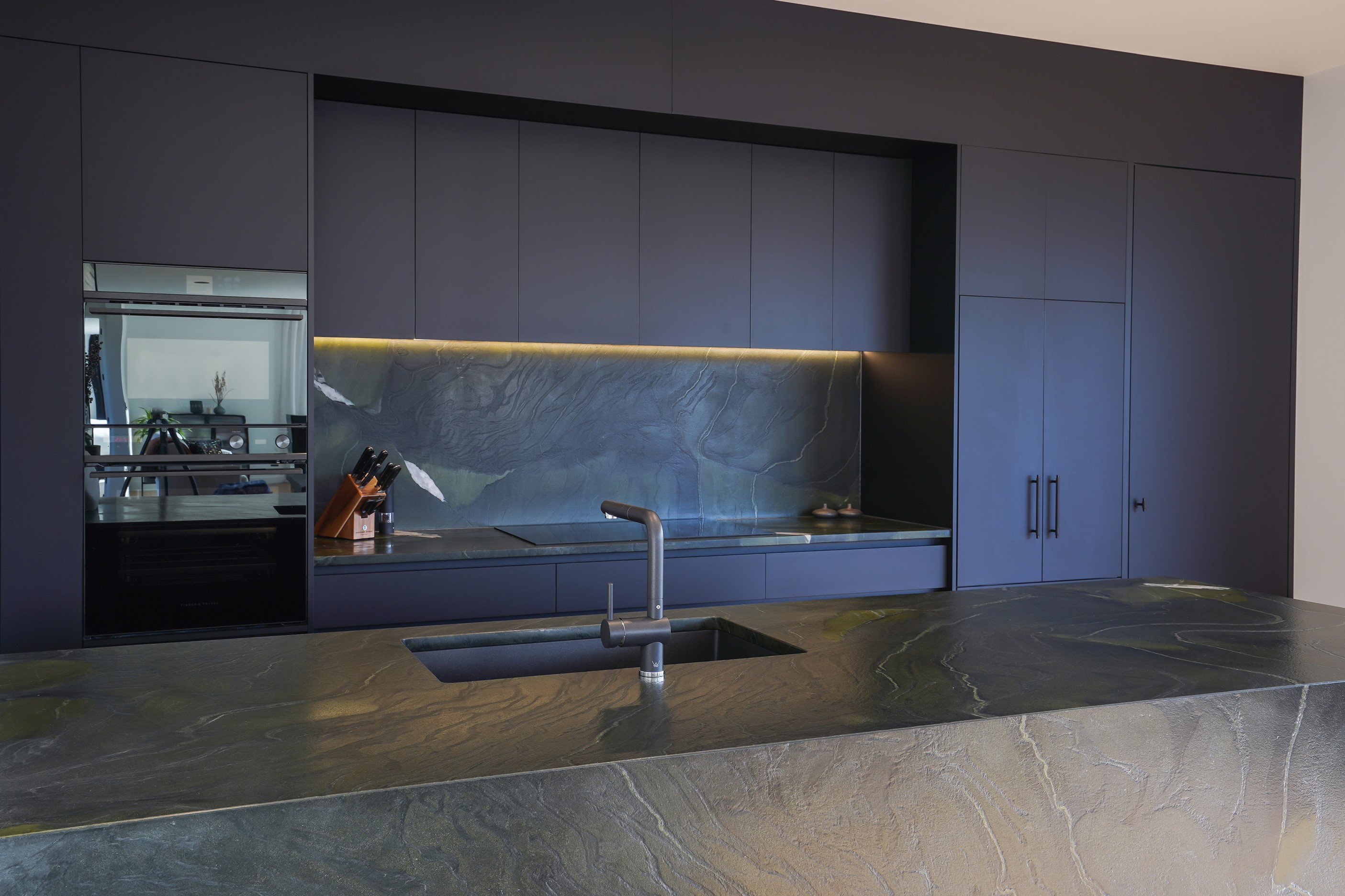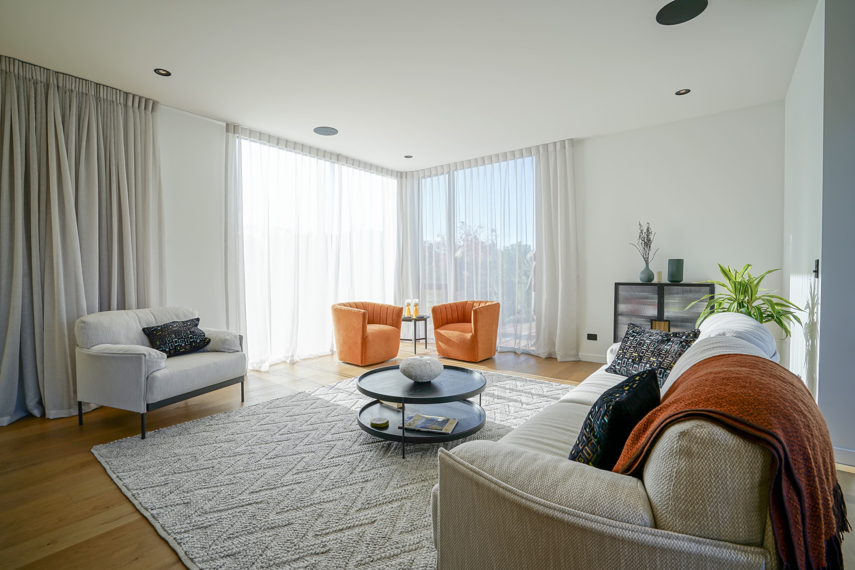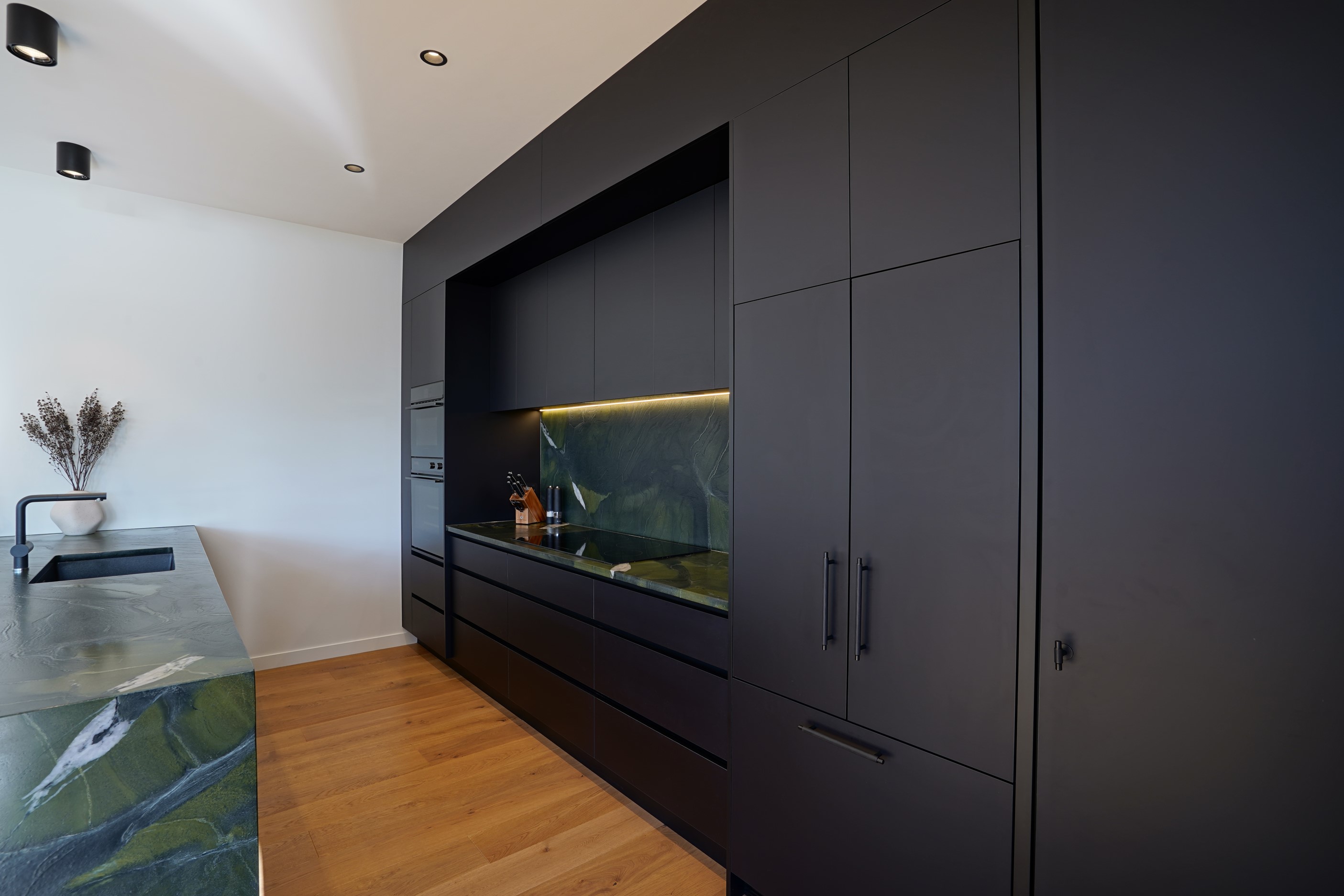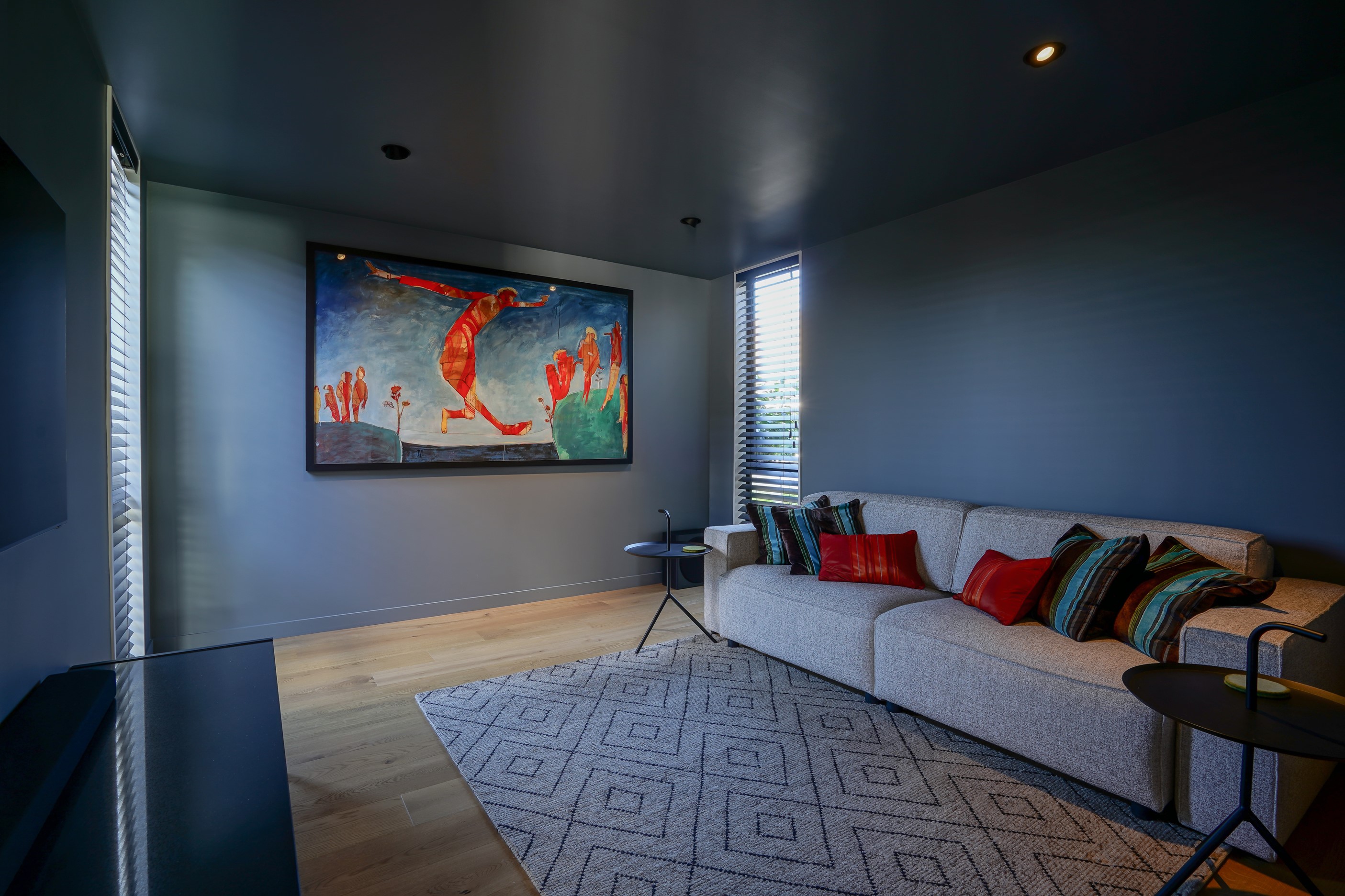Prepare to be surprised when you open this perfectly wrapped present. The 240sqm three-bedroom home is clad in cedar, its tawny shades reflecting the Central Otago tussock, rock and mountains. It beautifully fulfils its architectural objectives of balance and earthiness. Step inside and you’re greeted by an aesthetic that’s minimalist, slick and eye-catching. Sheer presence. Two wings spread out from the central entrance in this home that’s inspired by nature. Thoughtfully designed elements catch the eye at every turn – in the pared-back kitchen, for instance, you’ll see marble on the waterfall-edge island and splashback. Head into the scullery and you’ll find intense green herringbone tiles contrasting with black. A bespoke pendant light hovers over the dining table. The three bathrooms are a study in nature-inspired greens, with tiles in varying shades and shapes. A feature wall in the powder room has delicate waves of clay and cerulean hues. The main living-dining space is separated by a standalone double-sided fire, with its flue directed through the flooring slab for warmth. Timber floorboards lead to a spacious media room on one side and an outdoor room with a woodfire on the other. Perfection.