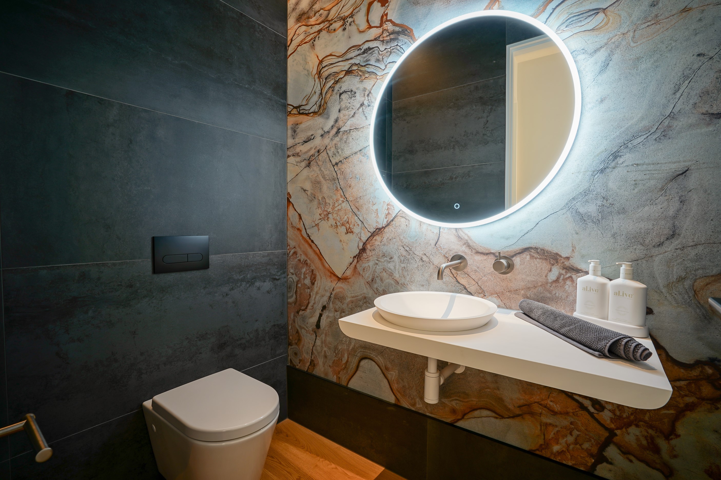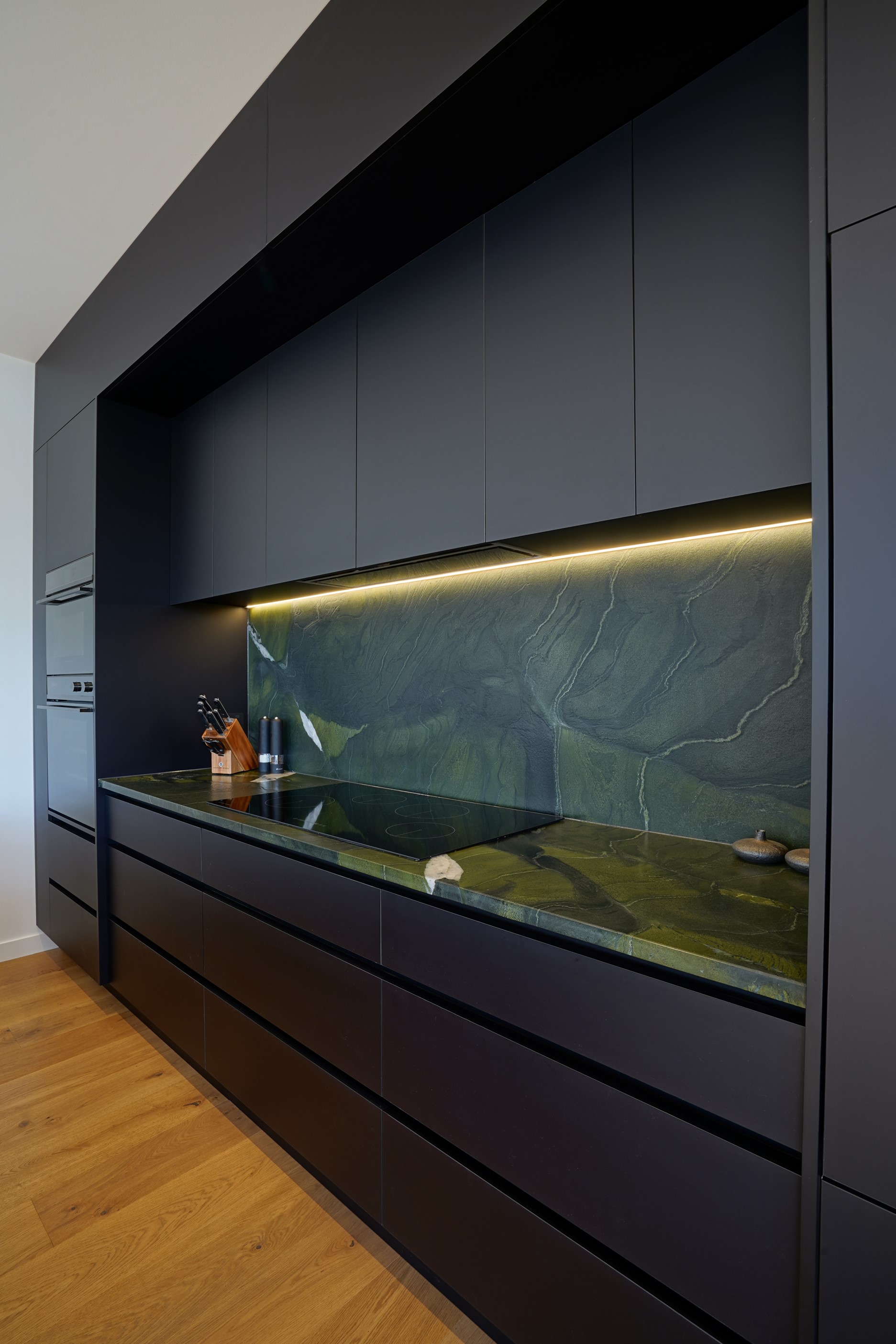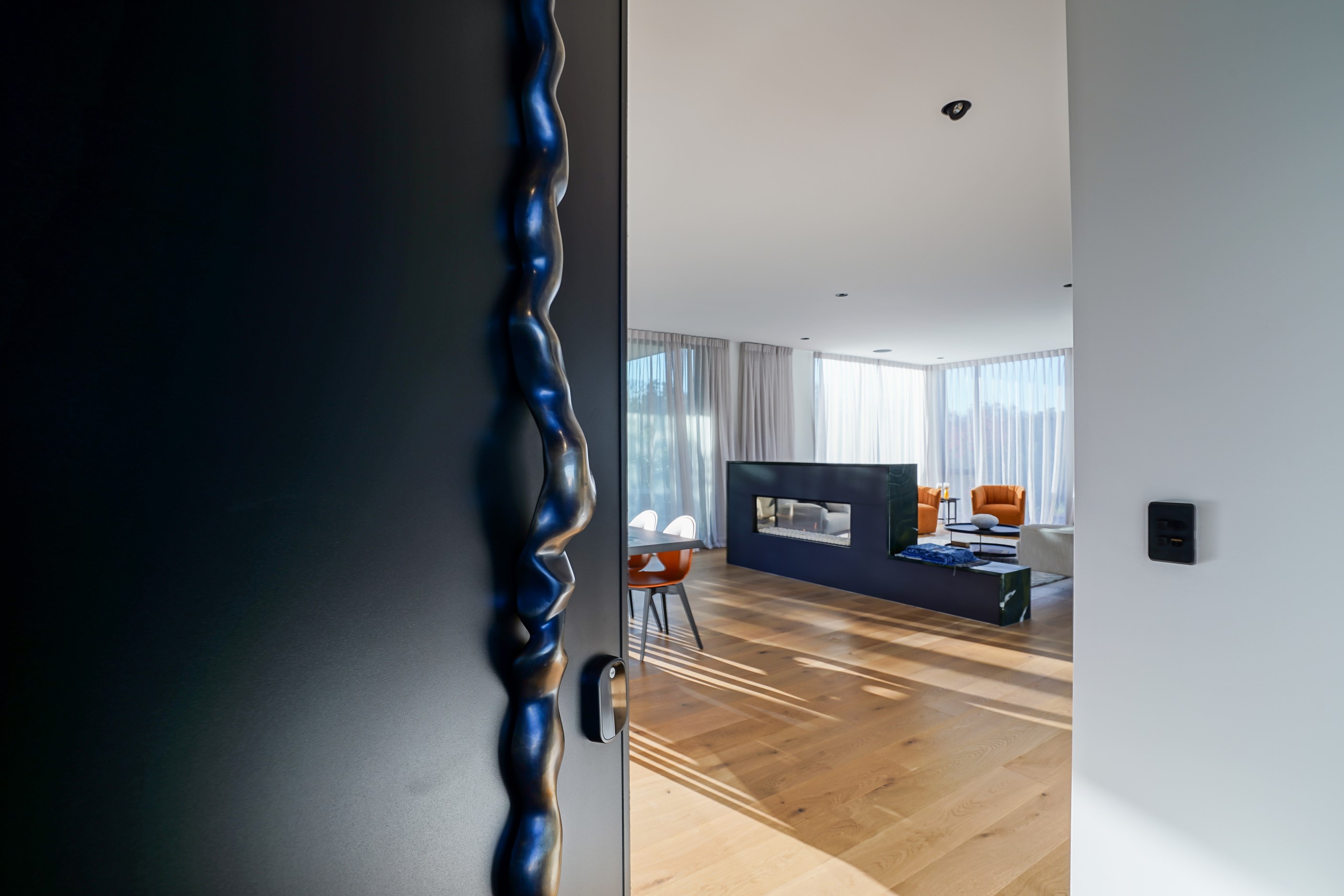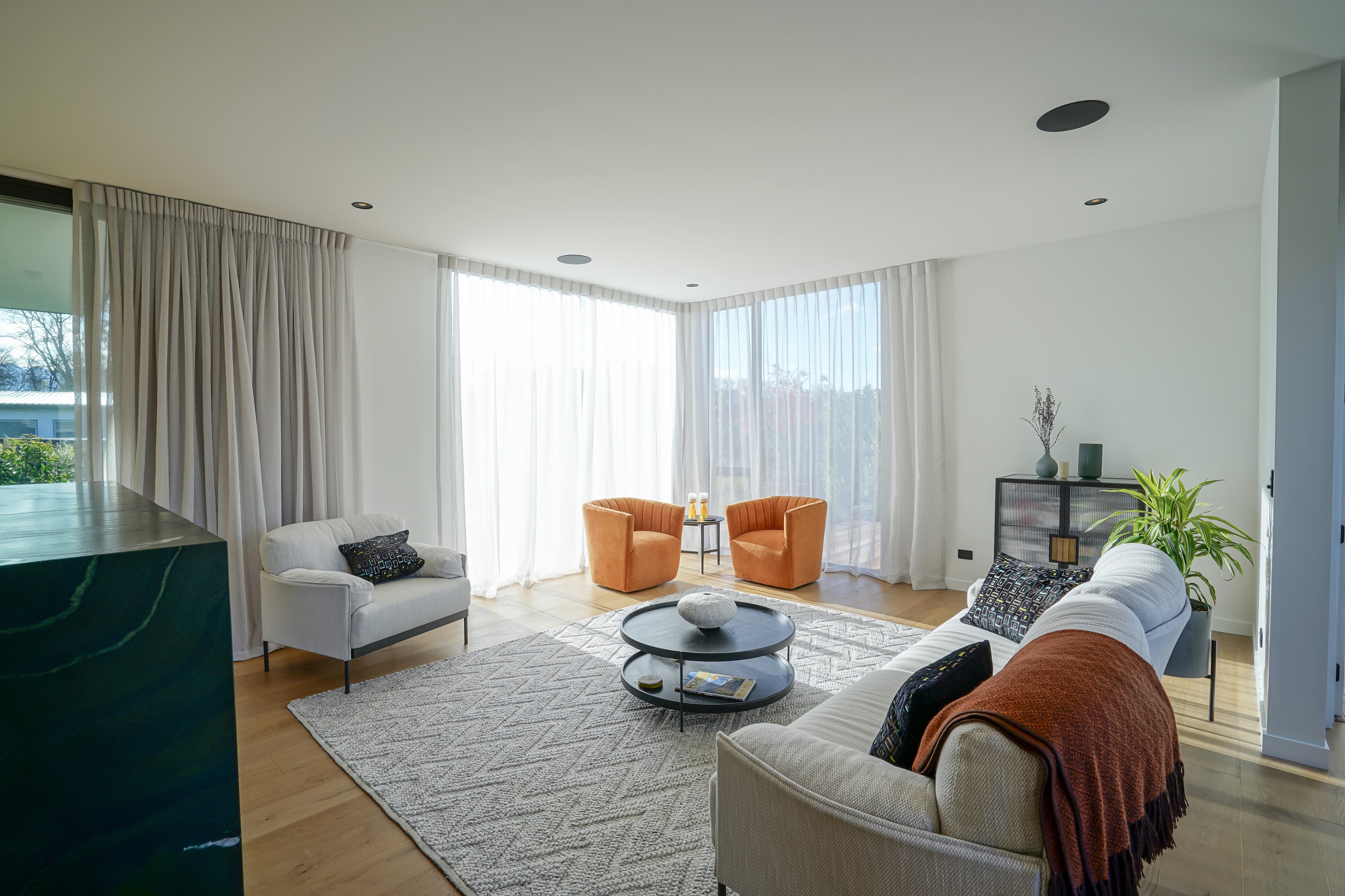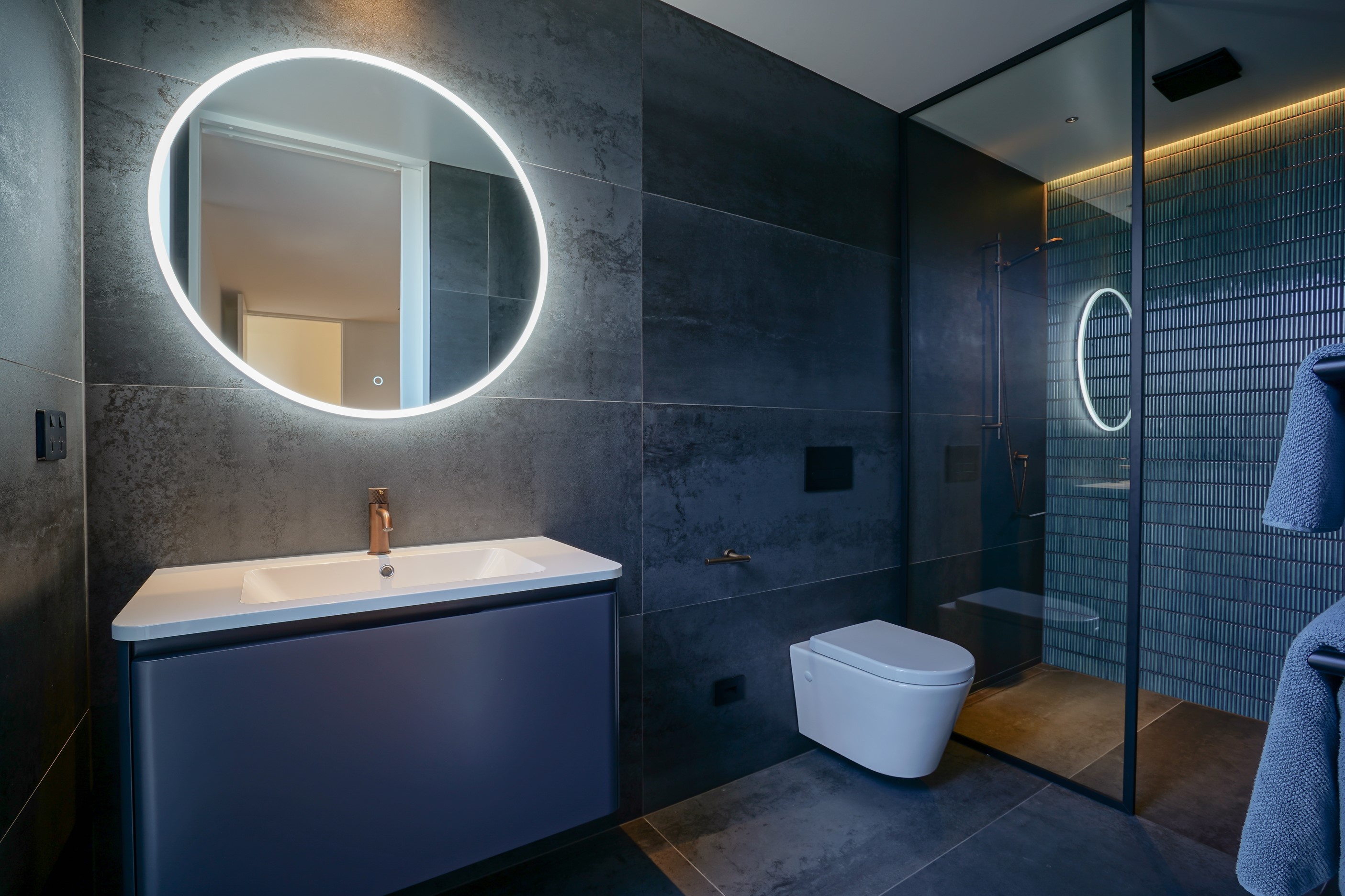 Prepare to be surprised when you open this perfectly wrapped present. The 240sqm three-bedroom home is clad in cedar, its tawny shades reflecting the Central Otago tussock, rock and mountains. It beautifully fulfils its architectural objectives of balance and earthiness. Step inside and you’re greeted by an aesthetic that’s minimalist, slick and eye-catching. Sheer presence. Two wings spread out from the central entrance in this home that’s inspired by nature. Thoughtfully designed elements catch the eye at every turn – in the pared-back kitchen, for instance, you’ll see marble on the waterfall-edge island and splashback. Head into the scullery and you’ll find intense green herringbone tiles contrasting with black. A bespoke pendant light hovers over the dining table. The three bathrooms are a study in nature-inspired greens, with tiles in varying shades and shapes. A feature wall in the powder room has delicate waves of clay and cerulean hues. The main living-dining space is separated by a standalone double-sided fire, with its flue directed through the flooring slab for warmth. Timber floorboards lead to a spacious media room on one side and an outdoor room with a woodfire on the other. Perfection.