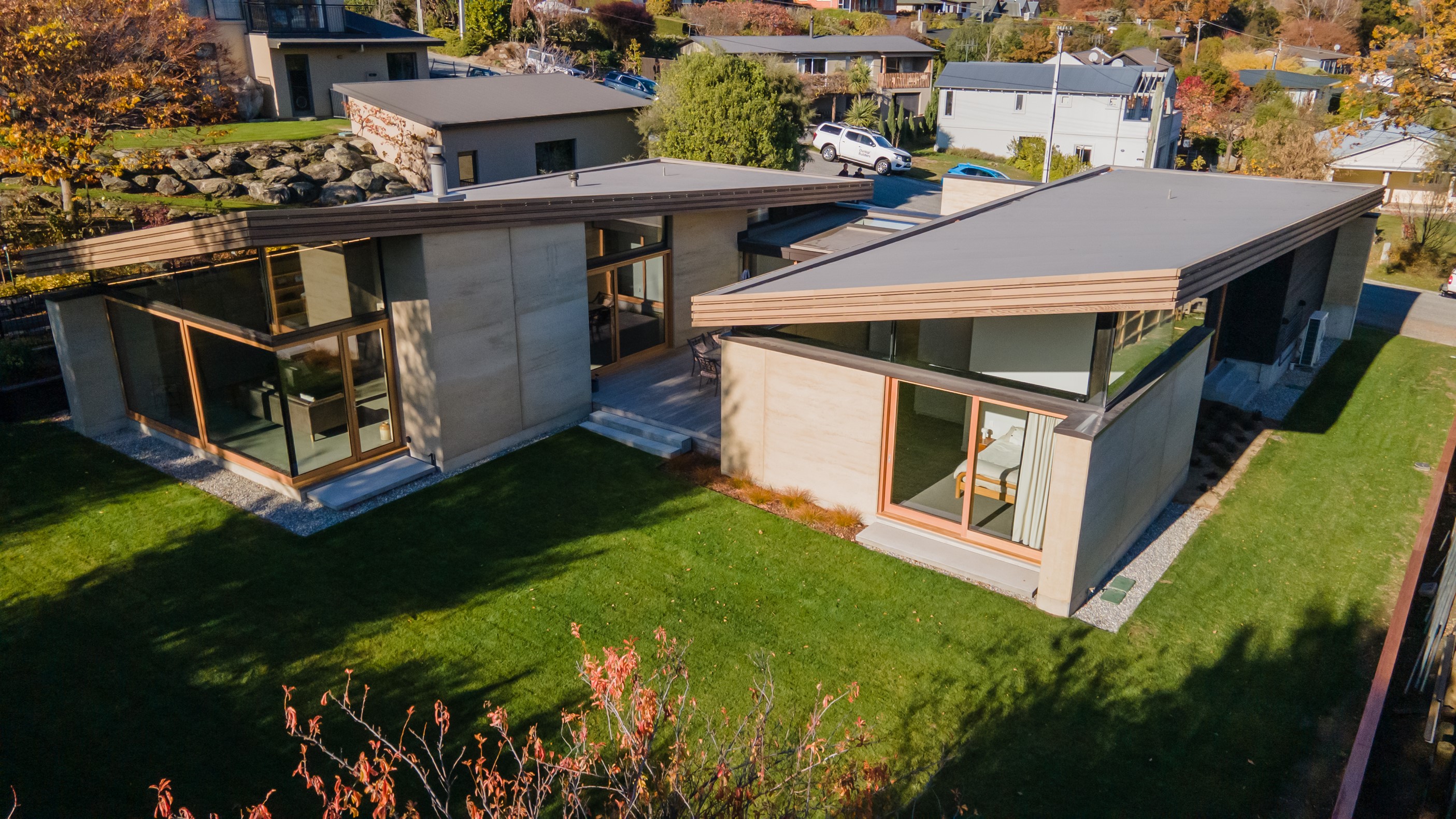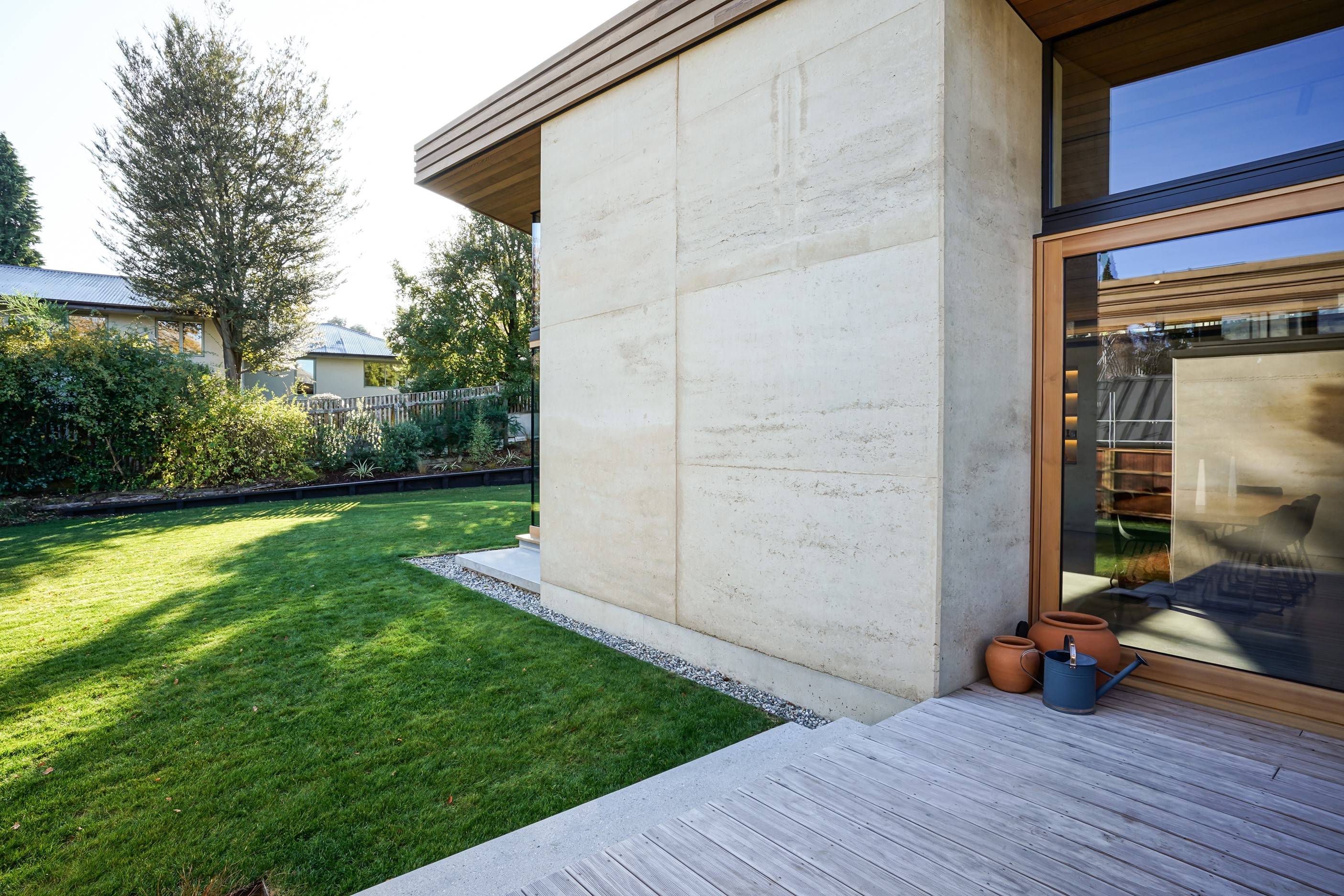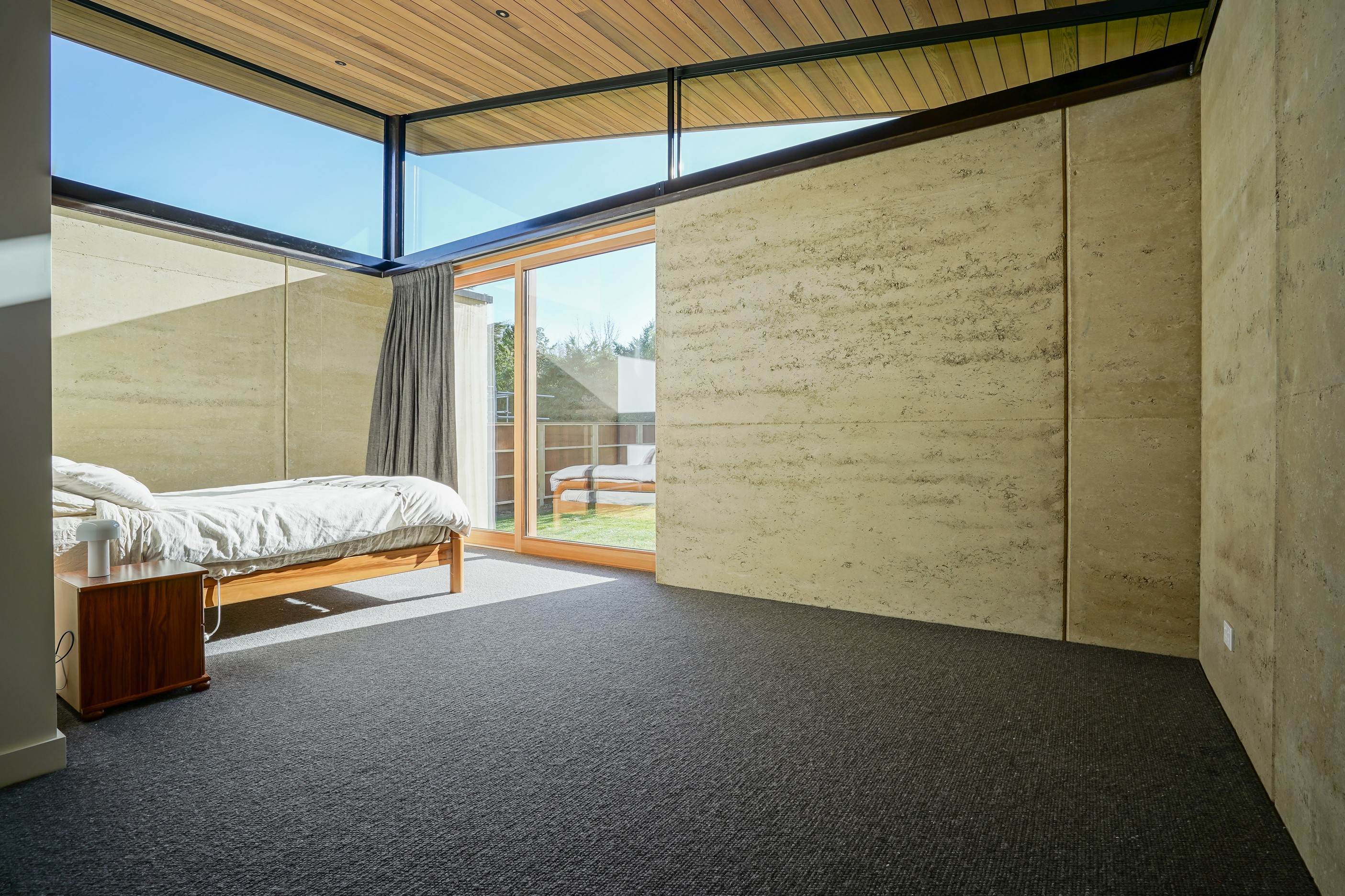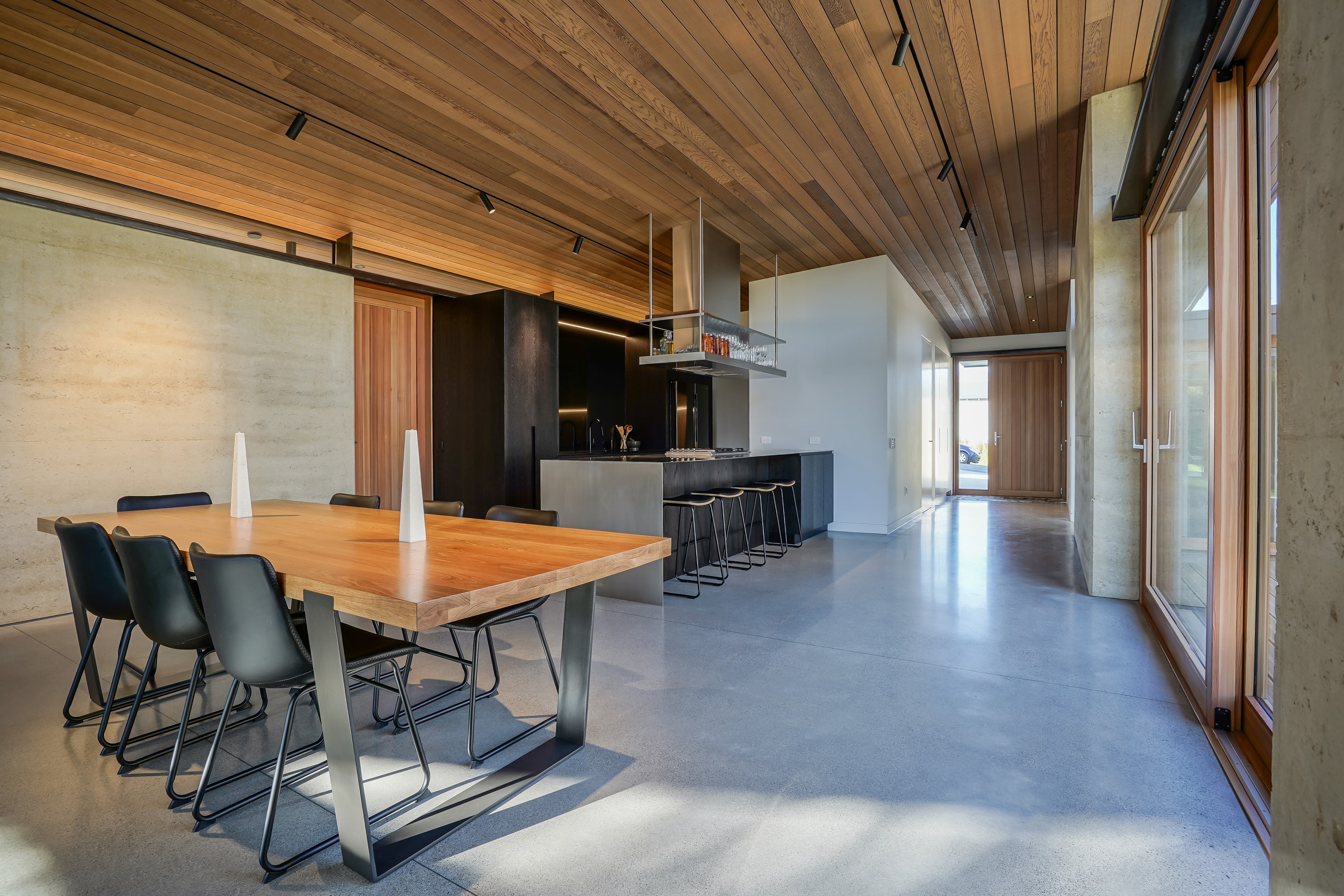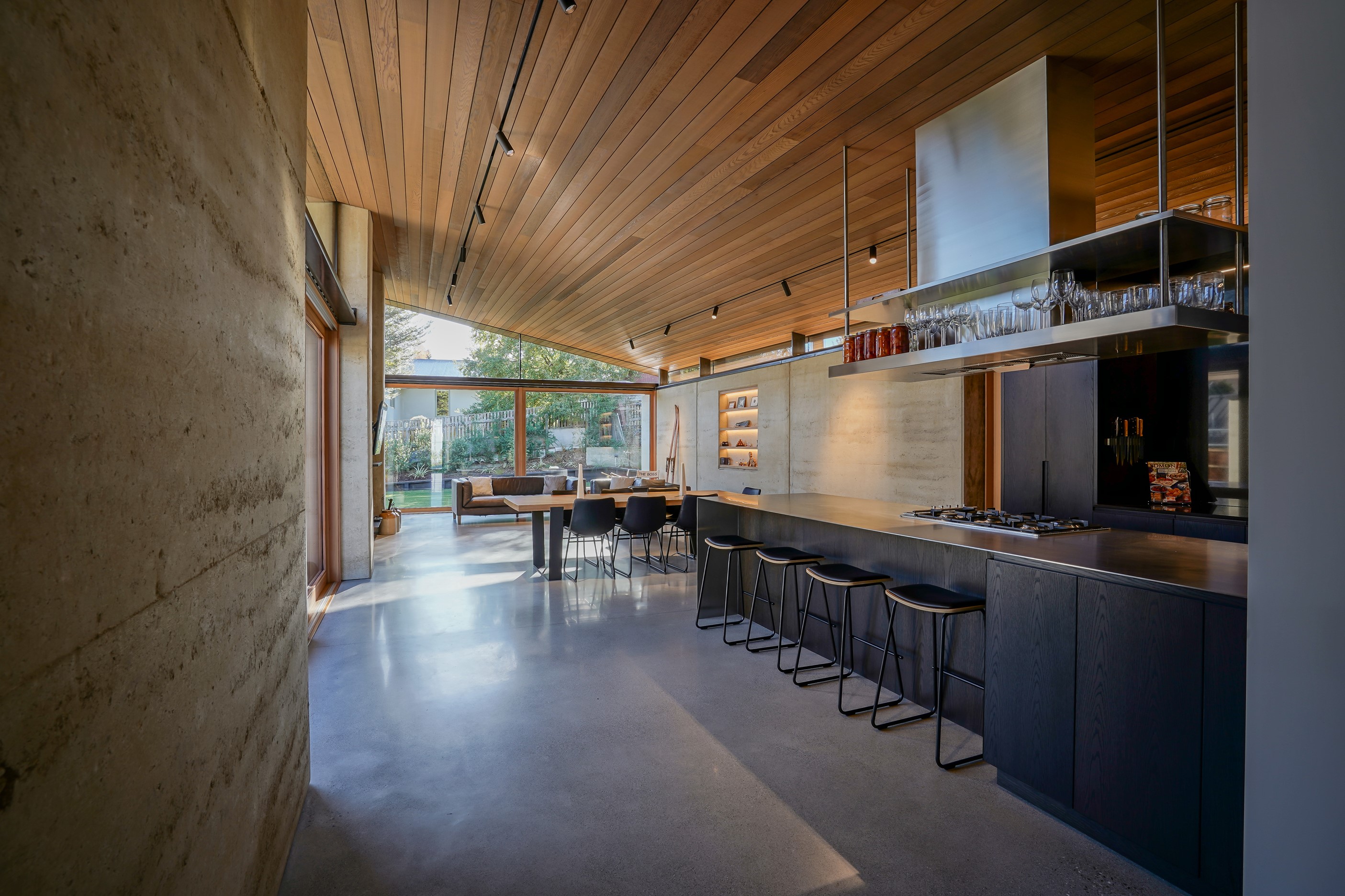 The phrase ‘shining example’ can be overused, but not in this instance. This 289sqm home is the result of a singular vision, a collaborative approach and a building team overcoming hurdles thrown up during the tumult of Covid lockdowns. Despite the owner and project manager being unable to visit from overseas, the team successfully delivered this complex three-bedroom build. Replacing an old family crib, the new house needed to be a place in which future generations would make memories. The owners also wanted to leave a positive legacy in the lakeside town. Their beautifully crafted, cutting-edge residence has monolithic rammed-earth walls and ‘twisted’ pavilion roofs as the undisputed stars. The sheer mass of the earth walls evoke a primal sense of shelter. The roof, which is supported on steel fins, required a high degree of technical skill. Inside, cedar ceilings and negative detailing with seamless wall joins belie the complexity of the work, which is precise and meticulous. Sustainability also influenced many key decisions, including using passive-house principles, local earth in the rammed walls, warm-roof technology and carbon-positive timber.