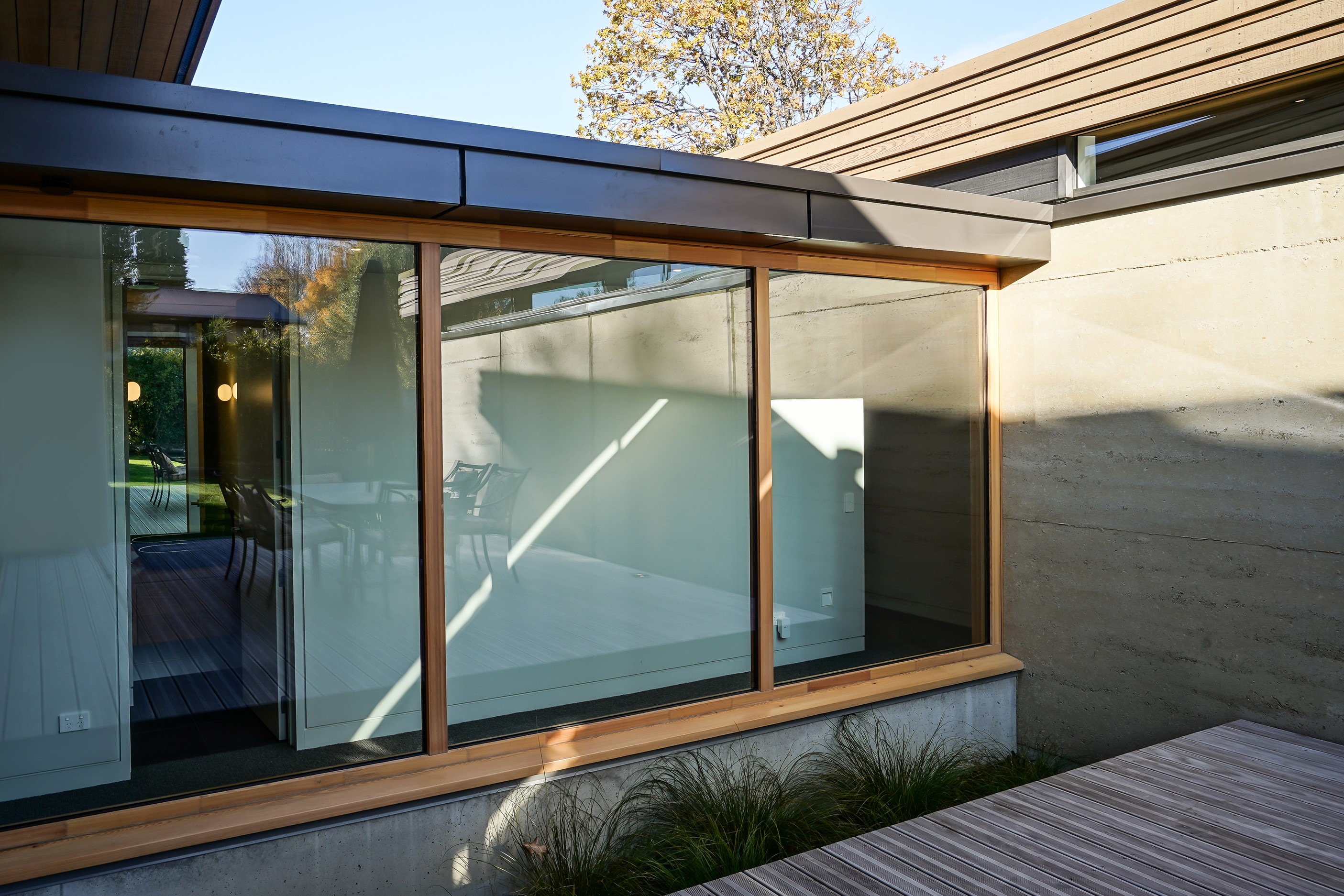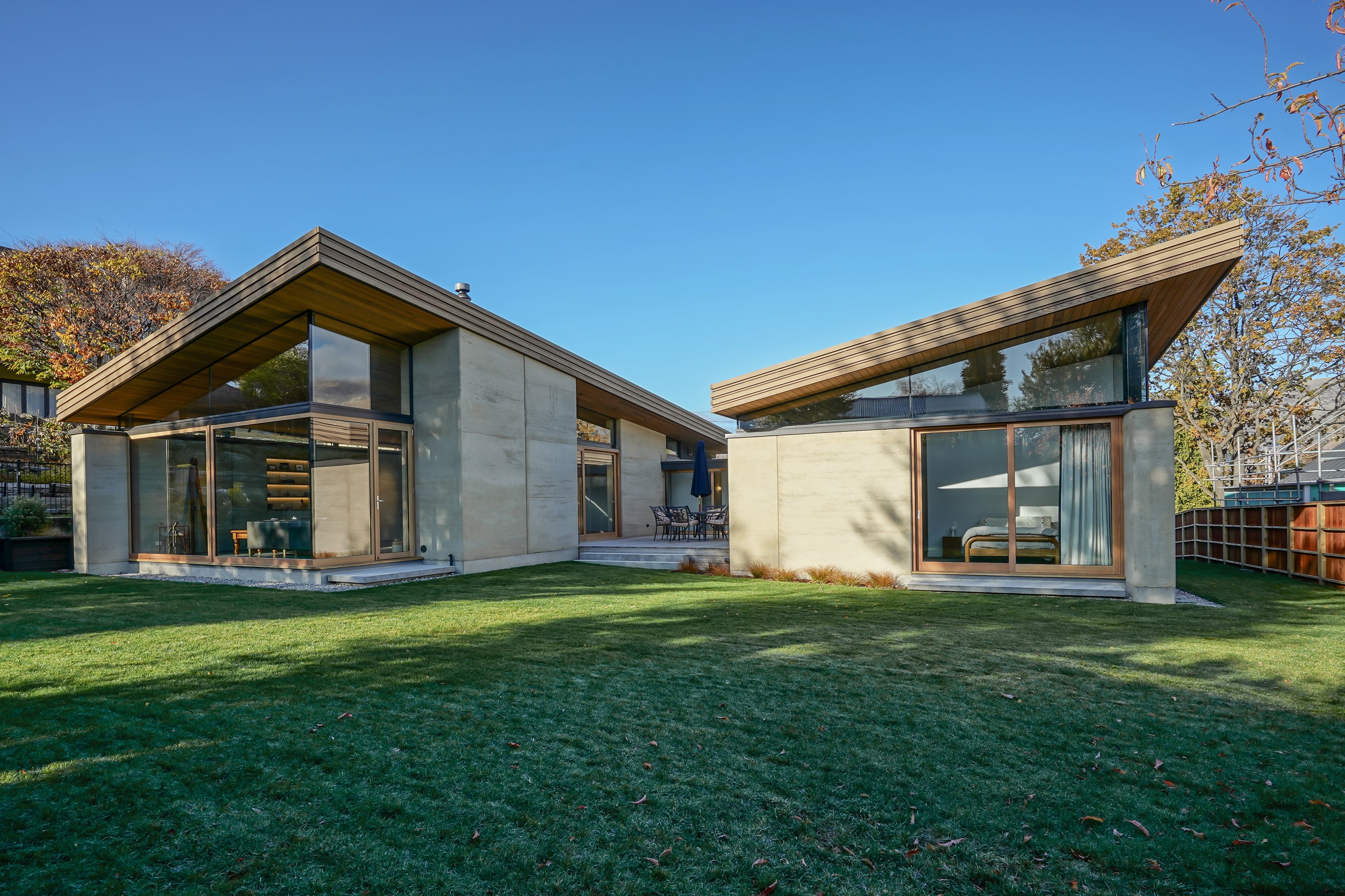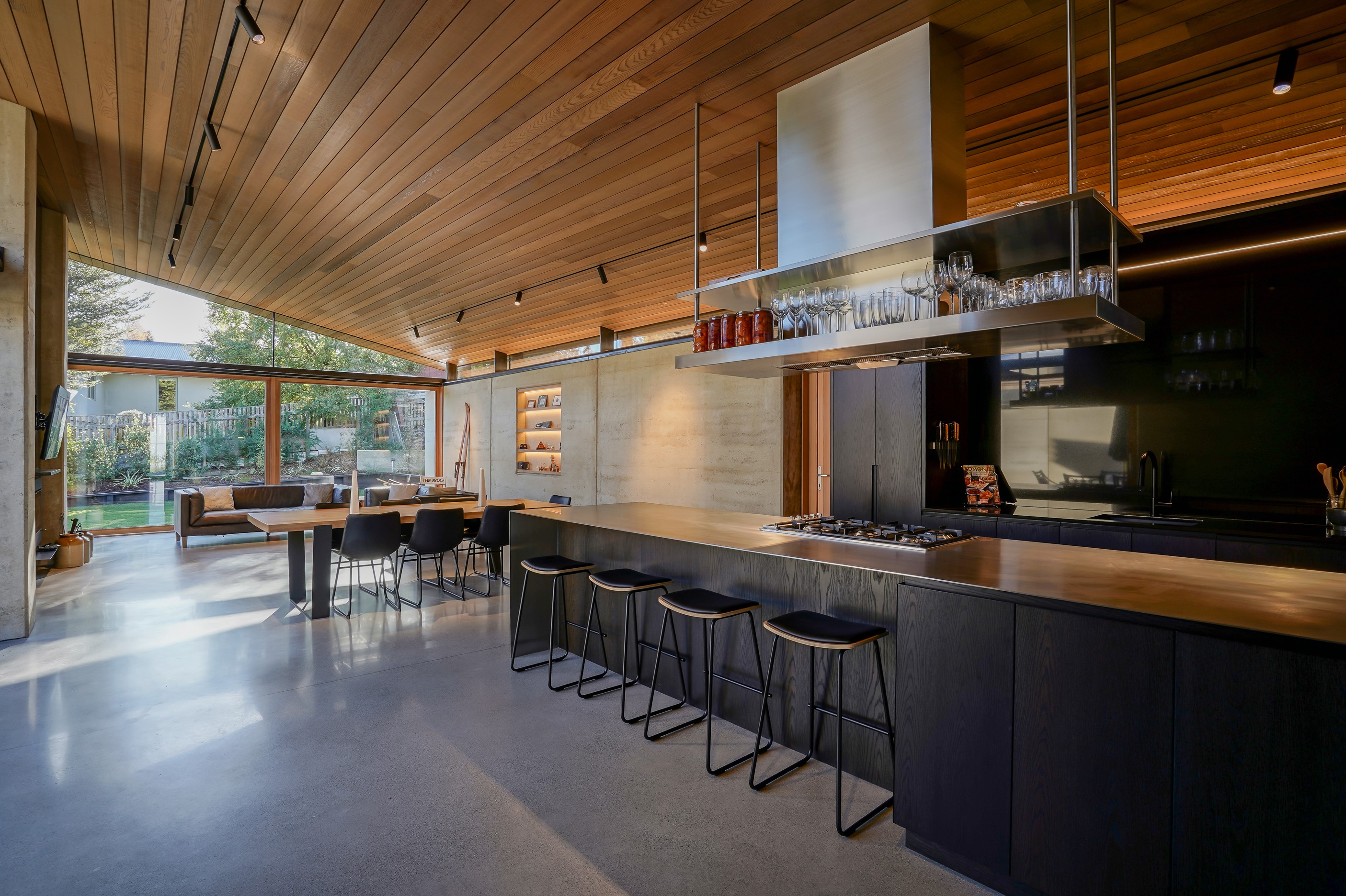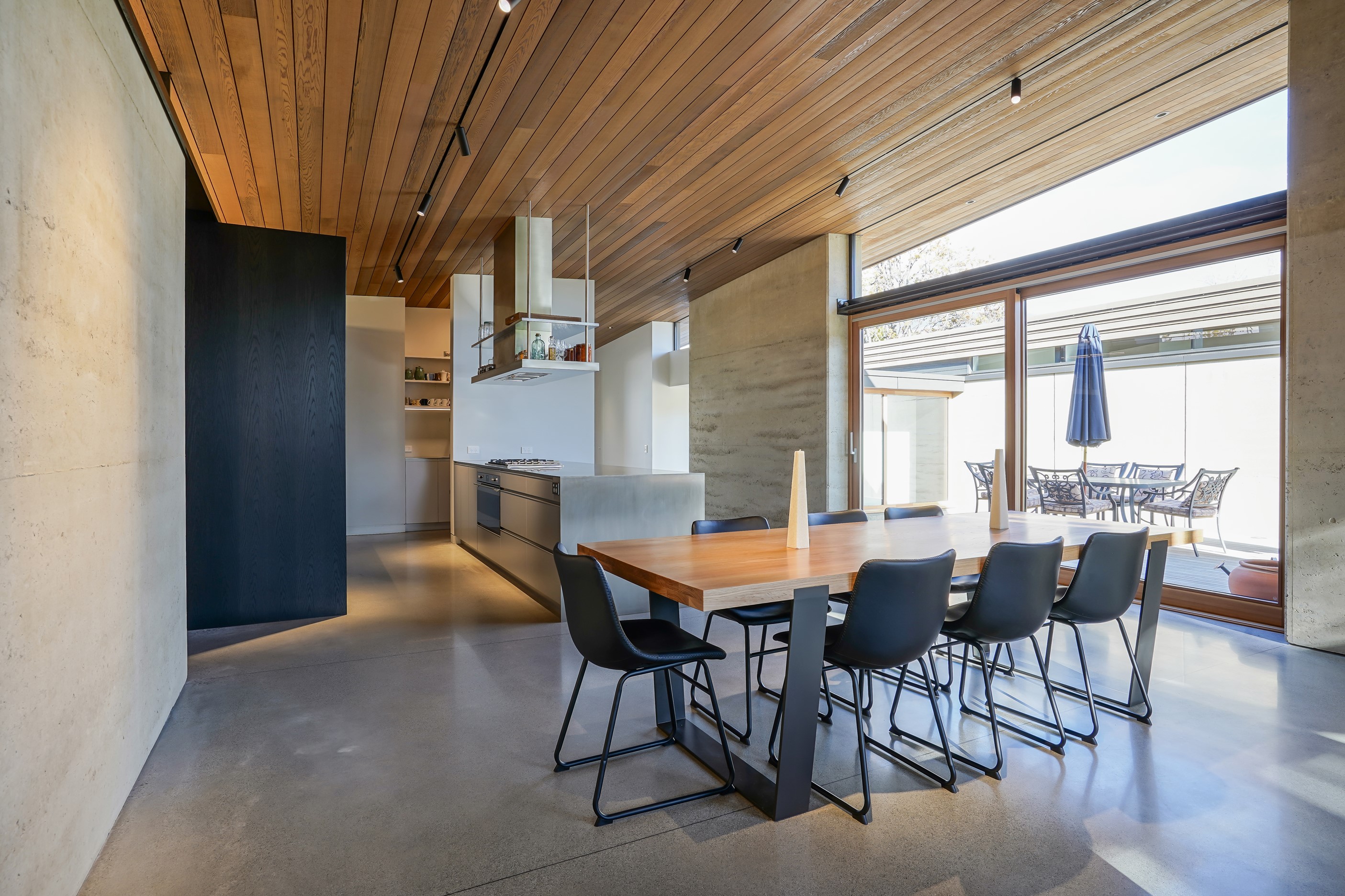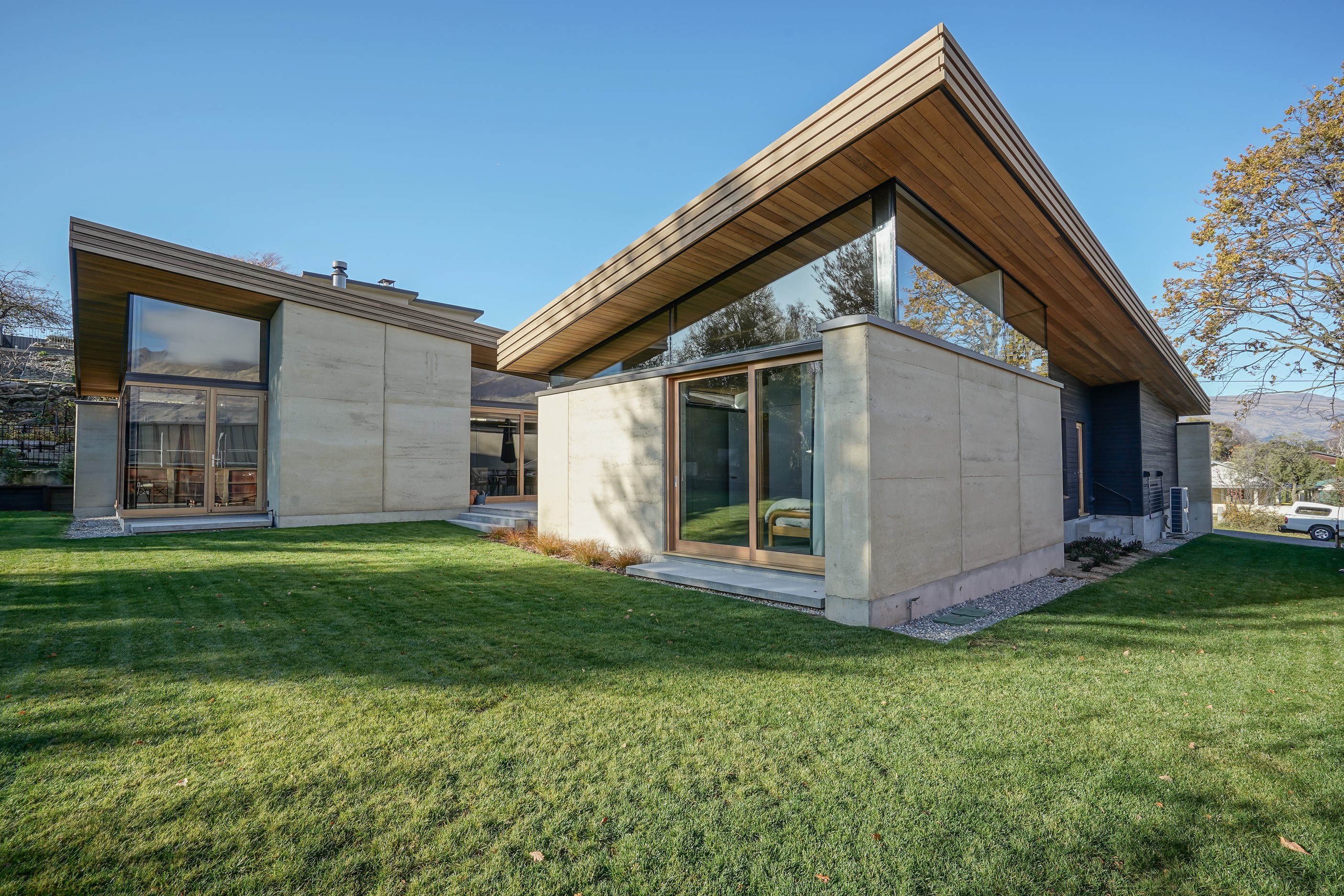 The phrase ‘shining example’ can be overused, but not in this instance. This 289sqm home is the result of a singular vision, a collaborative approach and a building team overcoming hurdles thrown up during the tumult of Covid lockdowns. Despite the owner and project manager being unable to visit from overseas, the team successfully delivered this complex three-bedroom build. Replacing an old family crib, the new house needed to be a place in which future generations would make memories. The owners also wanted to leave a positive legacy in the lakeside town. Their beautifully crafted, cutting-edge residence has monolithic rammed-earth walls and ‘twisted’ pavilion roofs as the undisputed stars. The sheer mass of the earth walls evoke a primal sense of shelter. The roof, which is supported on steel fins, required a high degree of technical skill. Inside, cedar ceilings and negative detailing with seamless wall joins belie the complexity of the work, which is precise and meticulous. Sustainability also influenced many key decisions, including using passive-house principles, local earth in the rammed walls, warm-roof technology and carbon-positive timber.