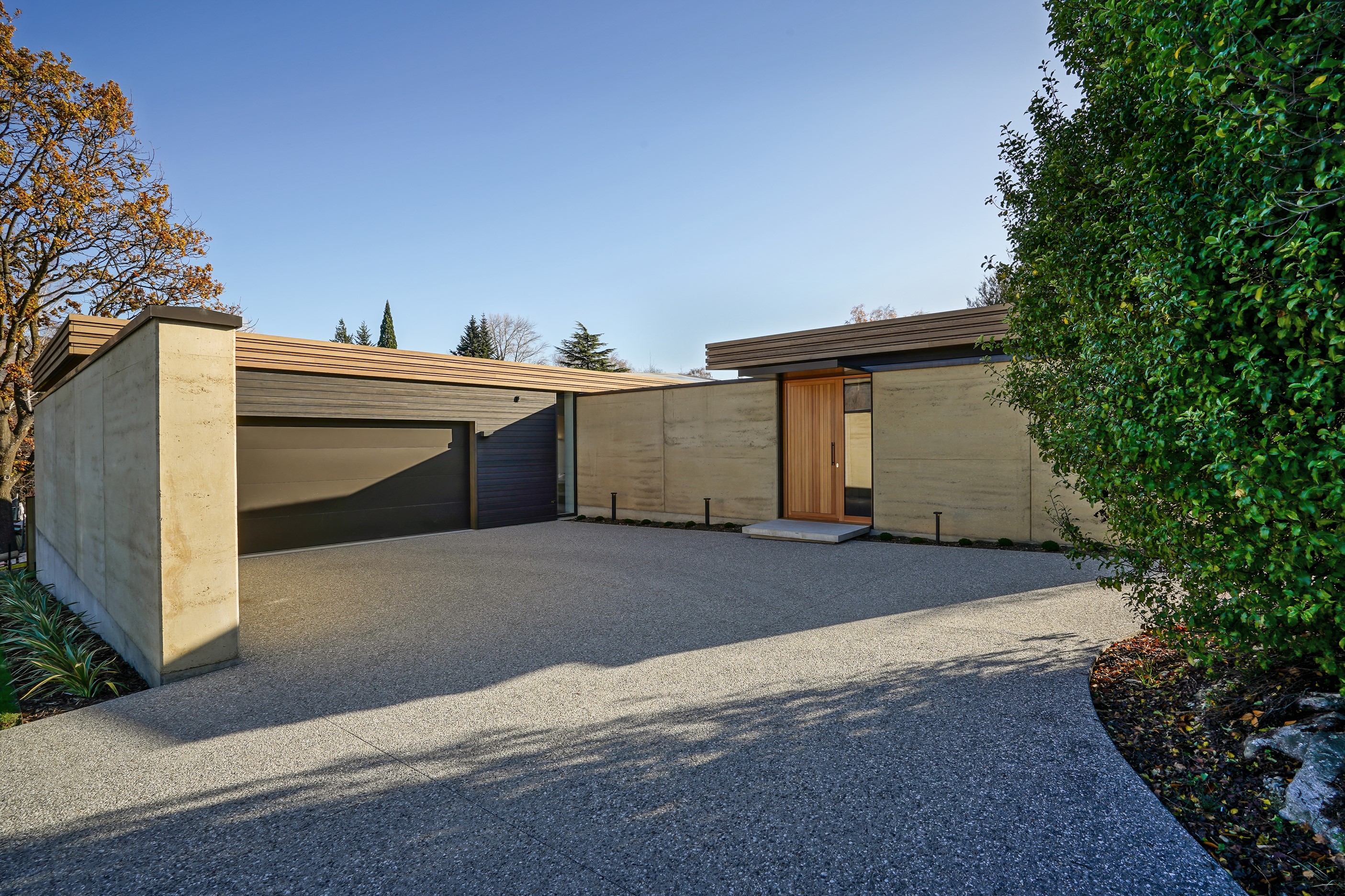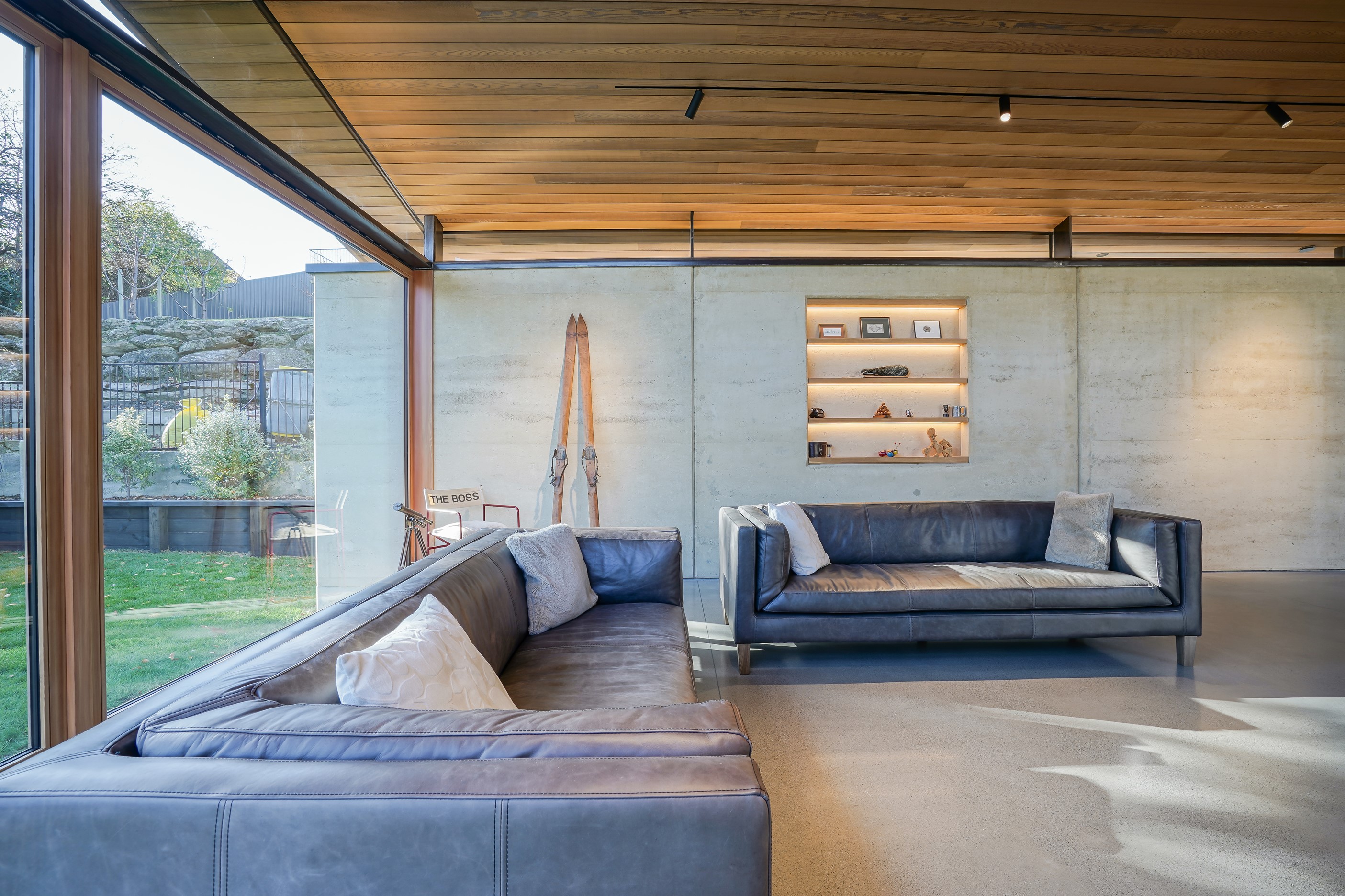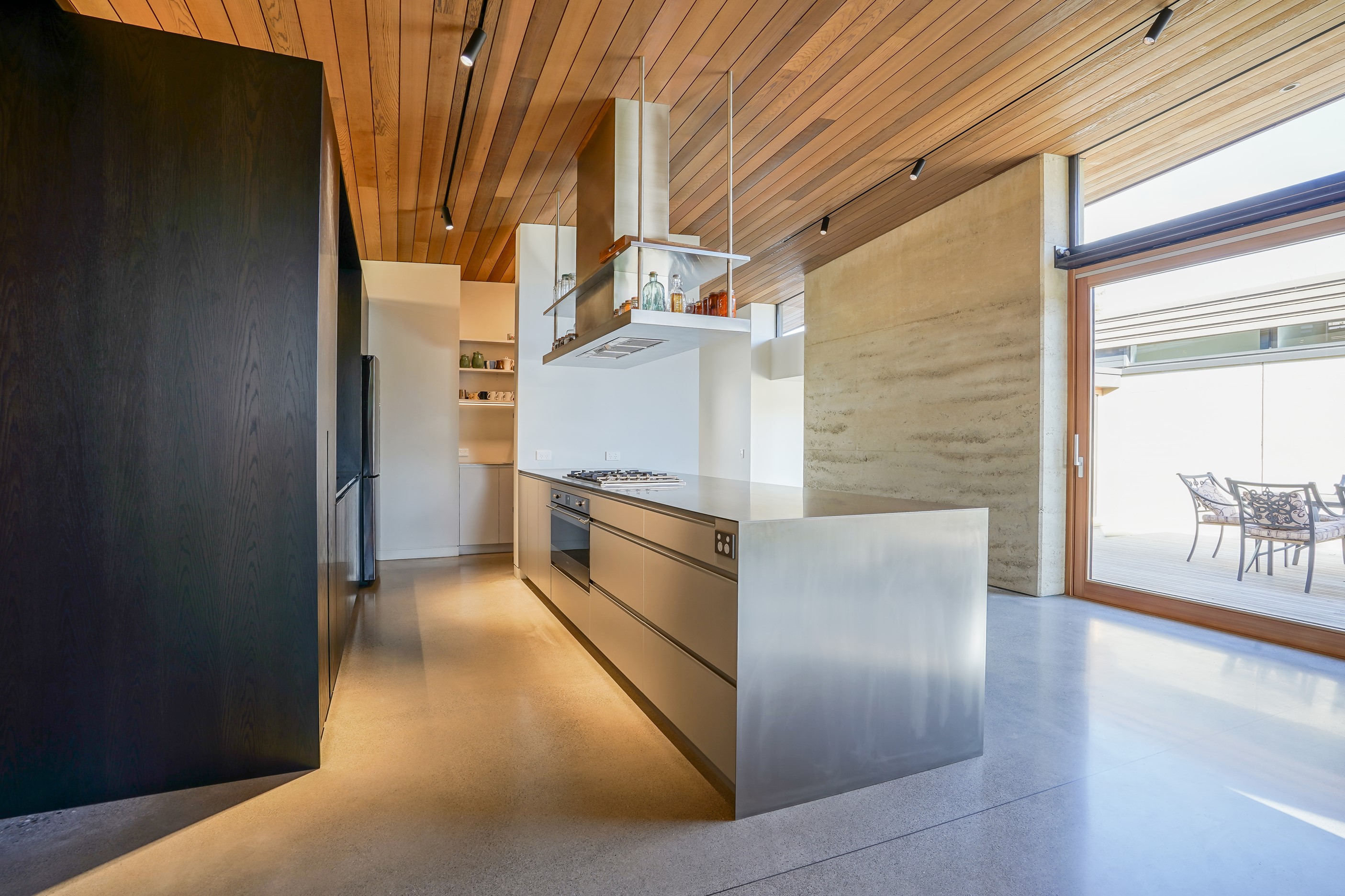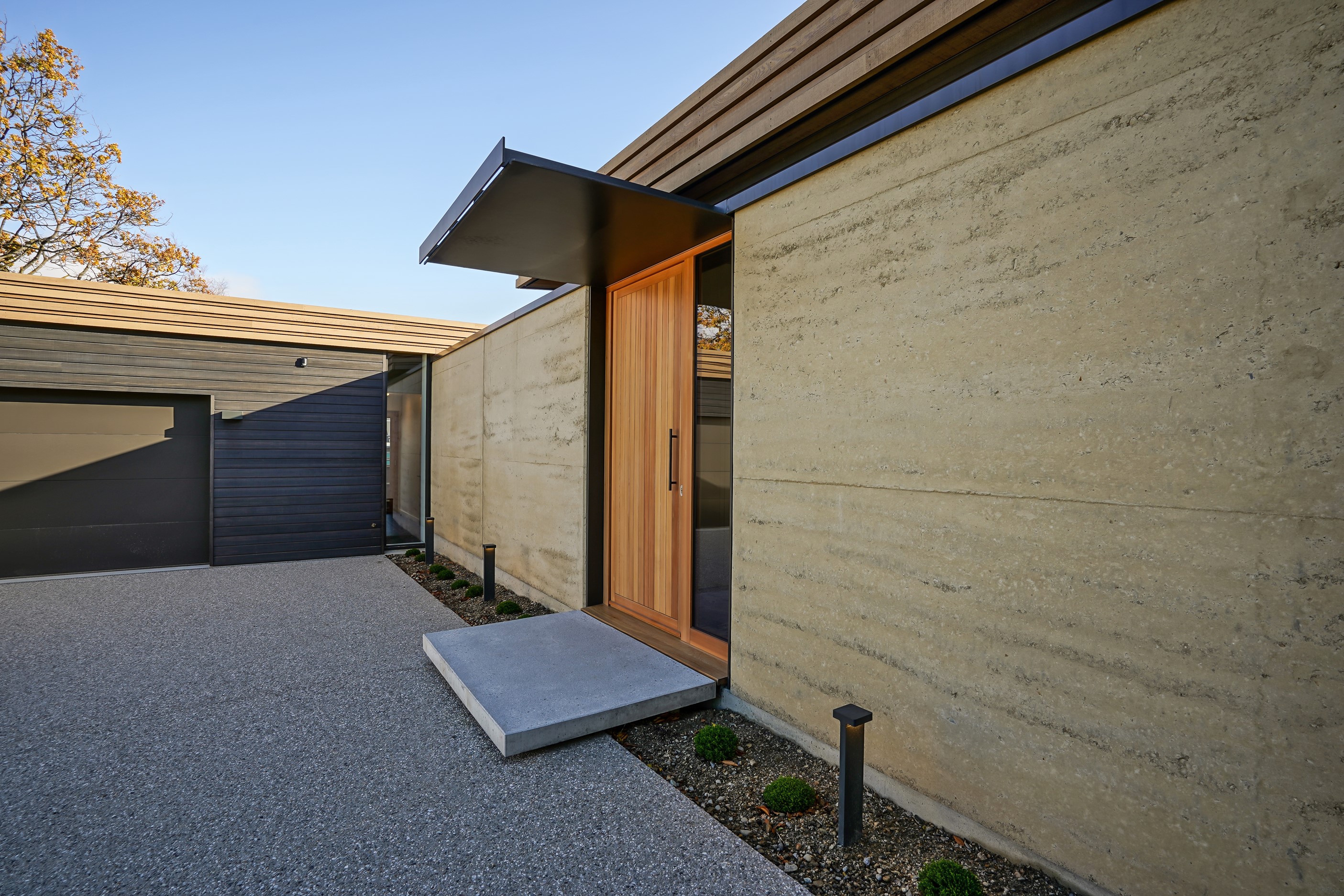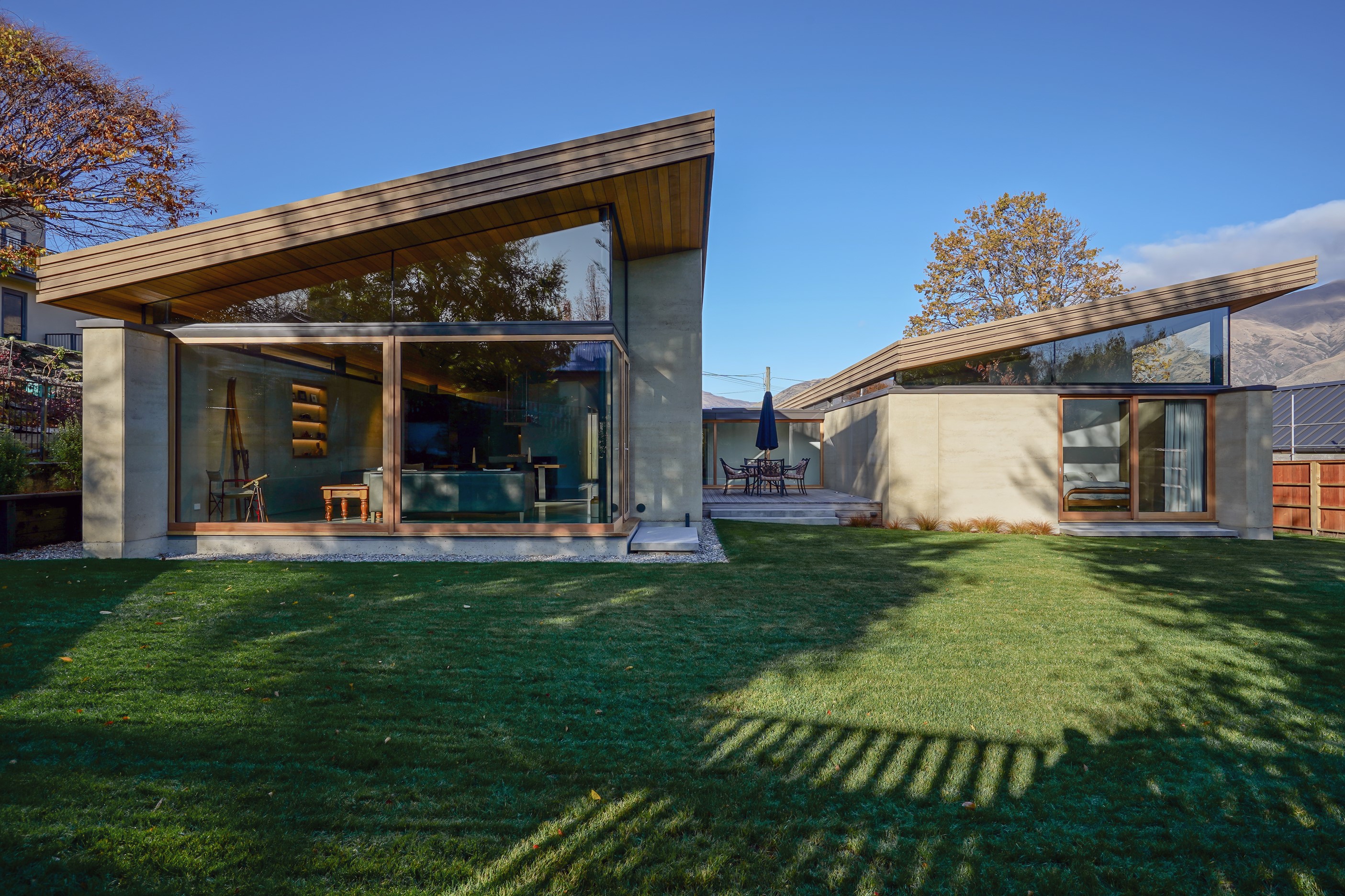The phrase ‘shining example’ can be overused, but not in this instance. This 289sqm home is the result of a singular vision, a collaborative approach and a building team overcoming hurdles thrown up during the tumult of Covid lockdowns. Despite the owner and project manager being unable to visit from overseas, the team successfully delivered this complex three-bedroom build. Replacing an old family crib, the new house needed to be a place in which future generations would make memories. The owners also wanted to leave a positive legacy in the lakeside town. Their beautifully crafted, cutting-edge residence has monolithic rammed-earth walls and ‘twisted’ pavilion roofs as the undisputed stars. The sheer mass of the earth walls evoke a primal sense of shelter. The roof, which is supported on steel fins, required a high degree of technical skill. Inside, cedar ceilings and negative detailing with seamless wall joins belie the complexity of the work, which is precise and meticulous. Sustainability also influenced many key decisions, including using passive-house principles, local earth in the rammed walls, warm-roof technology and carbon-positive timber.