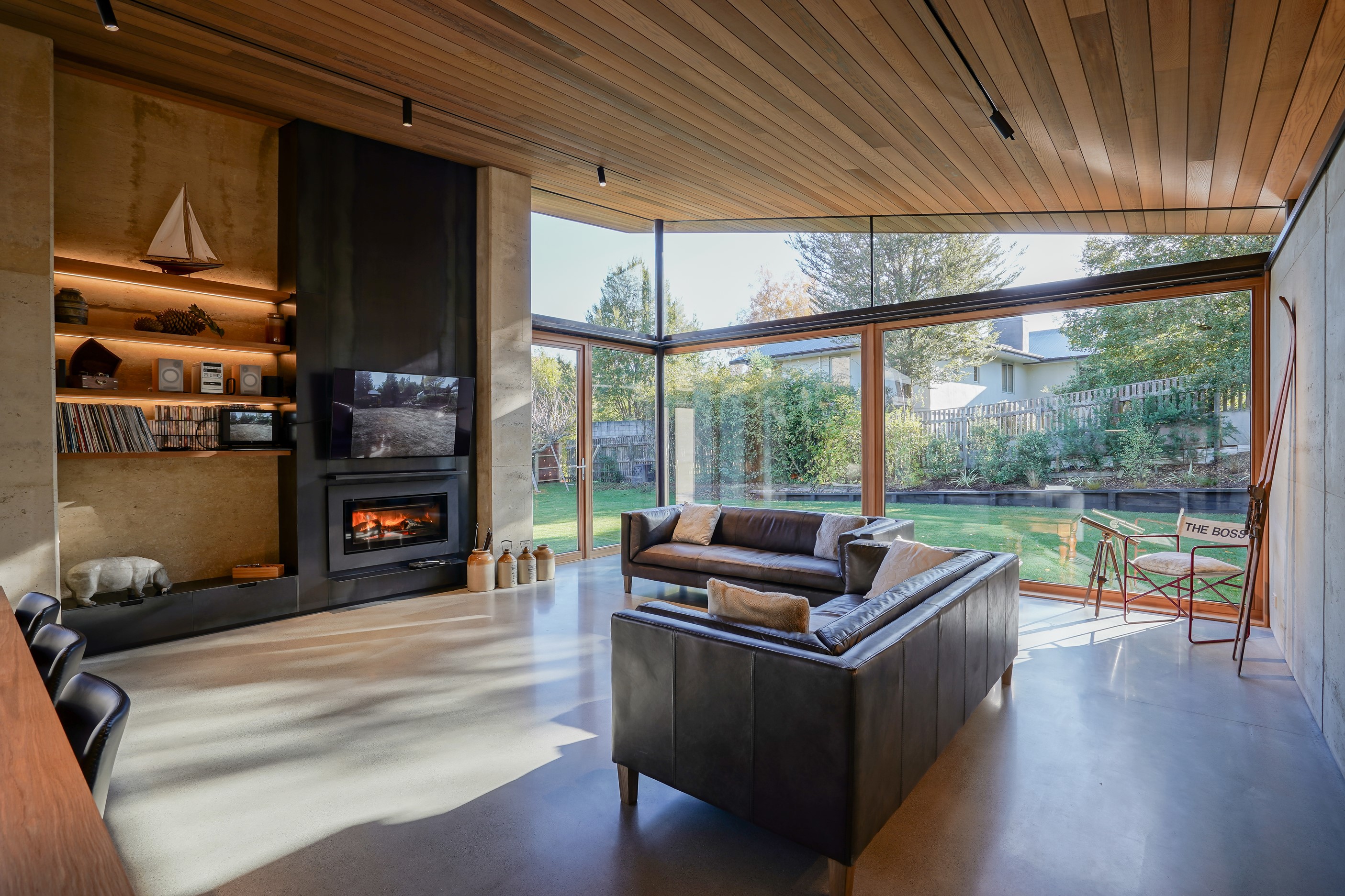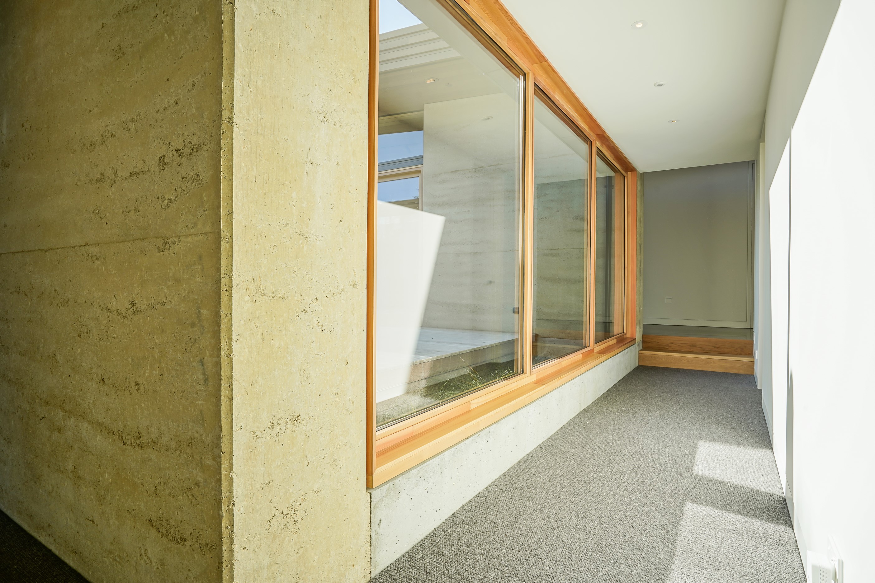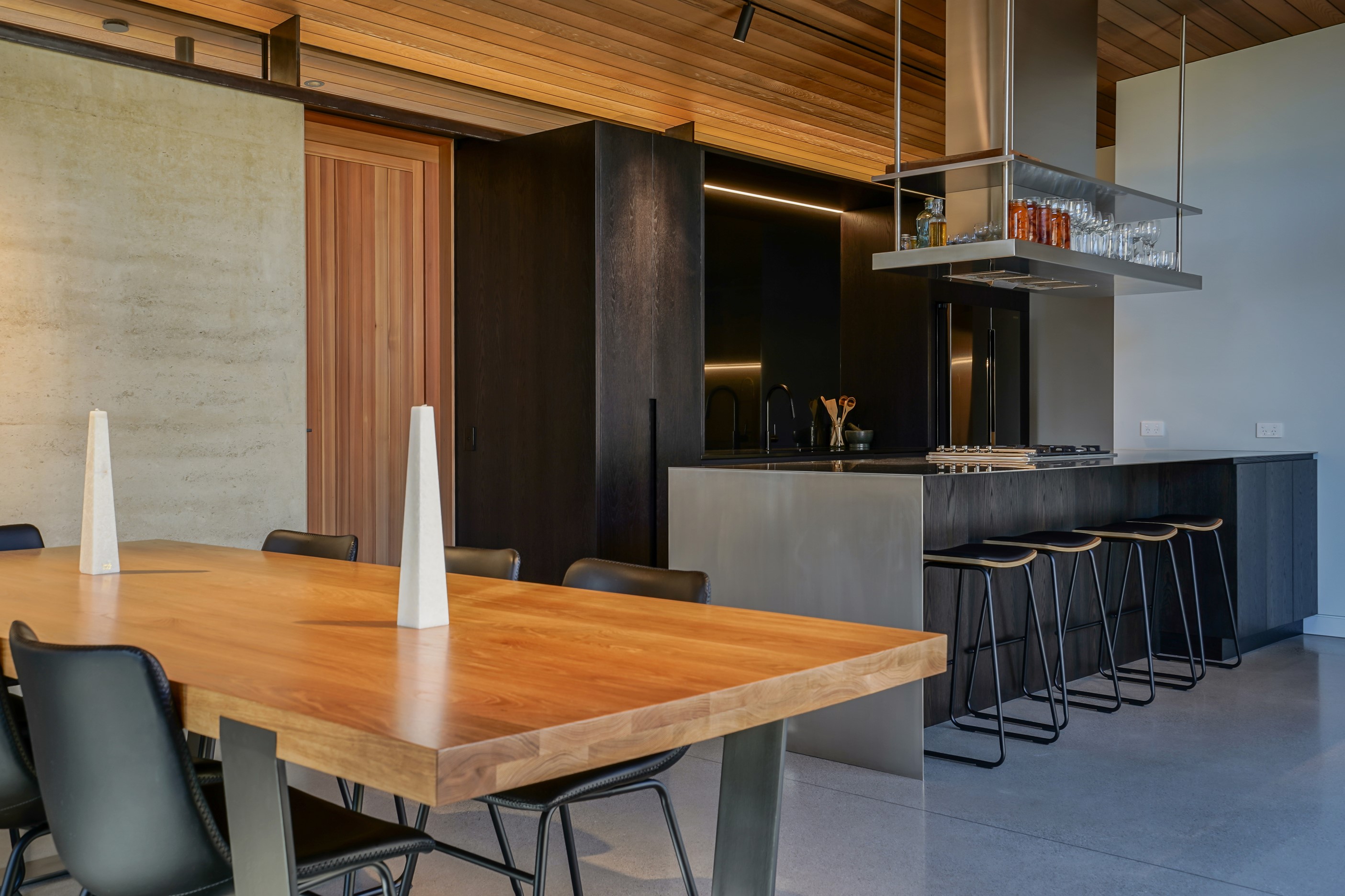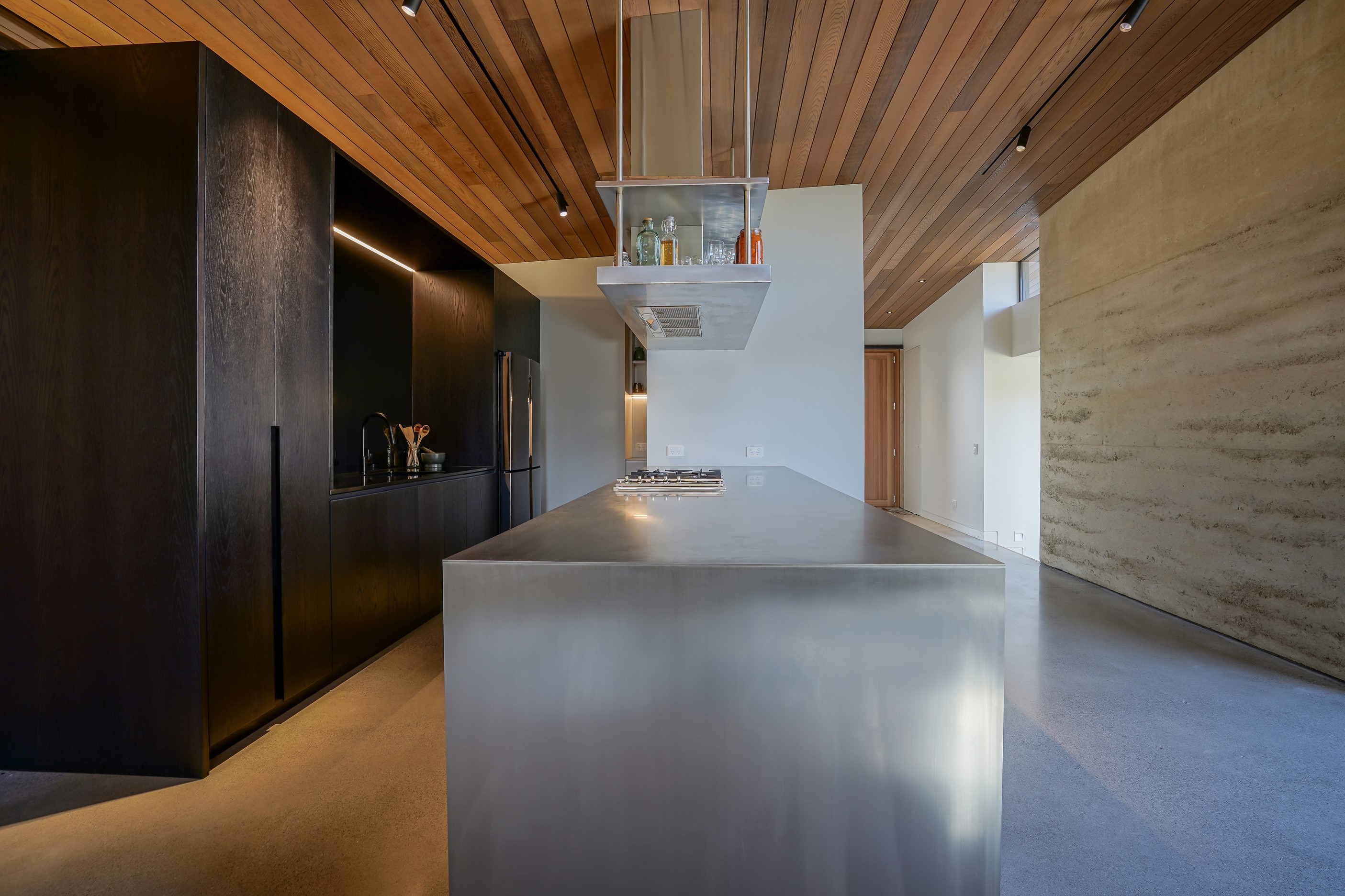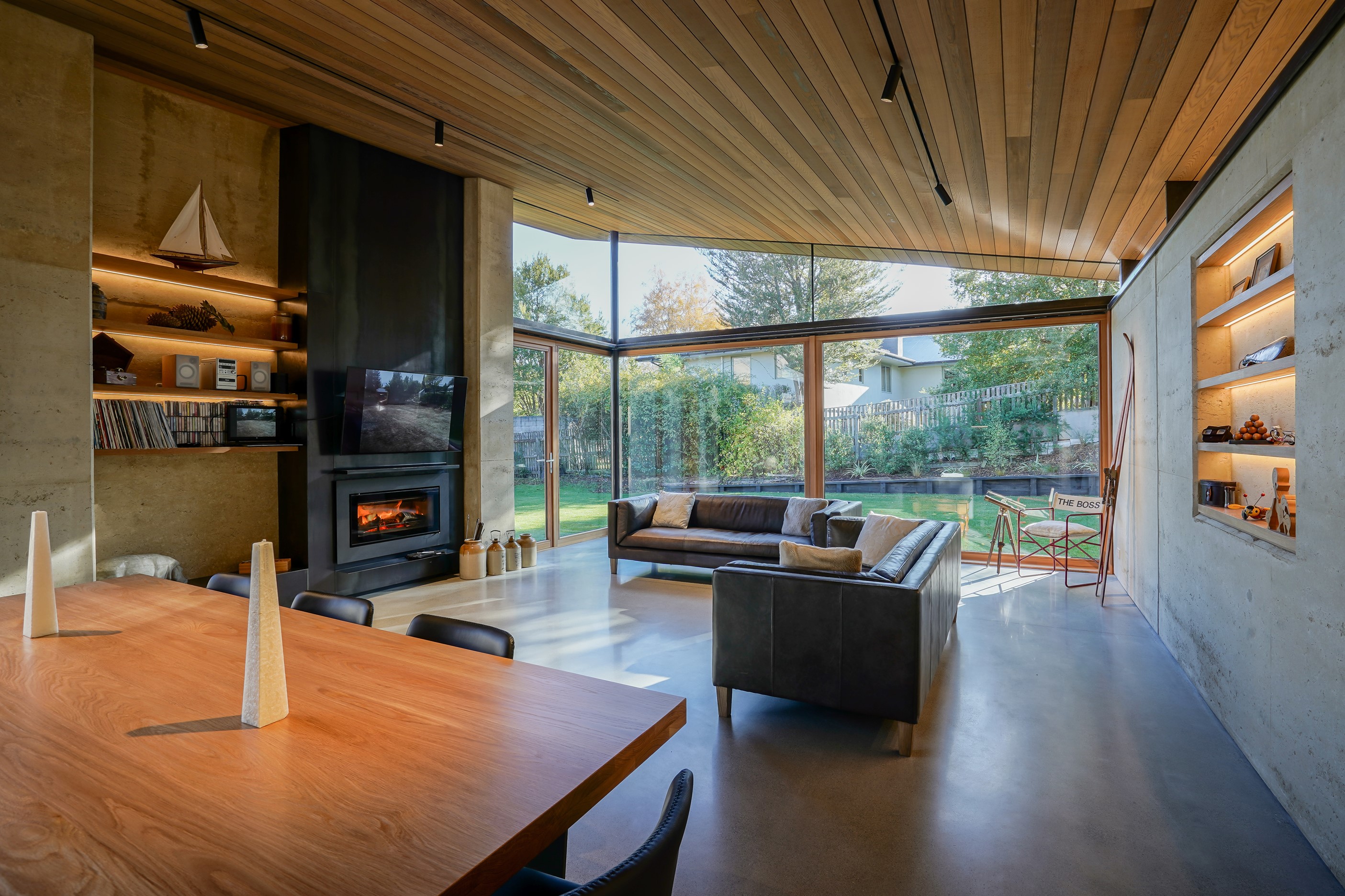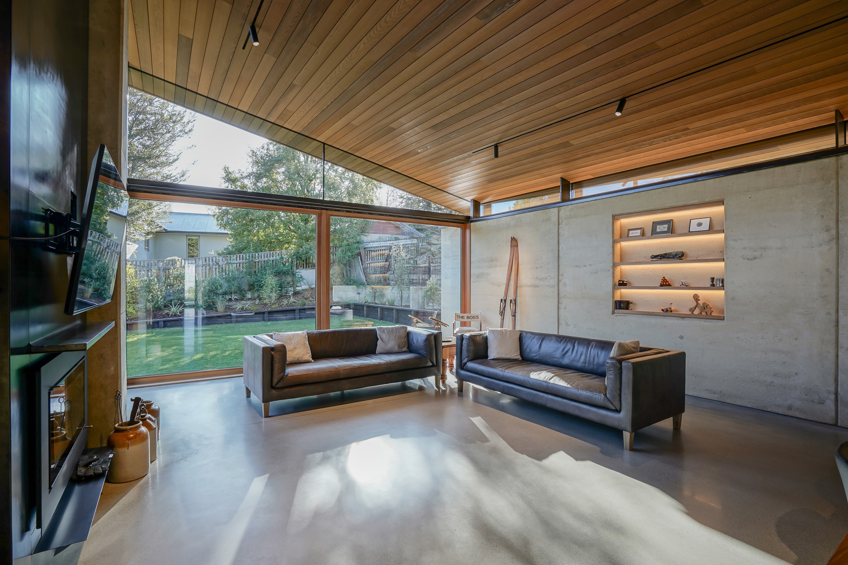The phrase ‘shining example’ can be overused, but not in this instance. This 289sqm home is the result of a singular vision, a collaborative approach and a building team overcoming hurdles thrown up during the tumult of Covid lockdowns. Despite the owner and project manager being unable to visit from overseas, the team successfully delivered this complex three-bedroom build. Replacing an old family crib, the new house needed to be a place in which future generations would make memories. The owners also wanted to leave a positive legacy in the lakeside town. Their beautifully crafted, cutting-edge residence has monolithic rammed-earth walls and ‘twisted’ pavilion roofs as the undisputed stars. The sheer mass of the earth walls evoke a primal sense of shelter. The roof, which is supported on steel fins, required a high degree of technical skill. Inside, cedar ceilings and negative detailing with seamless wall joins belie the complexity of the work, which is precise and meticulous. Sustainability also influenced many key decisions, including using passive-house principles, local earth in the rammed walls, warm-roof technology and carbon-positive timber.