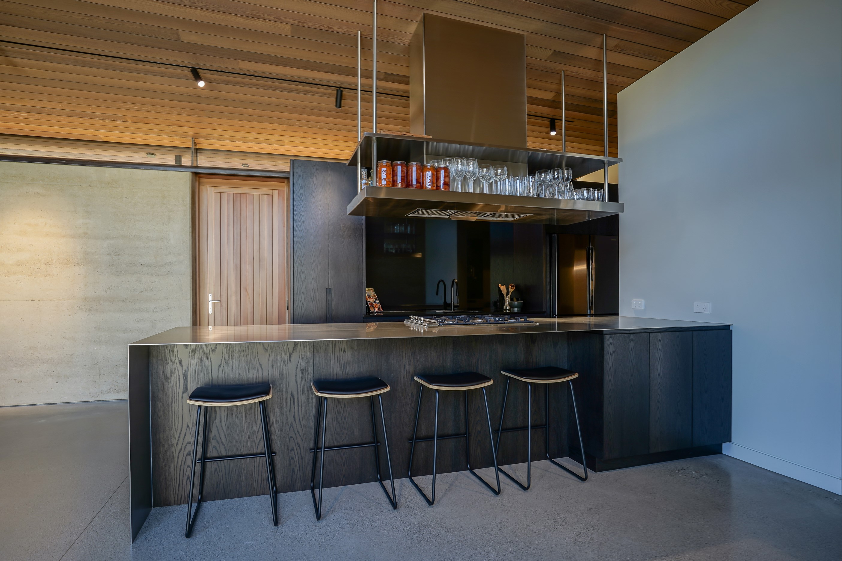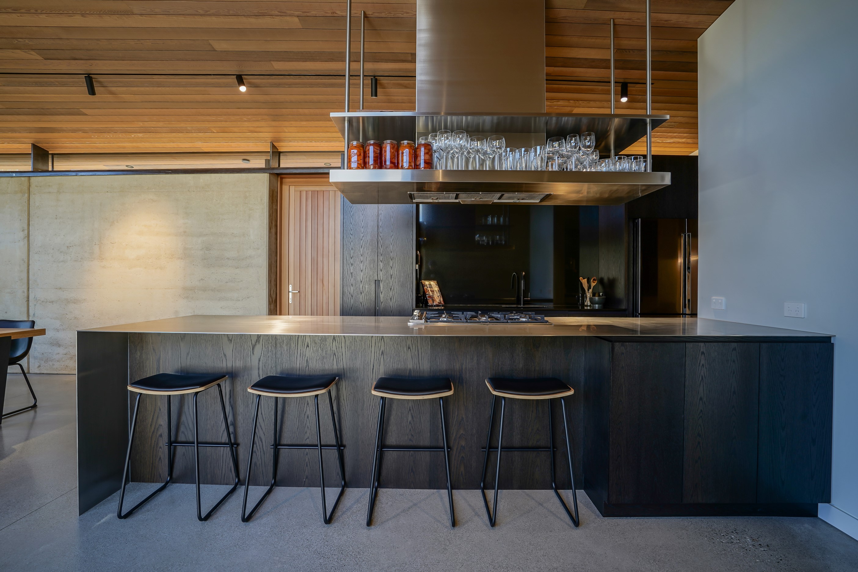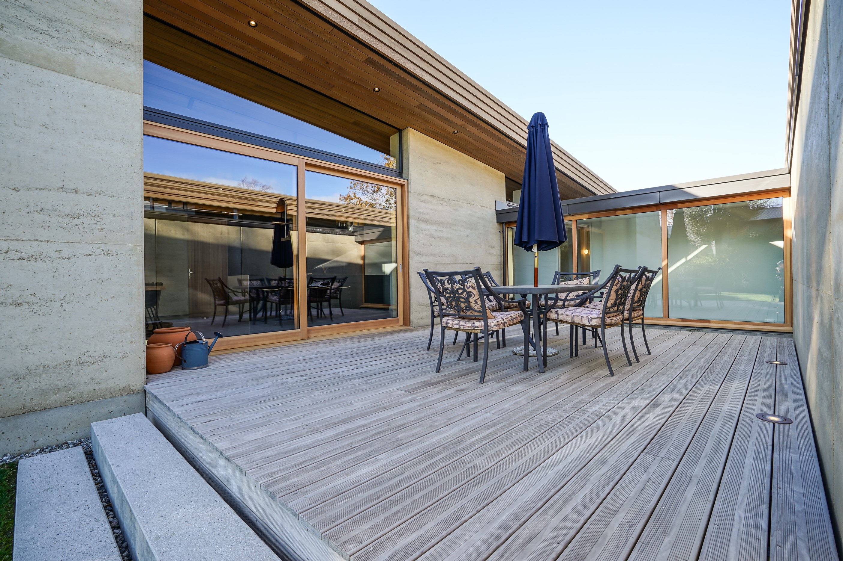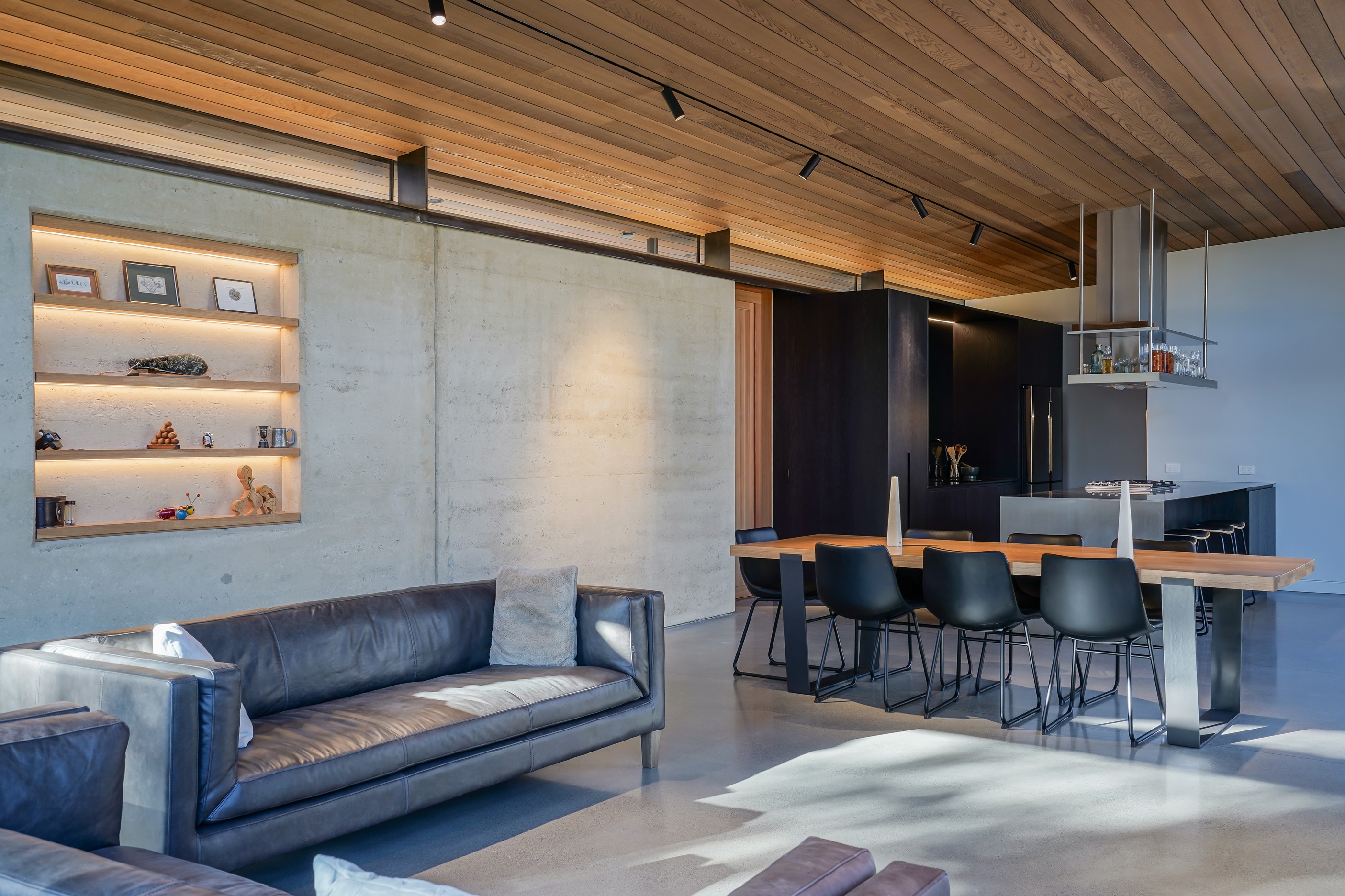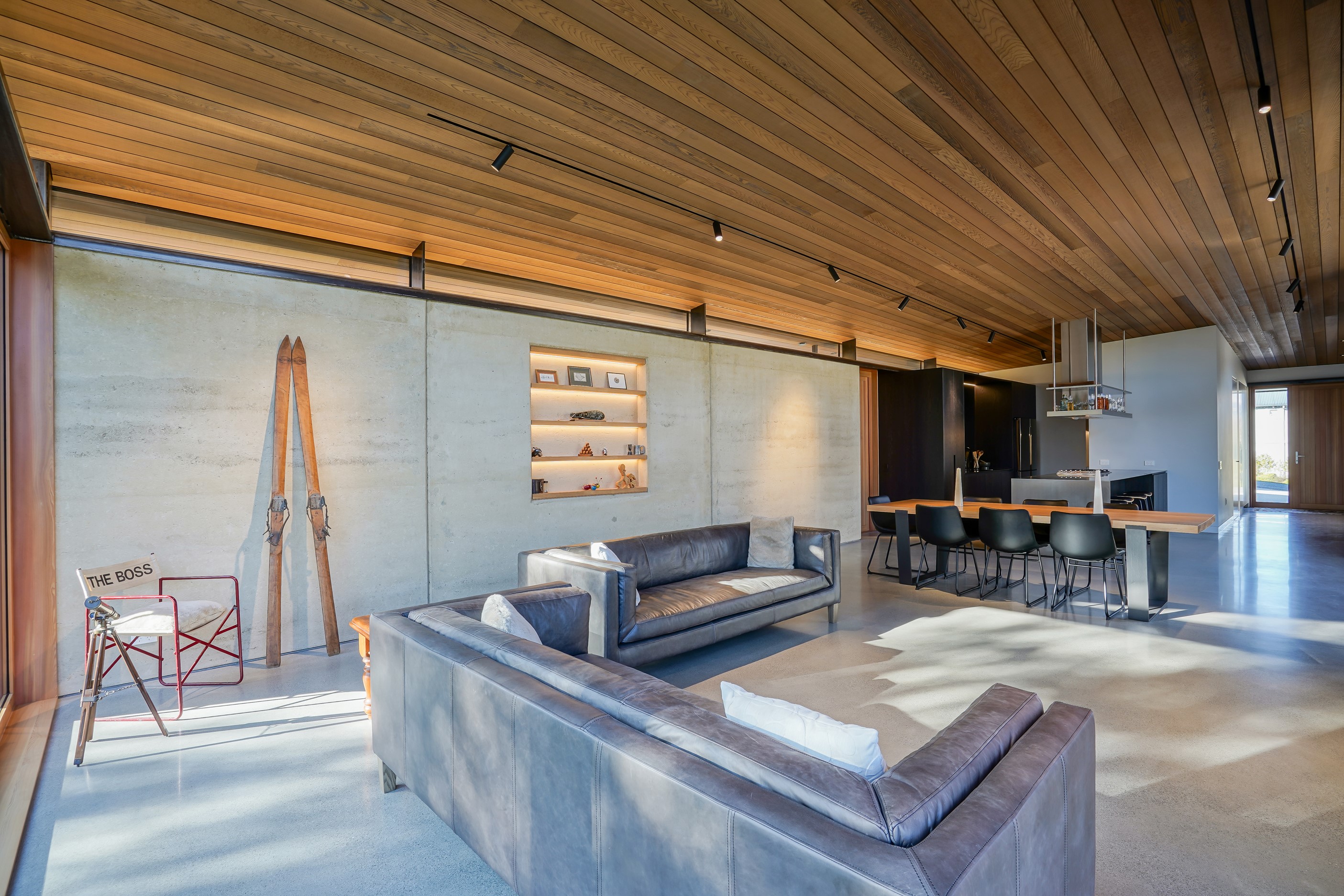 The phrase ‘shining example’ can be overused, but not in this instance. This 289sqm home is the result of a singular vision, a collaborative approach and a building team overcoming hurdles thrown up during the tumult of Covid lockdowns. Despite the owner and project manager being unable to visit from overseas, the team successfully delivered this complex three-bedroom build. Replacing an old family crib, the new house needed to be a place in which future generations would make memories. The owners also wanted to leave a positive legacy in the lakeside town. Their beautifully crafted, cutting-edge residence has monolithic rammed-earth walls and ‘twisted’ pavilion roofs as the undisputed stars. The sheer mass of the earth walls evoke a primal sense of shelter. The roof, which is supported on steel fins, required a high degree of technical skill. Inside, cedar ceilings and negative detailing with seamless wall joins belie the complexity of the work, which is precise and meticulous. Sustainability also influenced many key decisions, including using passive-house principles, local earth in the rammed walls, warm-roof technology and carbon-positive timber.