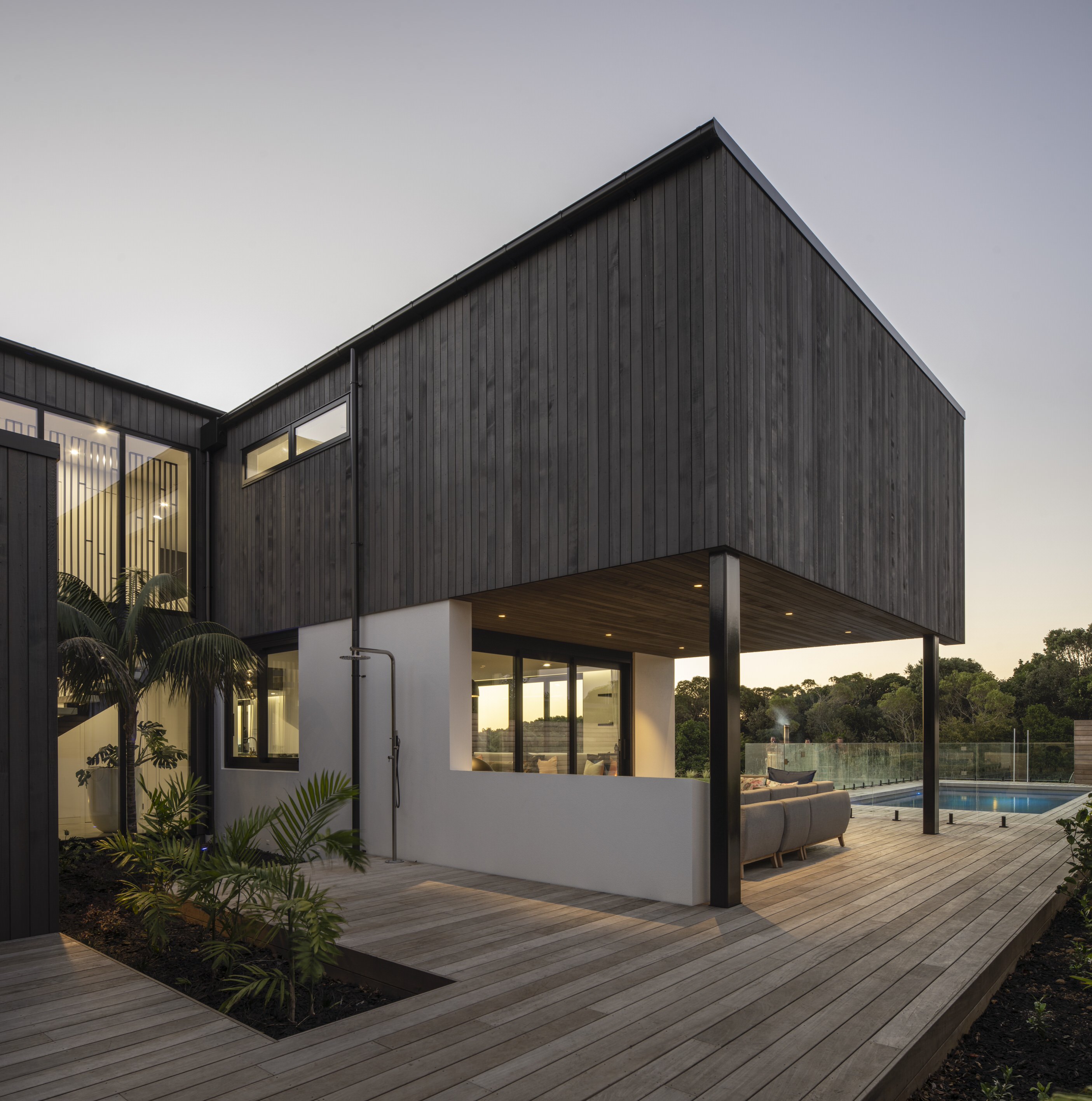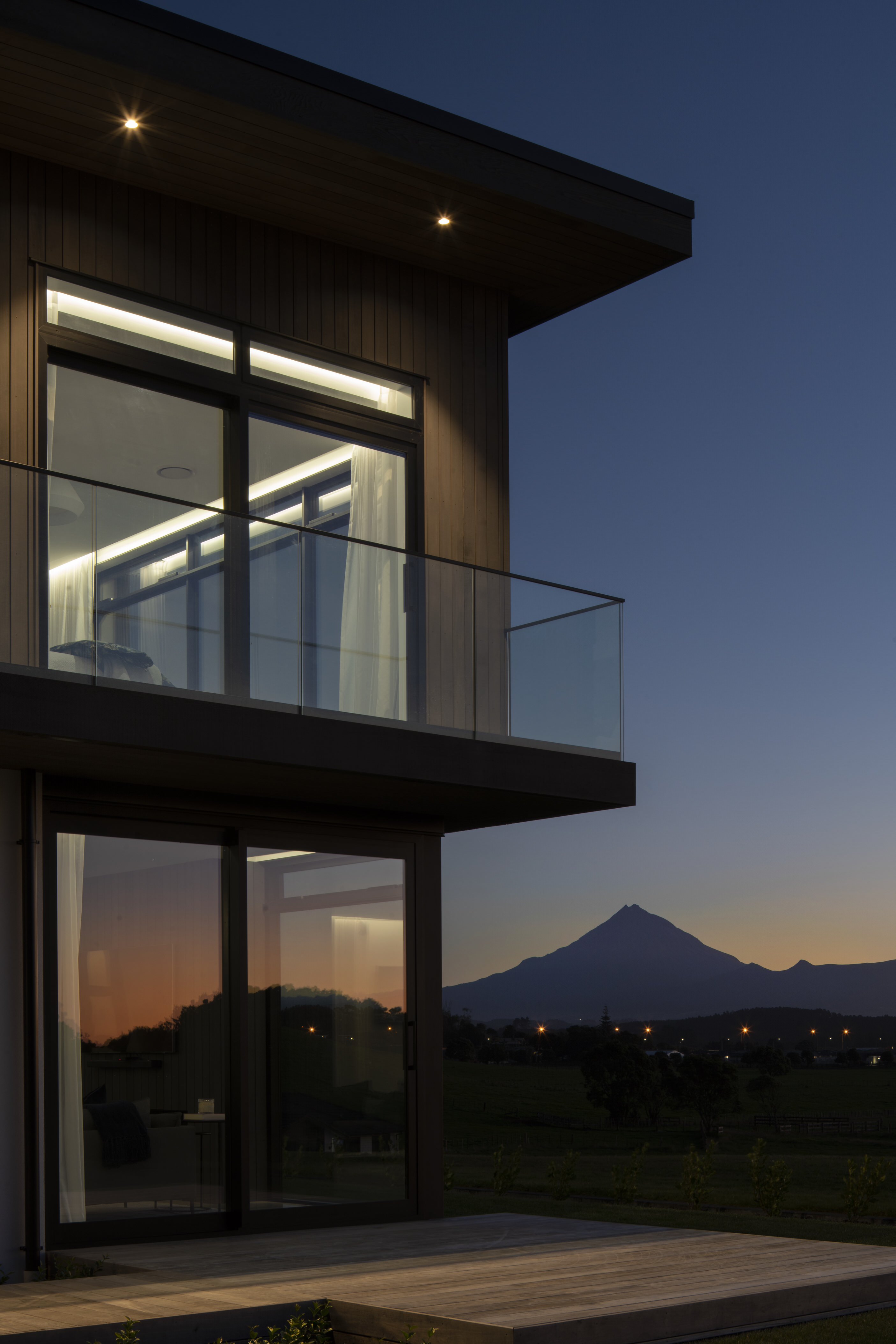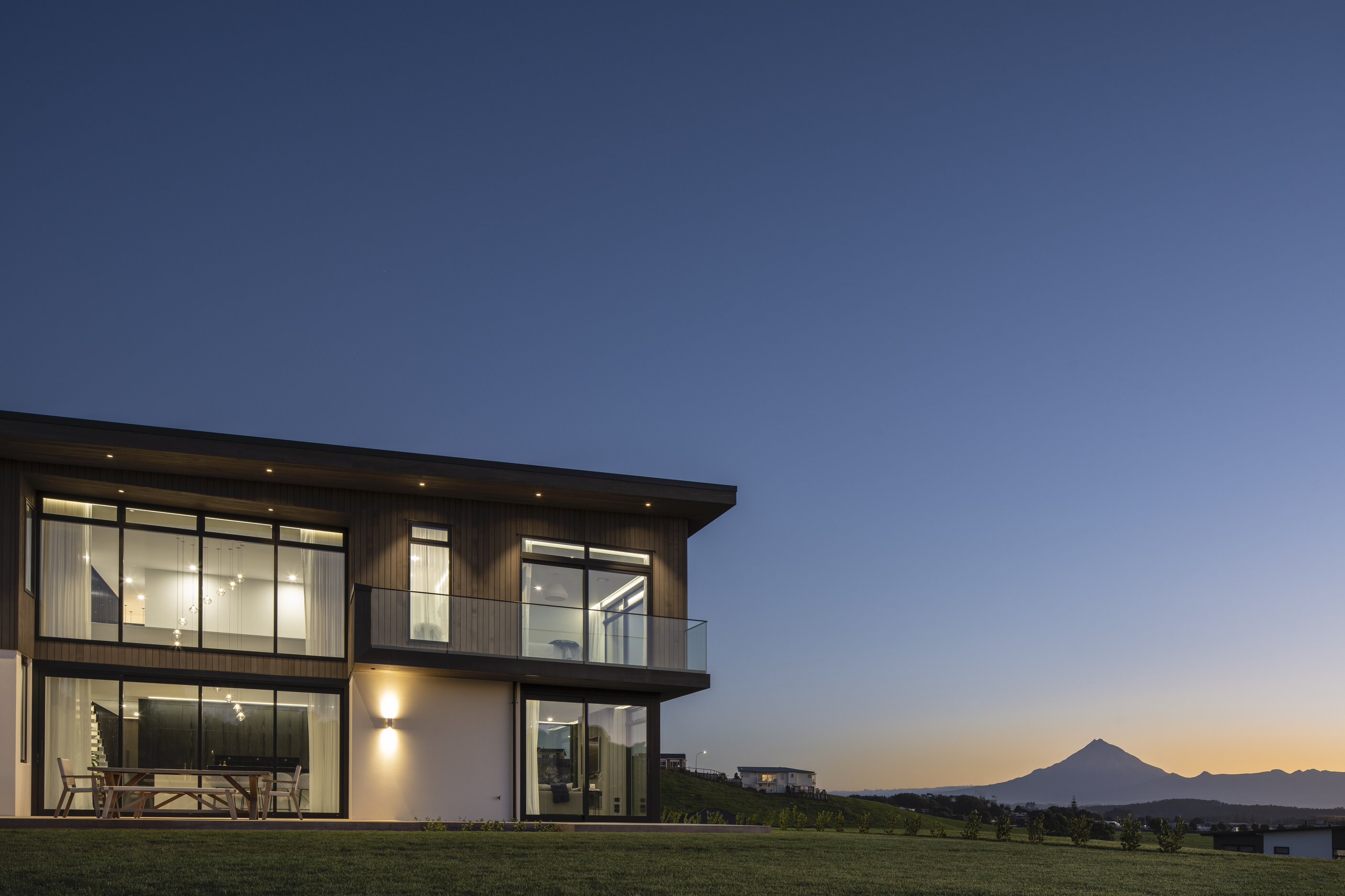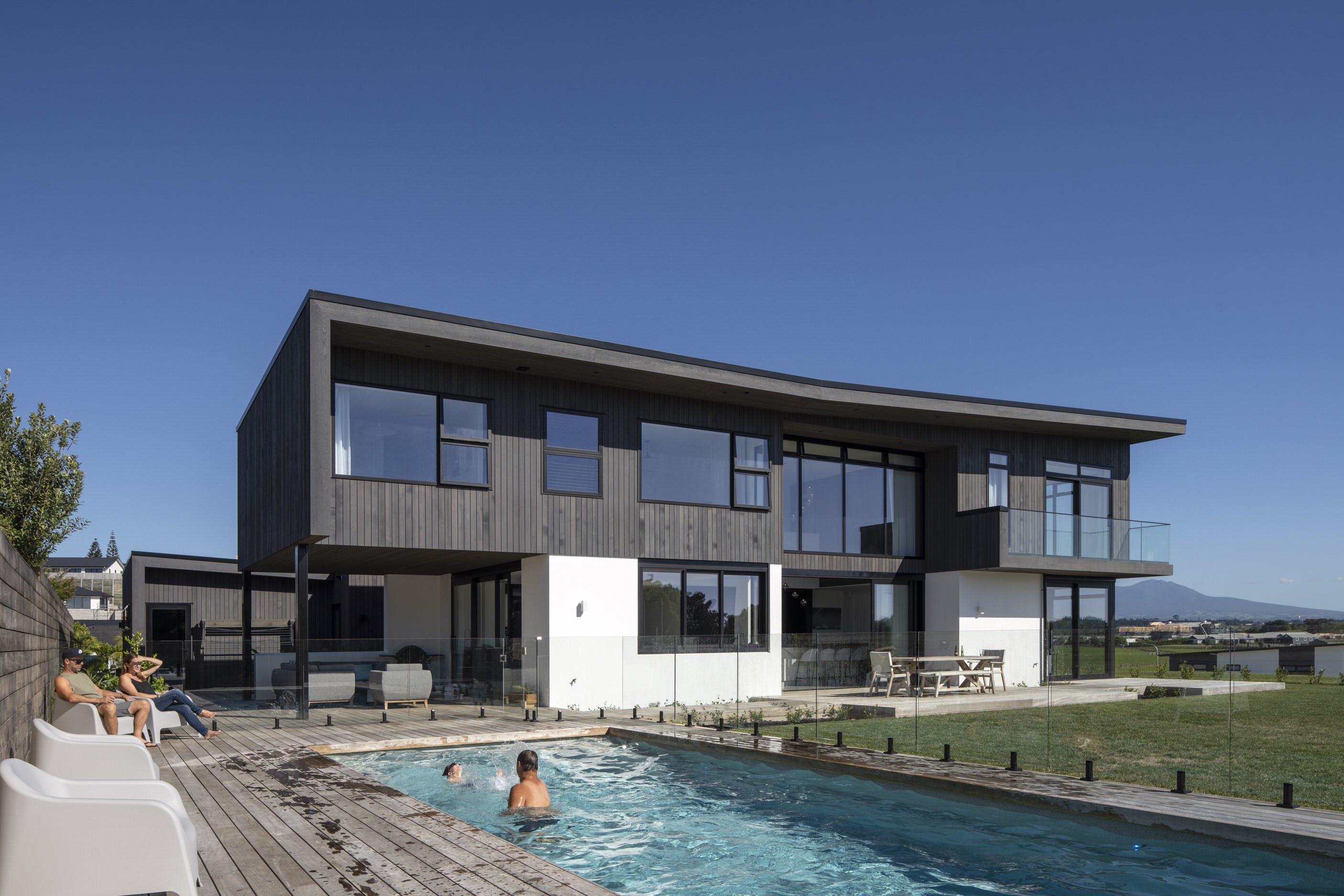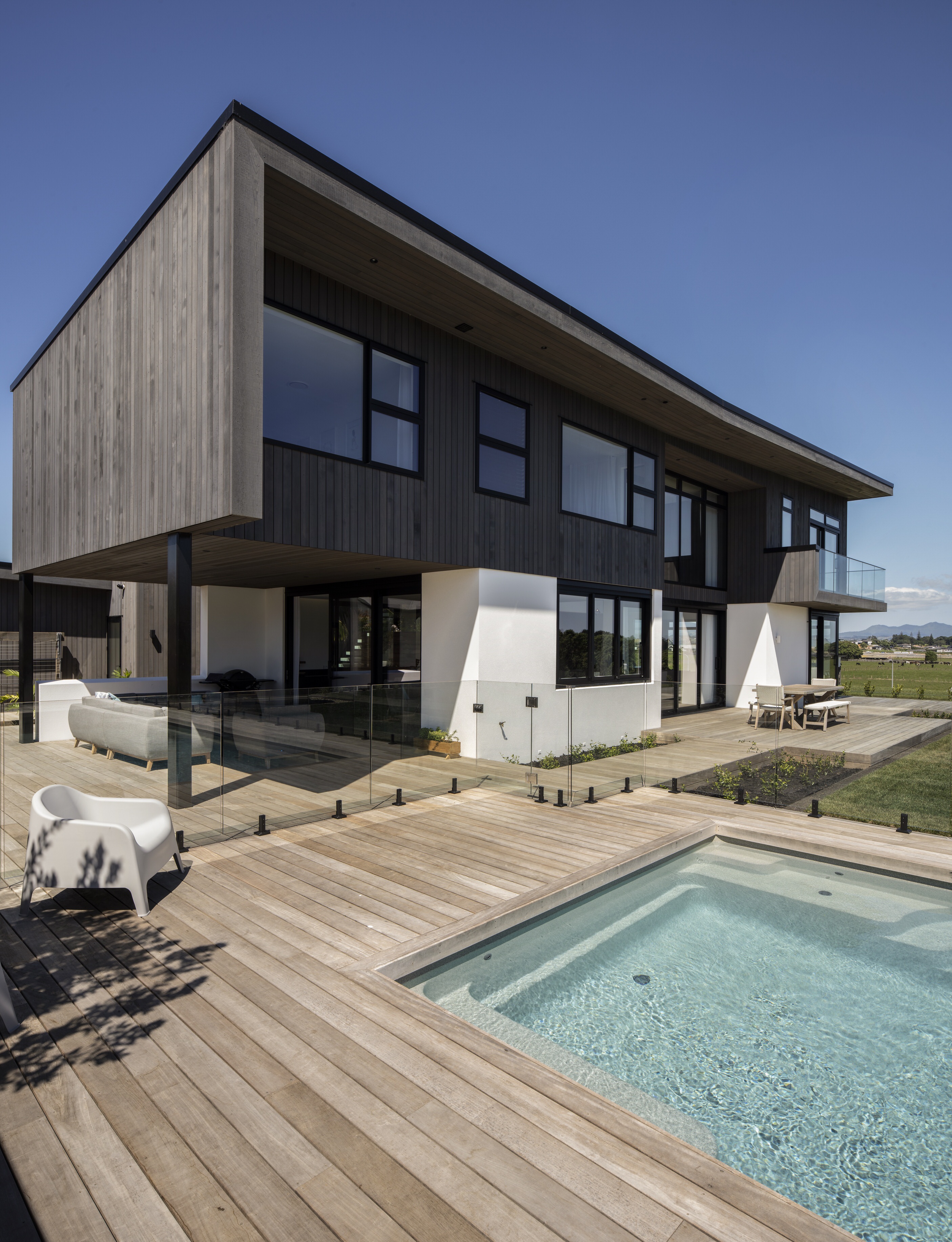 The clients asked for their dream home to be large and luxurious and they certainly got what they asked for – with stellar craftsmanship as well. Beautiful vertical cedar cladding sets the tone here. Step into the double-height entry and you’ll see a voluminous space with an exquisite floating staircase and steel screen through which morning sunlight shines. Floor-to-ceiling and carefully placed windows in the living areas provide panoramic views of the beautiful Taranaki landscape, including the mountain. These rooms merge seamlessly with the outdoor living zone and pool deck. Sliding doors partition off areas for warmth and privacy, when required. Three bedrooms in meticulously detailed cedar- clad boxes appear to float over the public spaces. The timber’s warmth softens the monochromatic interior palette in the sleek kitchen and living areas. You’ll find another family room and a convenient second bathroom upstairs, too. The main bedroom has a walk-in wardrobe, opulent ensuite and a balcony that enjoys glimpses of the Tasman Sea. This 425sqm house on the semi-rural outskirts of New Plymouth exudes style at every turn