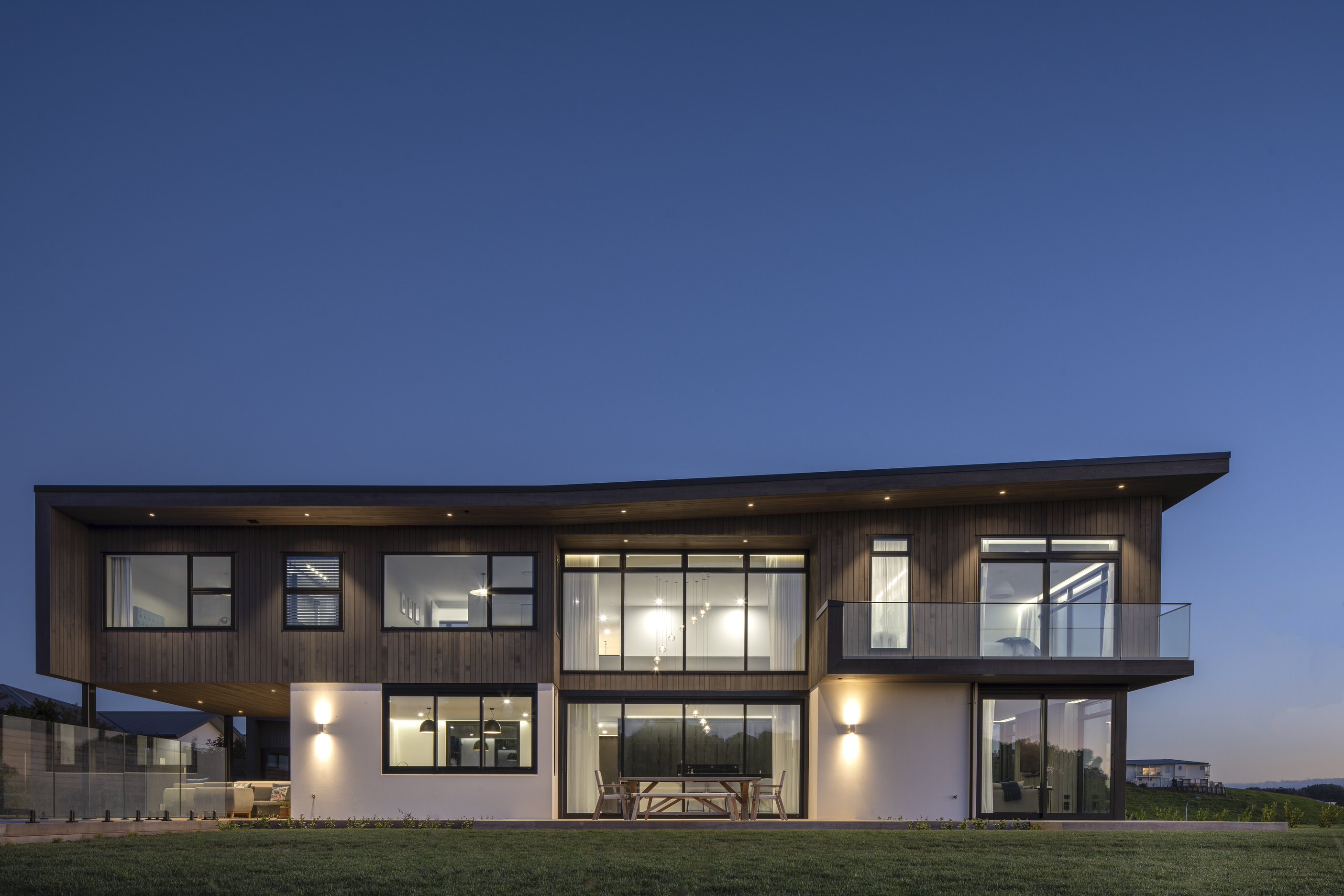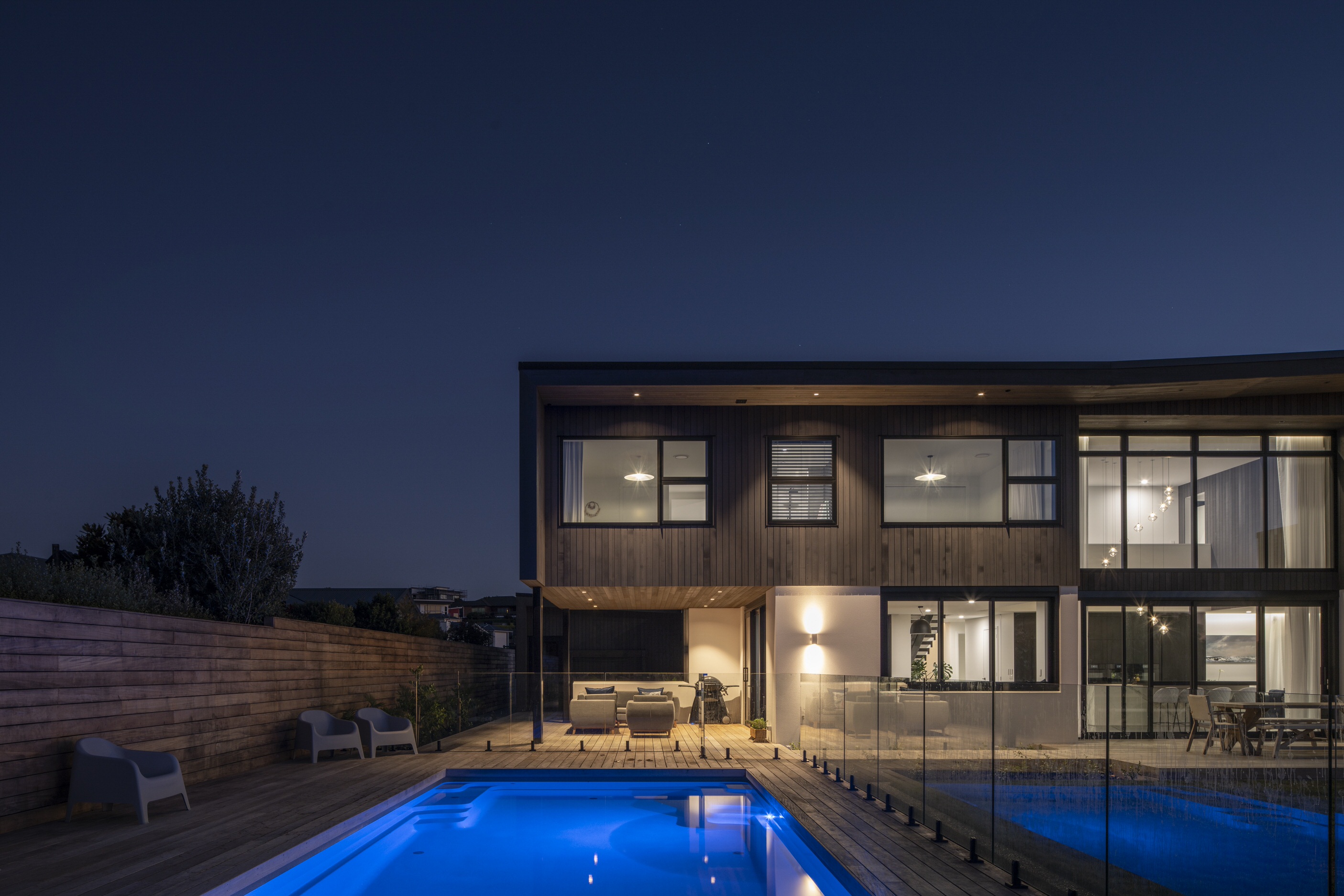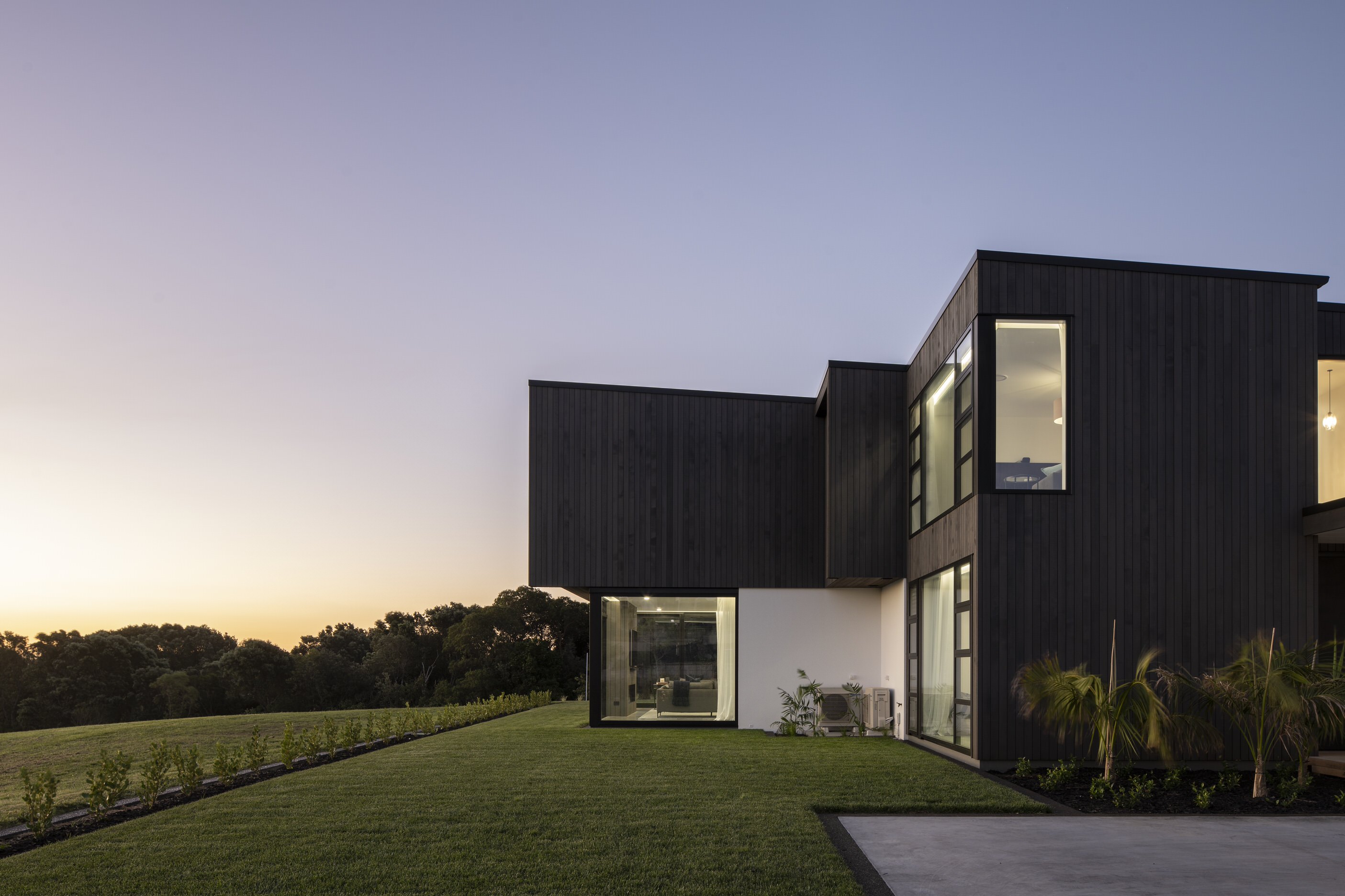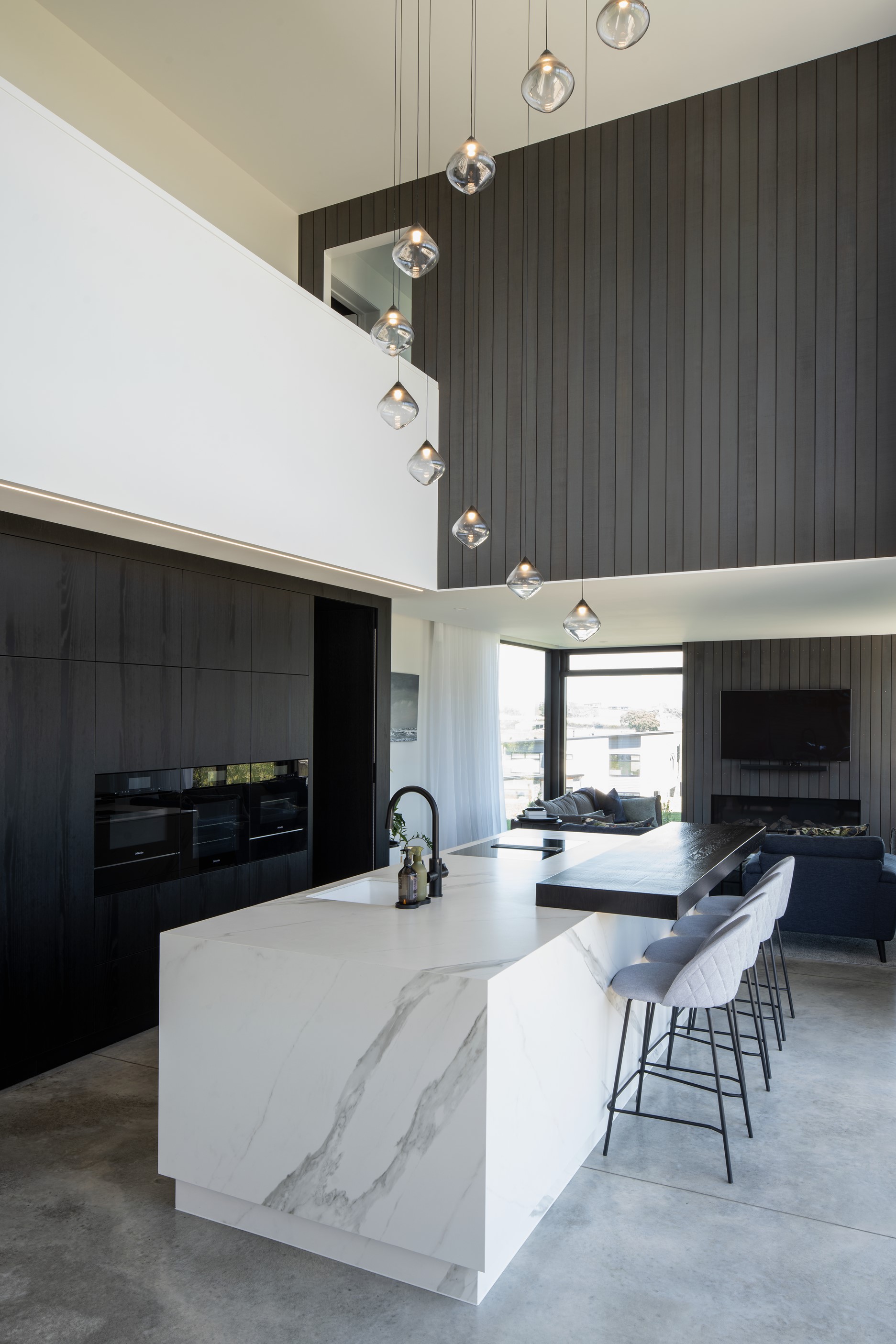 The clients asked for their dream home to be large and luxurious and they certainly got what they asked for – with stellar craftsmanship as well. Beautiful vertical cedar cladding sets the tone here. Step into the double-height entry and you’ll see a voluminous space with an exquisite floating staircase and steel screen through which morning sunlight shines. Floor-to-ceiling and carefully placed windows in the living areas provide panoramic views of the beautiful Taranaki landscape, including the mountain. These rooms merge seamlessly with the outdoor living zone and pool deck. Sliding doors partition off areas for warmth and privacy, when required. Three bedrooms in meticulously detailed cedar- clad boxes appear to float over the public spaces. The timber’s warmth softens the monochromatic interior palette in the sleek kitchen and living areas. You’ll find another family room and a convenient second bathroom upstairs, too. The main bedroom has a walk-in wardrobe, opulent ensuite and a balcony that enjoys glimpses of the Tasman Sea. This 425sqm house on the semi-rural outskirts of New Plymouth exudes style at every turn