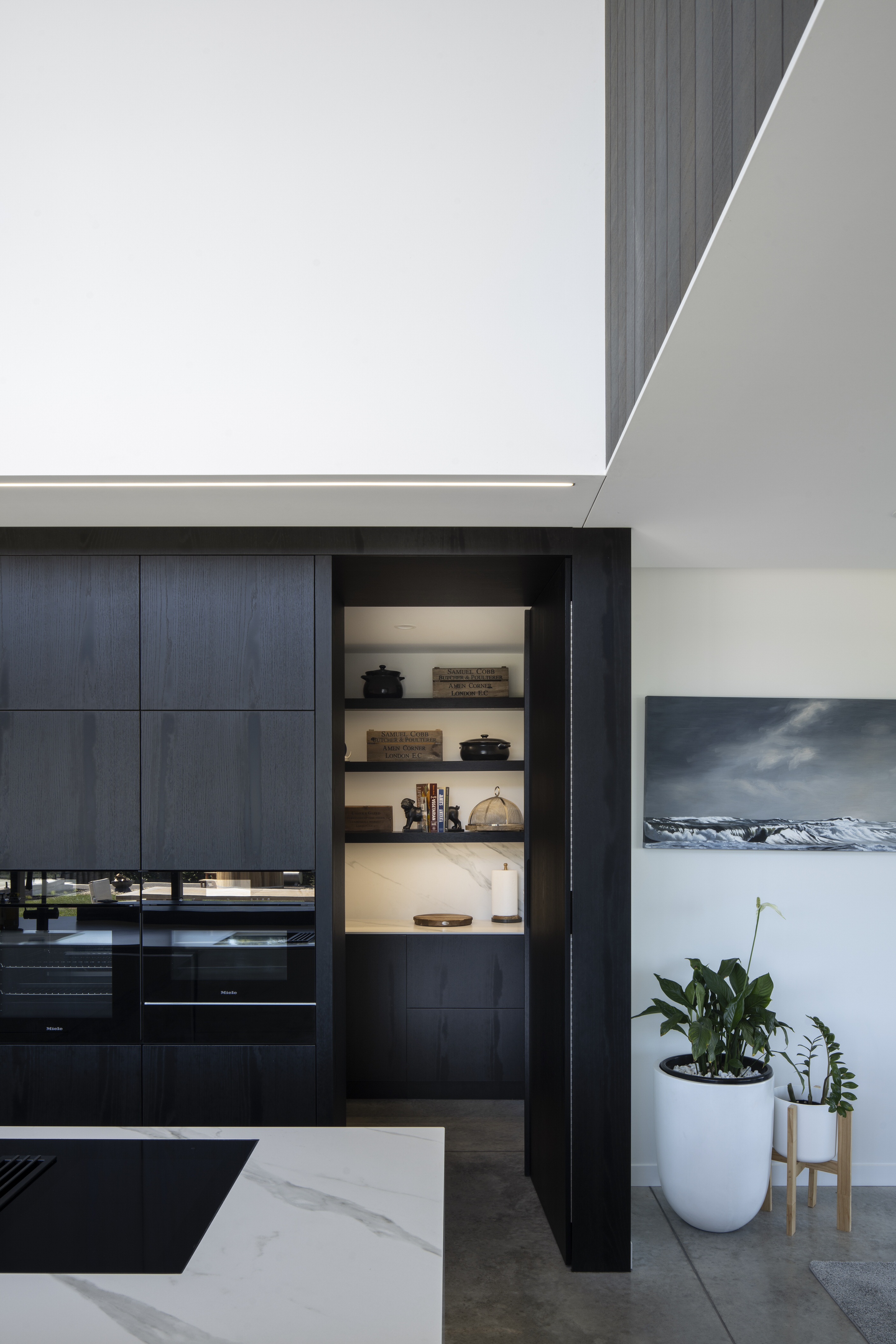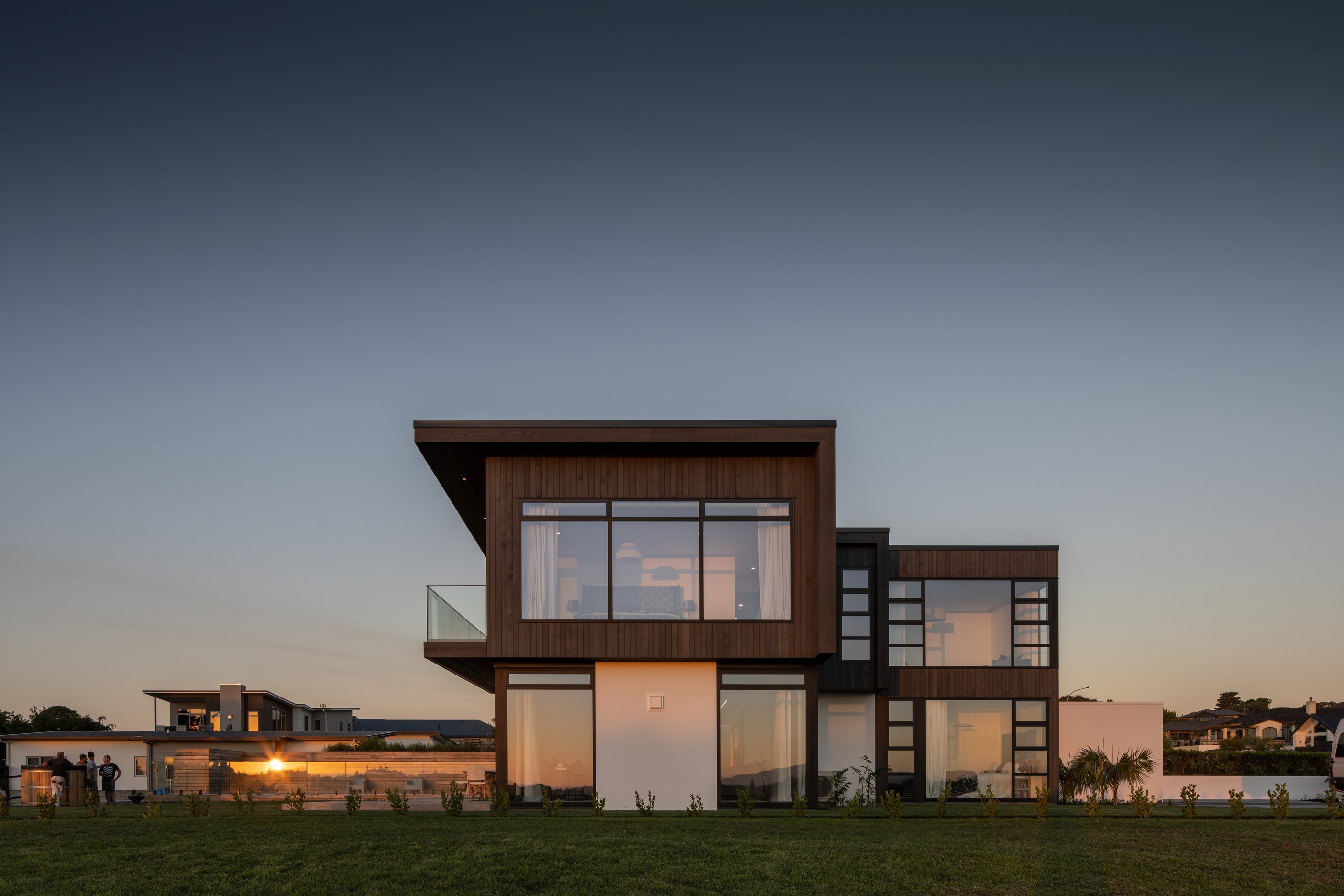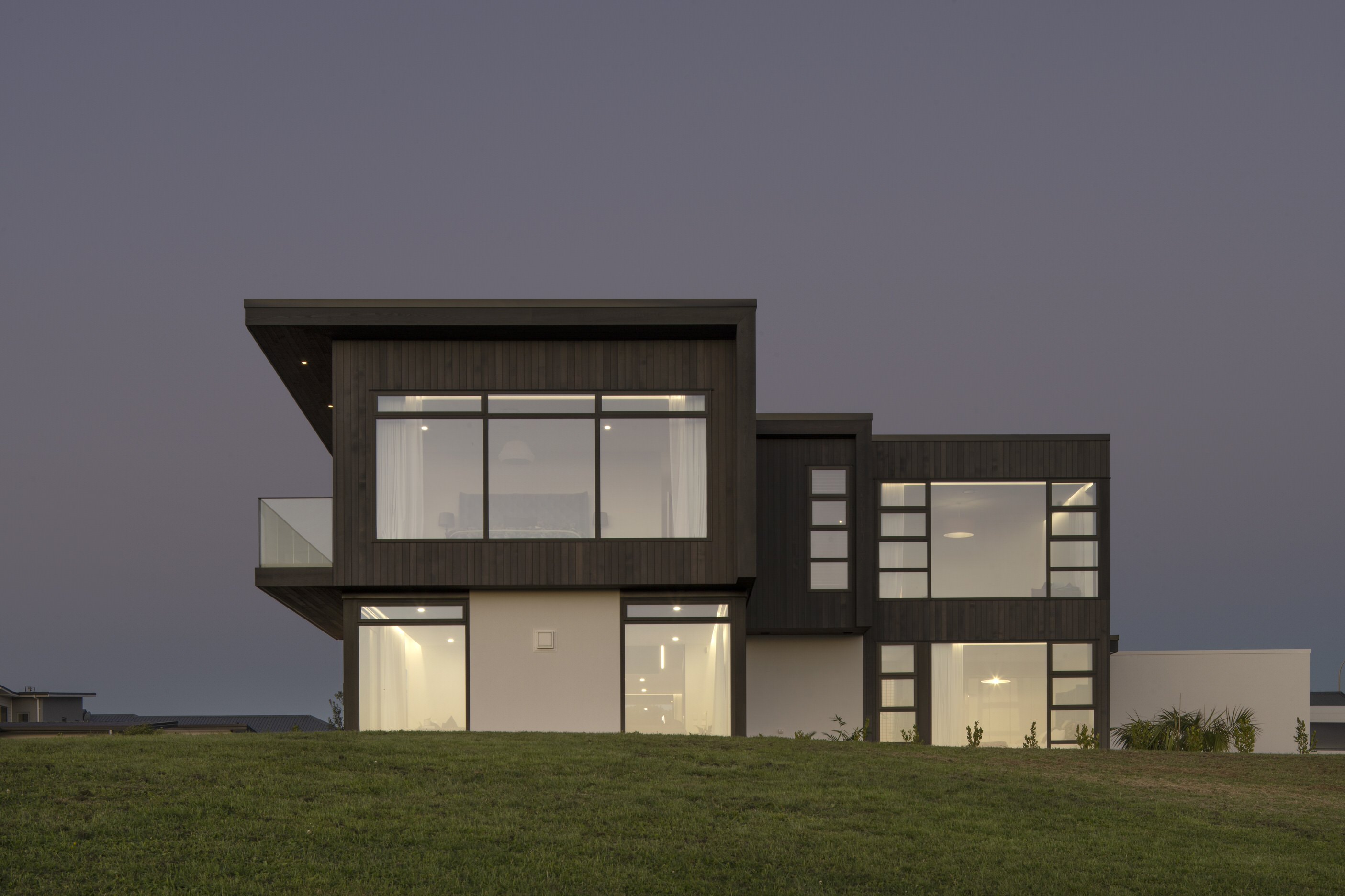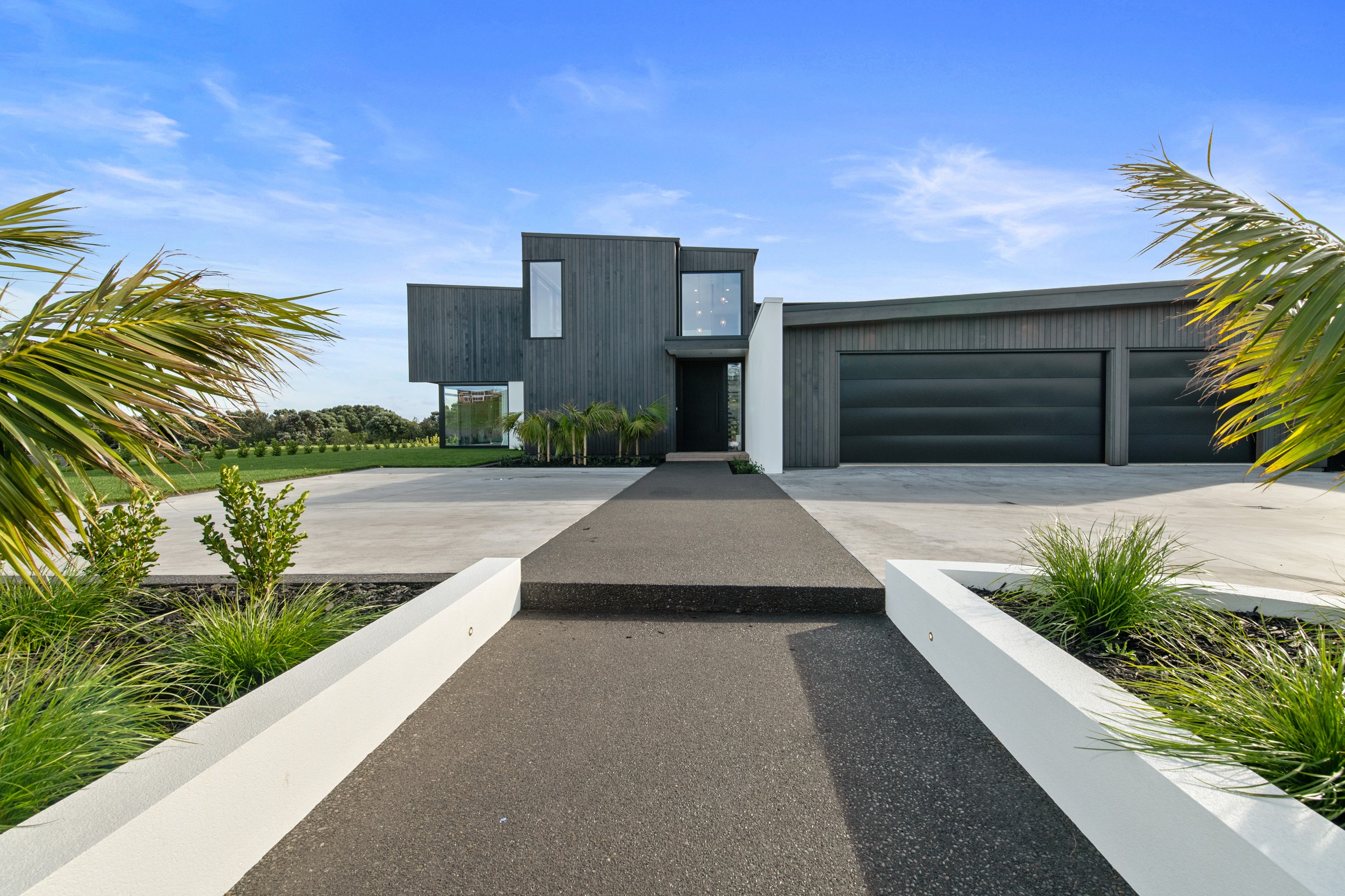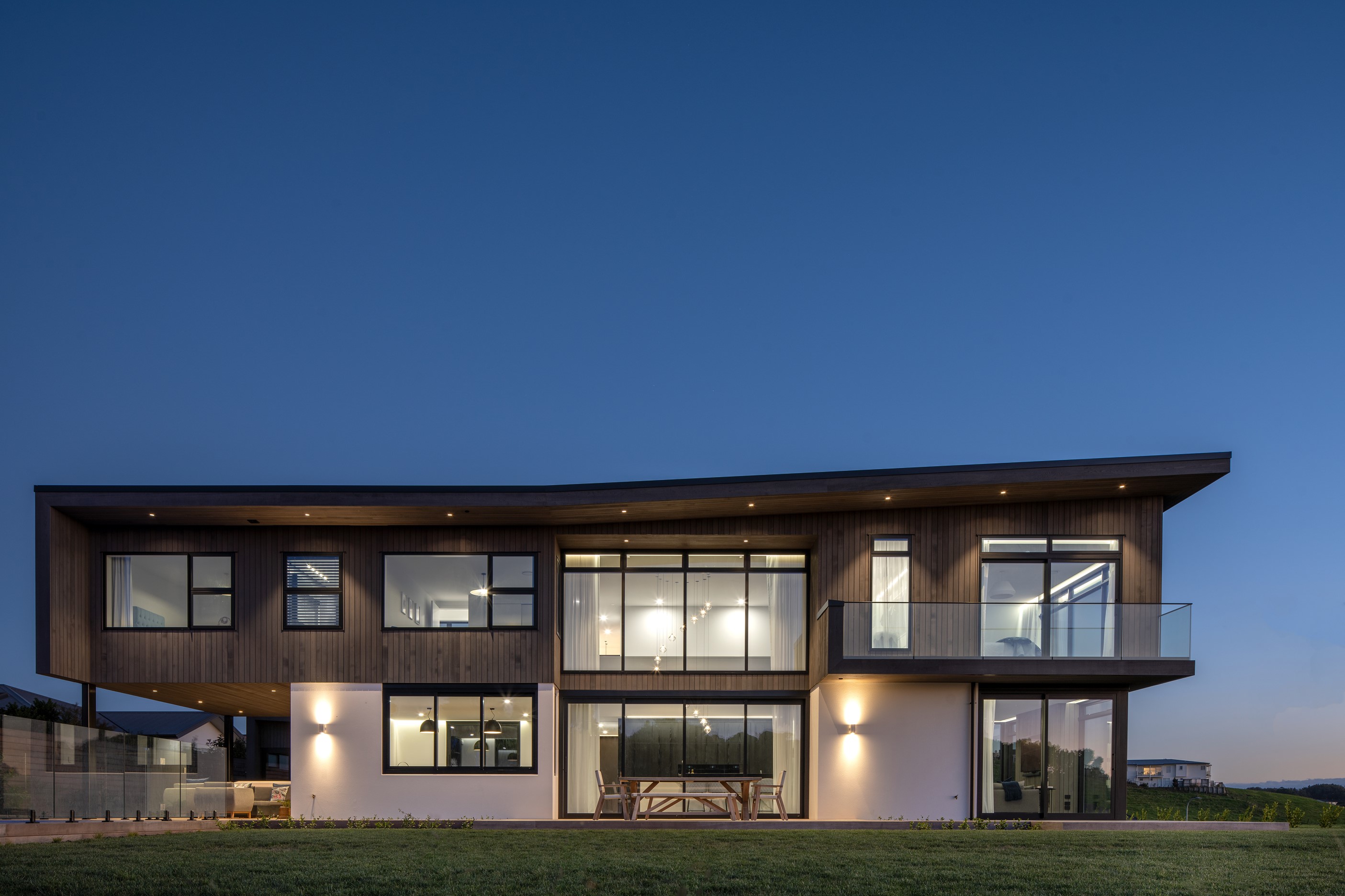 The clients asked for their dream home to be large and luxurious and they certainly got what they asked for – with stellar craftsmanship as well. Beautiful vertical cedar cladding sets the tone here. Step into the double-height entry and you’ll see a voluminous space with an exquisite floating staircase and steel screen through which morning sunlight shines. Floor-to-ceiling and carefully placed windows in the living areas provide panoramic views of the beautiful Taranaki landscape, including the mountain. These rooms merge seamlessly with the outdoor living zone and pool deck. Sliding doors partition off areas for warmth and privacy, when required. Three bedrooms in meticulously detailed cedar- clad boxes appear to float over the public spaces. The timber’s warmth softens the monochromatic interior palette in the sleek kitchen and living areas. You’ll find another family room and a convenient second bathroom upstairs, too. The main bedroom has a walk-in wardrobe, opulent ensuite and a balcony that enjoys glimpses of the Tasman Sea. This 425sqm house on the semi-rural outskirts of New Plymouth exudes style at every turn