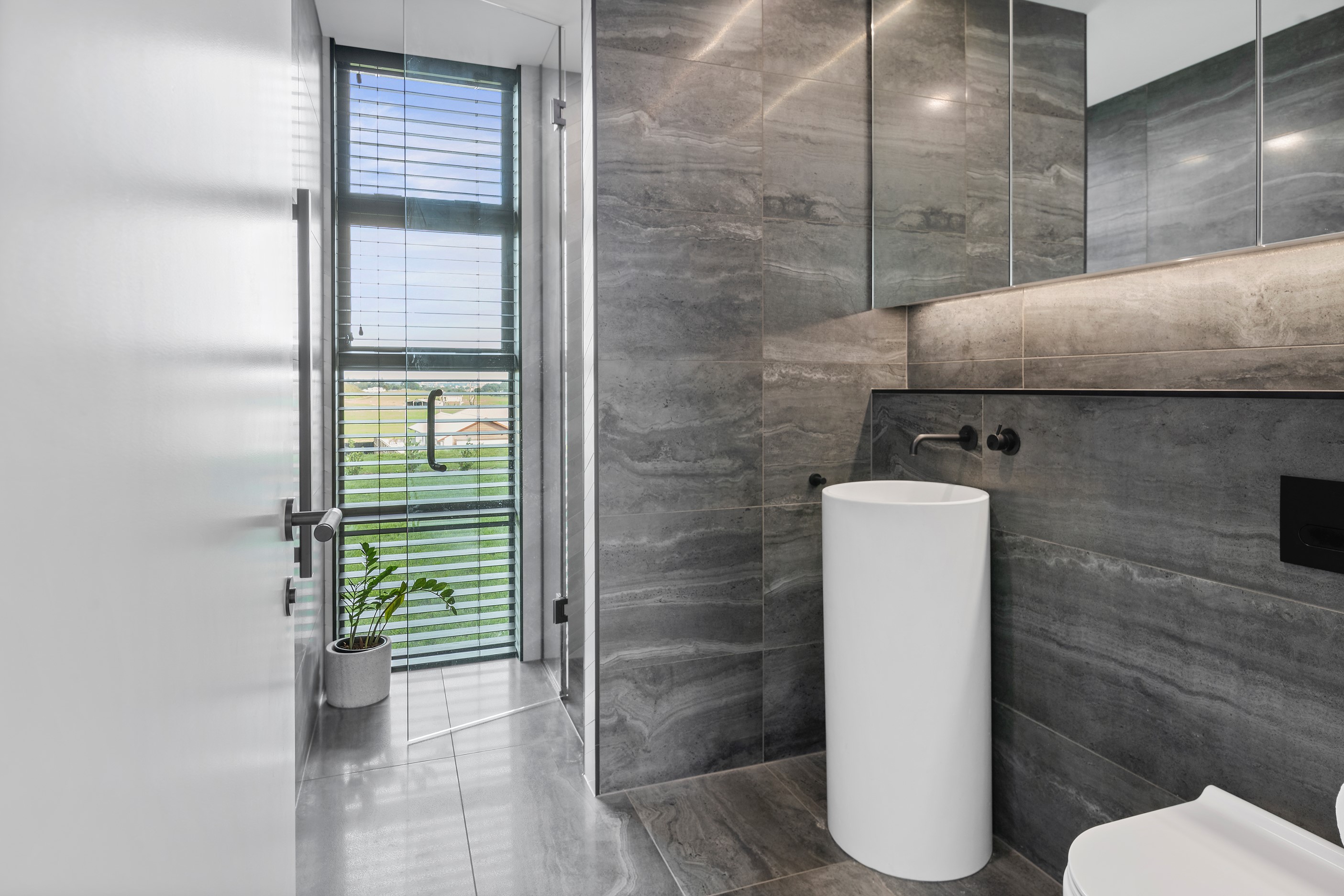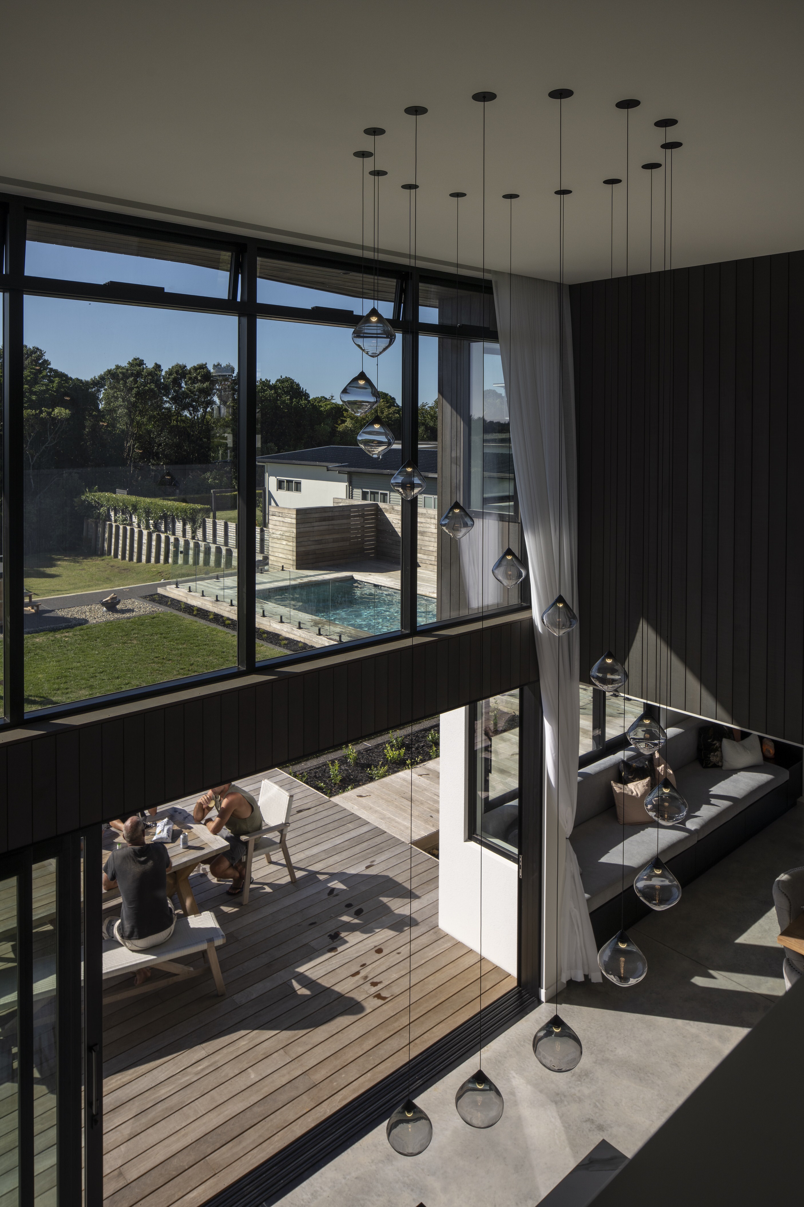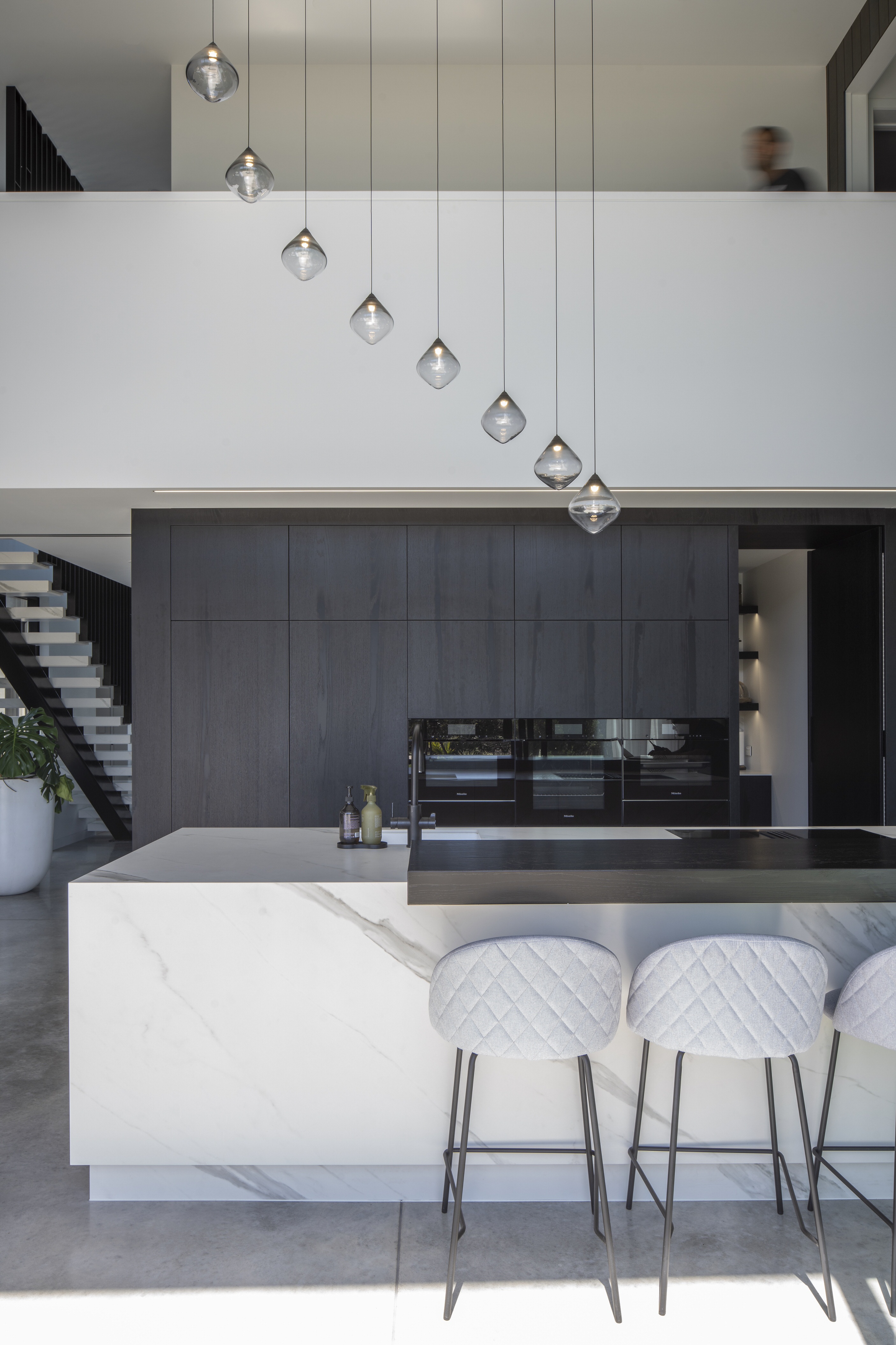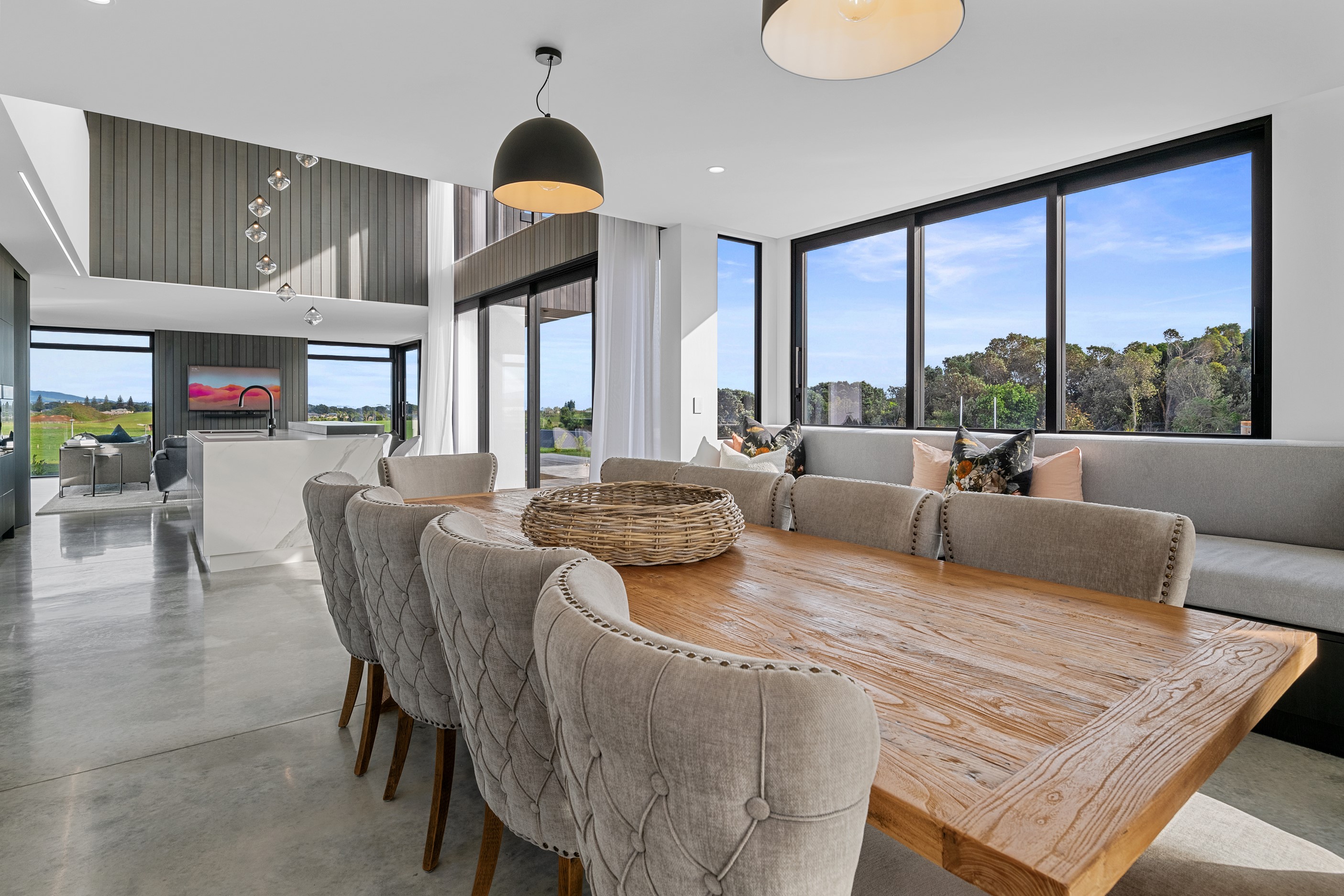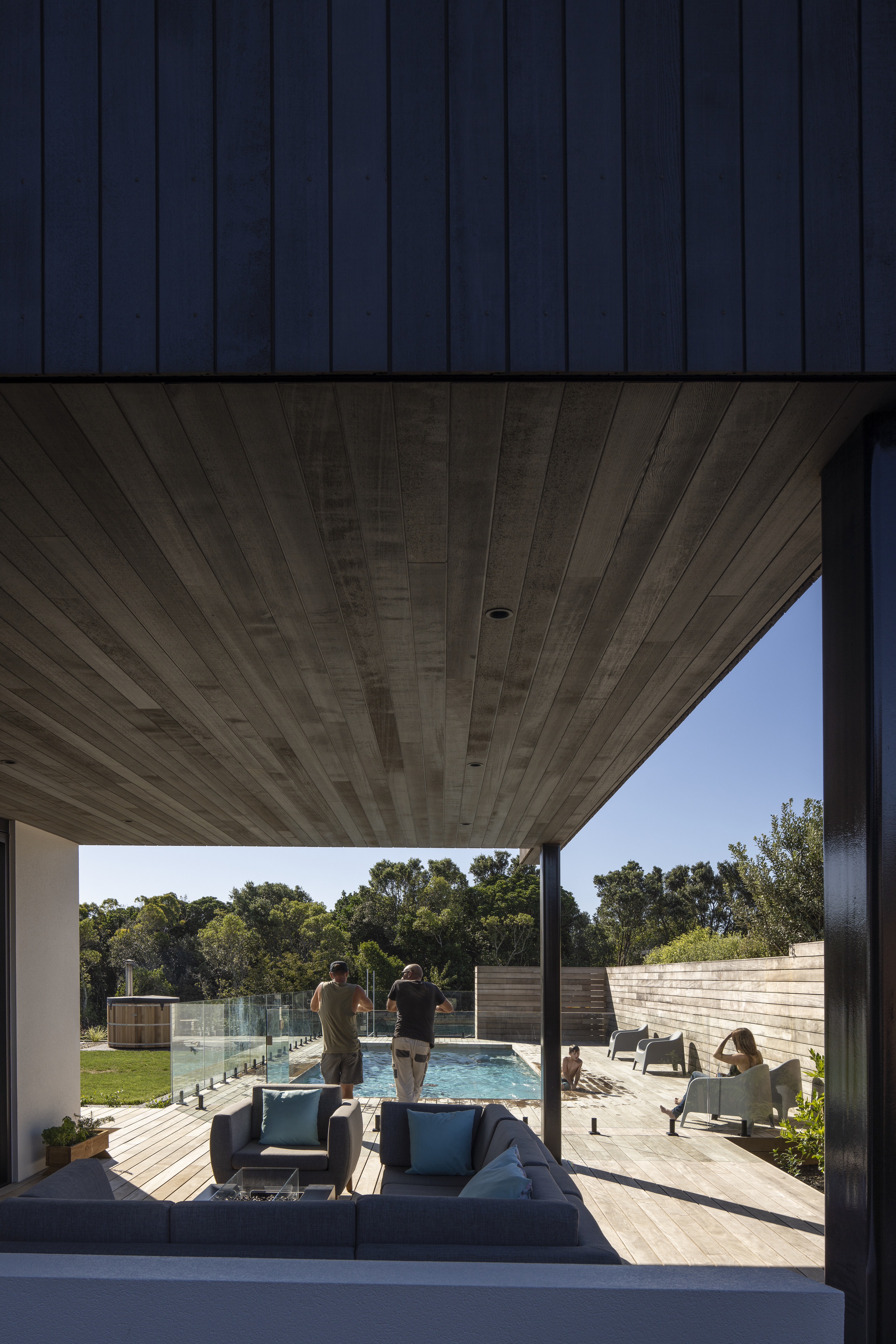 The clients asked for their dream home to be large and luxurious and they certainly got what they asked for – with stellar craftsmanship as well. Beautiful vertical cedar cladding sets the tone here. Step into the double-height entry and you’ll see a voluminous space with an exquisite floating staircase and steel screen through which morning sunlight shines. Floor-to-ceiling and carefully placed windows in the living areas provide panoramic views of the beautiful Taranaki landscape, including the mountain. These rooms merge seamlessly with the outdoor living zone and pool deck. Sliding doors partition off areas for warmth and privacy, when required. Three bedrooms in meticulously detailed cedar- clad boxes appear to float over the public spaces. The timber’s warmth softens the monochromatic interior palette in the sleek kitchen and living areas. You’ll find another family room and a convenient second bathroom upstairs, too. The main bedroom has a walk-in wardrobe, opulent ensuite and a balcony that enjoys glimpses of the Tasman Sea. This 425sqm house on the semi-rural outskirts of New Plymouth exudes style at every turn