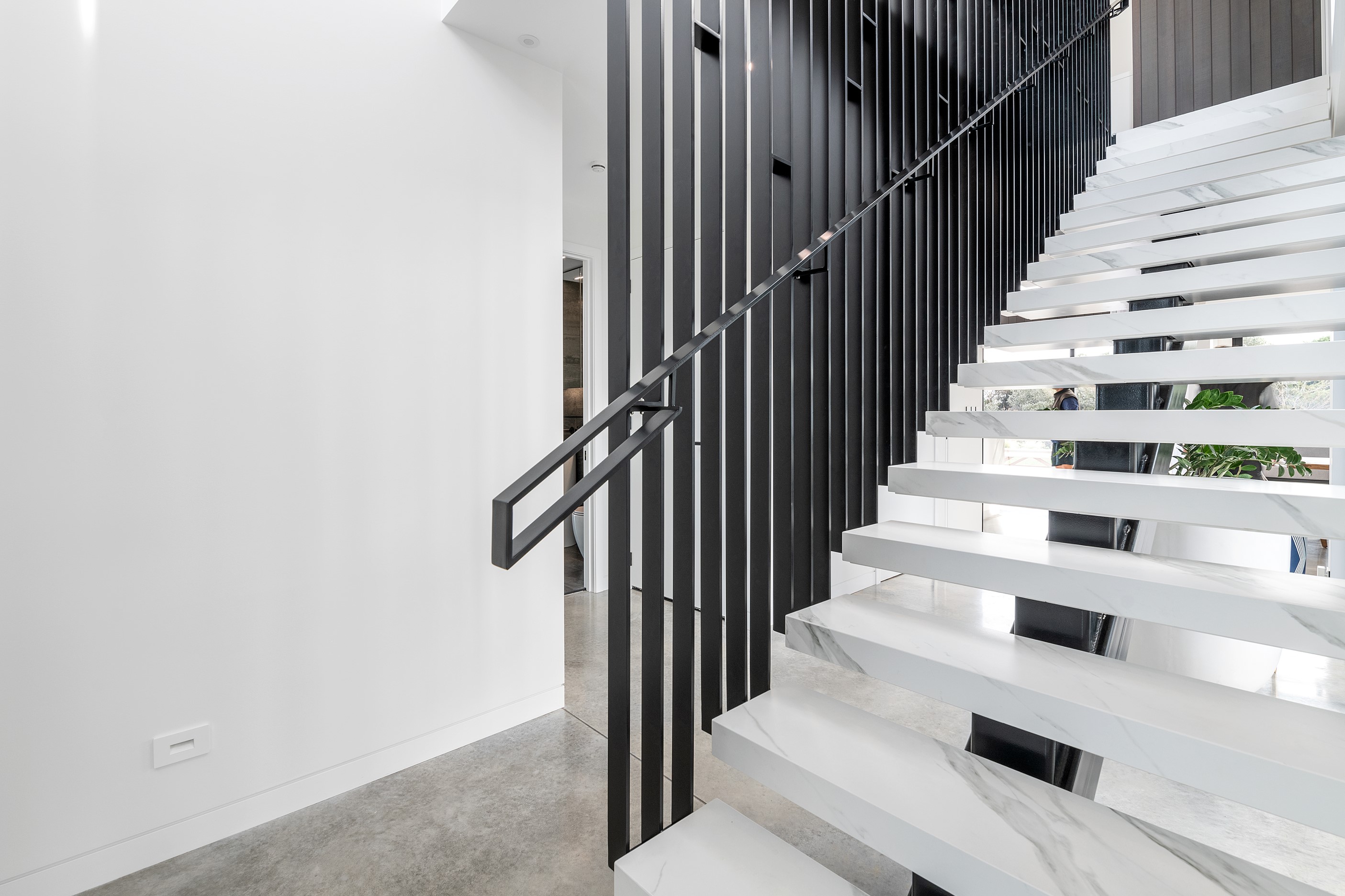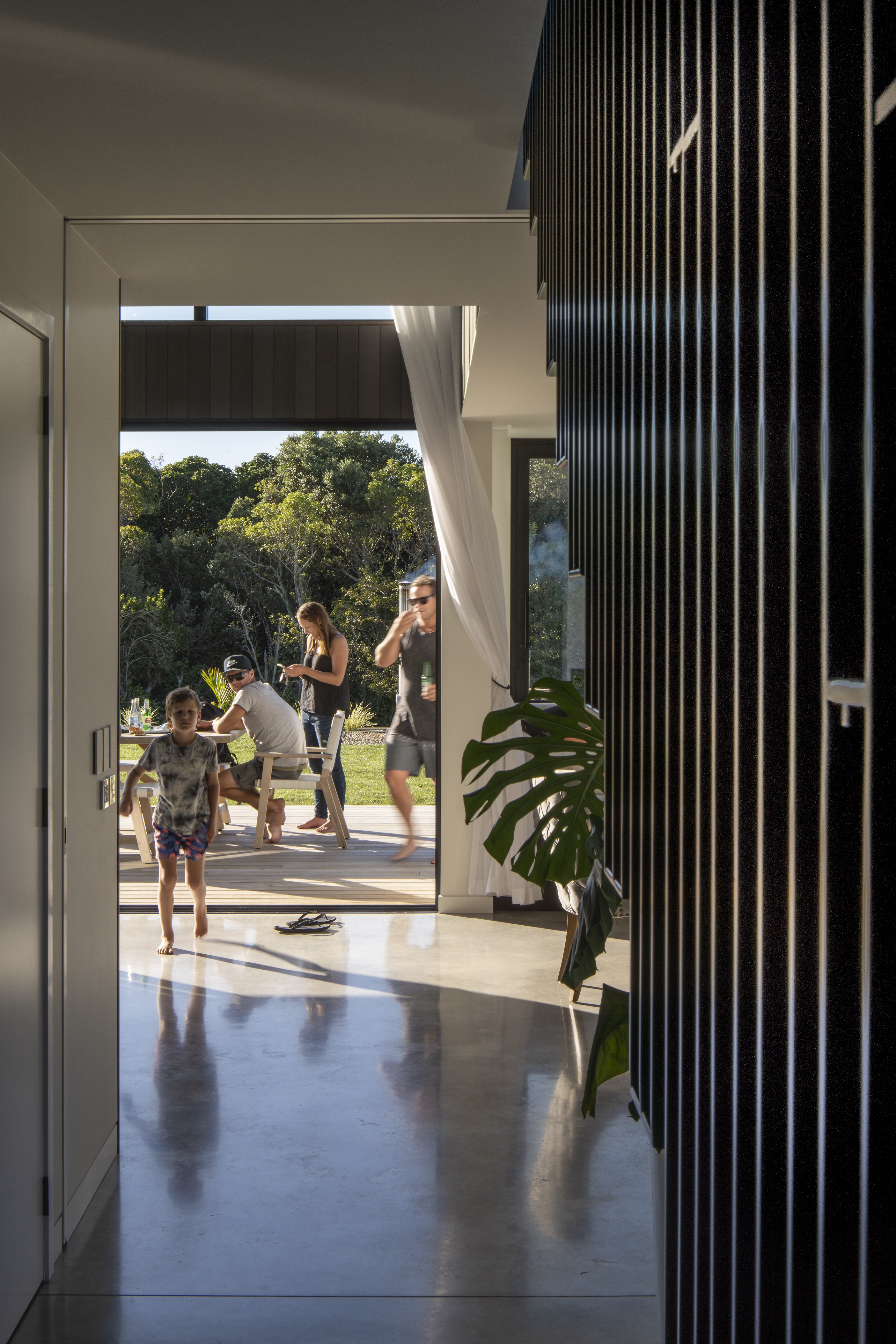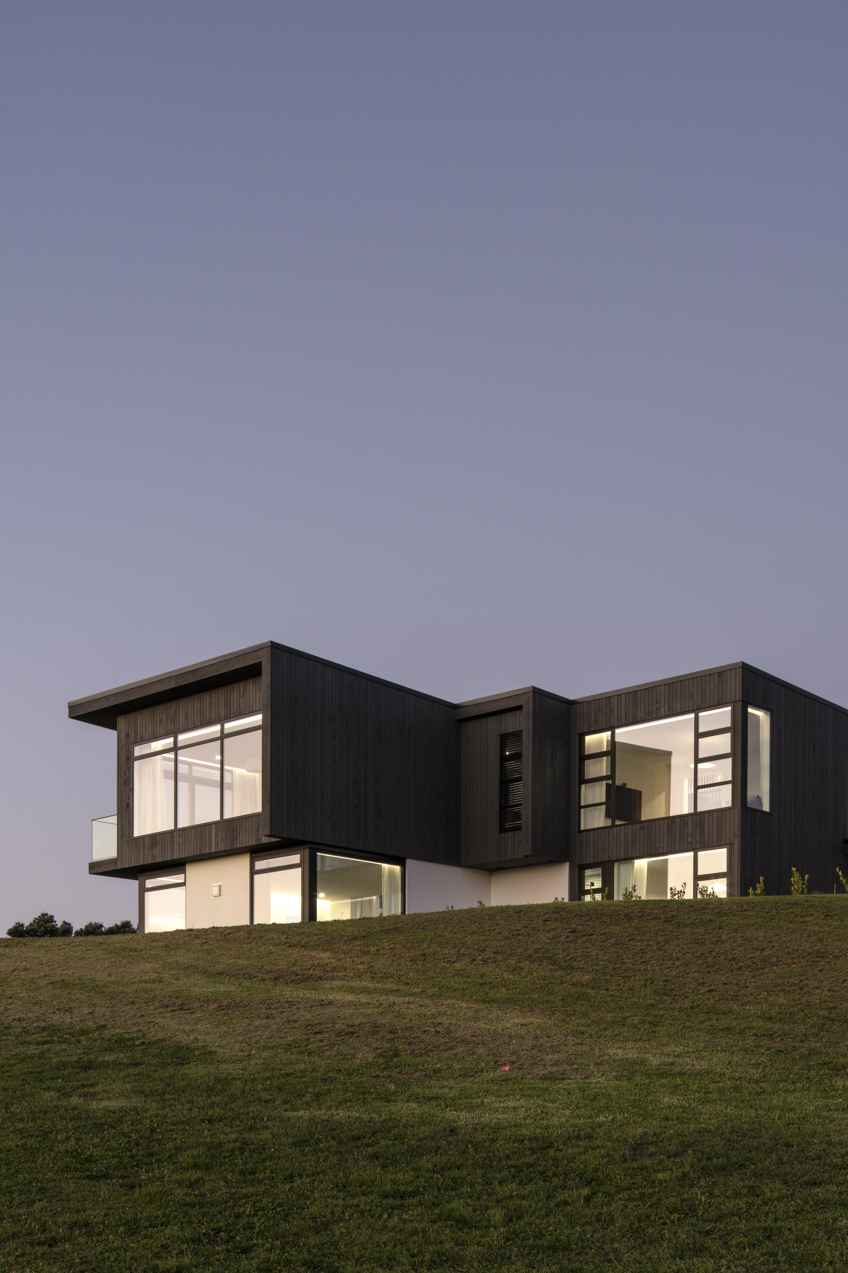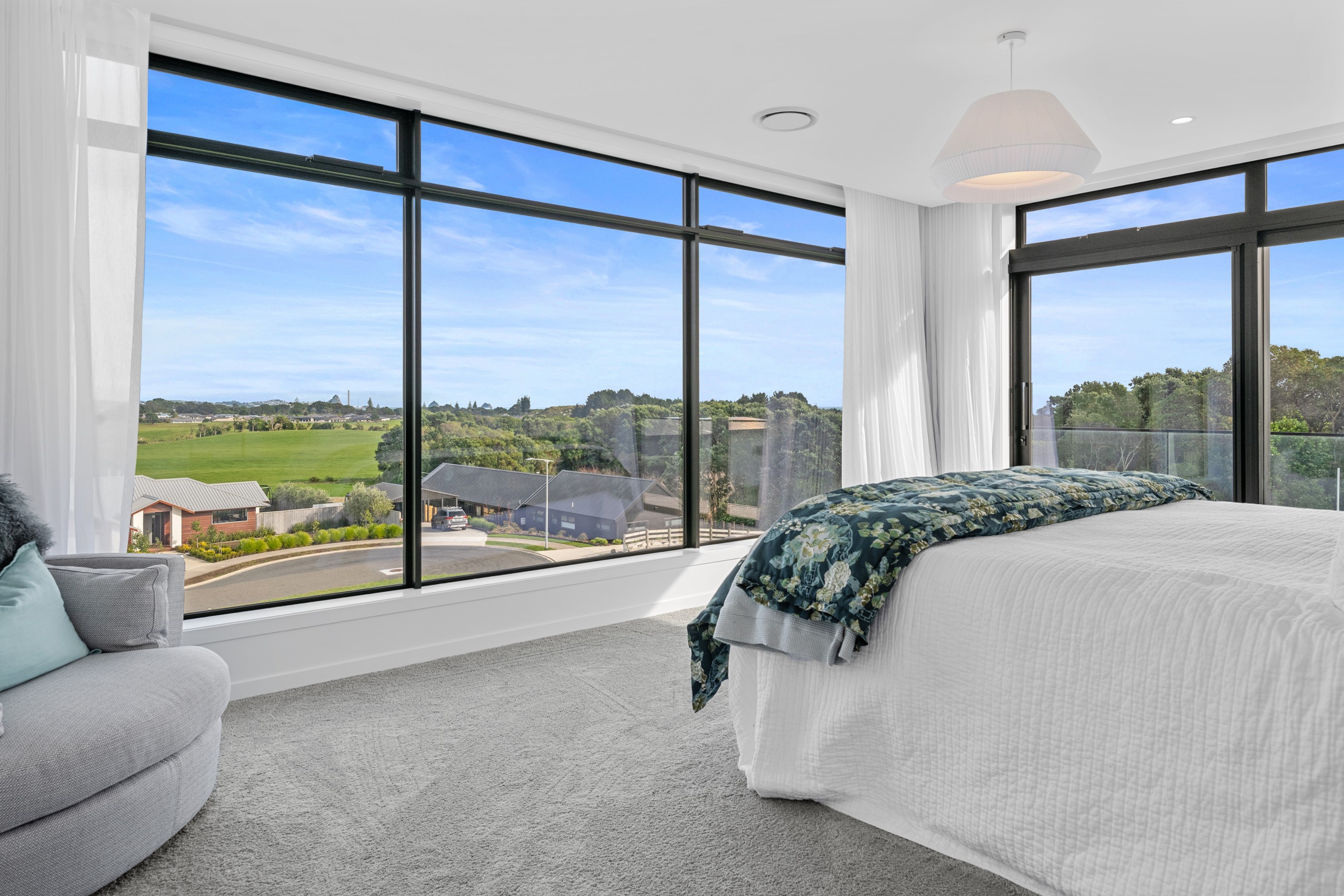 The clients asked for their dream home to be large and luxurious and they certainly got what they asked for – with stellar craftsmanship as well. Beautiful vertical cedar cladding sets the tone here. Step into the double-height entry and you’ll see a voluminous space with an exquisite floating staircase and steel screen through which morning sunlight shines. Floor-to-ceiling and carefully placed windows in the living areas provide panoramic views of the beautiful Taranaki landscape, including the mountain. These rooms merge seamlessly with the outdoor living zone and pool deck. Sliding doors partition off areas for warmth and privacy, when required. Three bedrooms in meticulously detailed cedar- clad boxes appear to float over the public spaces. The timber’s warmth softens the monochromatic interior palette in the sleek kitchen and living areas. You’ll find another family room and a convenient second bathroom upstairs, too. The main bedroom has a walk-in wardrobe, opulent ensuite and a balcony that enjoys glimpses of the Tasman Sea. This 425sqm house on the semi-rural outskirts of New Plymouth exudes style at every turn