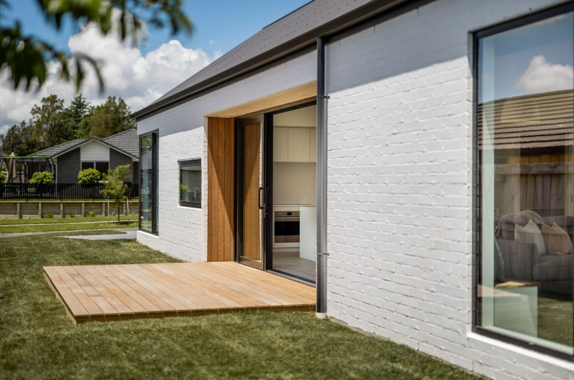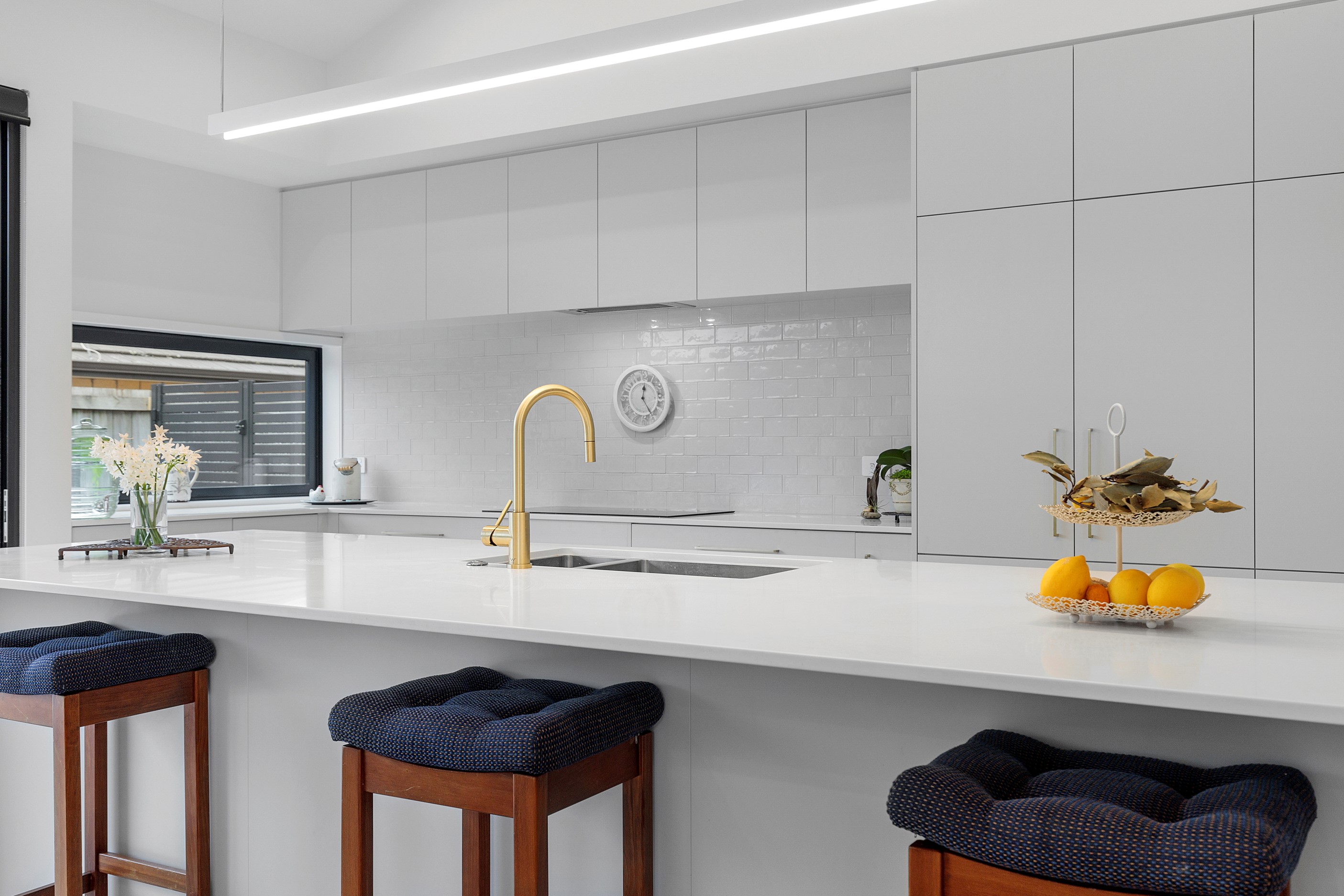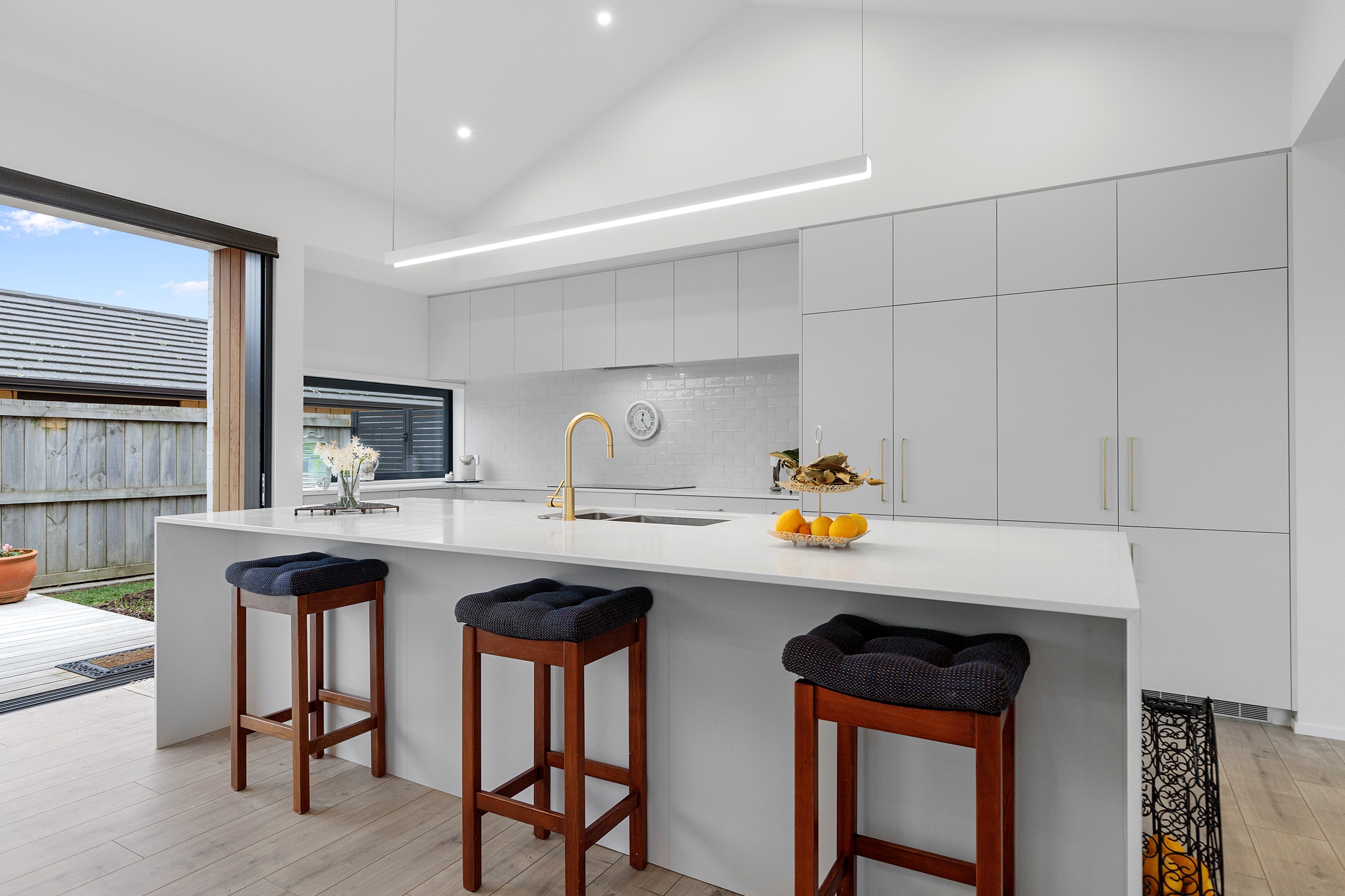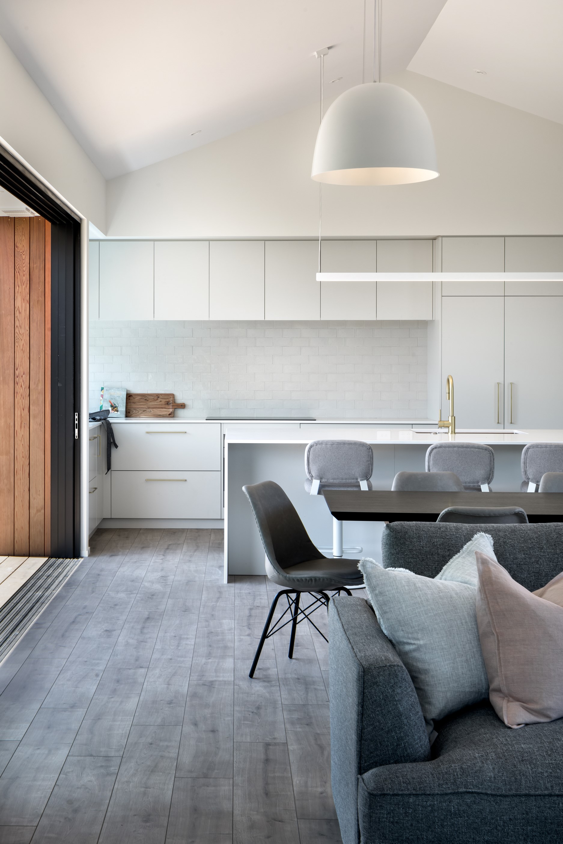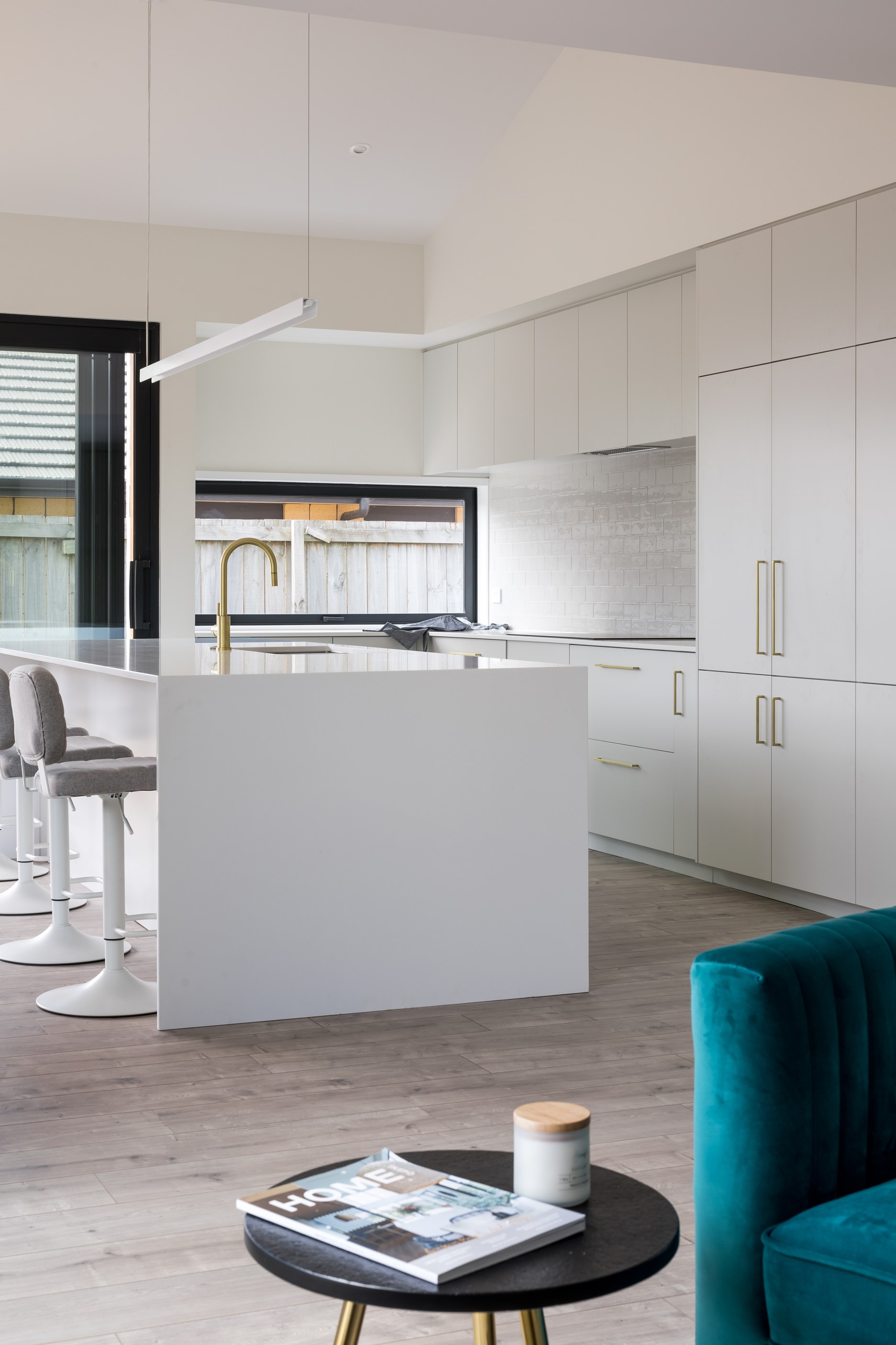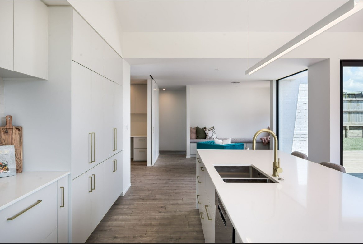 With elevated properties on two of the three sides, the challenge was to design a house that would make best use of a private area at the rear of the section. Living areas needed to be tucked away from the road and flow to outdoor areas. The house also needed to include three bedrooms, display pared-back lines and create street appeal. It’s clear the objectives have been met, and then some. Edwards White Architects took the client’s requests on board and designed a beautiful home with timeless appeal. The 211sqm residence is clad in bagged brick, has timber shiplap features, and delivers delightful details within – all of which are gradually revealed as you progress throughout the home. A feature that has become increasingly important in recent times is an office to accommodate working from home. This one has been designed to be closed off, ensuring it almost disappears, which helps with the all-important work-life separation and balance. Air flow, natural light and efficient heating are achieved with automated solar-powered skylights and a ducted fireplace. Meanwhile, low-e glass mitigates heat loss and sun damage.