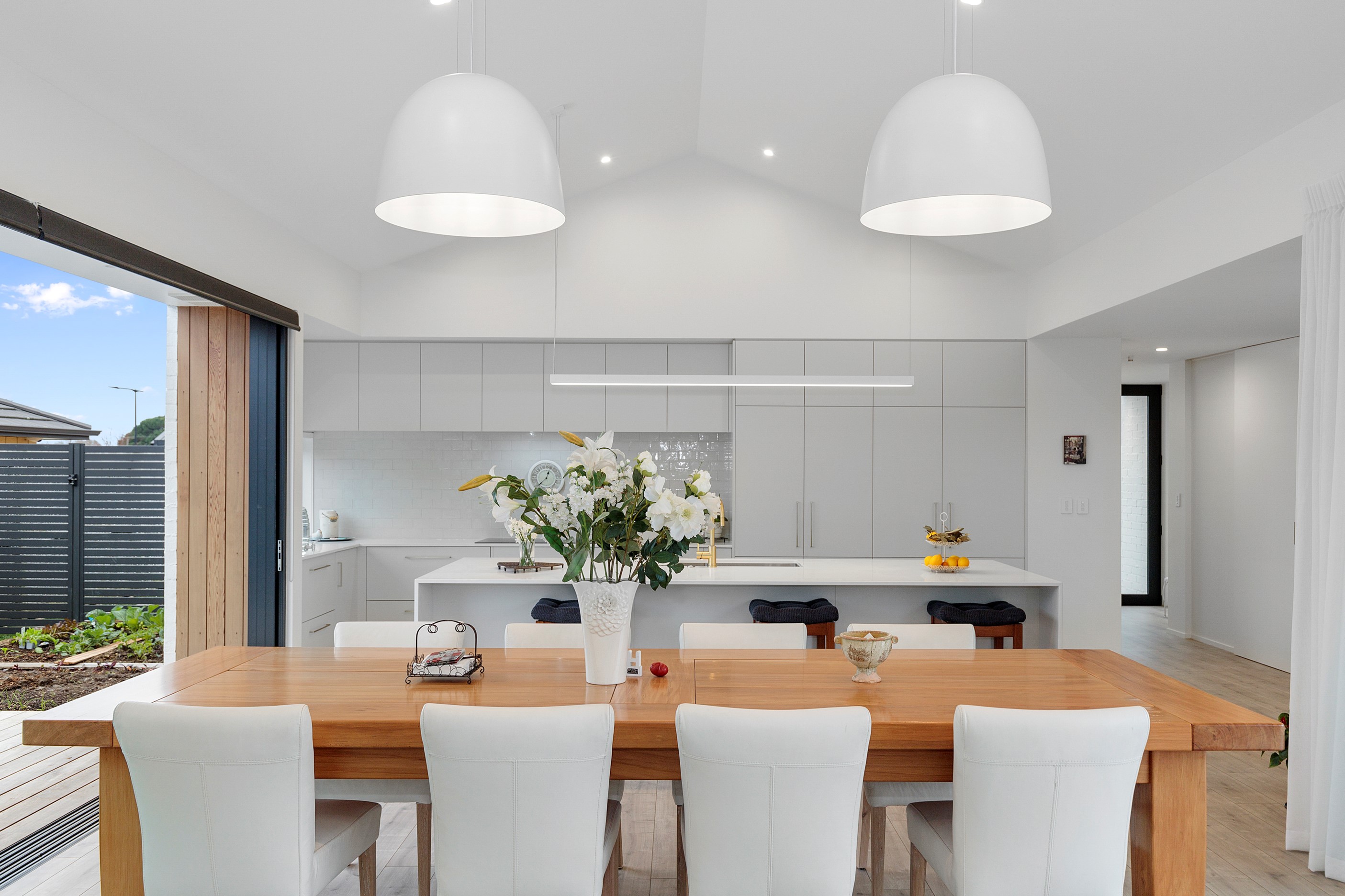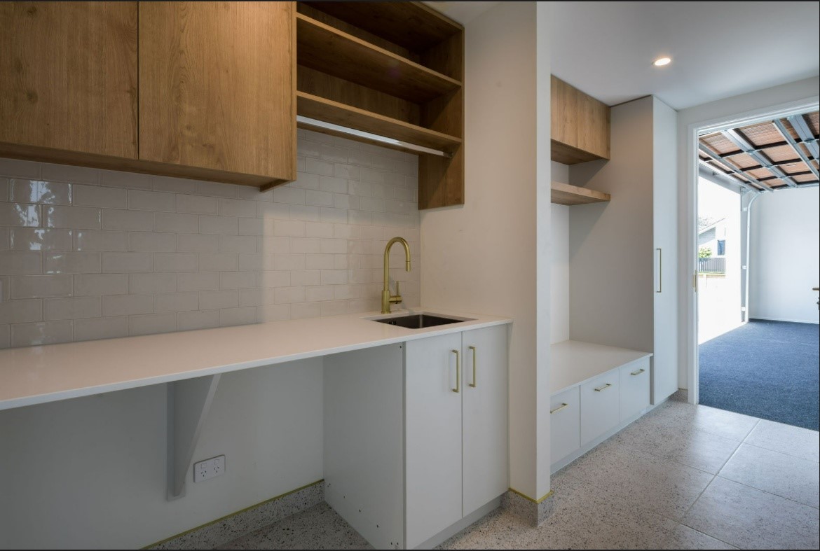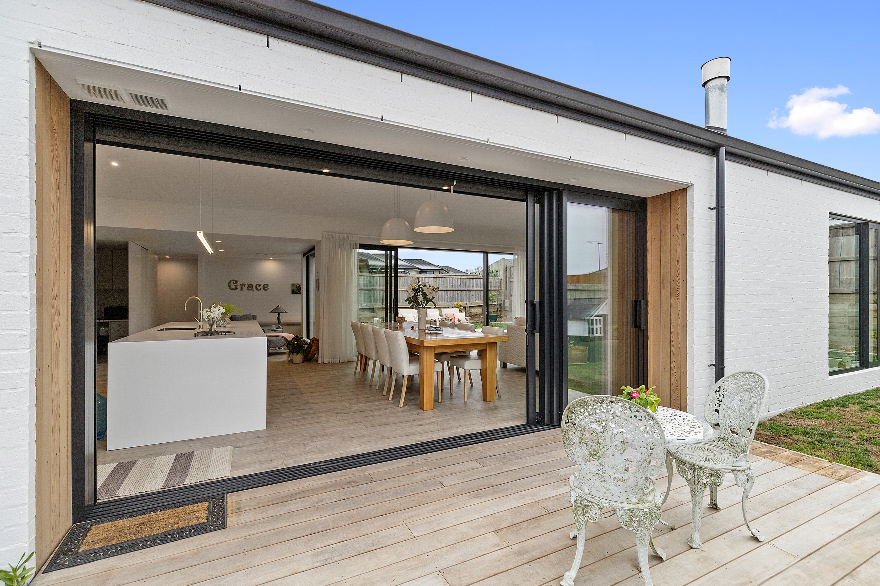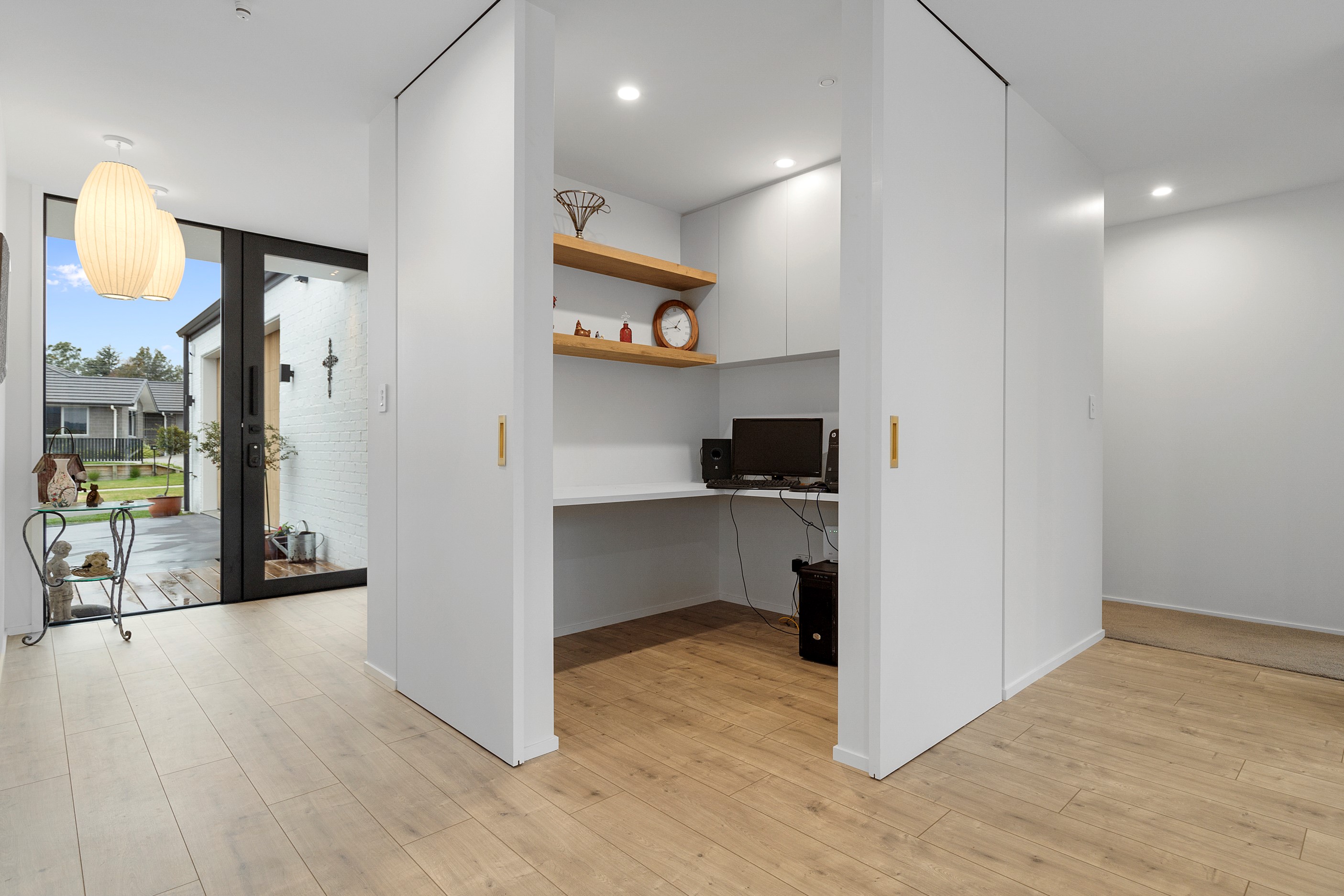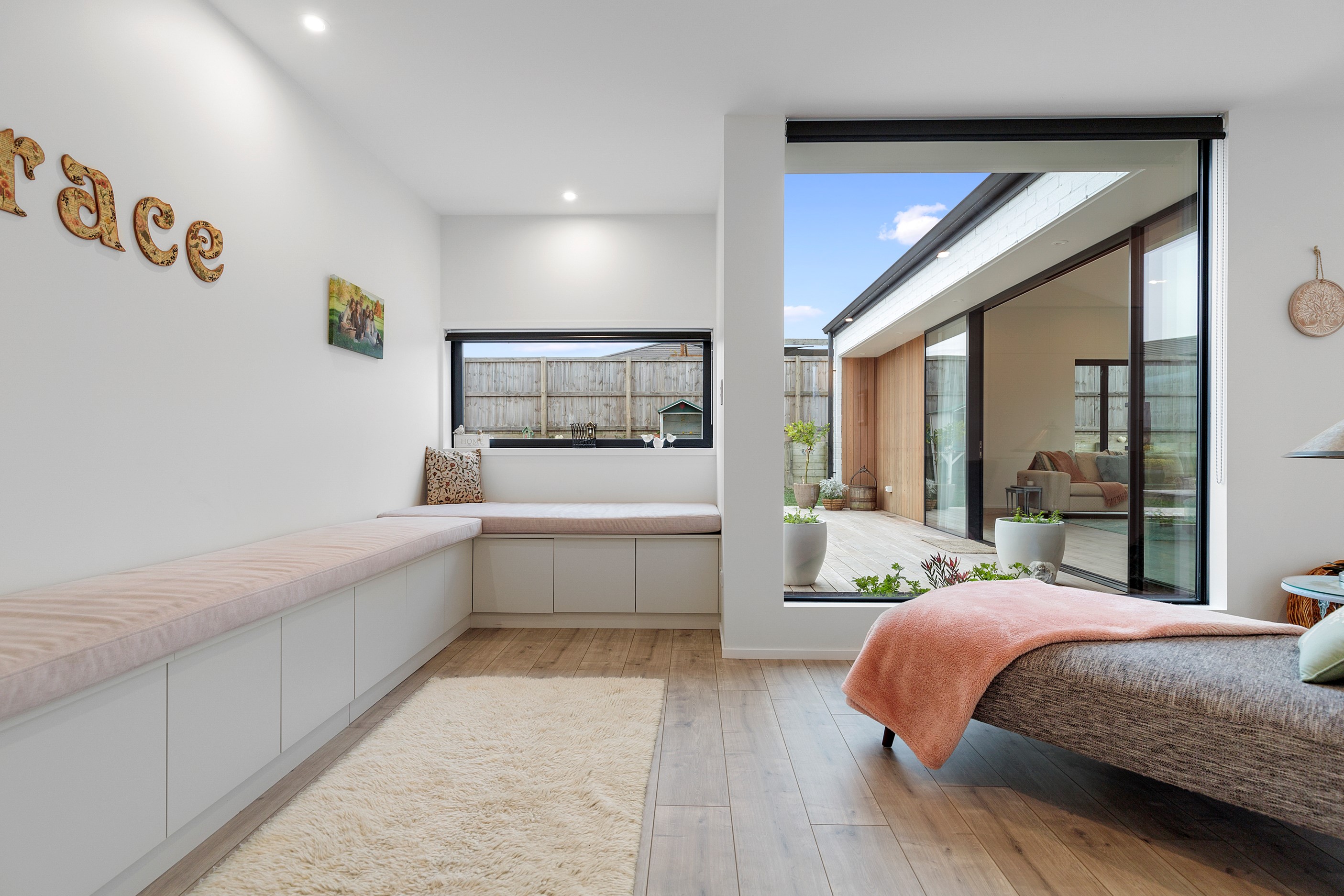 With elevated properties on two of the three sides, the challenge was to design a house that would make best use of a private area at the rear of the section. Living areas needed to be tucked away from the road and flow to outdoor areas. The house also needed to include three bedrooms, display pared-back lines and create street appeal. It’s clear the objectives have been met, and then some. Edwards White Architects took the client’s requests on board and designed a beautiful home with timeless appeal. The 211sqm residence is clad in bagged brick, has timber shiplap features, and delivers delightful details within – all of which are gradually revealed as you progress throughout the home. A feature that has become increasingly important in recent times is an office to accommodate working from home. This one has been designed to be closed off, ensuring it almost disappears, which helps with the all-important work-life separation and balance. Air flow, natural light and efficient heating are achieved with automated solar-powered skylights and a ducted fireplace. Meanwhile, low-e glass mitigates heat loss and sun damage.