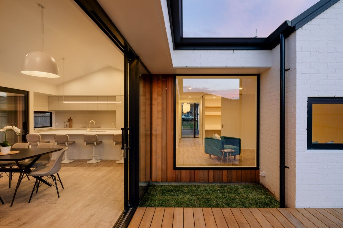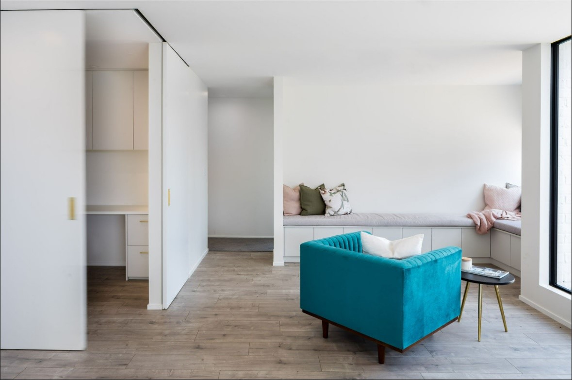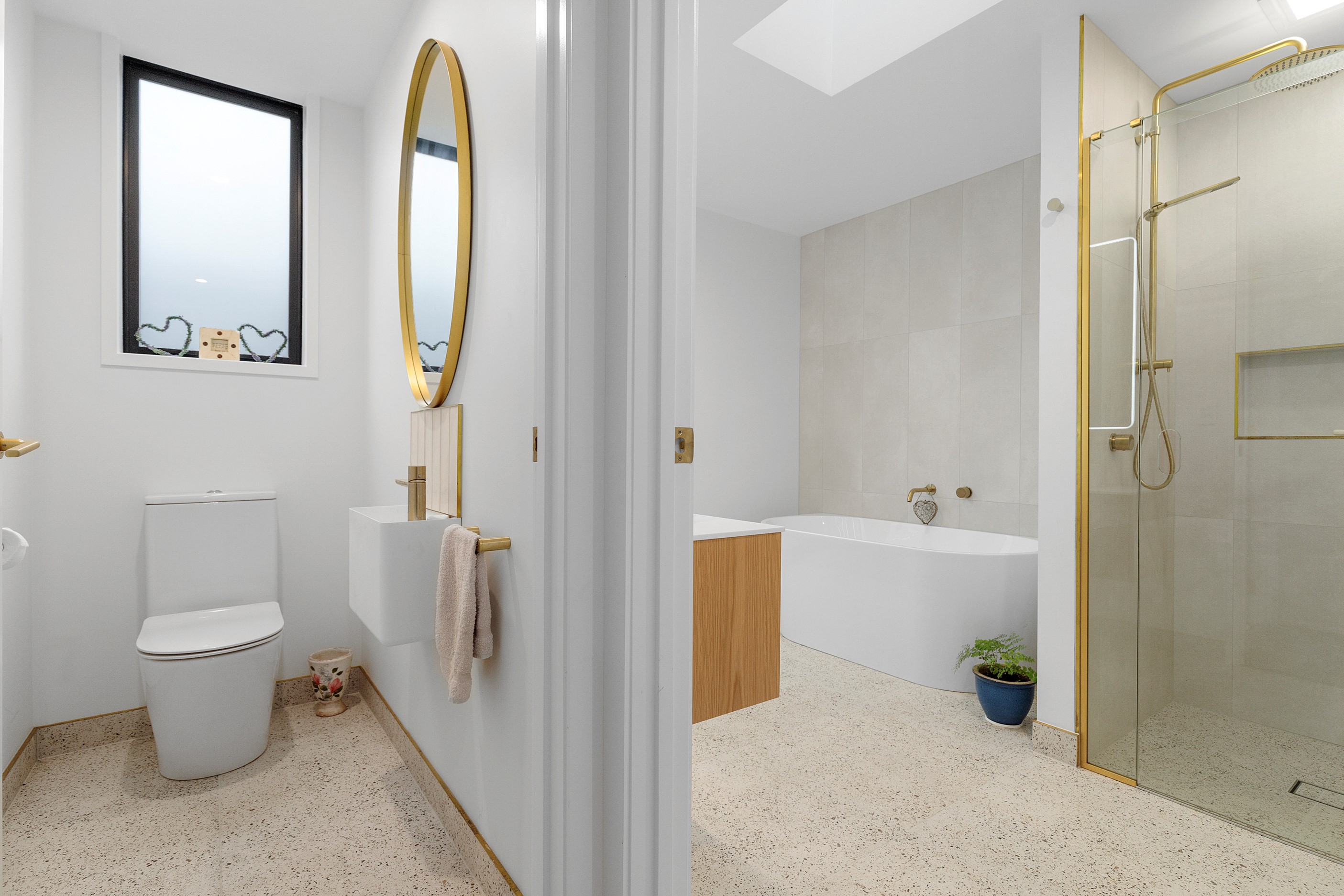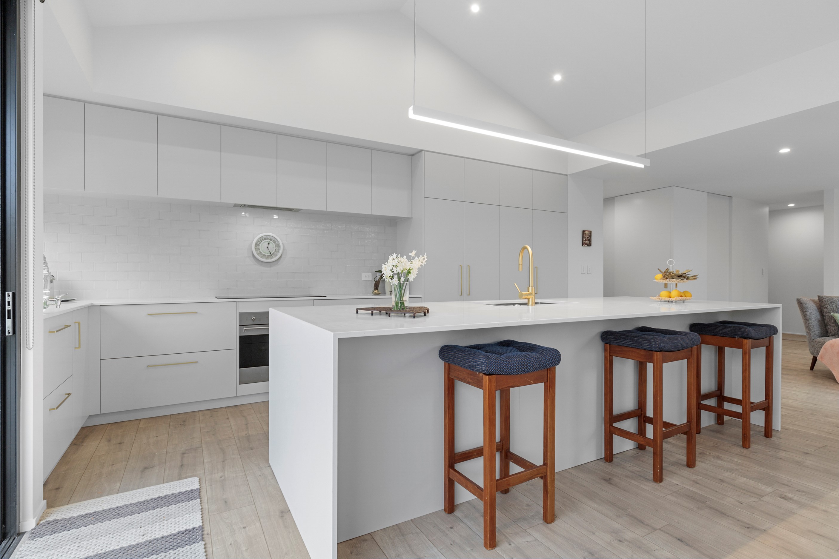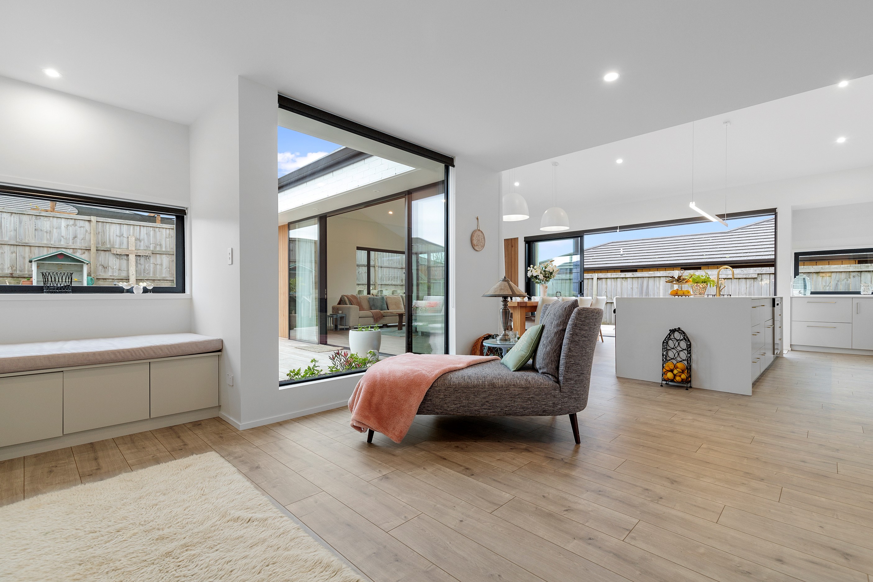 With elevated properties on two of the three sides, the challenge was to design a house that would make best use of a private area at the rear of the section. Living areas needed to be tucked away from the road and flow to outdoor areas. The house also needed to include three bedrooms, display pared-back lines and create street appeal. It’s clear the objectives have been met, and then some. Edwards White Architects took the client’s requests on board and designed a beautiful home with timeless appeal. The 211sqm residence is clad in bagged brick, has timber shiplap features, and delivers delightful details within – all of which are gradually revealed as you progress throughout the home. A feature that has become increasingly important in recent times is an office to accommodate working from home. This one has been designed to be closed off, ensuring it almost disappears, which helps with the all-important work-life separation and balance. Air flow, natural light and efficient heating are achieved with automated solar-powered skylights and a ducted fireplace. Meanwhile, low-e glass mitigates heat loss and sun damage.